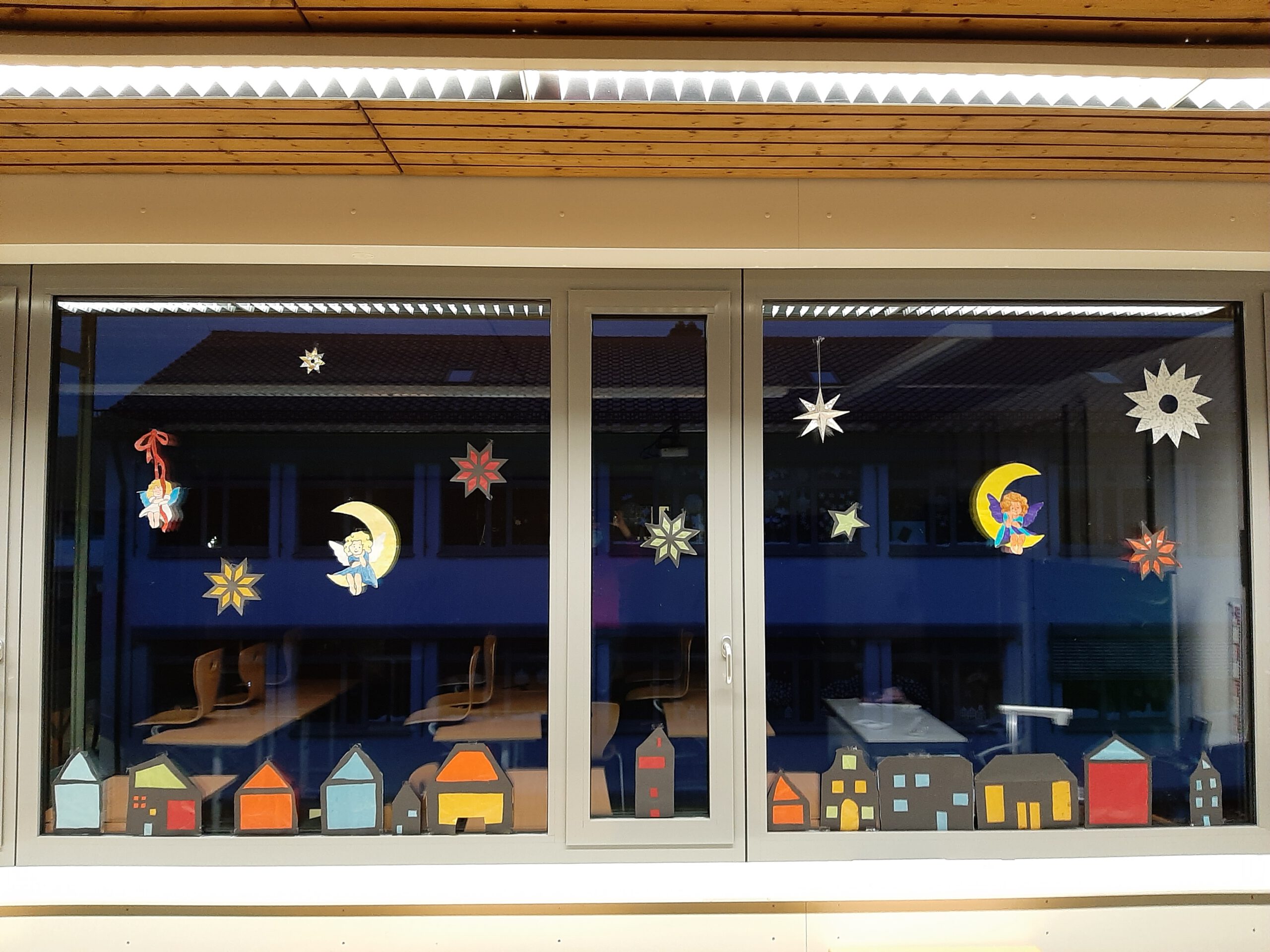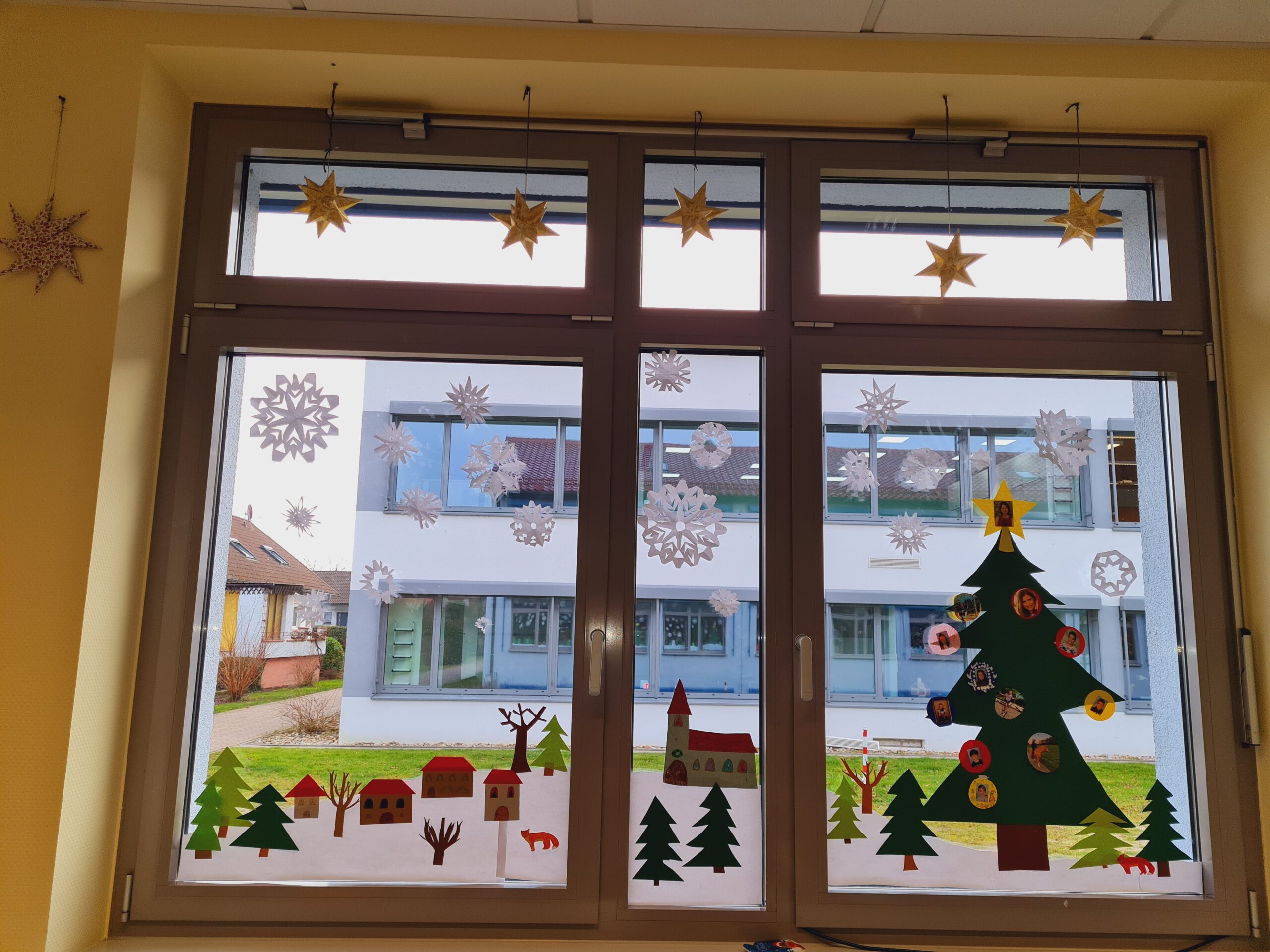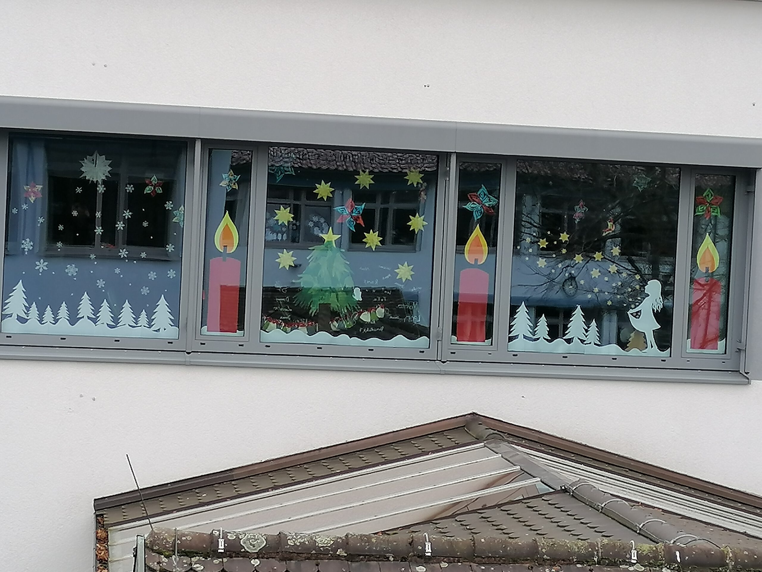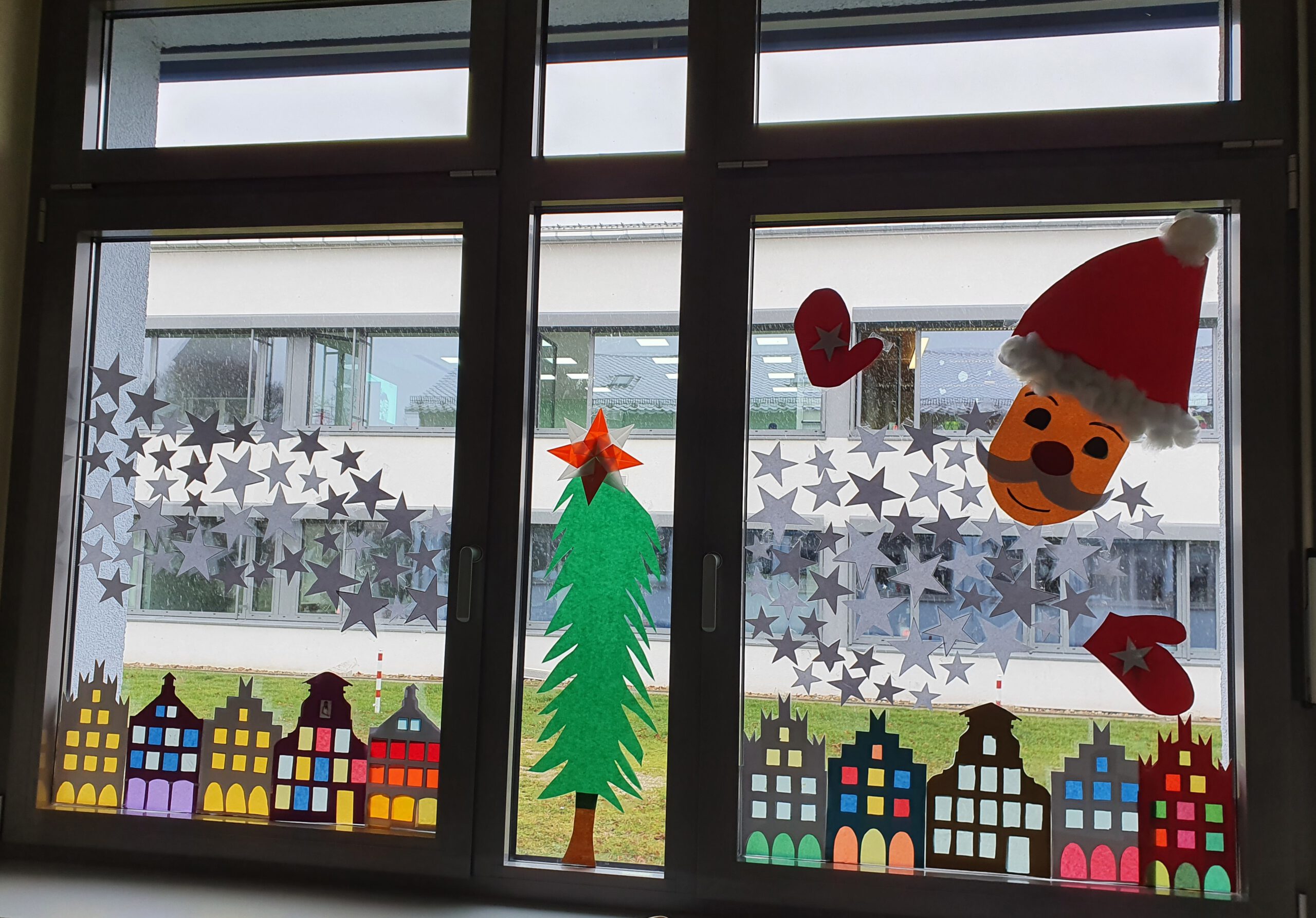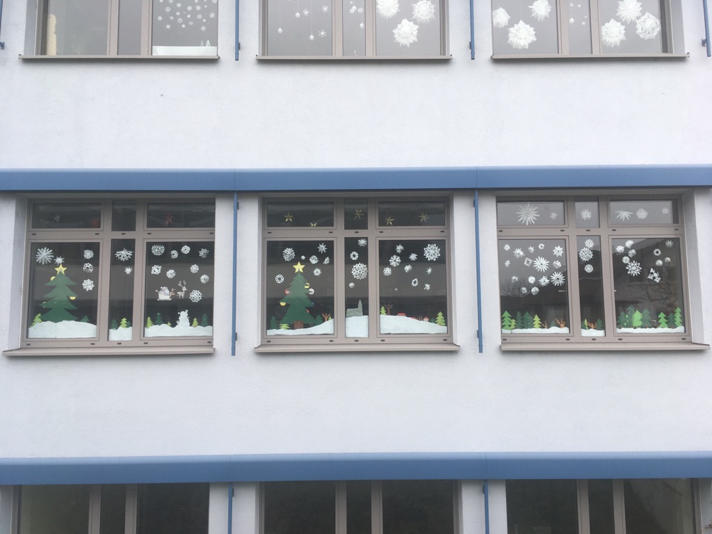 Mit ihrer „Winterlandschaft mit Christbaum“ landete die Klasse 5a mit Klassenlehrerin Dorothee Weiler ganz oben auf dem Siegertreppchen. Den zweiten Platz belegte die Klasse 8b mit Klassenlehrer Benjamin Koch, die mit einem riesigen Weihnachtsmann mit Geschenke-Schlitten überzeugte. Der dritte Platz ging an die Klasse 6b mit Klassenlehrerin Simone Fuß, welche nach und nach vier Adventskerzen an ihren Fenstern erstrahlen ließ und ein Sterntalermotiv in einem Winterwald gestaltet hatte.