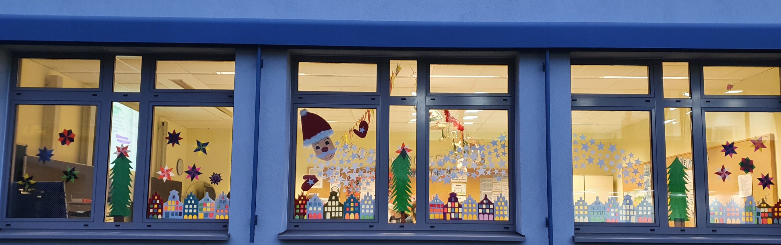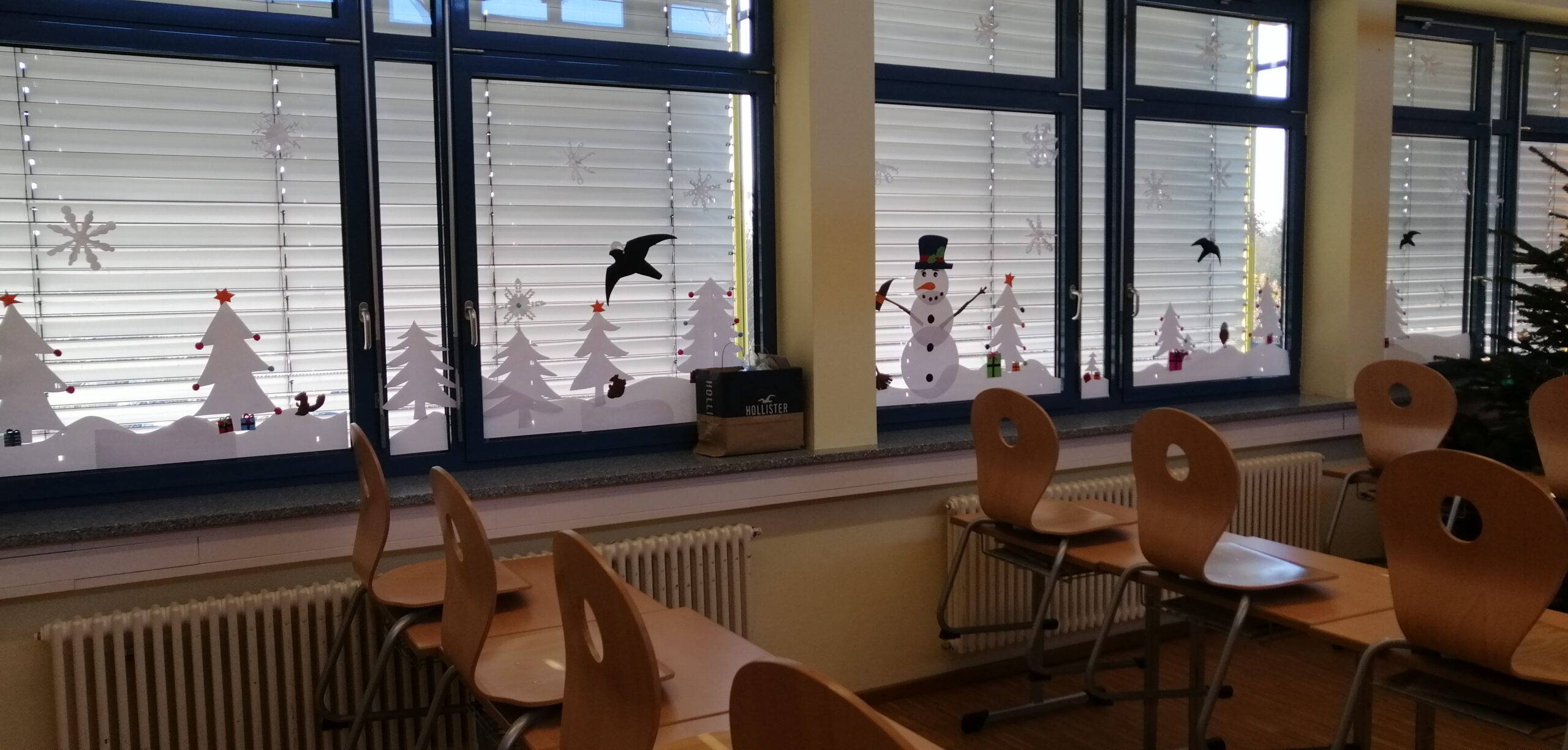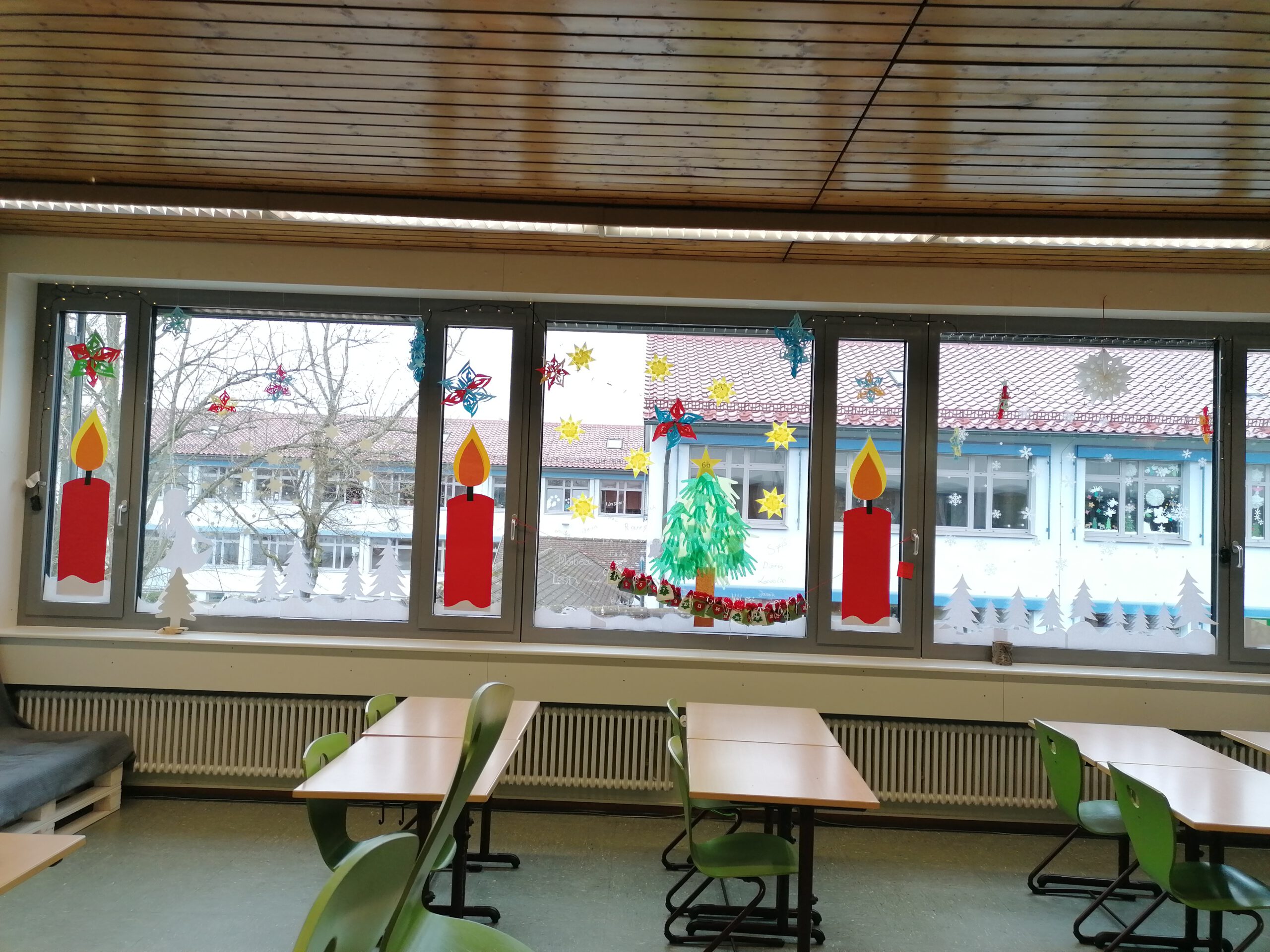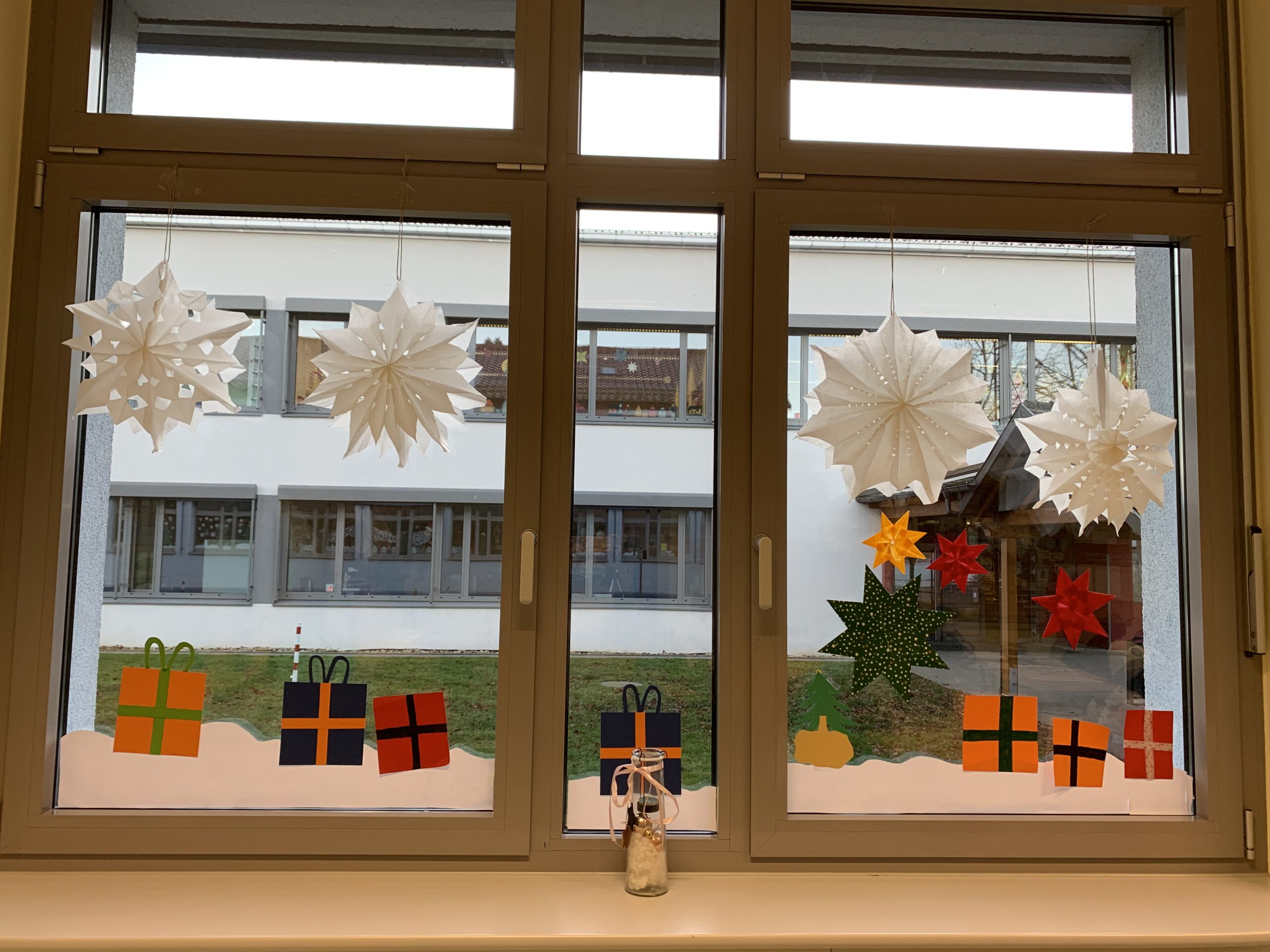 Mit ihrer „Winterlandschaft mit Christbaum“ landete die Klasse 5a mit Klassenlehrerin Dorothee Weiler ganz oben auf dem Siegertreppchen. Den zweiten Platz belegte die Klasse 8b mit Klassenlehrer Benjamin Koch, die mit einem riesigen Weihnachtsmann mit Geschenke-Schlitten überzeugte. Der dritte Platz ging an die Klasse 6b mit Klassenlehrerin Simone Fuß, welche nach und nach vier Adventskerzen an ihren Fenstern erstrahlen ließ und ein Sterntalermotiv in einem Winterwald gestaltet hatte.