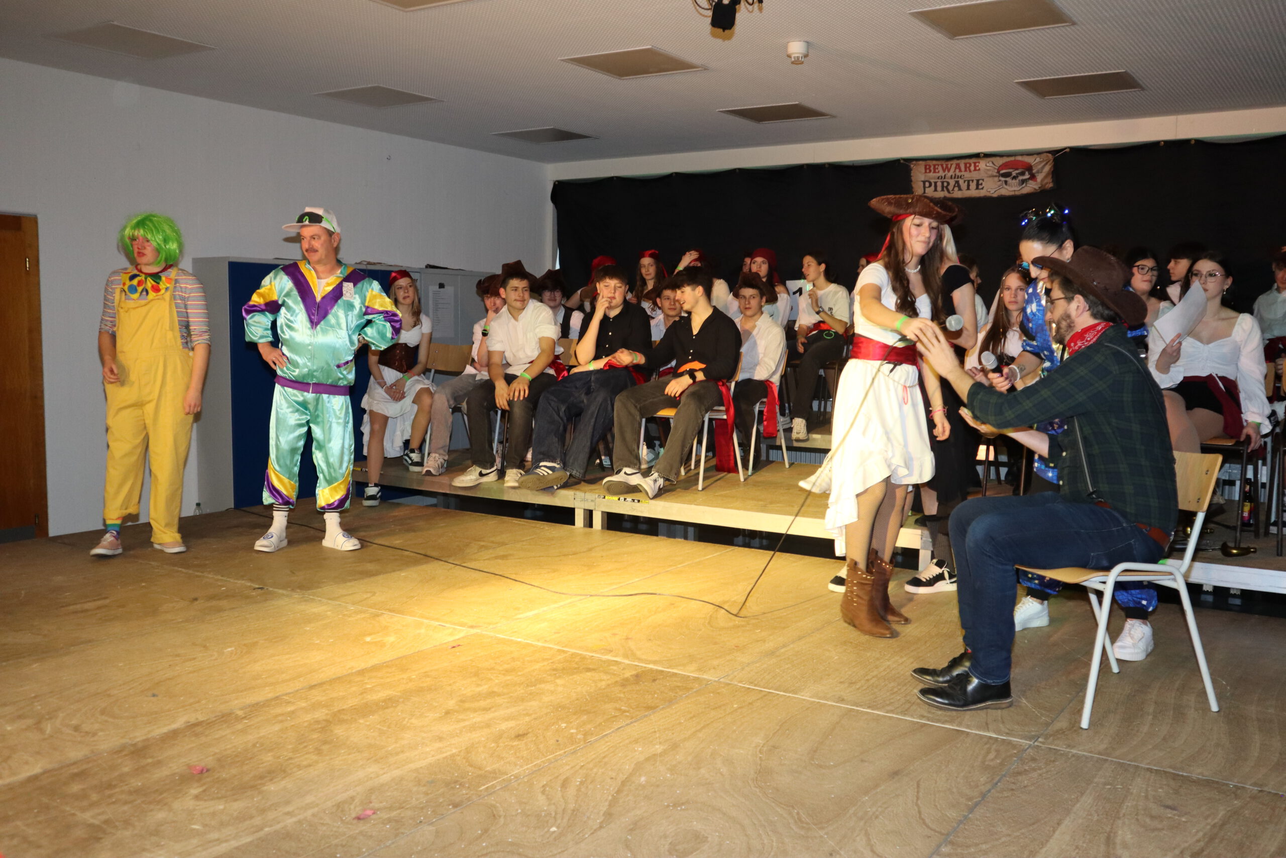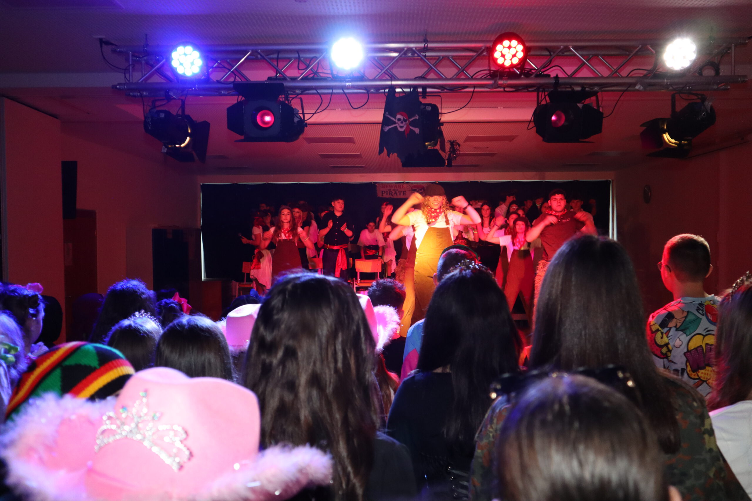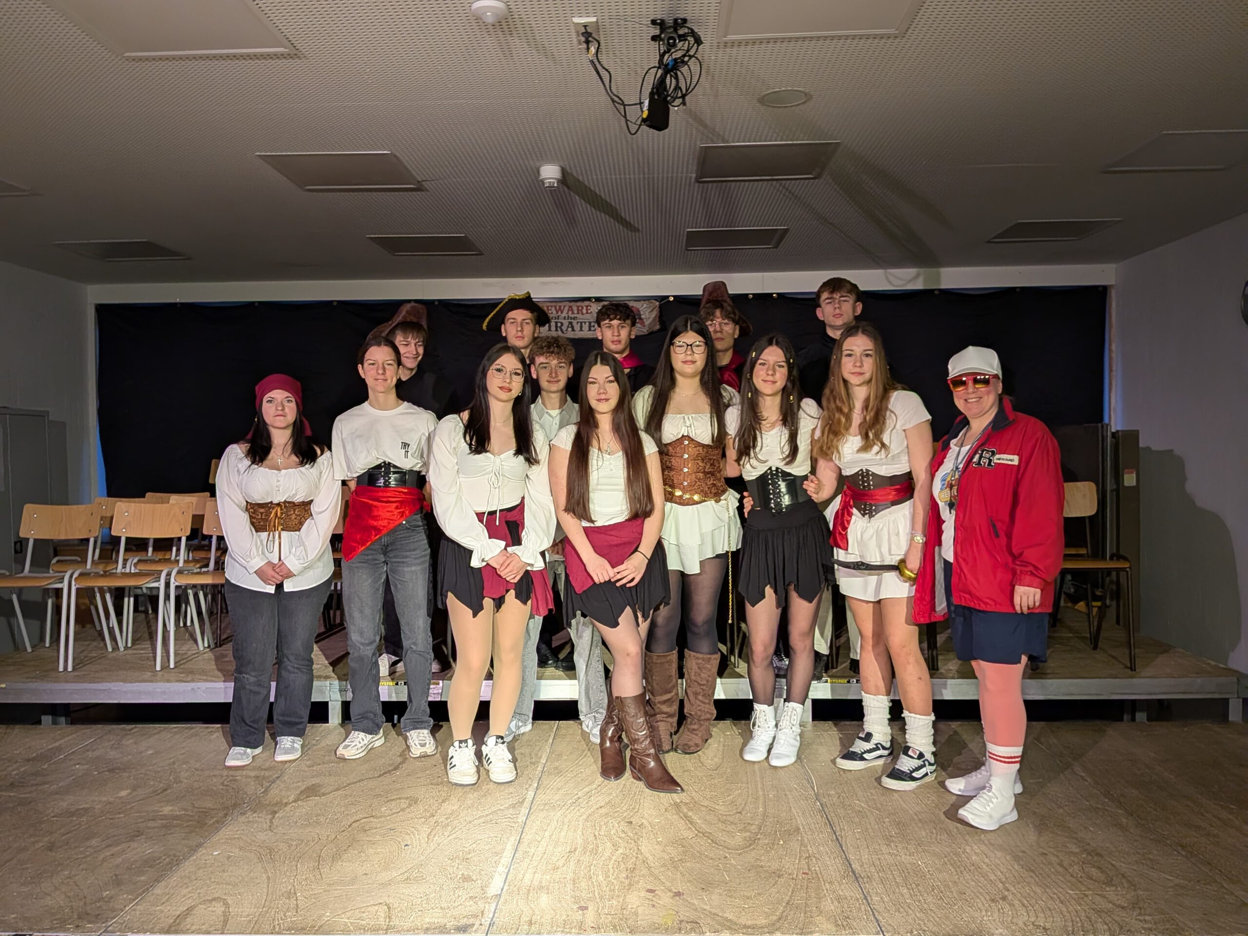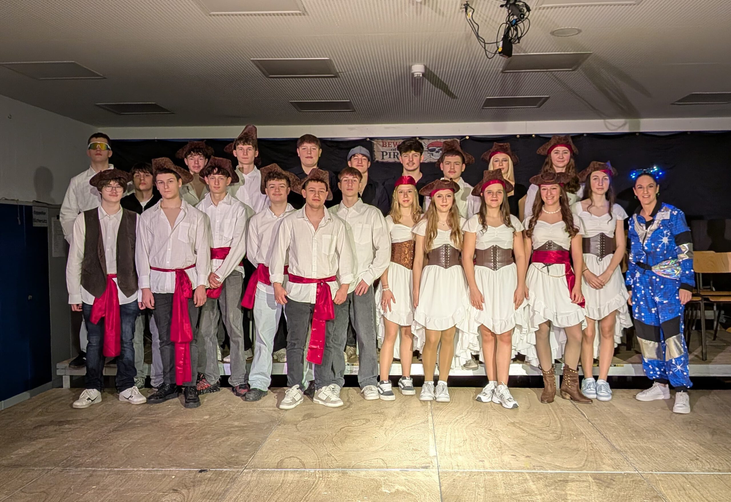 Unter dem diesjährigen Motto „Piraten der Karibik“ verwandelte sich die Aula der Realschule am Schmutzigen Donnerstag in ein fröhlich-buntes Freibeuterlager. Schon beim Auftakt wurde klar: Diese Feier würde Kurs auf beste Stimmung nehmen. Die organisierenden Zehntklässler marschierten stilecht als Piraten verkleidet ein und nahmen ihre Plätze auf der Bühne ein – der Startschuss für einen mitreißenden Vormittag.