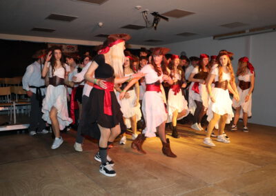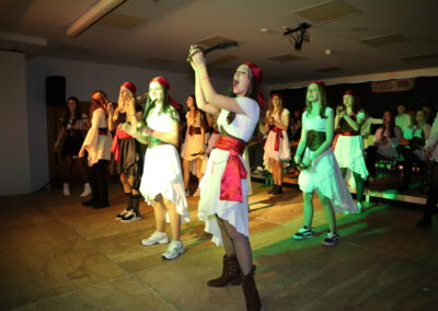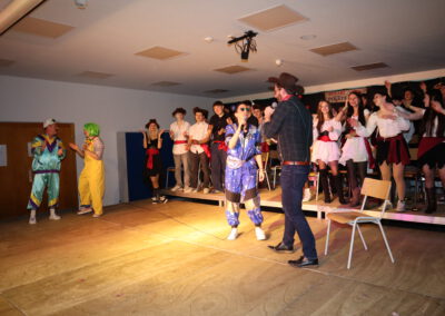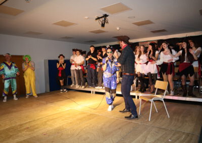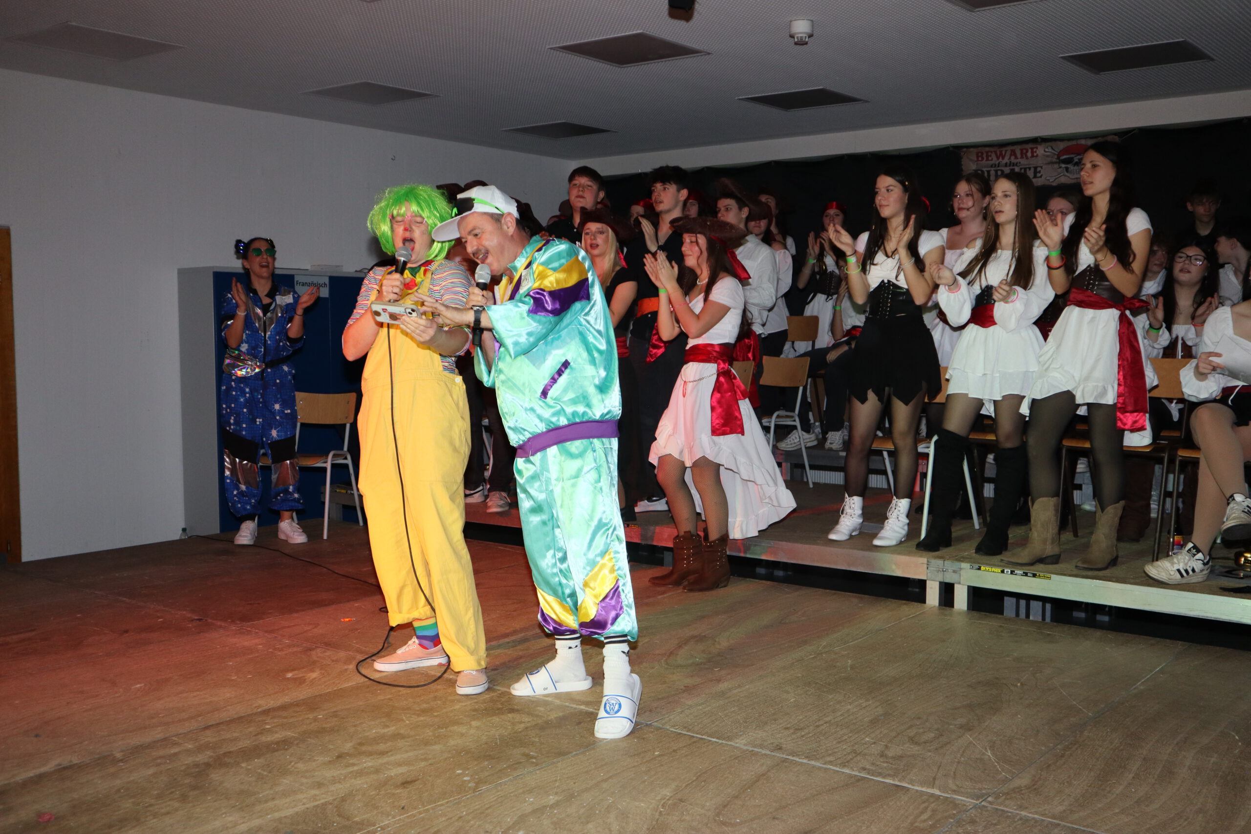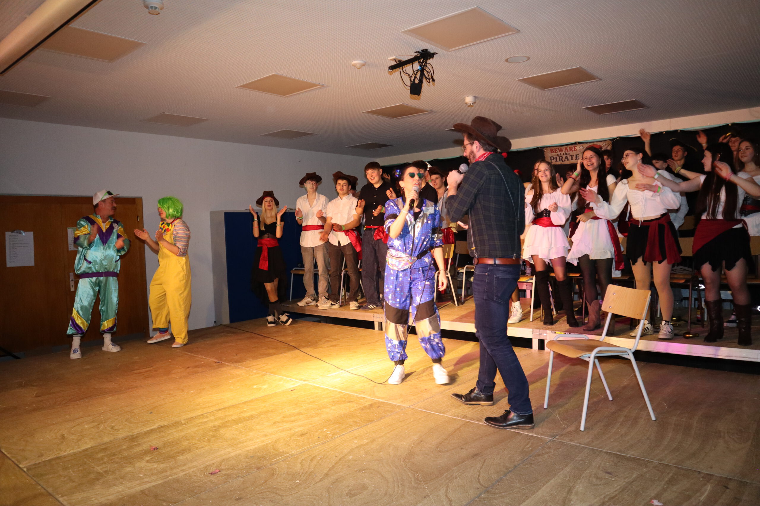 Nach der großen Pause folgte ein weiterer Höhepunkt: Der Tanz der Zehntklässler. Als Piraten eroberten sie die Bühne zu den Songs Captain Jack und Pirates of the Caribbean und ernteten dafür großen Applaus. Bevor die Tanzgarde Schwarzach ihren Auftritt hatte, wurde es noch einmal besonders unterhaltsam: Beim Karaoke-Singen traten zwei Lehrerteams gegeneinander an: Kathrin Schröter und Olaf Frietsch überzeugten mit Bella Napoli, während besonders Simone Fuß gemeinsam mit Sebastian Hoch bei Verdammt, ich lieb dich großes Sanges- und Entertainment-Talent zeigte. Der Sieg ging schließlich verdient an das „Bella-Napoli-Duo“ Frietsch/Schröter – möglicherweise auch wegen Frau Schröters waghalsigem Bocksprung über den Rücken ihres Duettpartners.