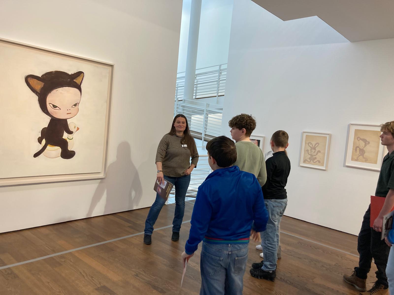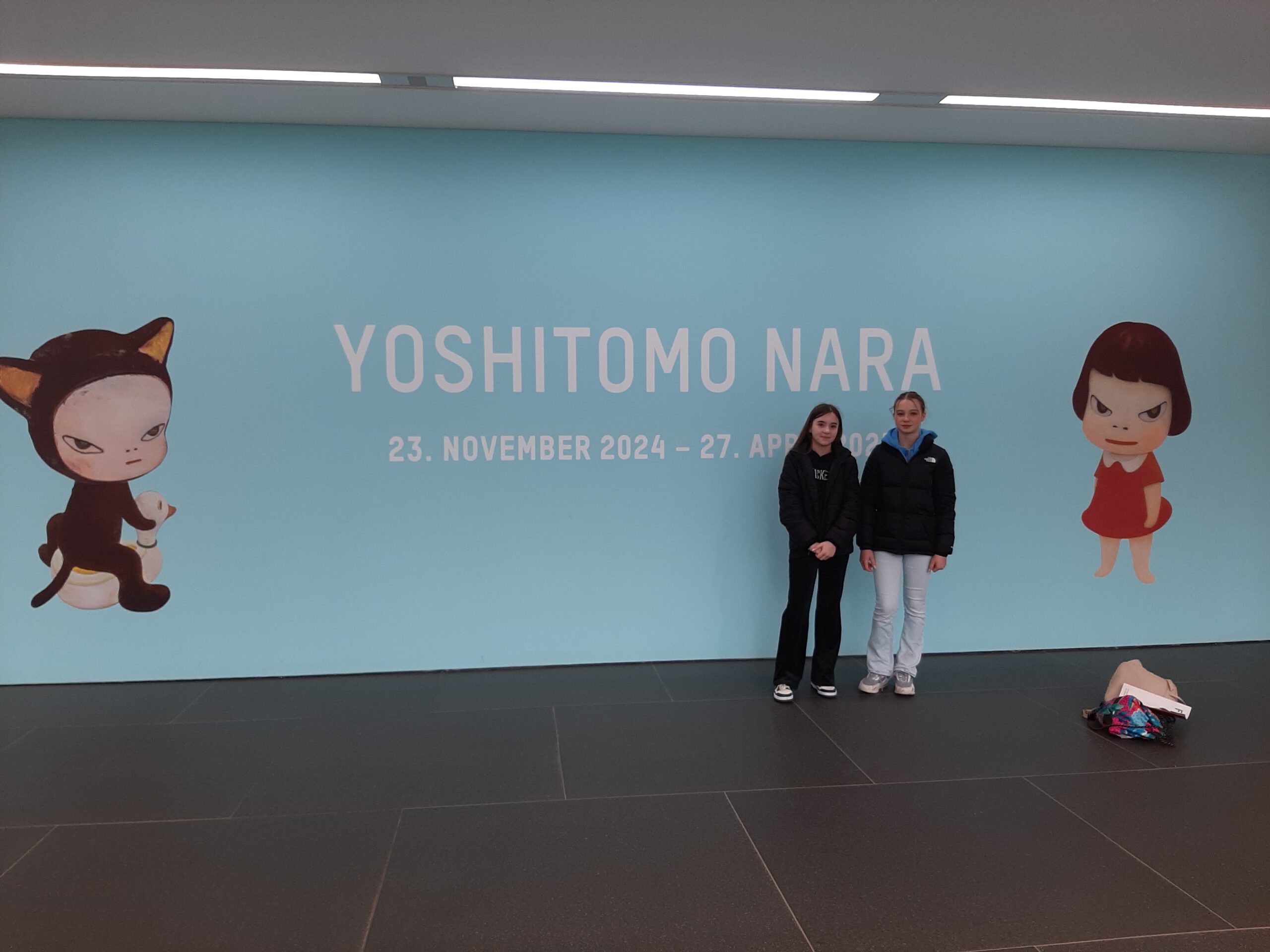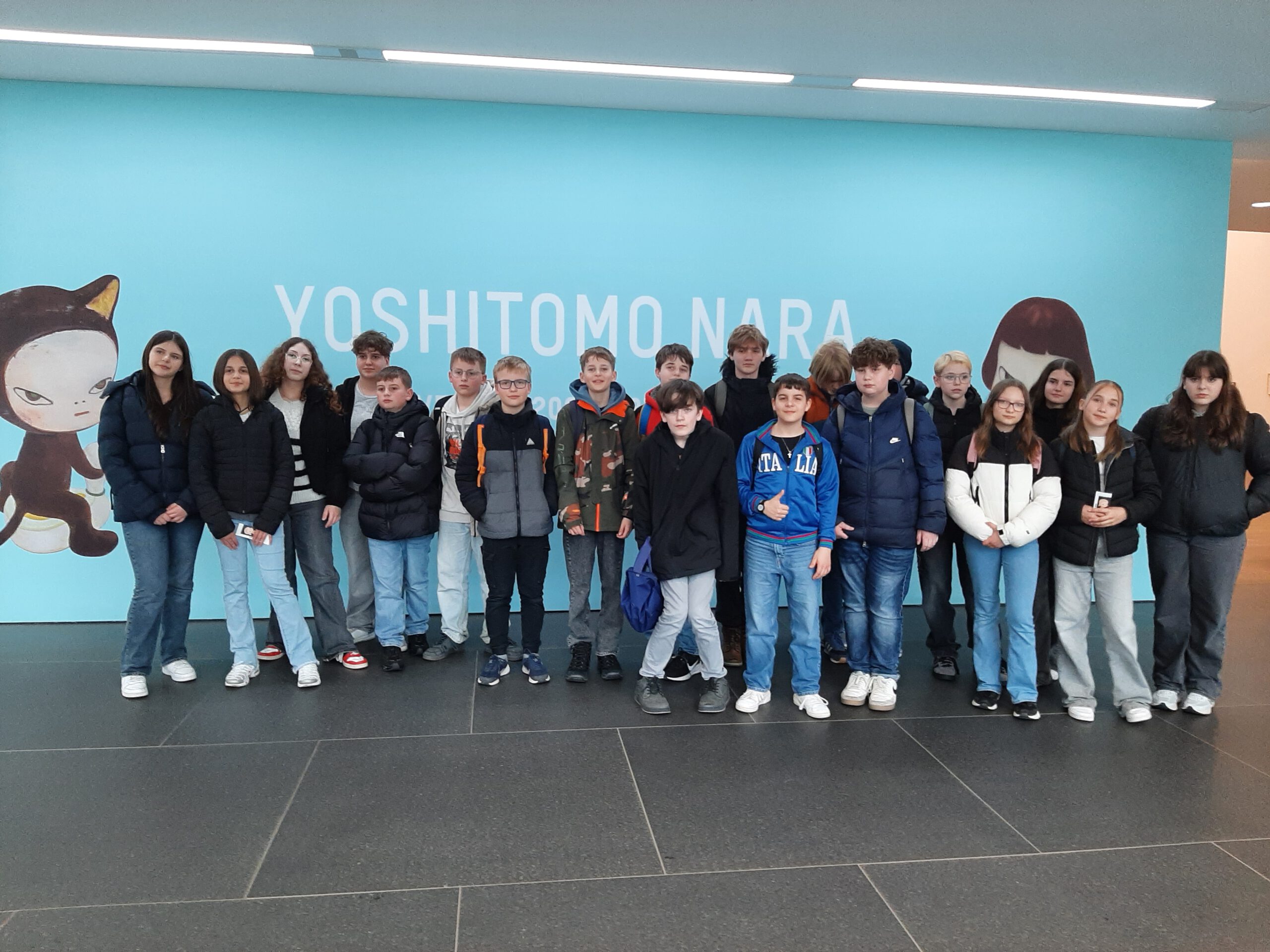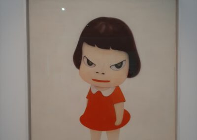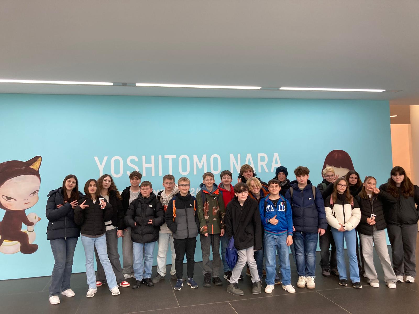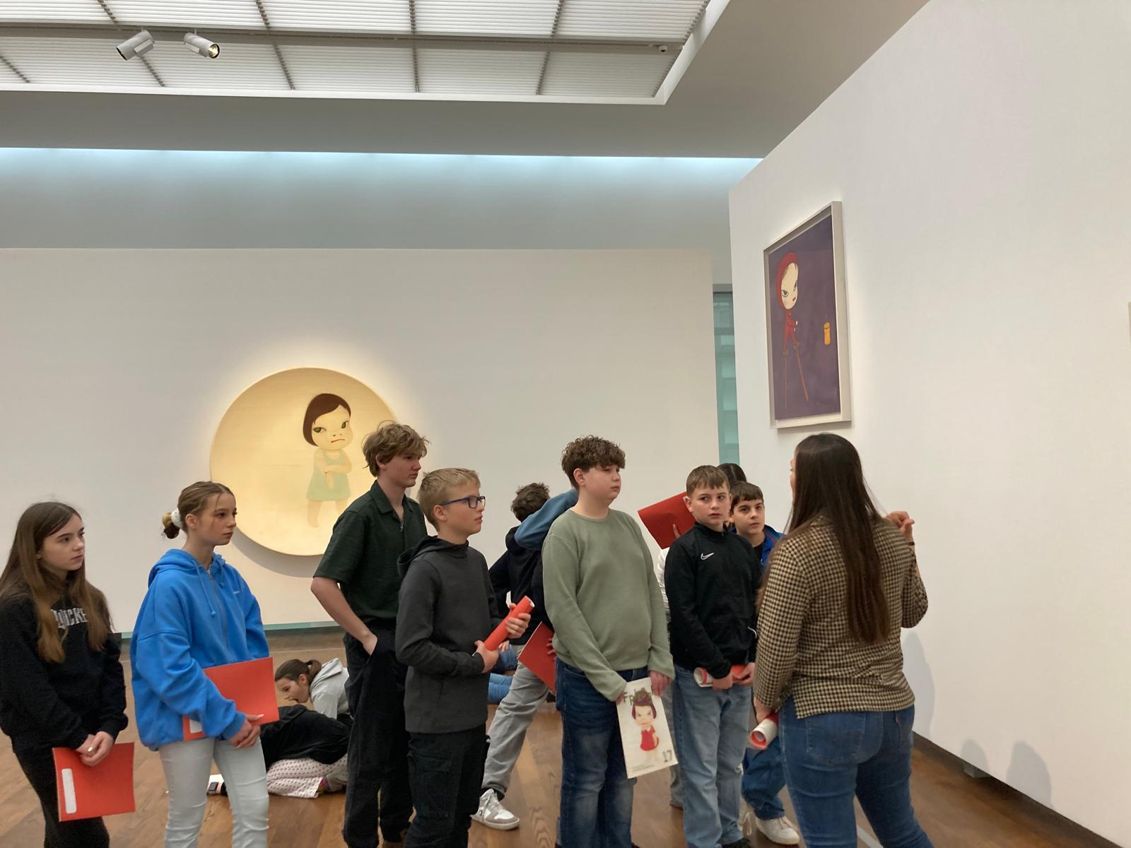Dort erwartete uns eine Ausstellung des Künstlers Yoshitomo Nara. Gleich zu Beginn wurden wir zwei Museumsmitarbeiterinnen zugeteilt. Sie erläuterten uns die Sicherheitsvorschriften und Verhaltensregeln. Dann startete die Tour durch das Museum, bei der es Gemälde, Zeichnungen und Skulpturen des Künstlers zu sehen gab, die meist Mädchen mit großen Köpfen und großen Augen zeigten, die sogenannten „Angry Girls“. Diese Mädchen wirken wütend, traurig oder ängstlich. Bei vielen Bildern erklärten uns die Begleiterinnen, wie der Künstler sich beim Malen gefühlt oder was er gedacht hat. Nach der Tour hatten wir noch 20 Minuten die Gelegenheit, uns die Ausstellung eigenständig zu betrachten.