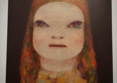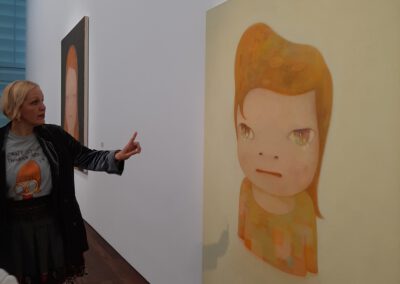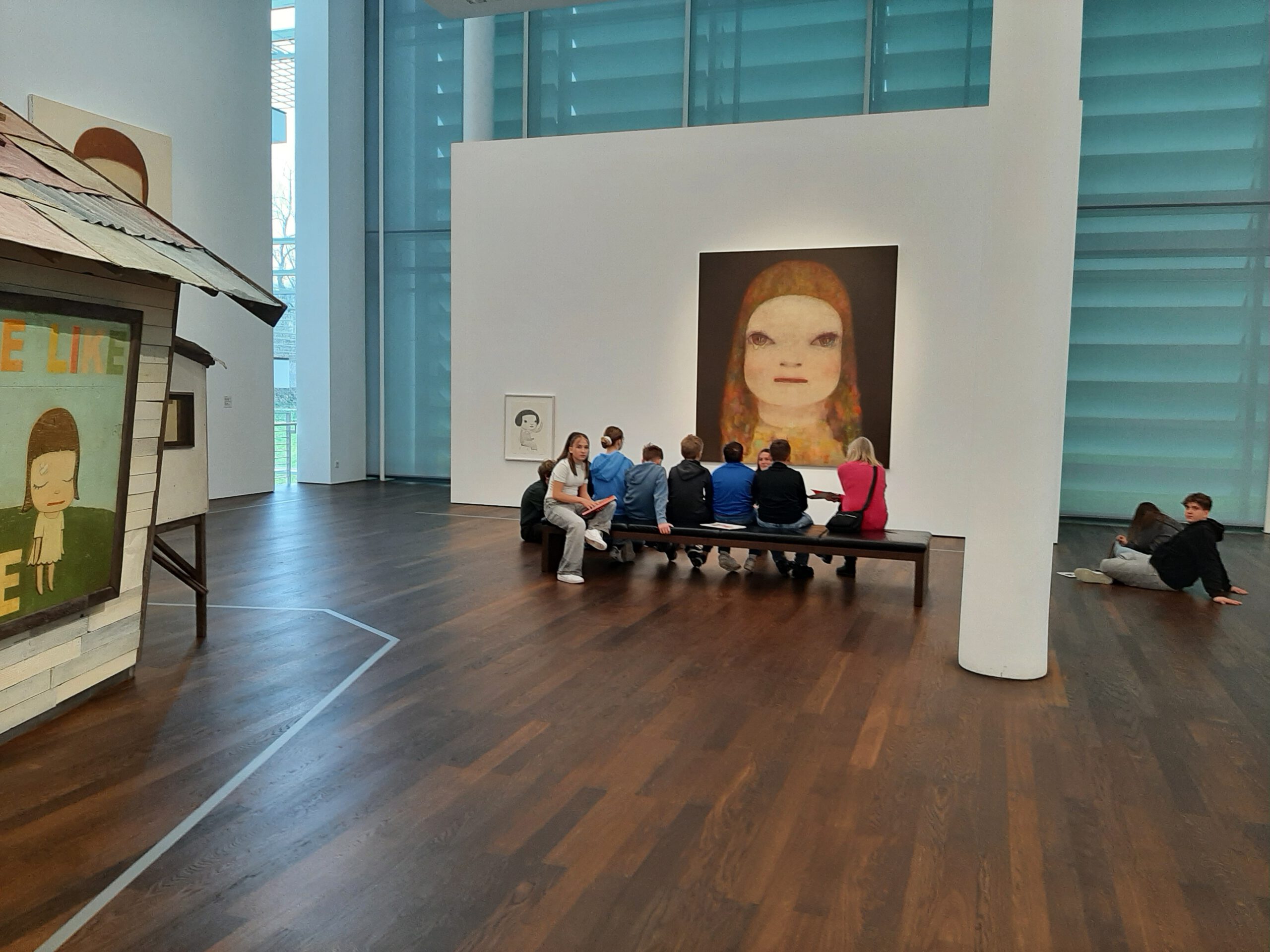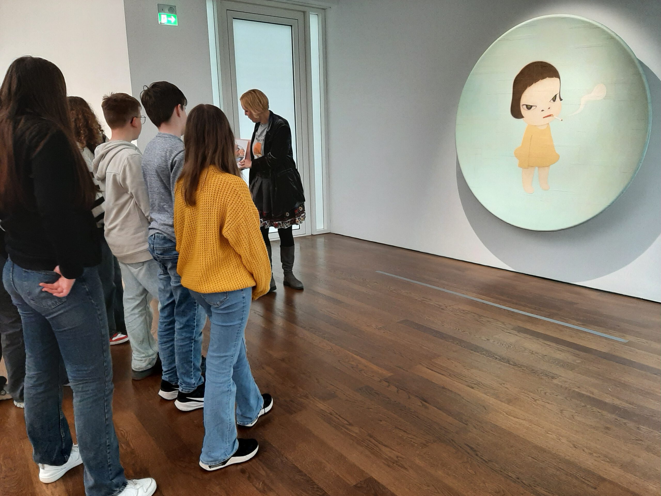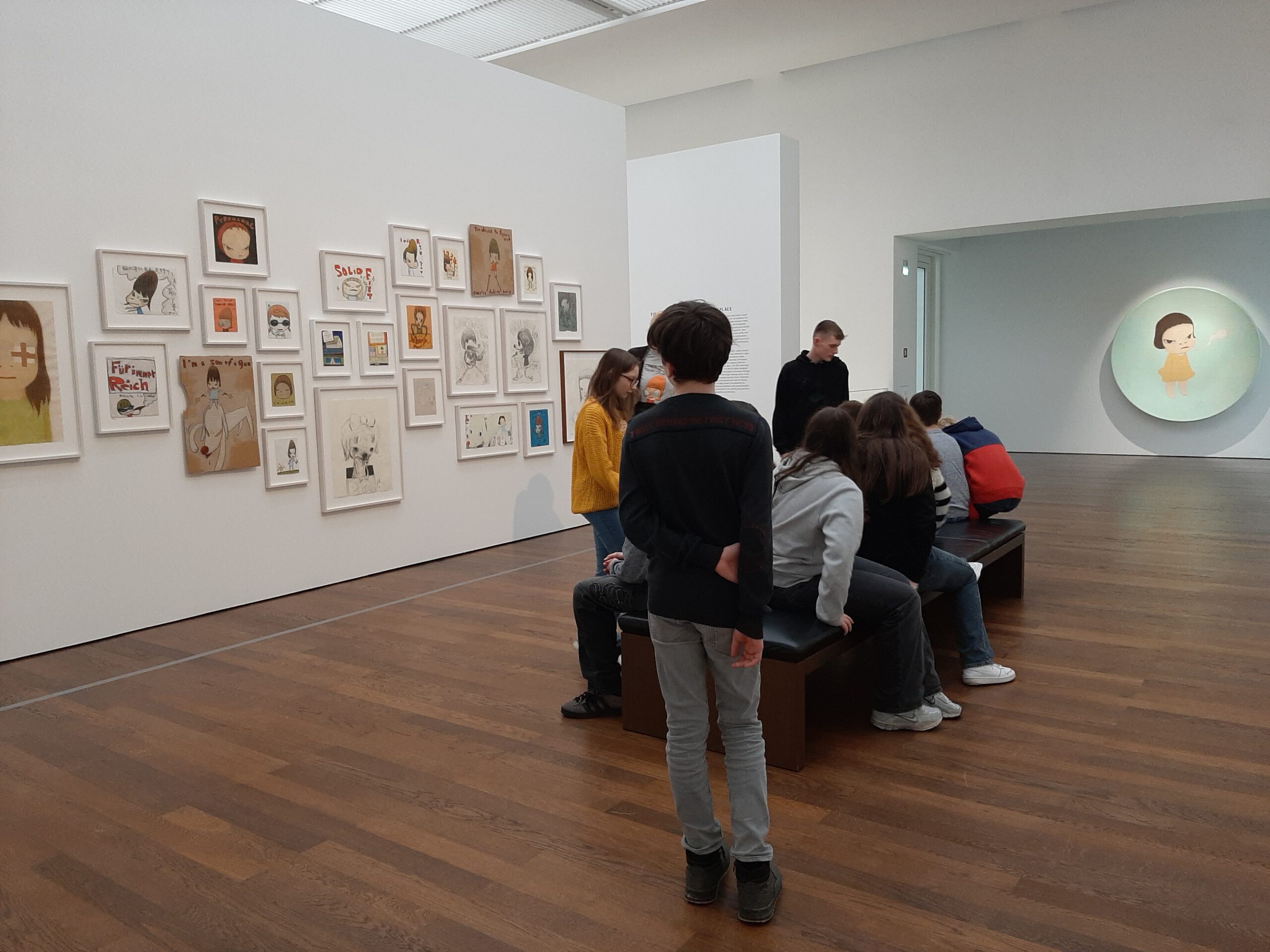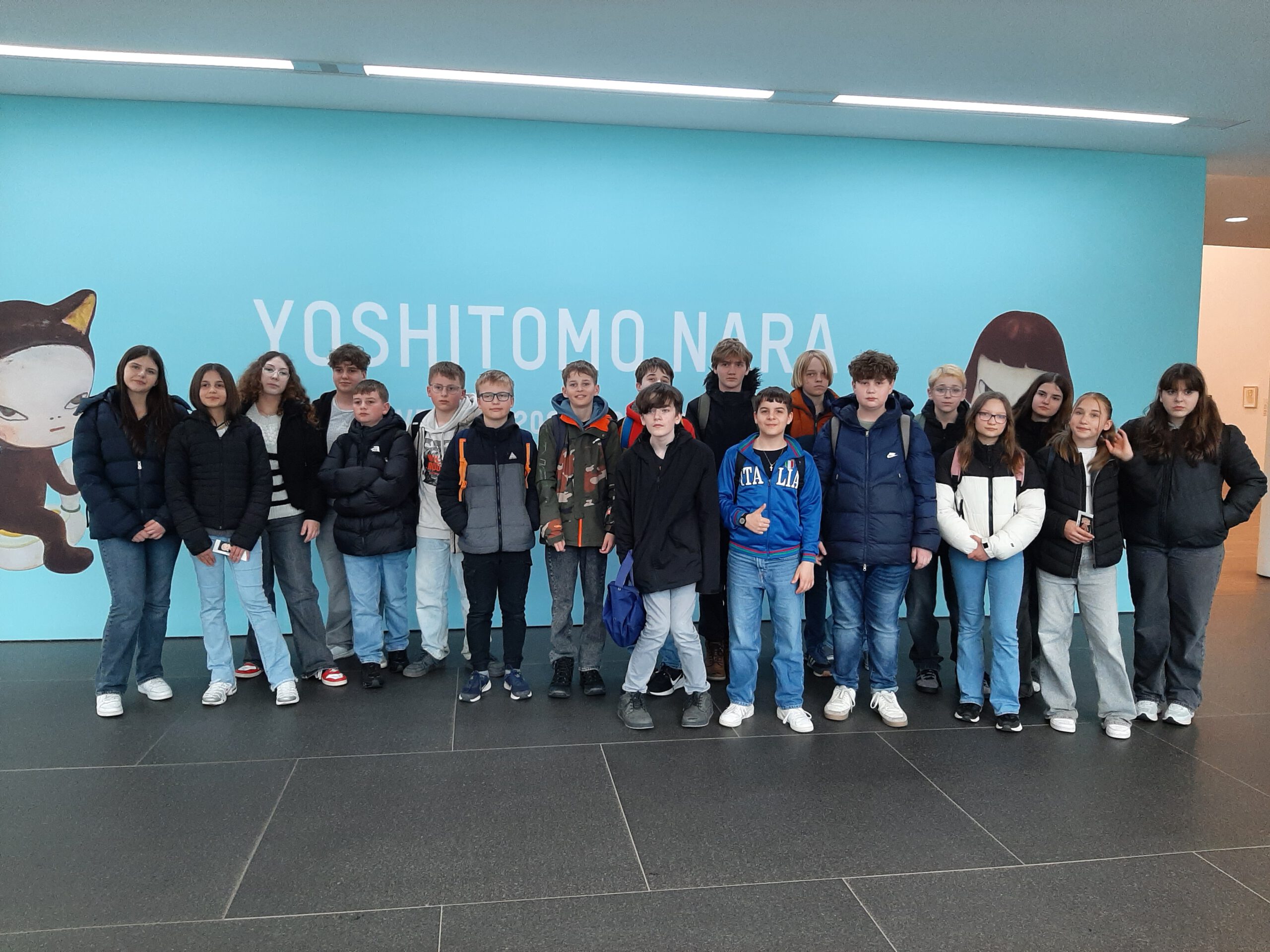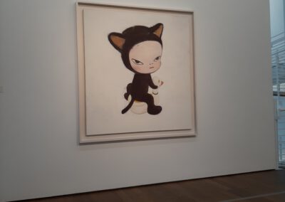 Dort erwartete uns eine Ausstellung des Künstlers Yoshitomo Nara. Gleich zu Beginn wurden wir zwei Museumsmitarbeiterinnen zugeteilt. Sie erläuterten uns die Sicherheitsvorschriften und Verhaltensregeln. Dann startete die Tour durch das Museum, bei der es Gemälde, Zeichnungen und Skulpturen des Künstlers zu sehen gab, die meist Mädchen mit großen Köpfen und großen Augen zeigten, die sogenannten „Angry Girls“. Diese Mädchen wirken wütend, traurig oder ängstlich. Bei vielen Bildern erklärten uns die Begleiterinnen, wie der Künstler sich beim Malen gefühlt oder was er gedacht hat. Nach der Tour hatten wir noch 20 Minuten die Gelegenheit, uns die Ausstellung eigenständig zu betrachten.