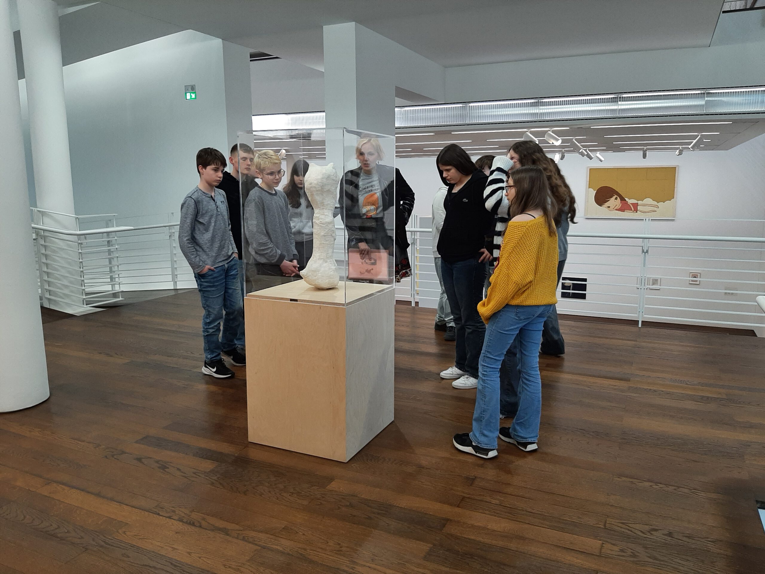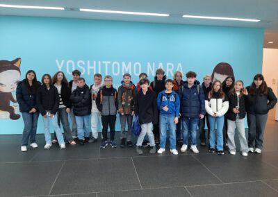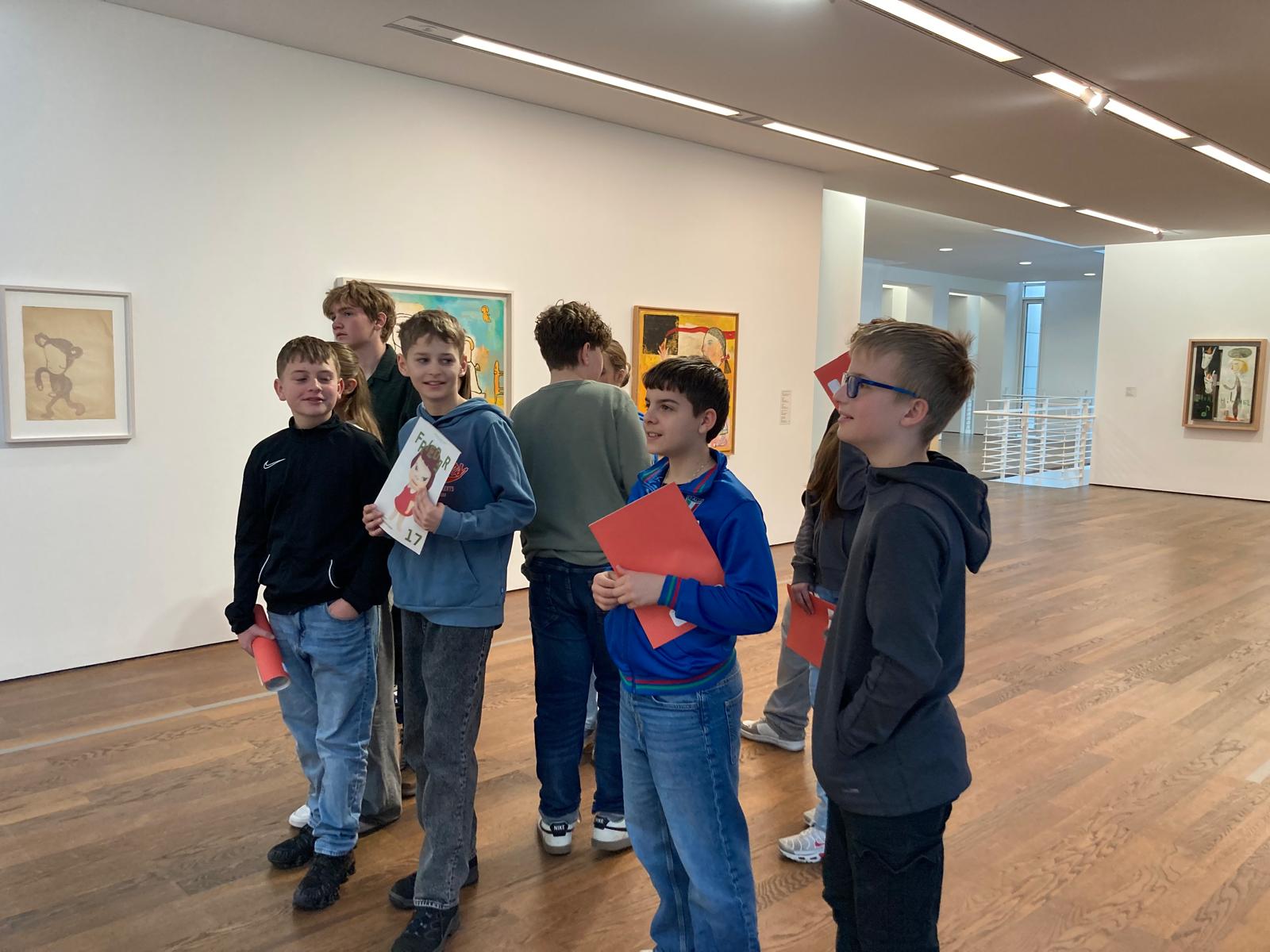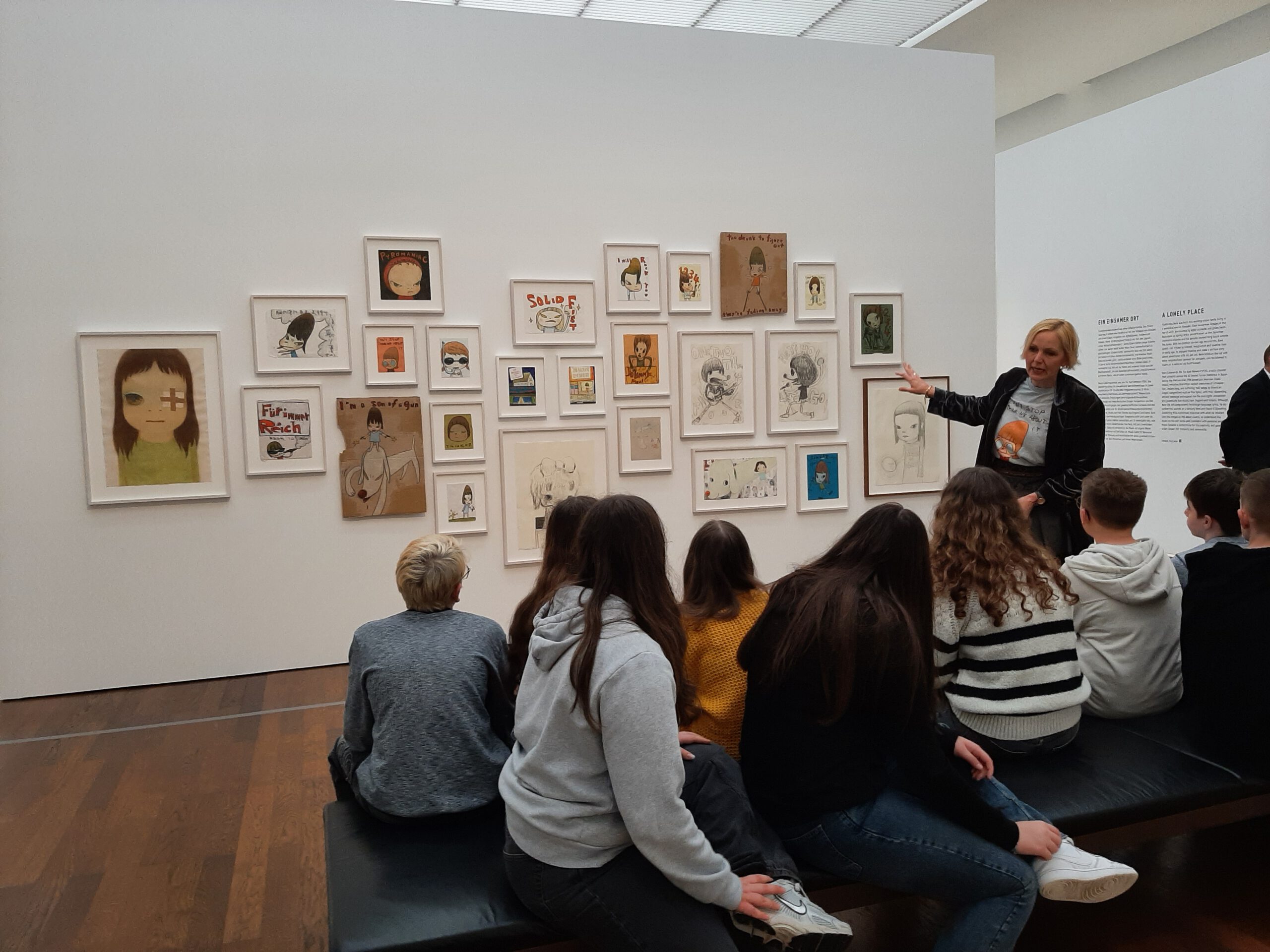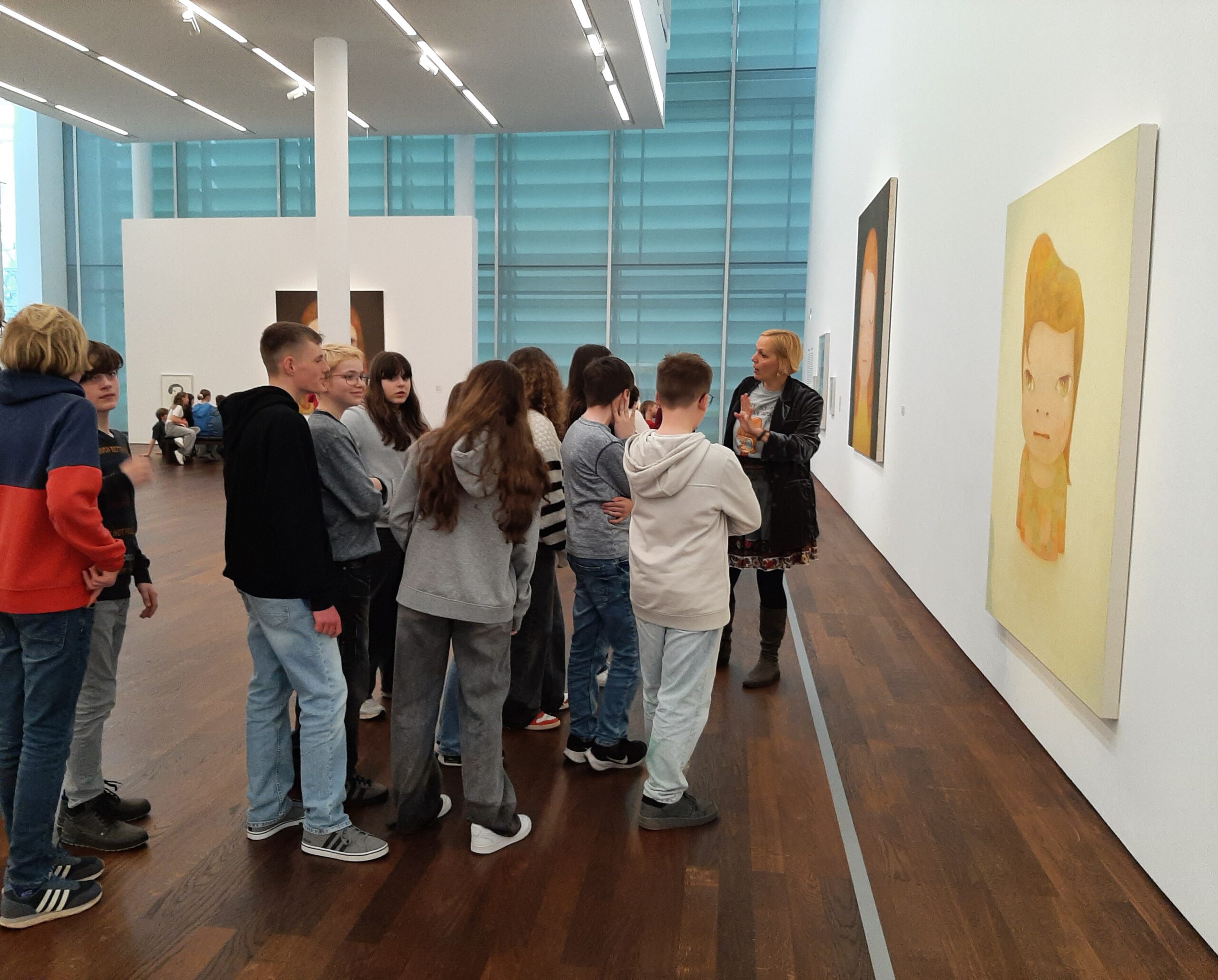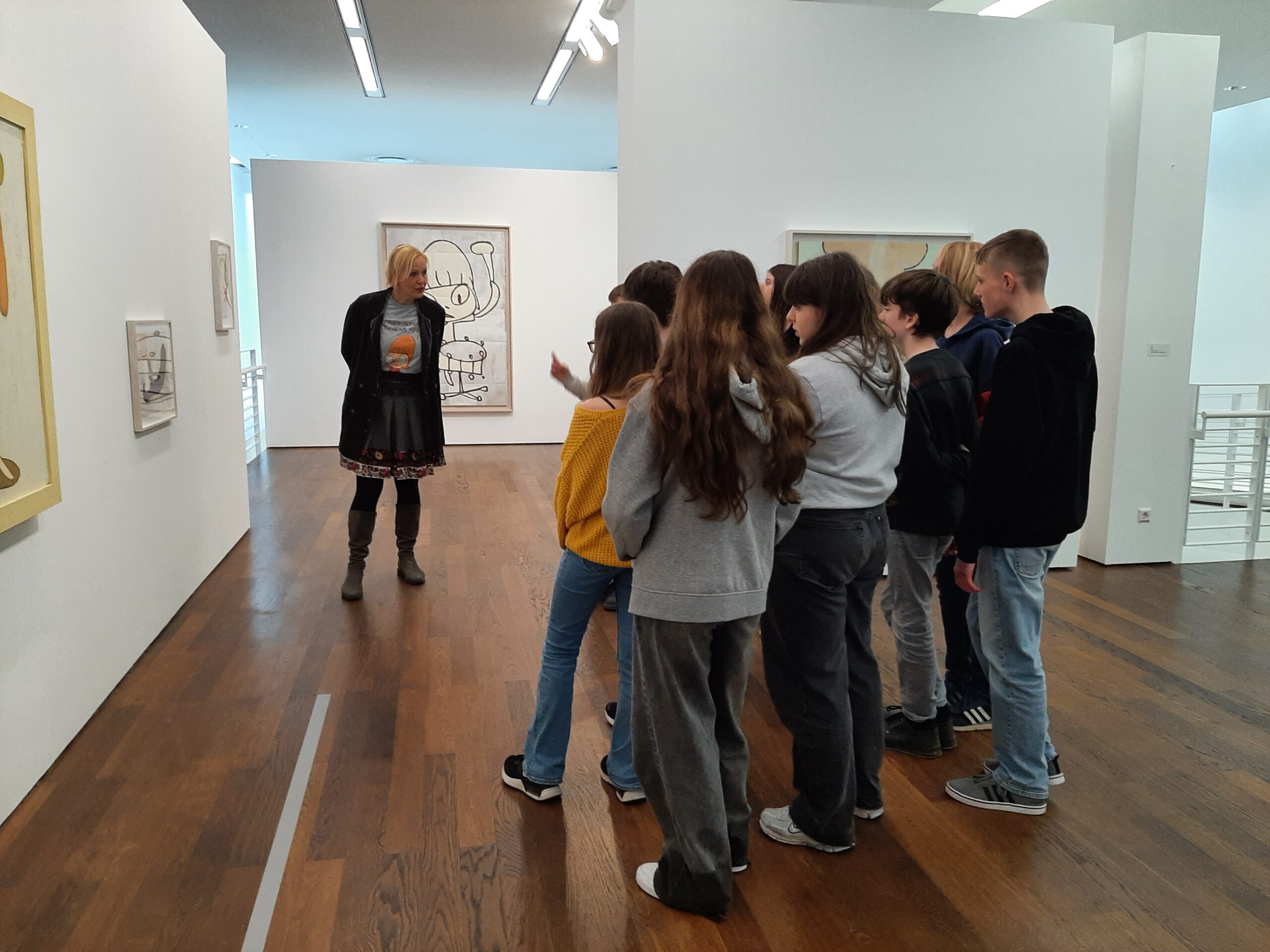 Dort erwartete uns eine Ausstellung des Künstlers Yoshitomo Nara. Gleich zu Beginn wurden wir zwei Museumsmitarbeiterinnen zugeteilt. Sie erläuterten uns die Sicherheitsvorschriften und Verhaltensregeln. Dann startete die Tour durch das Museum, bei der es Gemälde, Zeichnungen und Skulpturen des Künstlers zu sehen gab, die meist Mädchen mit großen Köpfen und großen Augen zeigten, die sogenannten „Angry Girls“. Diese Mädchen wirken wütend, traurig oder ängstlich. Bei vielen Bildern erklärten uns die Begleiterinnen, wie der Künstler sich beim Malen gefühlt oder was er gedacht hat. Nach der Tour hatten wir noch 20 Minuten die Gelegenheit, uns die Ausstellung eigenständig zu betrachten.