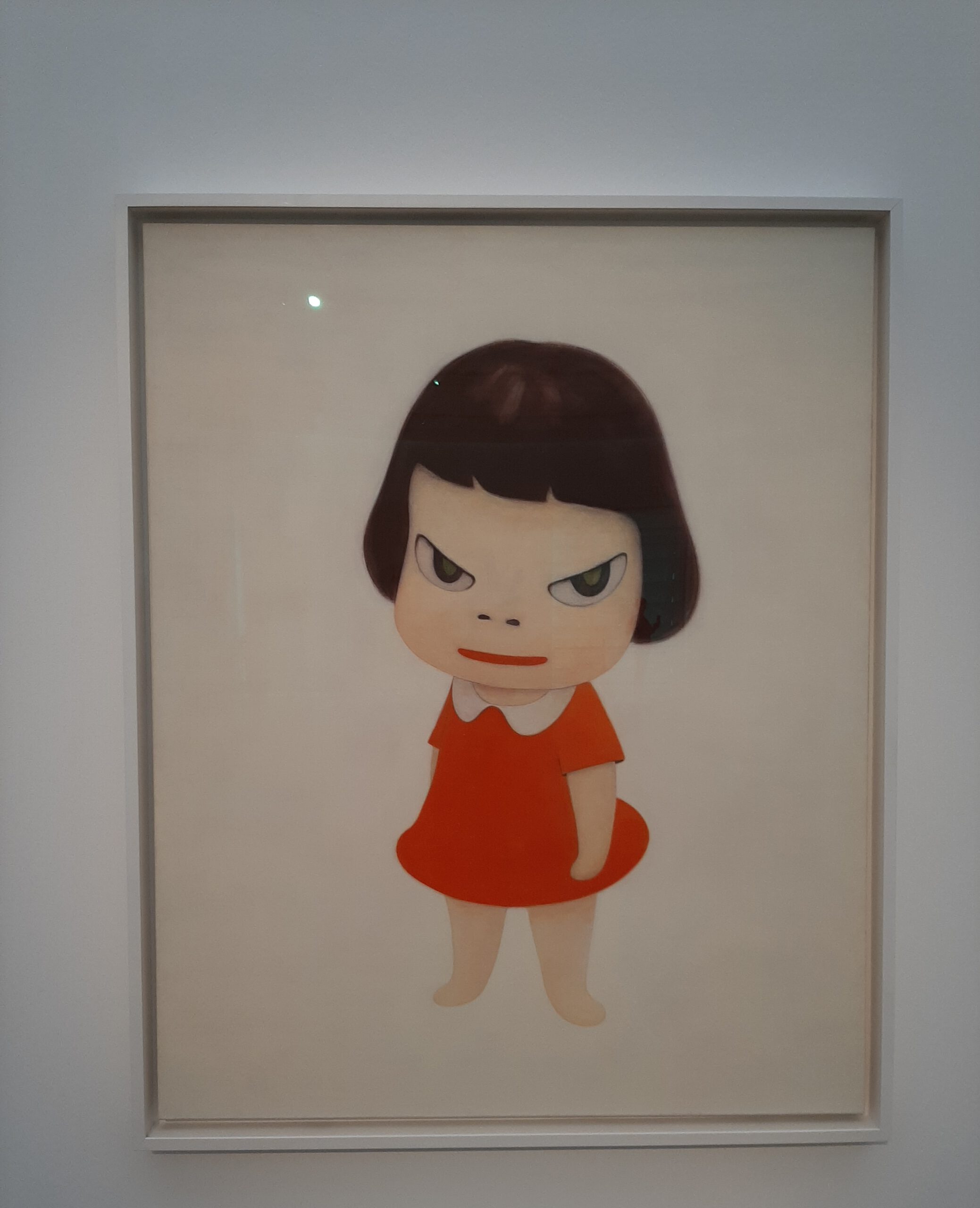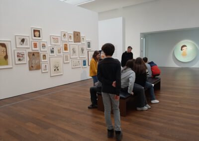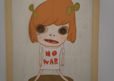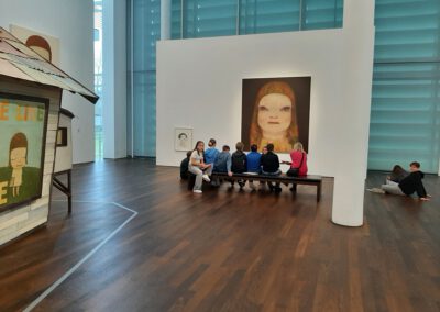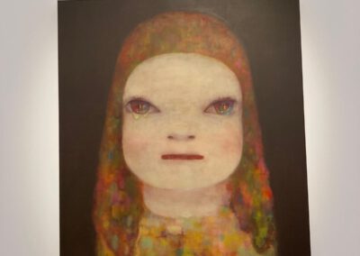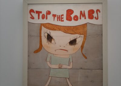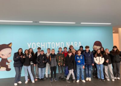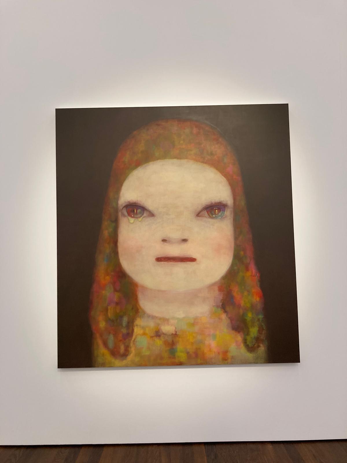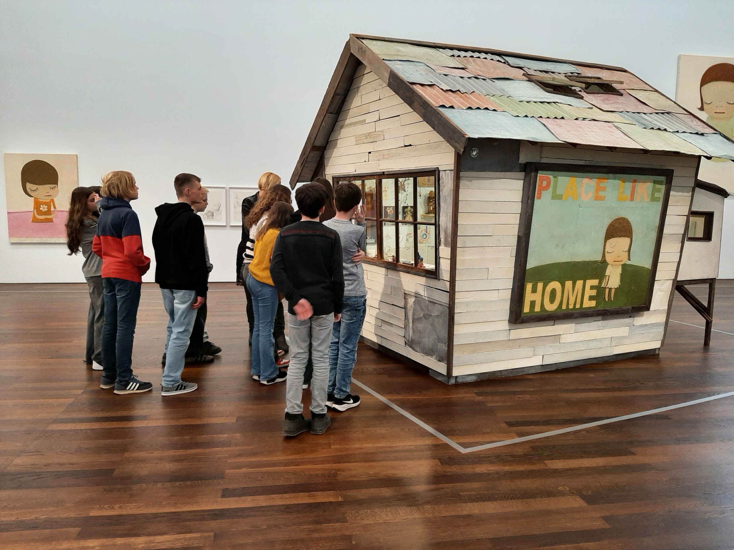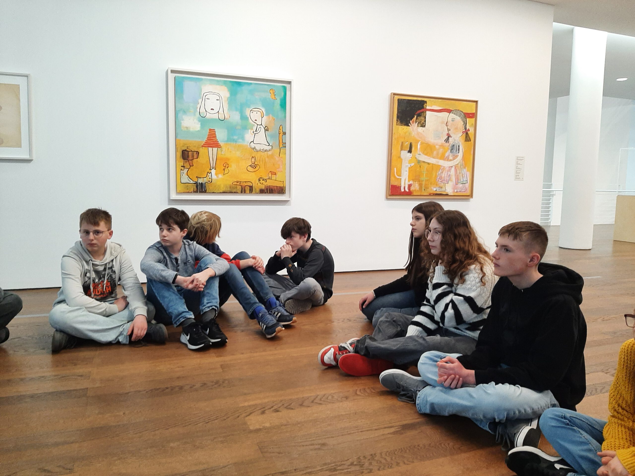 Dort erwartete uns eine Ausstellung des Künstlers Yoshitomo Nara. Gleich zu Beginn wurden wir zwei Museumsmitarbeiterinnen zugeteilt. Sie erläuterten uns die Sicherheitsvorschriften und Verhaltensregeln. Dann startete die Tour durch das Museum, bei der es Gemälde, Zeichnungen und Skulpturen des Künstlers zu sehen gab, die meist Mädchen mit großen Köpfen und großen Augen zeigten, die sogenannten „Angry Girls“. Diese Mädchen wirken wütend, traurig oder ängstlich. Bei vielen Bildern erklärten uns die Begleiterinnen, wie der Künstler sich beim Malen gefühlt oder was er gedacht hat. Nach der Tour hatten wir noch 20 Minuten die Gelegenheit, uns die Ausstellung eigenständig zu betrachten.