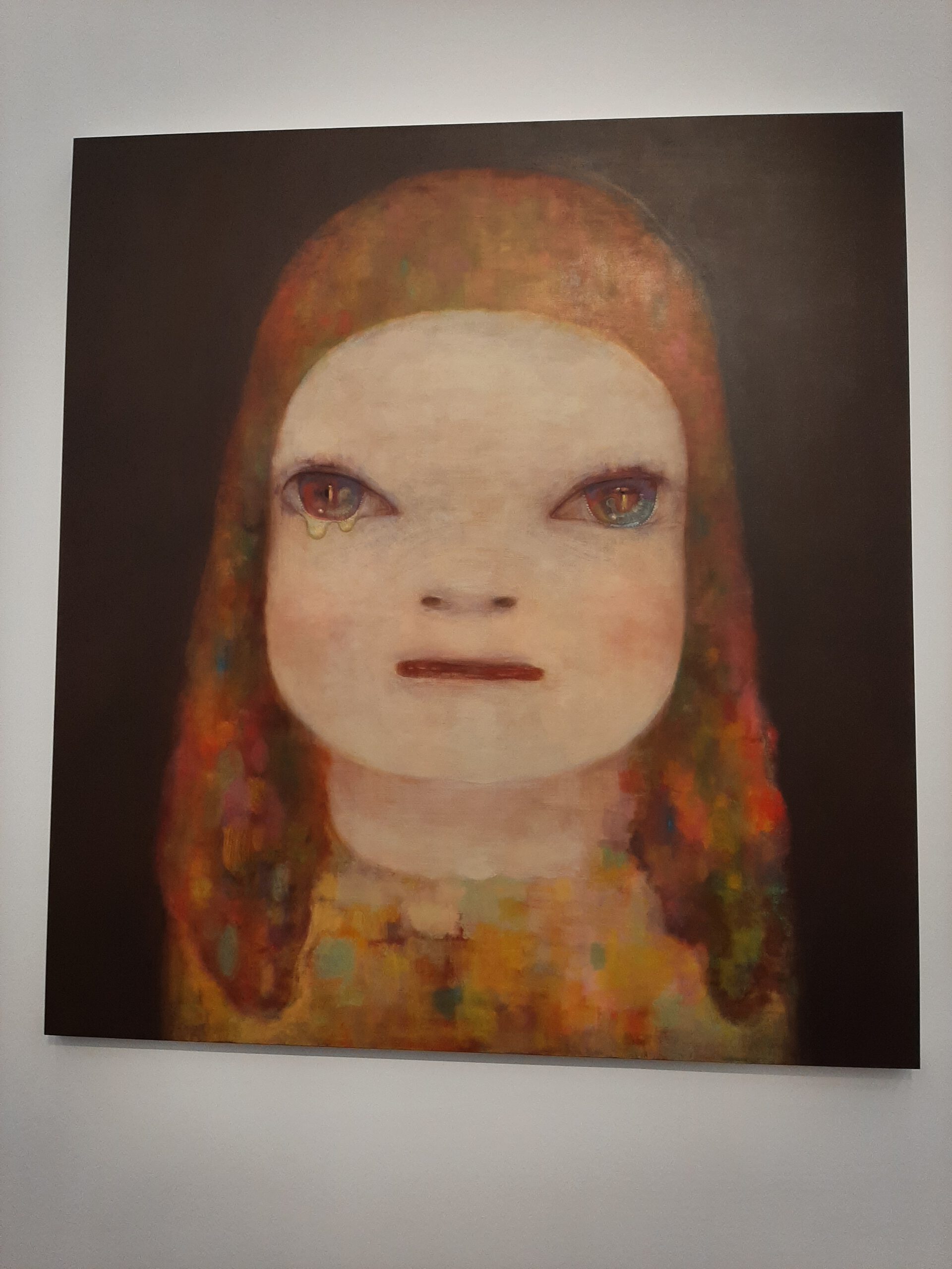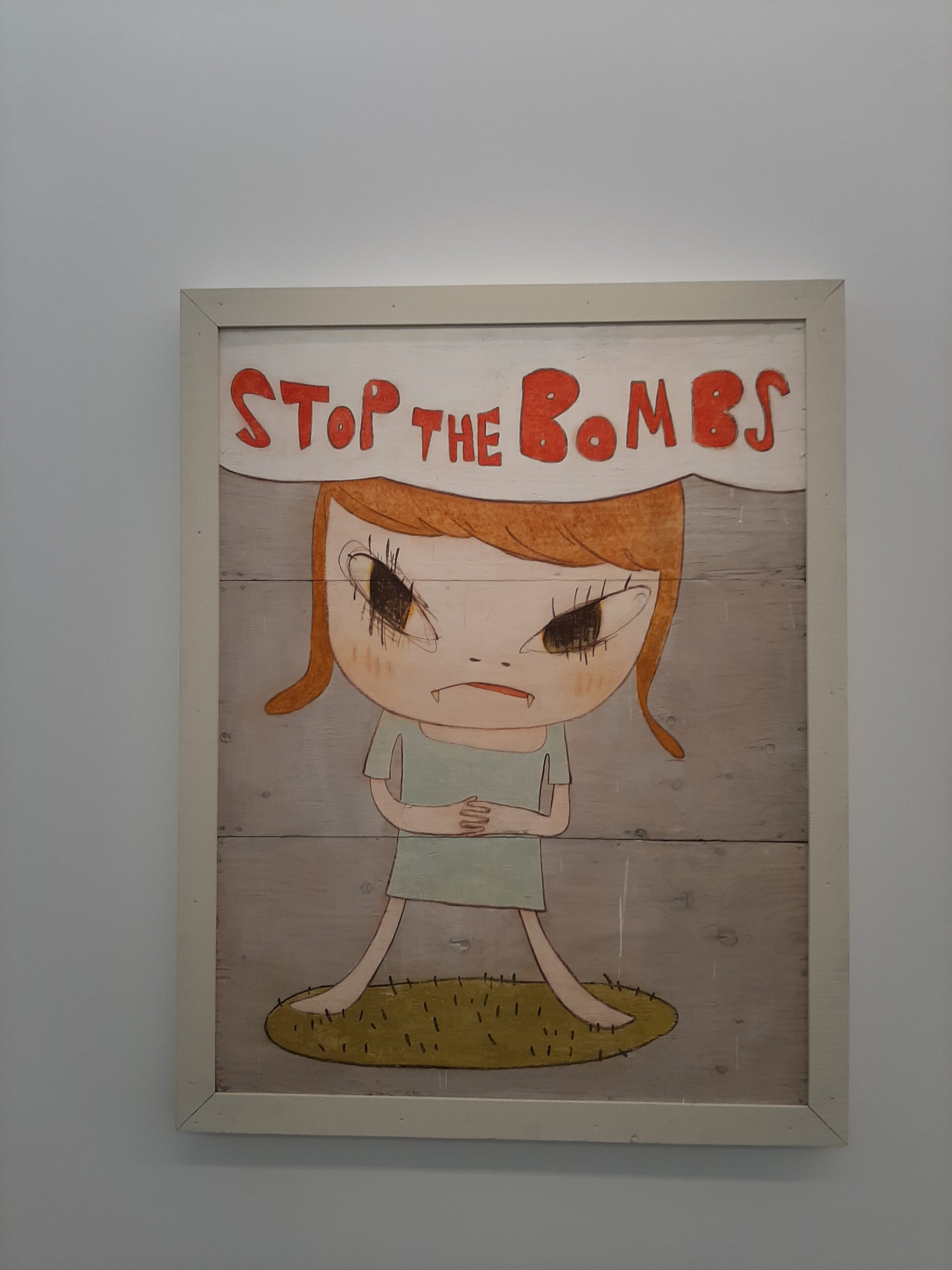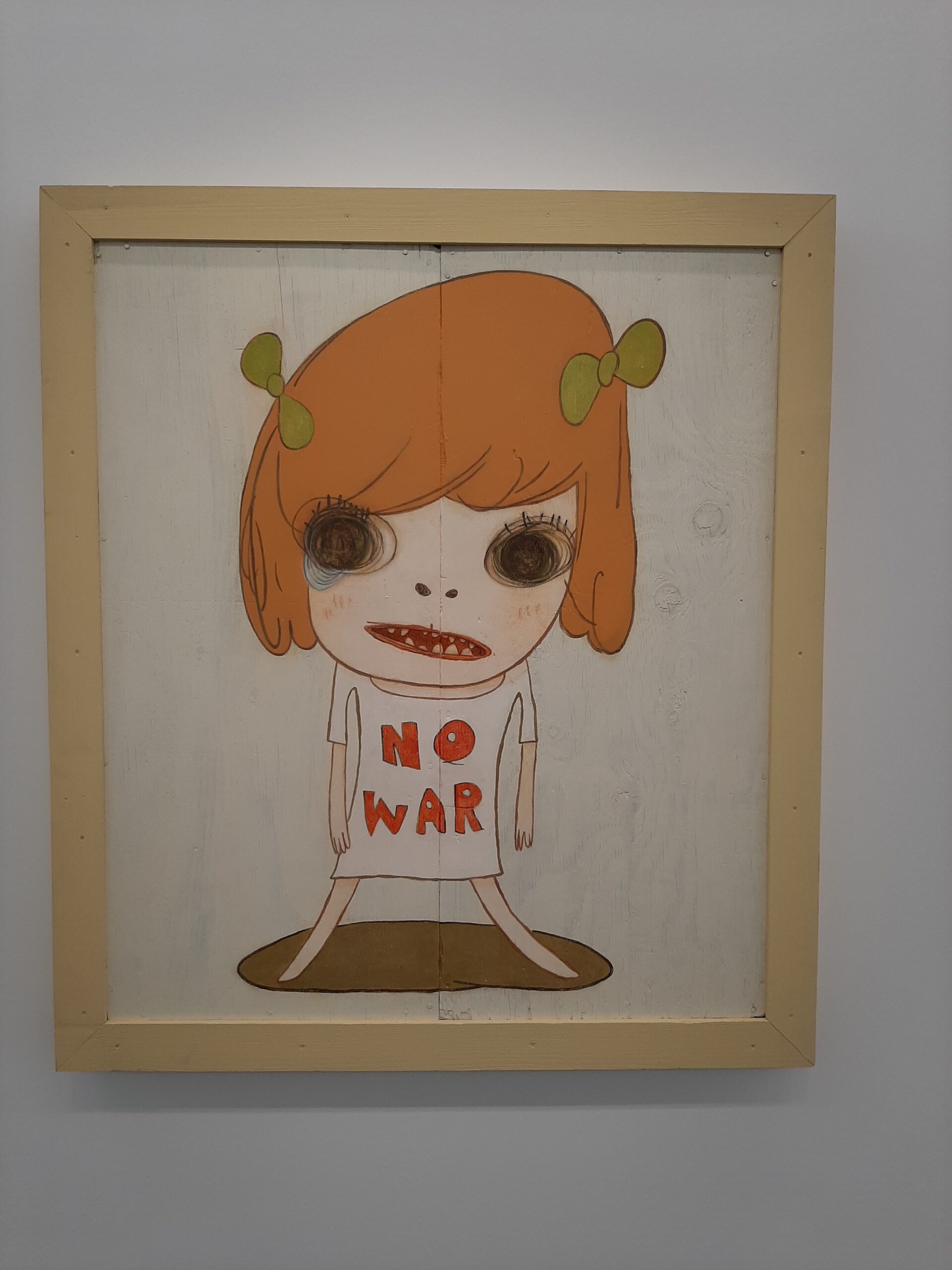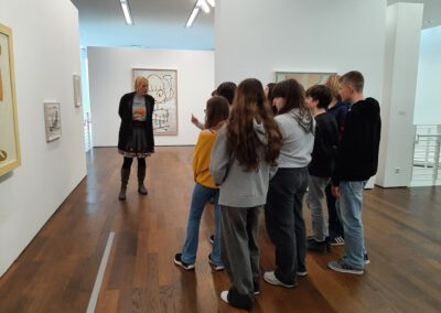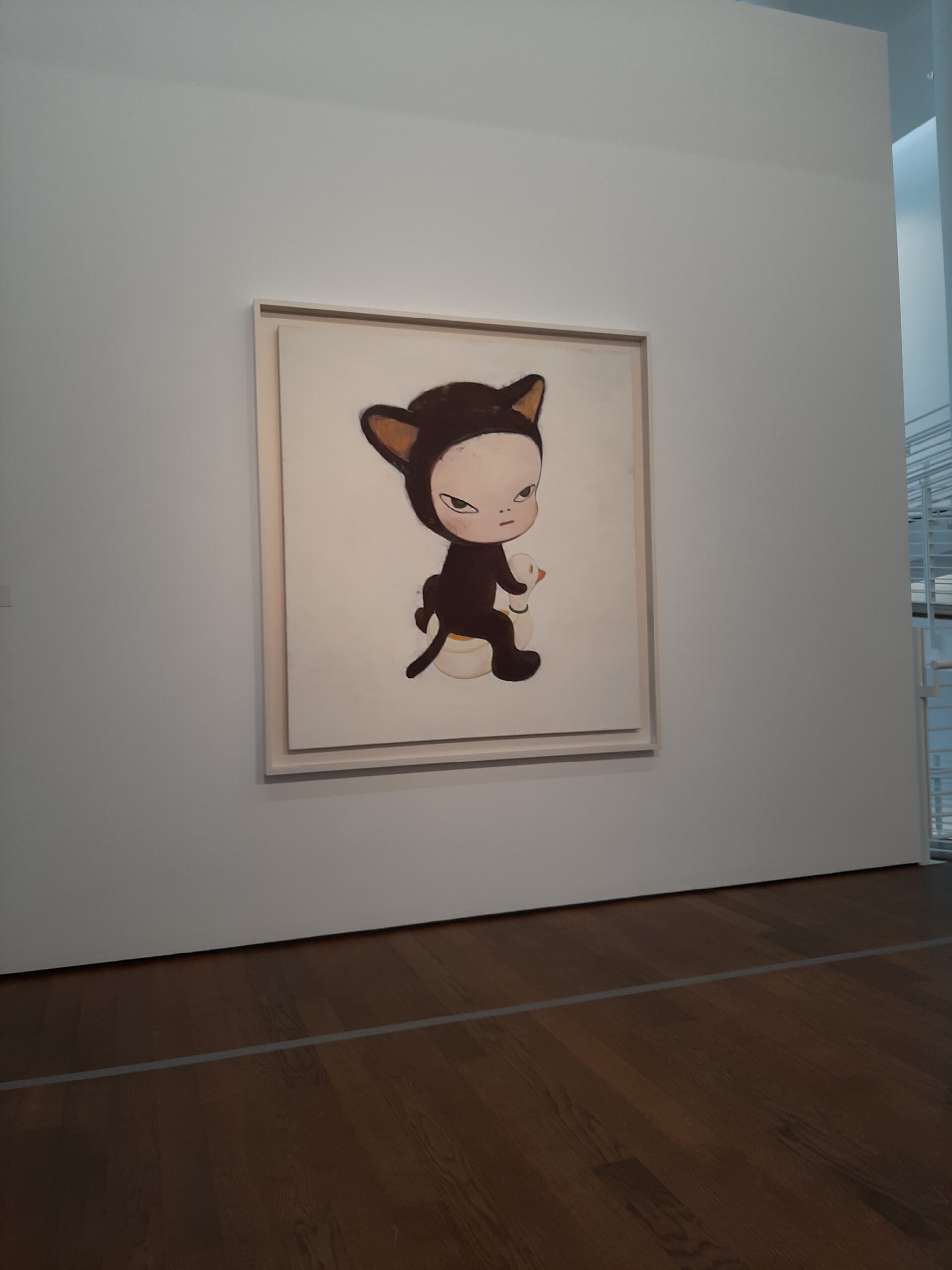 Dort erwartete uns eine Ausstellung des Künstlers Yoshitomo Nara. Gleich zu Beginn wurden wir zwei Museumsmitarbeiterinnen zugeteilt. Sie erläuterten uns die Sicherheitsvorschriften und Verhaltensregeln. Dann startete die Tour durch das Museum, bei der es Gemälde, Zeichnungen und Skulpturen des Künstlers zu sehen gab, die meist Mädchen mit großen Köpfen und großen Augen zeigten, die sogenannten „Angry Girls“. Diese Mädchen wirken wütend, traurig oder ängstlich. Bei vielen Bildern erklärten uns die Begleiterinnen, wie der Künstler sich beim Malen gefühlt oder was er gedacht hat. Nach der Tour hatten wir noch 20 Minuten die Gelegenheit, uns die Ausstellung eigenständig zu betrachten.