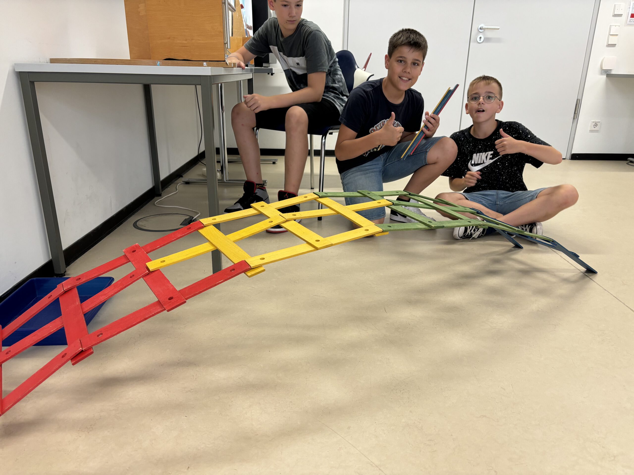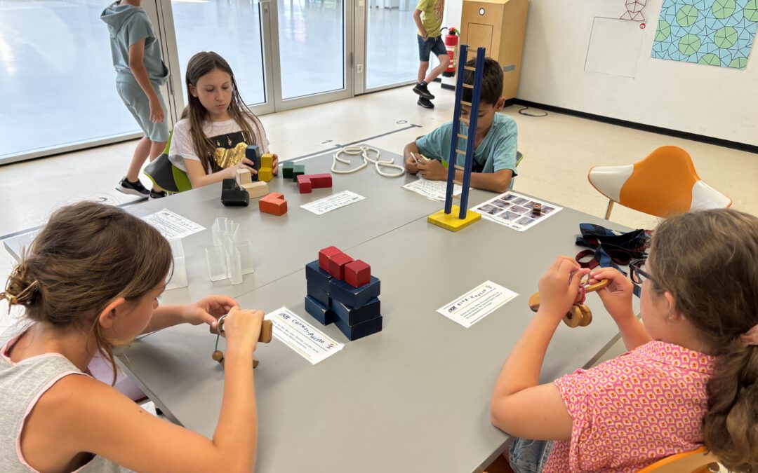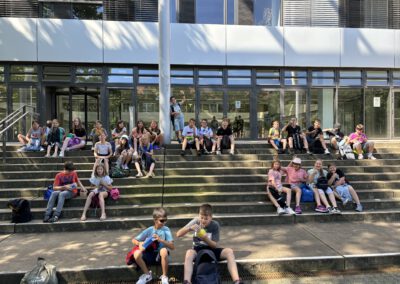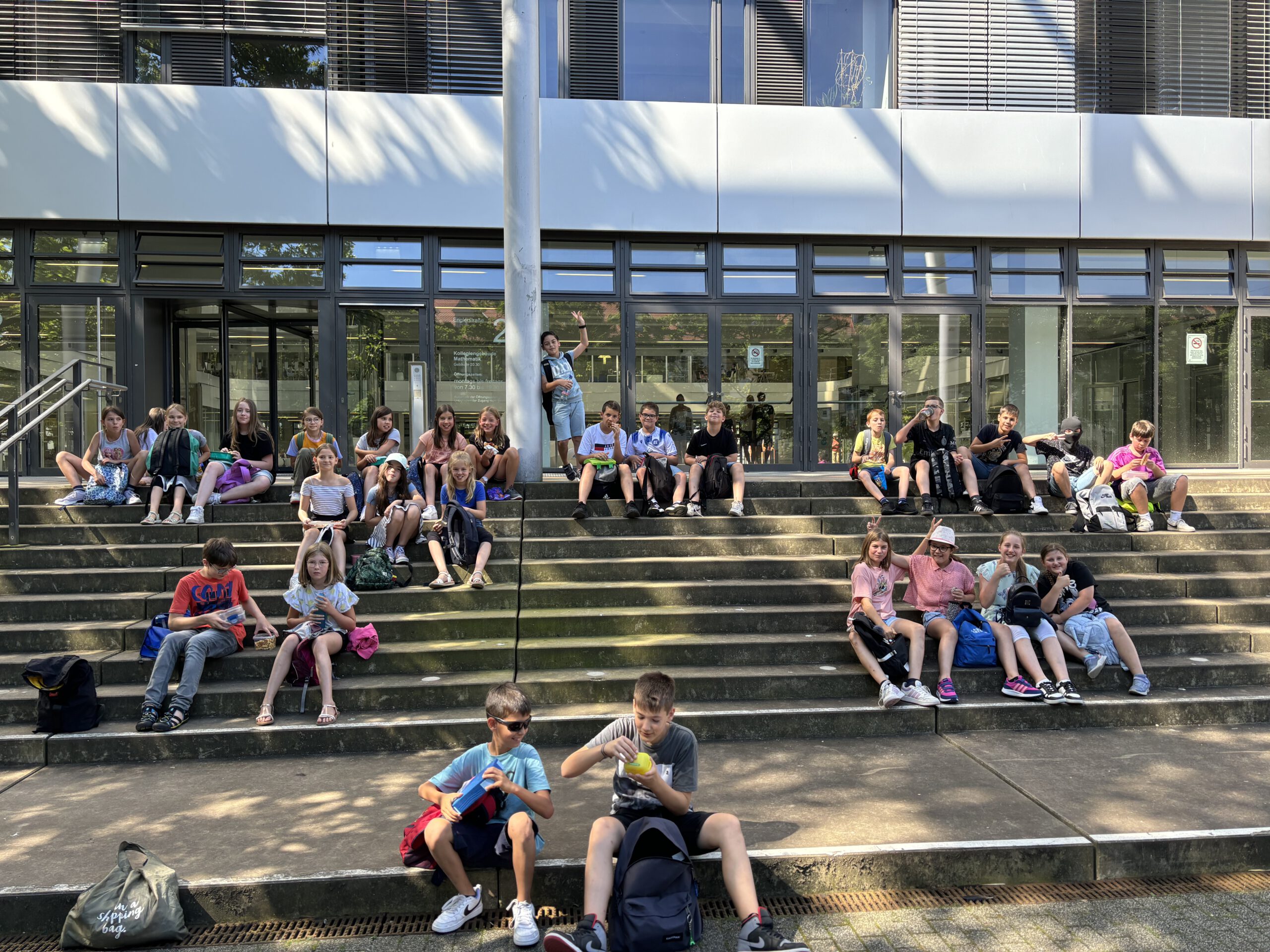 Es war ein ganz heißer Dienstagmorgen, als die Klasse 5c zu ihrem Ausflug ins Mathelabor nach Karlsruhe aufbrach. Bewaffnet mit Vesper und jeder Menge Süßigkeiten, konnten wir entspannt mit der S-Bahn von Bühl zur Zielhaltestelle in Karlsruhe fahren. Am Eingang des Instituts empfing uns keine verrückter Wissenschaftler, sondern eine freundliche Fakultätsmitarbeiterin, die uns an diesem Tag begleiten sollte. Auf dem Weg zum Labor durch die Gänge traten die Schüler*innen freudig in Kontakt mit den Menschen, die in ihren Büros mit offenen Türen arbeiteten. Besonders interessant fanden sie die Türschilder mit Doppeltiteln wie Prof. Dr., und es bestand keine Hemmung, neugierige Fragen zu stellen. Im Labor angekommen, erwartete uns eine Vielzahl an Stationen, die mathematisches Denken, Knobelspaß und Ideenreichtum vereinten. Sogar die Lehrkräfte machten fleißig mit. Die Zeit verging wie im Flug, sodass niemand einen Gedanken an Langeweile verschwendete. Mit glückseligen Gesichtern und voller neuer Eindrücke kehrten wir zur Schule zurück.
