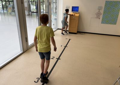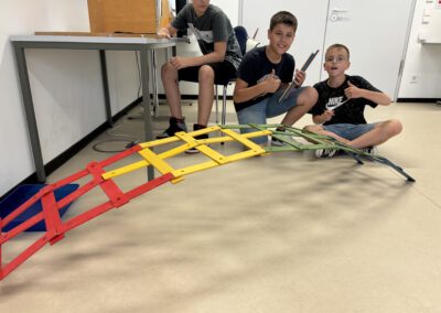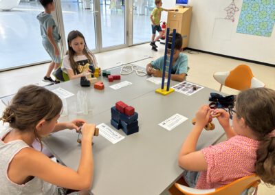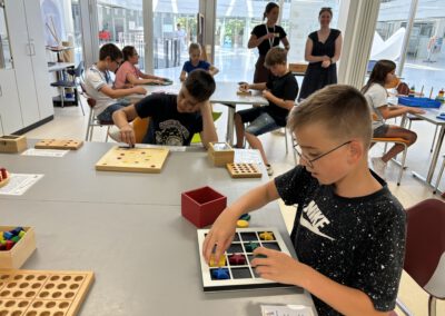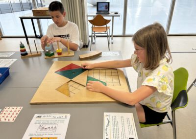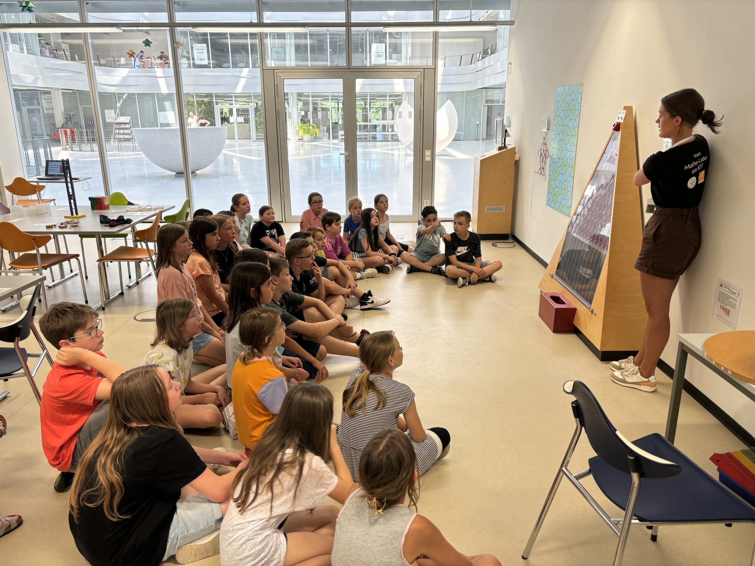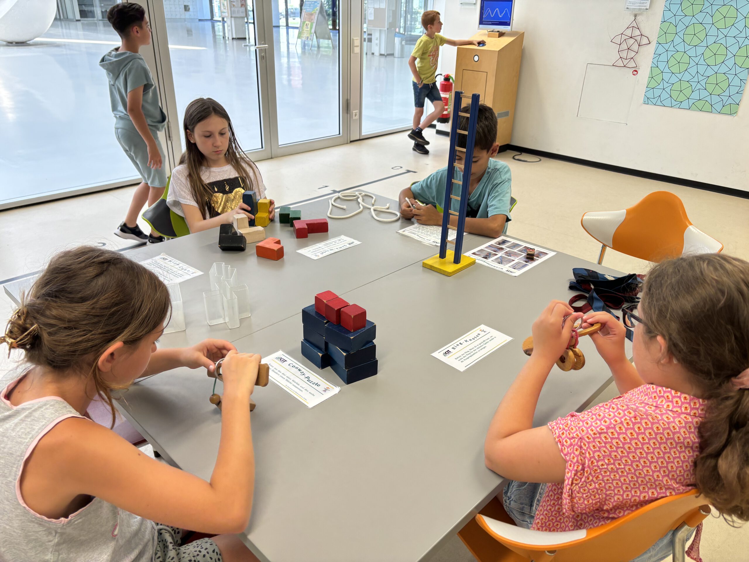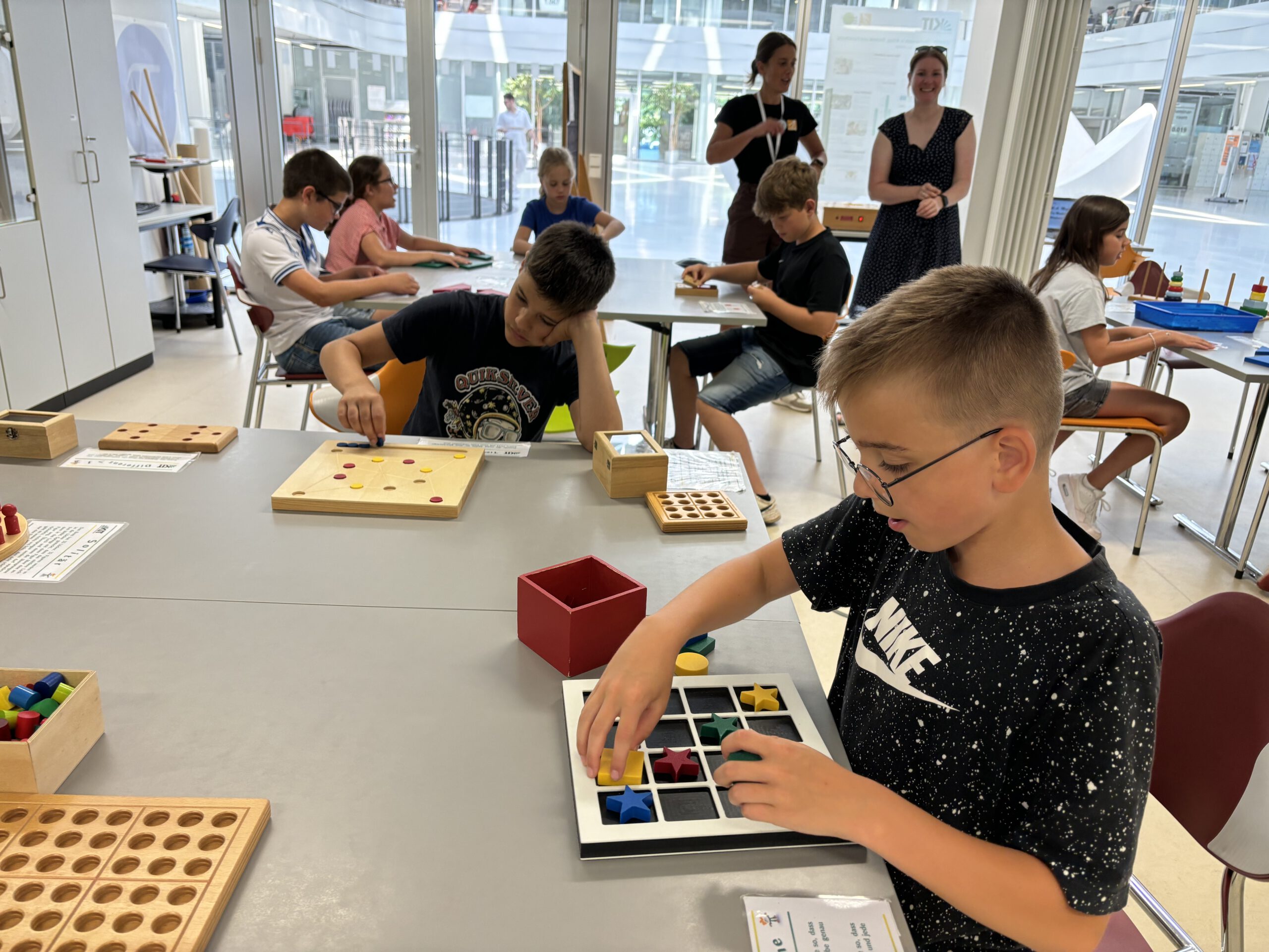 Es war ein ganz heißer Dienstagmorgen, als die Klasse 5c zu ihrem Ausflug ins Mathelabor nach Karlsruhe aufbrach. Bewaffnet mit Vesper und jeder Menge Süßigkeiten, konnten wir entspannt mit der S-Bahn von Bühl zur Zielhaltestelle in Karlsruhe fahren. Am Eingang des Instituts empfing uns keine verrückter Wissenschaftler, sondern eine freundliche Fakultätsmitarbeiterin, die uns an diesem Tag begleiten sollte. Auf dem Weg zum Labor durch die Gänge traten die Schüler*innen freudig in Kontakt mit den Menschen, die in ihren Büros mit offenen Türen arbeiteten. Besonders interessant fanden sie die Türschilder mit Doppeltiteln wie Prof. Dr., und es bestand keine Hemmung, neugierige Fragen zu stellen. Im Labor angekommen, erwartete uns eine Vielzahl an Stationen, die mathematisches Denken, Knobelspaß und Ideenreichtum vereinten. Sogar die Lehrkräfte machten fleißig mit. Die Zeit verging wie im Flug, sodass niemand einen Gedanken an Langeweile verschwendete. Mit glückseligen Gesichtern und voller neuer Eindrücke kehrten wir zur Schule zurück.