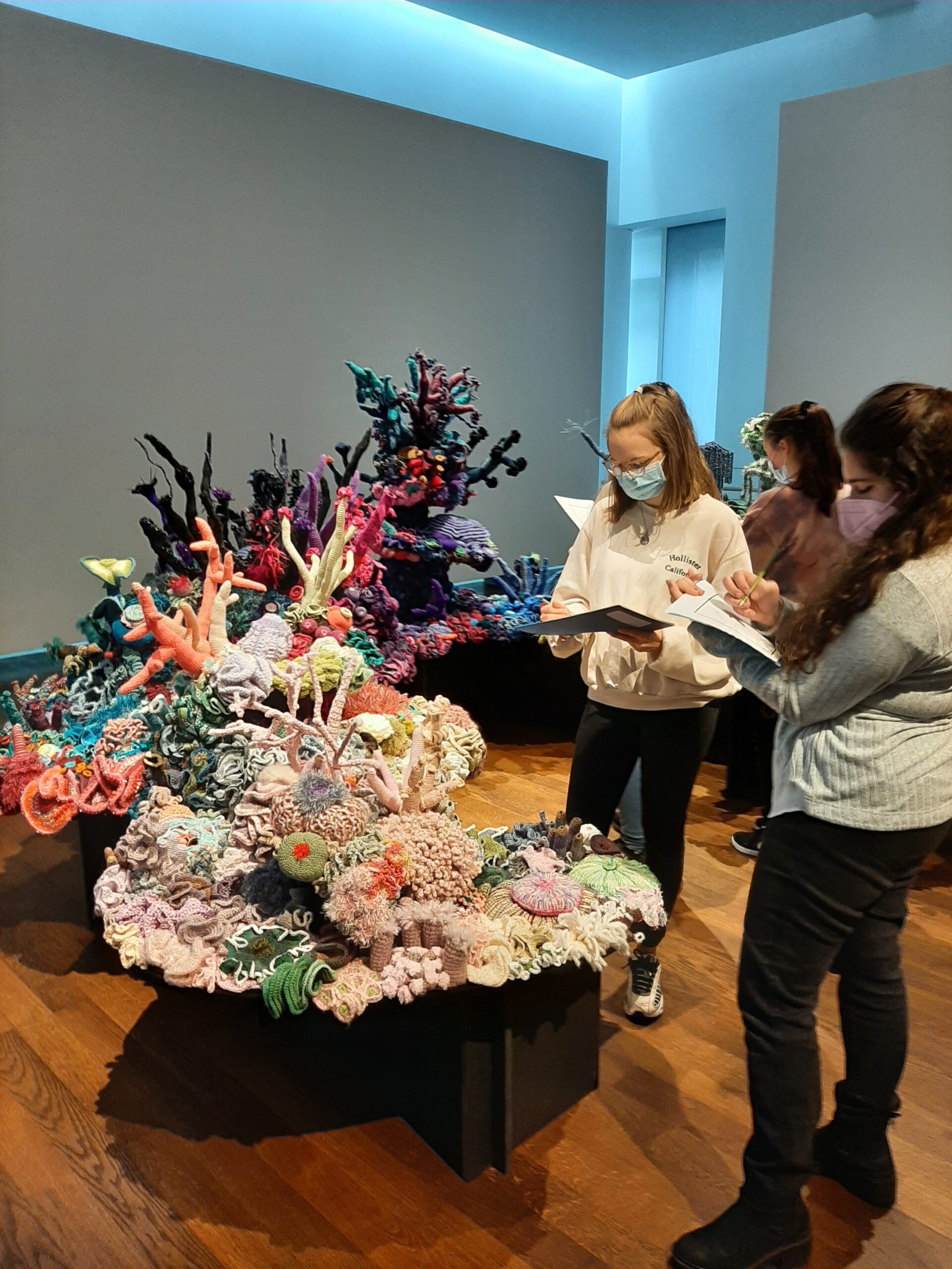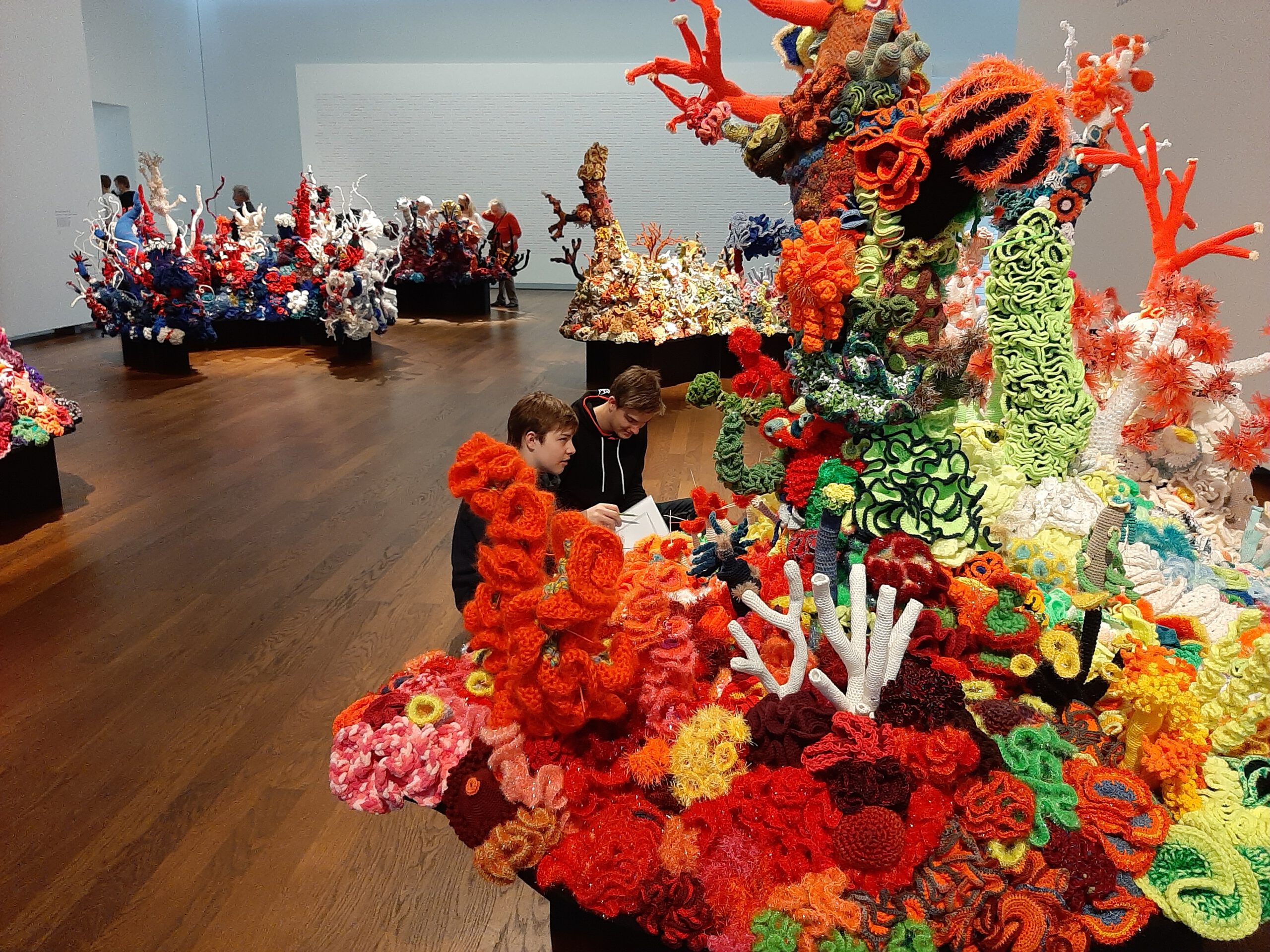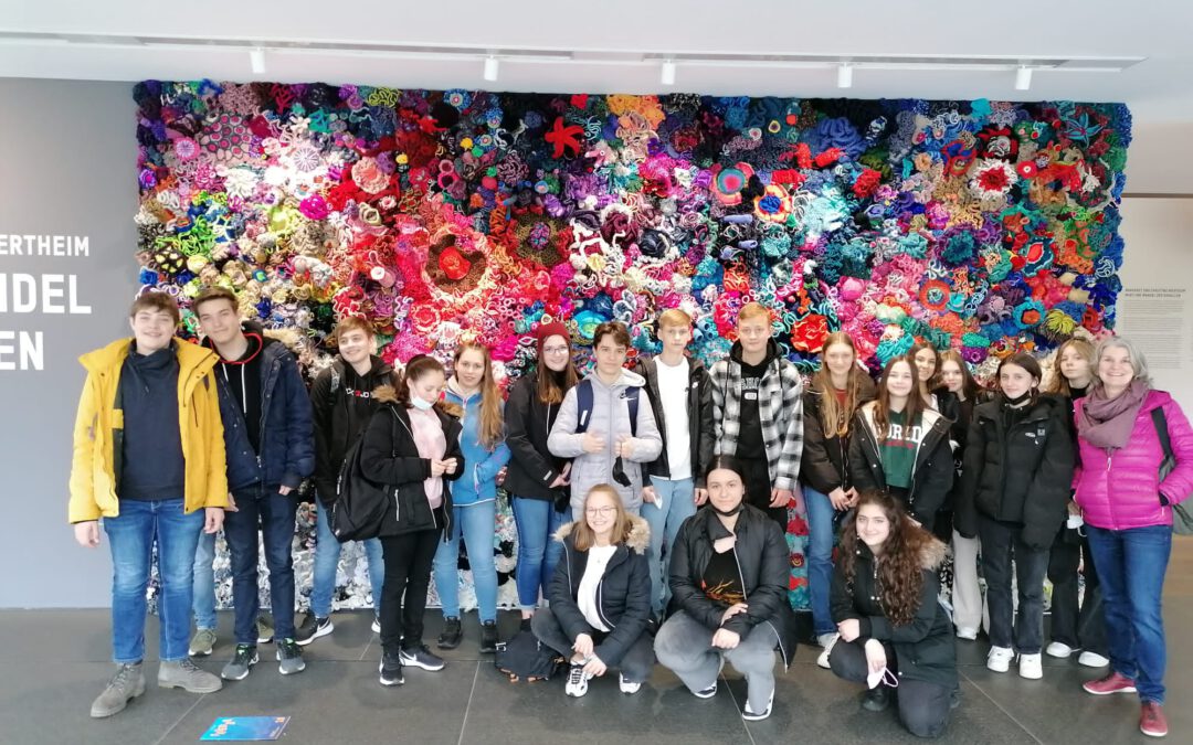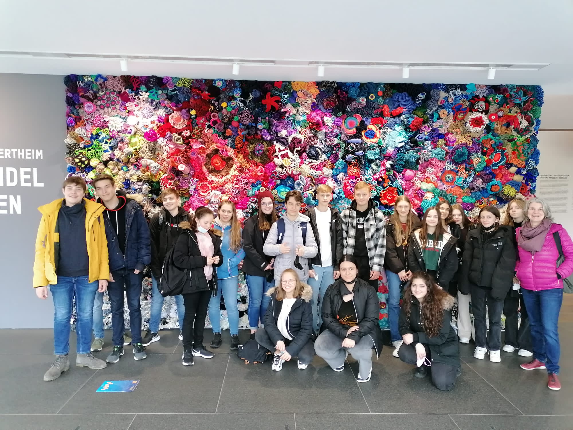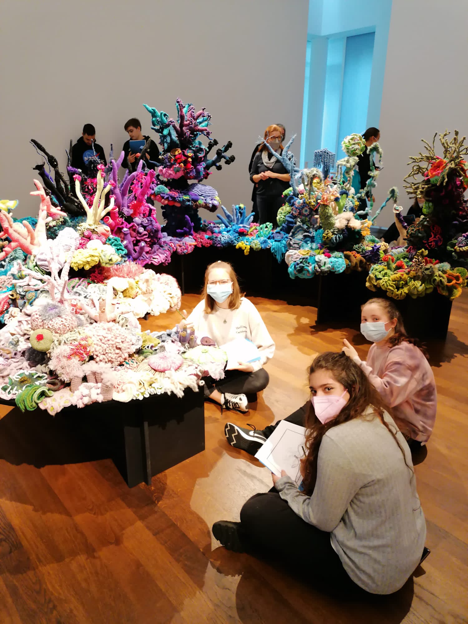 Nun kamen auch die Führerinnen, die Klasse teilte sich in zwei Gruppen auf. Frau Habich und ihre Begleitung teilten uns vor Besuch des Museums noch kurz die Sicherheitsvorschriften mit. Endlich ging es ins Museum. Zuerst durften wir unsere Rucksäcke und Jacken in der Kabine im Keller lassen. Die Führung startete an einem großen Müllsack wo die Führerinnen uns erklärten, dass dies der Konsum der Angestellten sei. Ziemlich beeindruckend das viele Plastik! Die Gruppen trennten sich, zuerst stiegen wir in den Aufzug wo wir die Korallen beobachtet haben, die nach Tiefe des Meeres farblich sortiert sind. Im Erdgeschoss angekommen, ging es weiter in eine große Ausstellung mit riesigen Korallen von den Zwillingen Christine und Margaret Wertheimer erstellten Kunstwerken.
