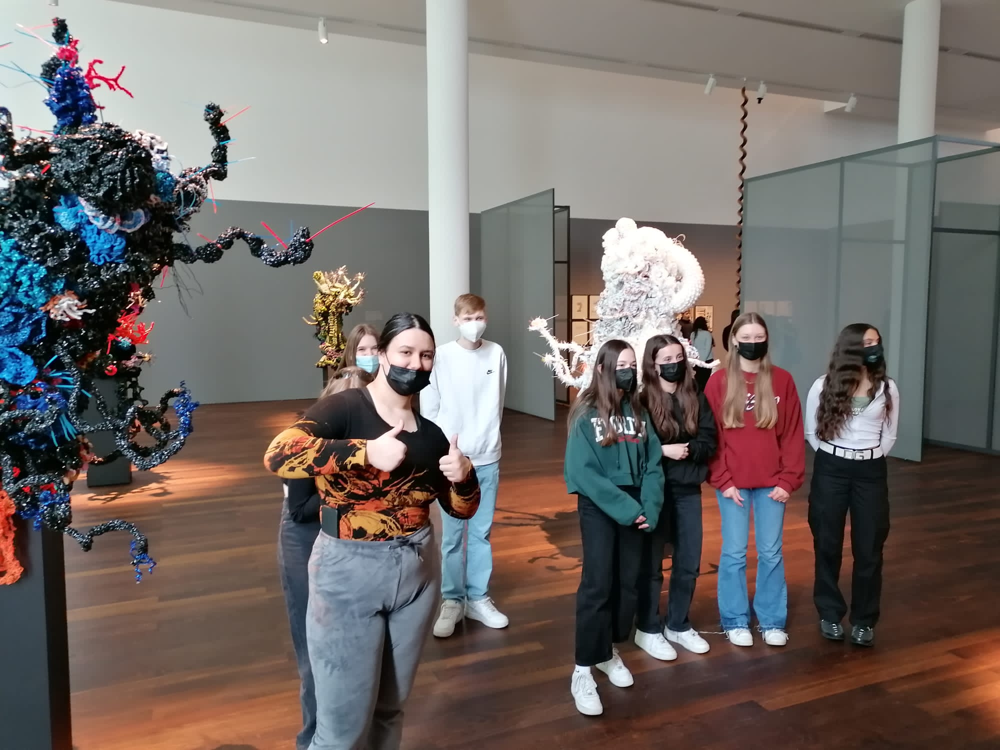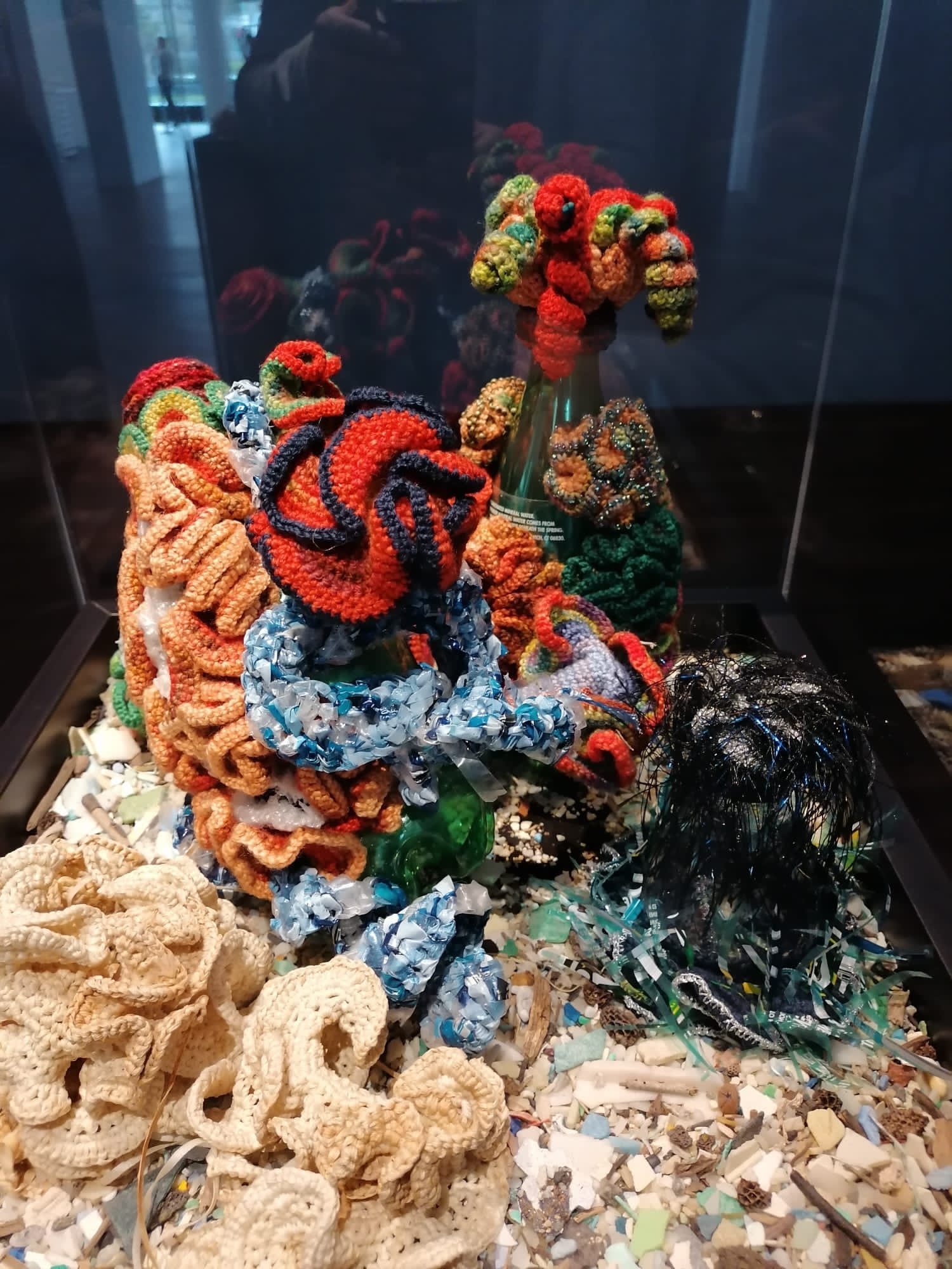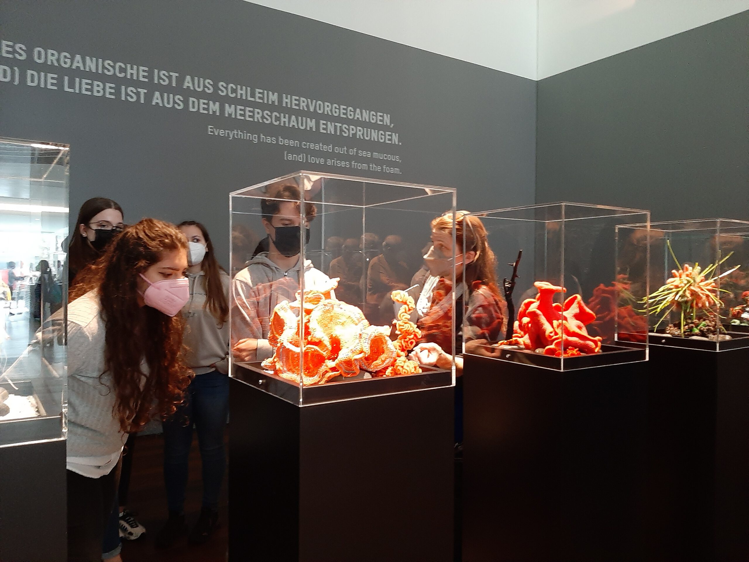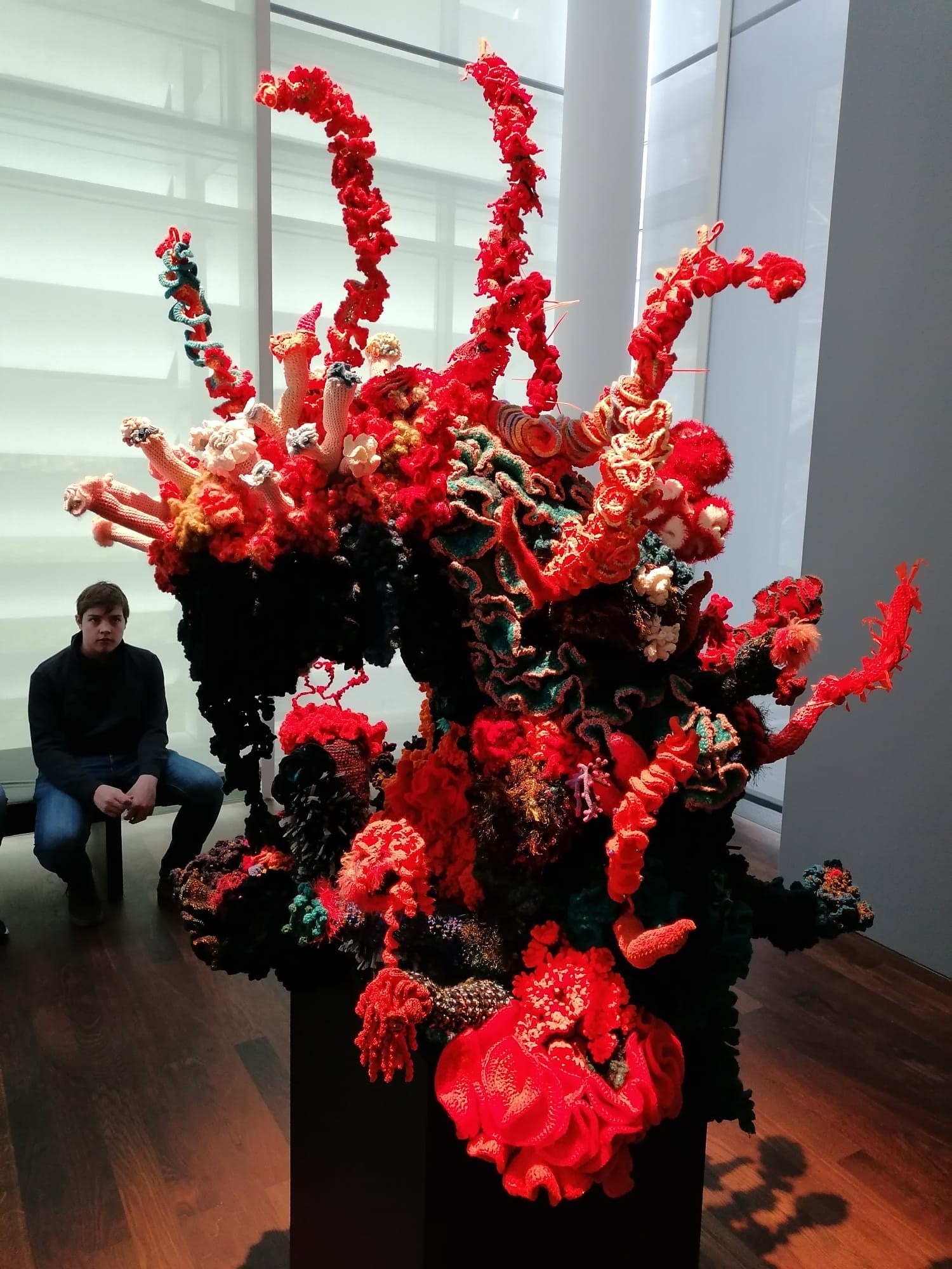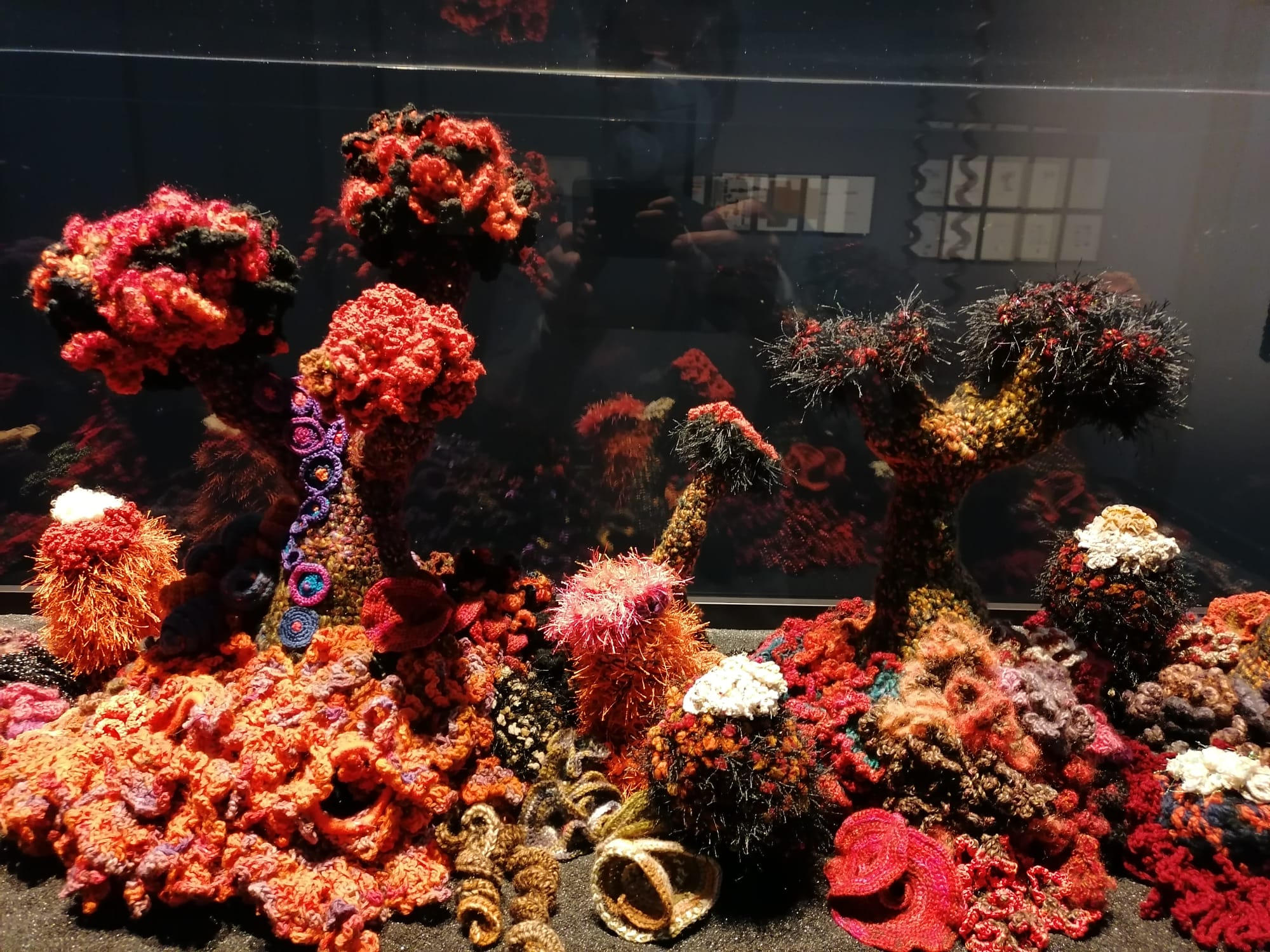 Nun kamen auch die Führerinnen, die Klasse teilte sich in zwei Gruppen auf. Frau Habich und ihre Begleitung teilten uns vor Besuch des Museums noch kurz die Sicherheitsvorschriften mit. Endlich ging es ins Museum. Zuerst durften wir unsere Rucksäcke und Jacken in der Kabine im Keller lassen. Die Führung startete an einem großen Müllsack wo die Führerinnen uns erklärten, dass dies der Konsum der Angestellten sei. Ziemlich beeindruckend das viele Plastik! Die Gruppen trennten sich, zuerst stiegen wir in den Aufzug wo wir die Korallen beobachtet haben, die nach Tiefe des Meeres farblich sortiert sind. Im Erdgeschoss angekommen, ging es weiter in eine große Ausstellung mit riesigen Korallen von den Zwillingen Christine und Margaret Wertheimer erstellten Kunstwerken.