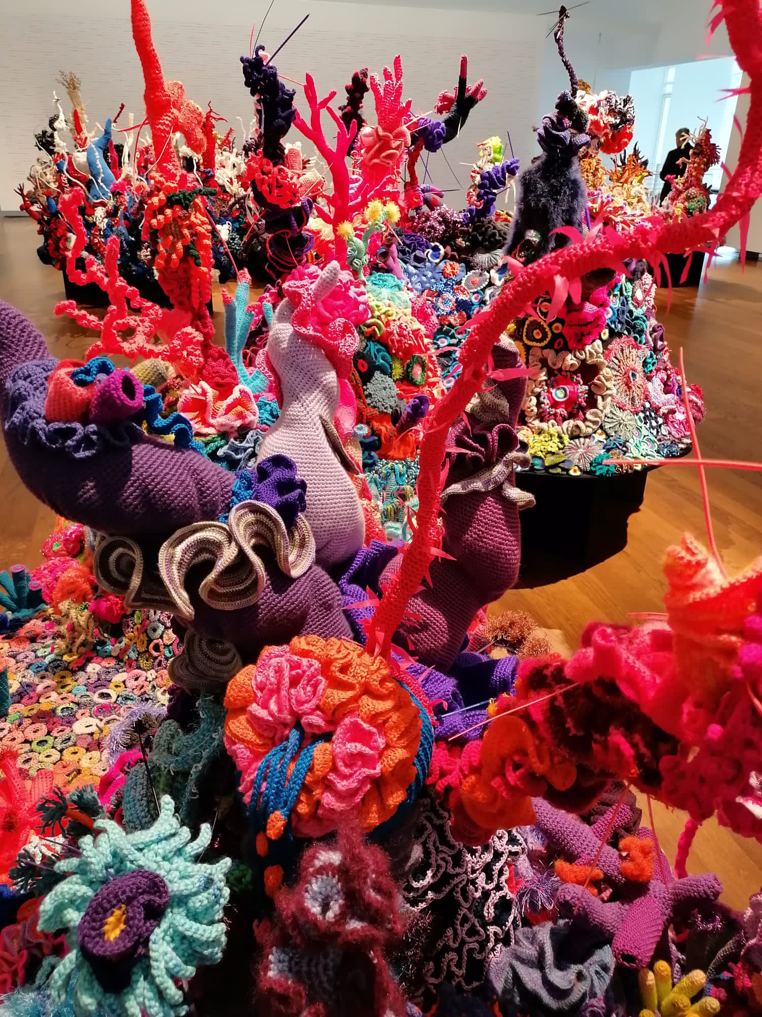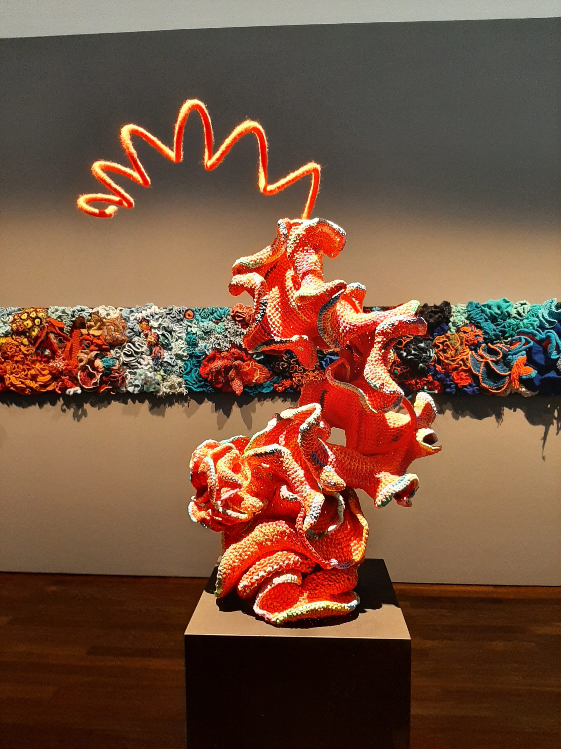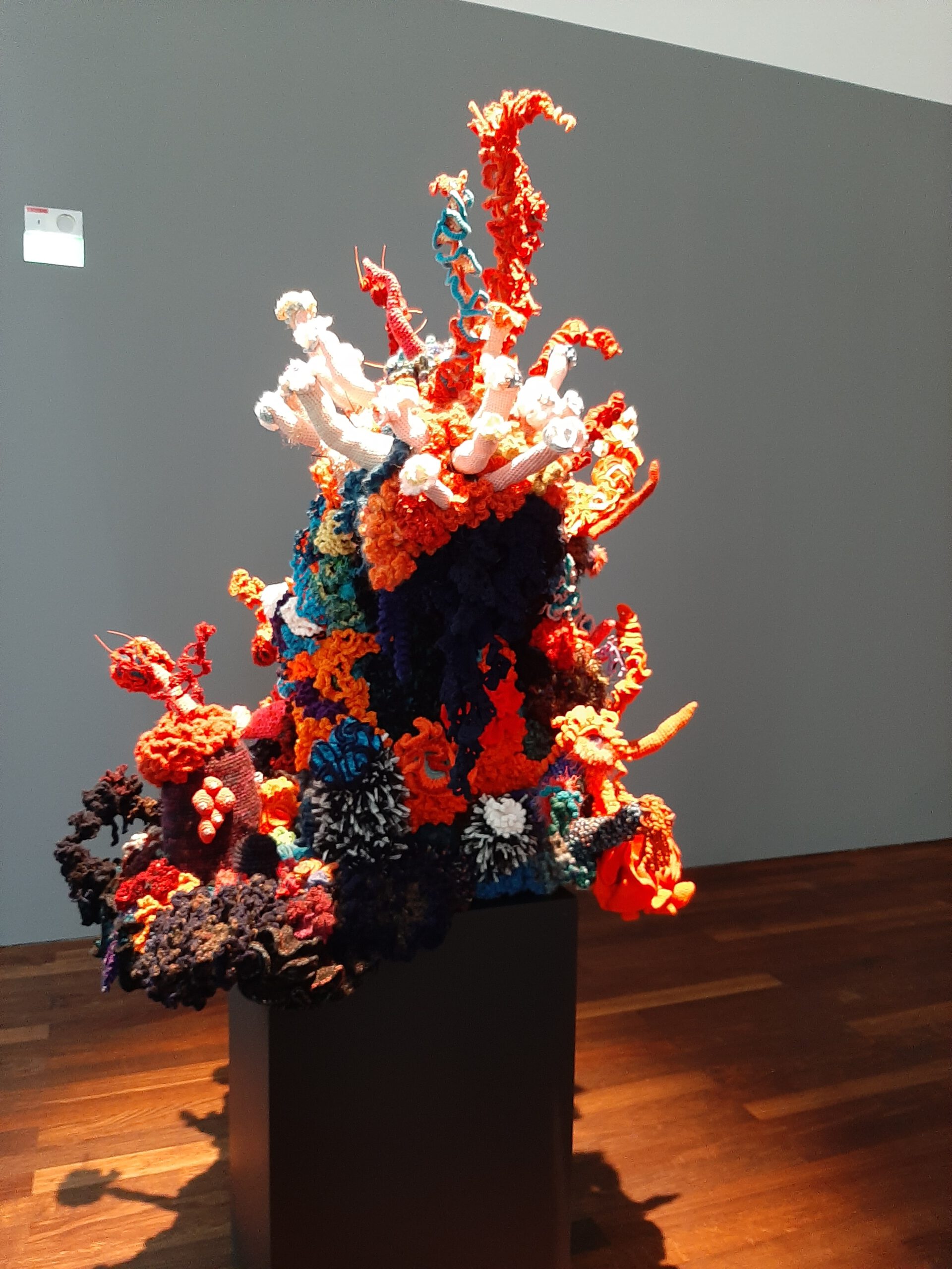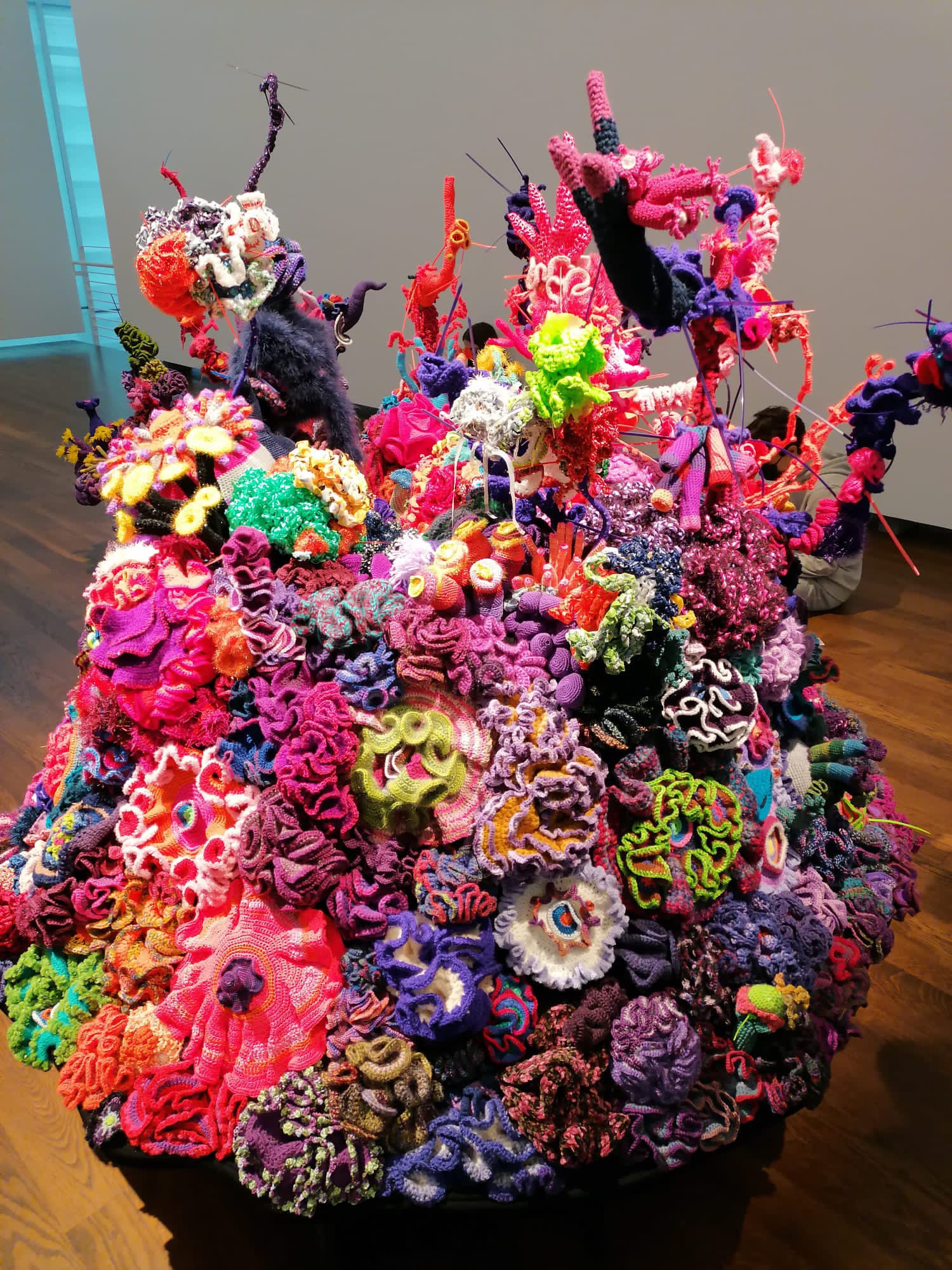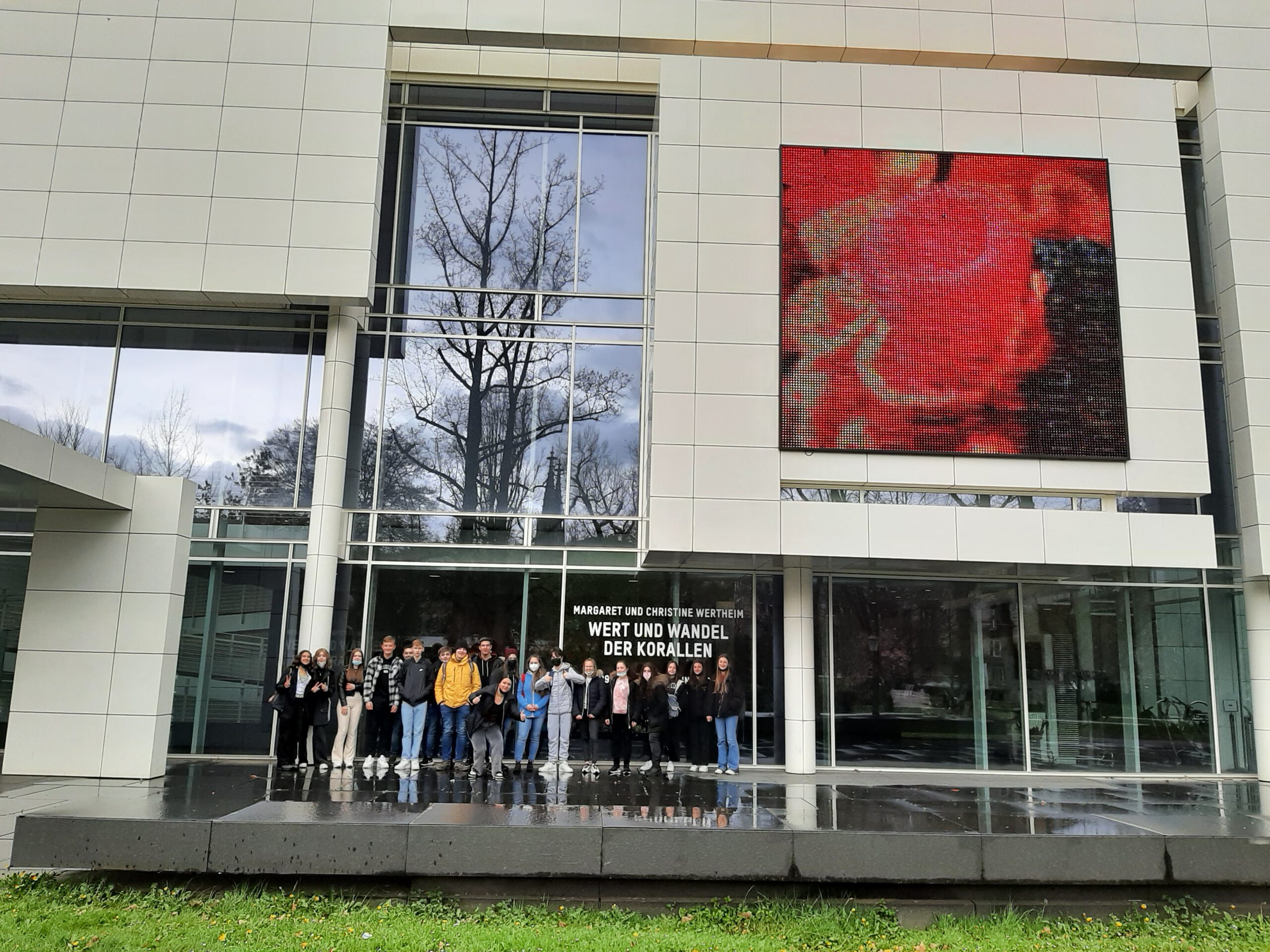Nun kamen auch die Führerinnen, die Klasse teilte sich in zwei Gruppen auf. Frau Habich und ihre Begleitung teilten uns vor Besuch des Museums noch kurz die Sicherheitsvorschriften mit. Endlich ging es ins Museum. Zuerst durften wir unsere Rucksäcke und Jacken in der Kabine im Keller lassen. Die Führung startete an einem großen Müllsack wo die Führerinnen uns erklärten, dass dies der Konsum der Angestellten sei. Ziemlich beeindruckend das viele Plastik! Die Gruppen trennten sich, zuerst stiegen wir in den Aufzug wo wir die Korallen beobachtet haben, die nach Tiefe des Meeres farblich sortiert sind. Im Erdgeschoss angekommen, ging es weiter in eine große Ausstellung mit riesigen Korallen von den Zwillingen Christine und Margaret Wertheimer erstellten Kunstwerken.