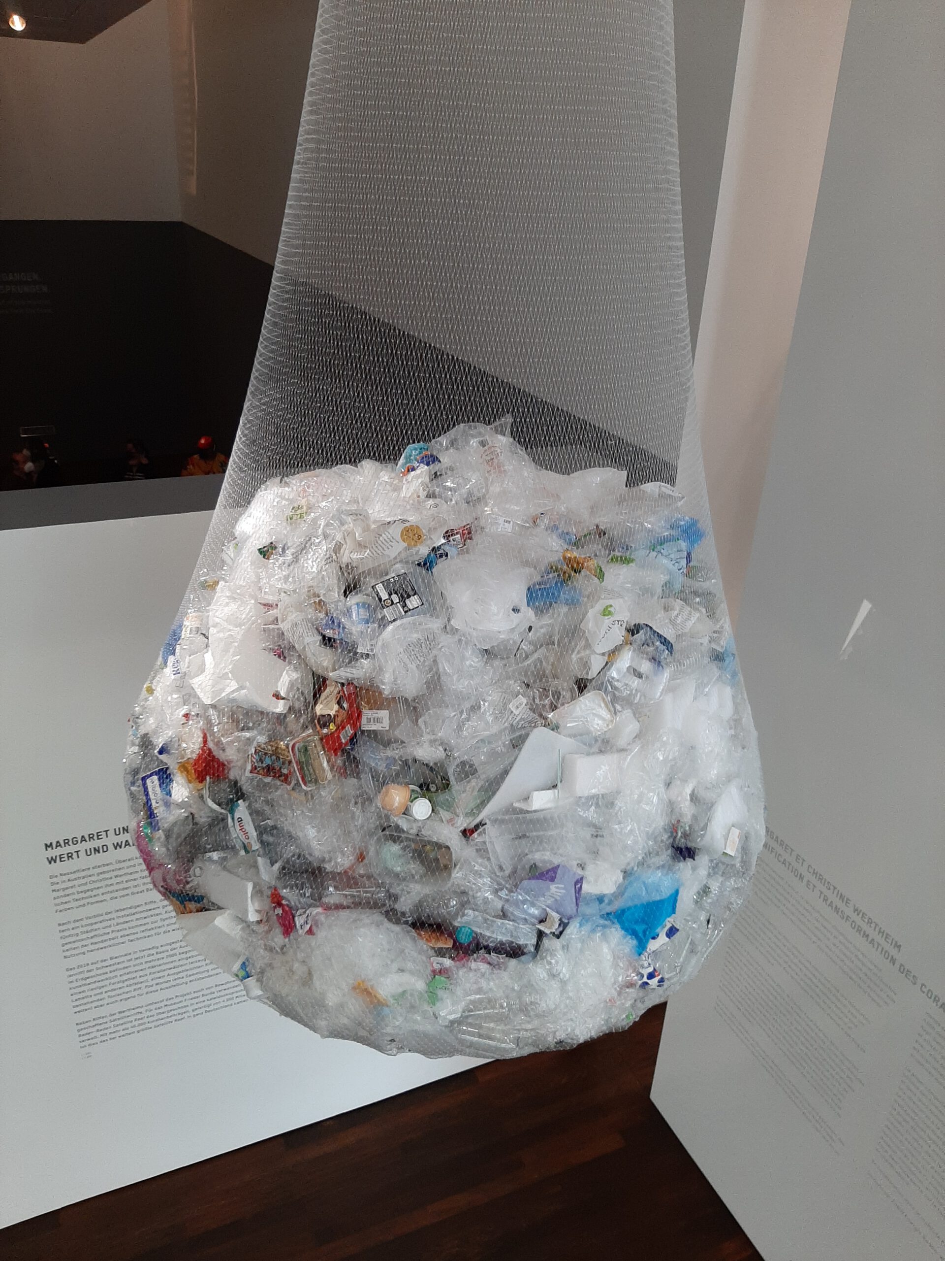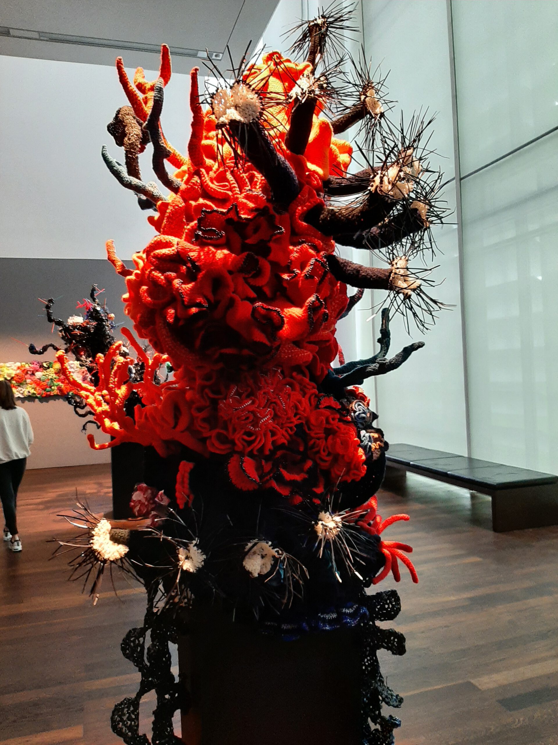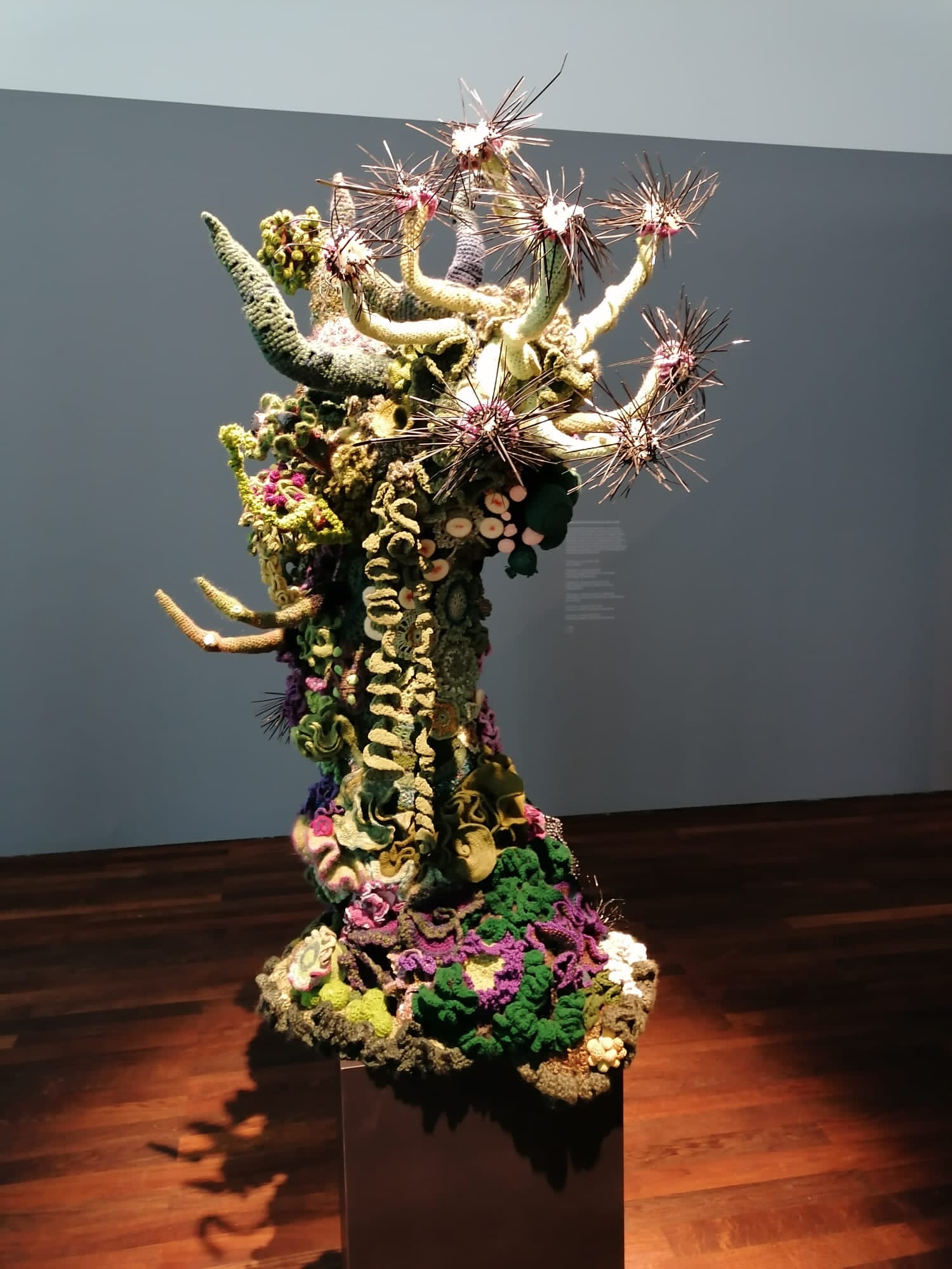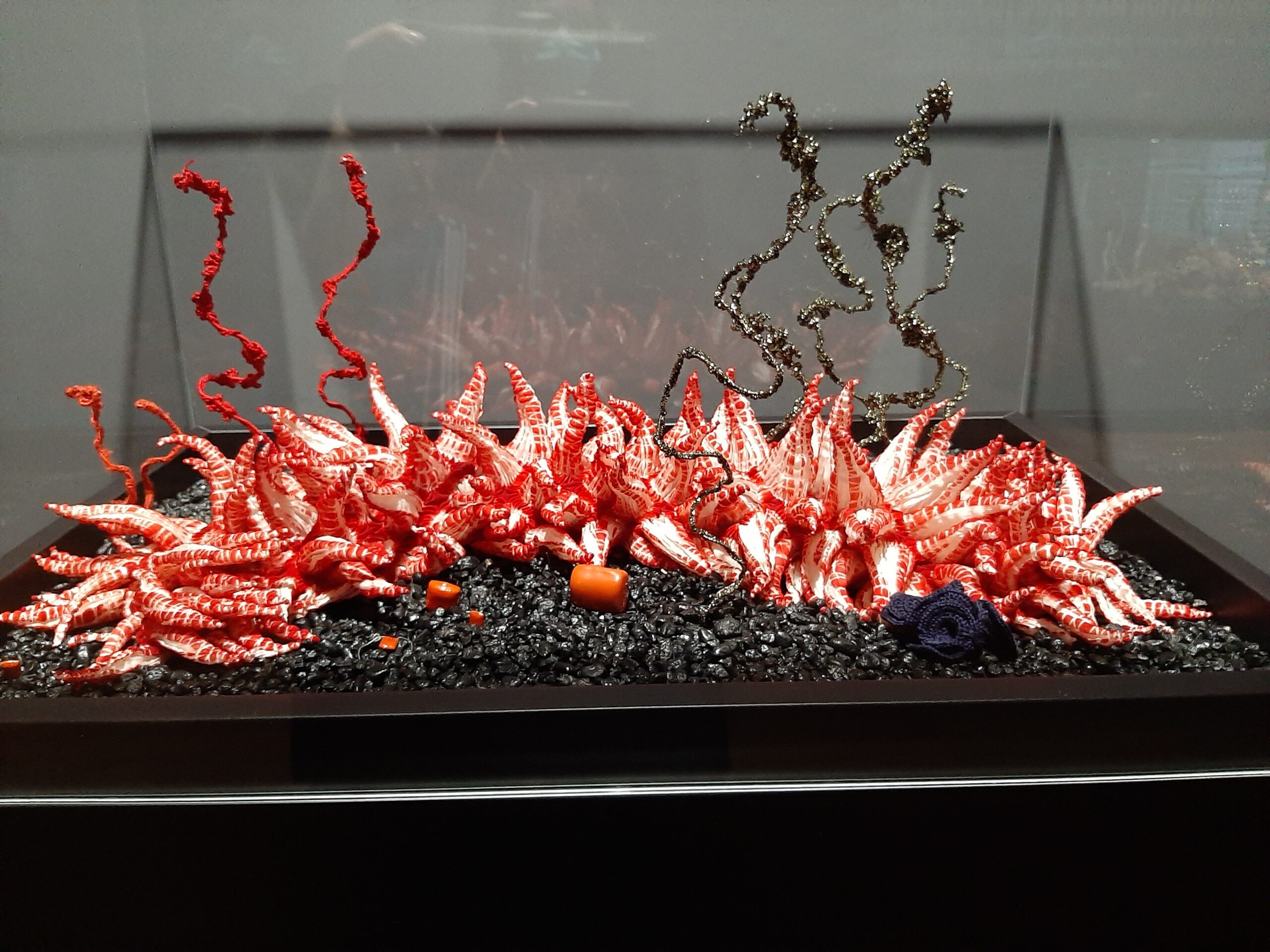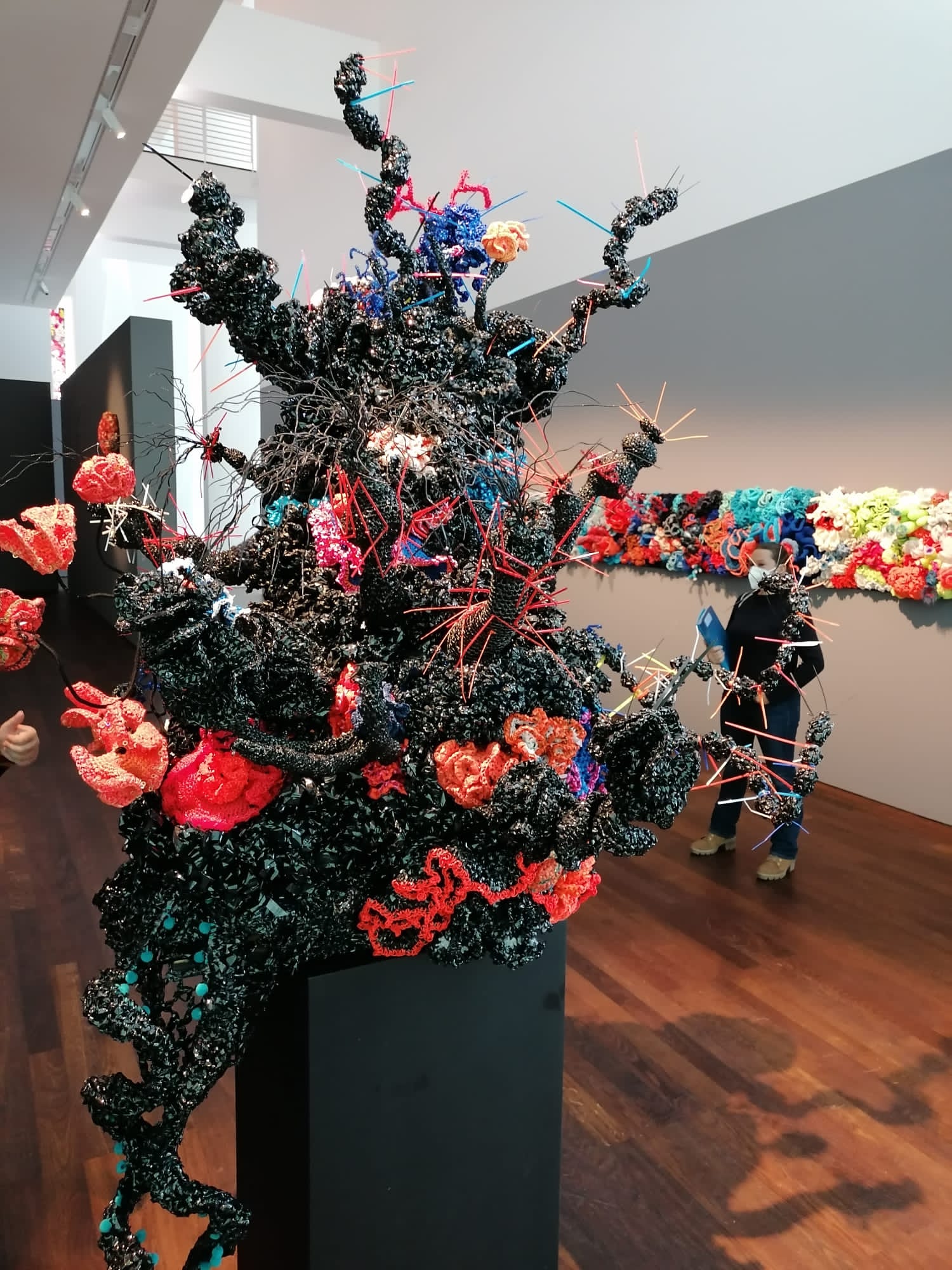 Nun kamen auch die Führerinnen, die Klasse teilte sich in zwei Gruppen auf. Frau Habich und ihre Begleitung teilten uns vor Besuch des Museums noch kurz die Sicherheitsvorschriften mit. Endlich ging es ins Museum. Zuerst durften wir unsere Rucksäcke und Jacken in der Kabine im Keller lassen. Die Führung startete an einem großen Müllsack wo die Führerinnen uns erklärten, dass dies der Konsum der Angestellten sei. Ziemlich beeindruckend das viele Plastik! Die Gruppen trennten sich, zuerst stiegen wir in den Aufzug wo wir die Korallen beobachtet haben, die nach Tiefe des Meeres farblich sortiert sind. Im Erdgeschoss angekommen, ging es weiter in eine große Ausstellung mit riesigen Korallen von den Zwillingen Christine und Margaret Wertheimer erstellten Kunstwerken.