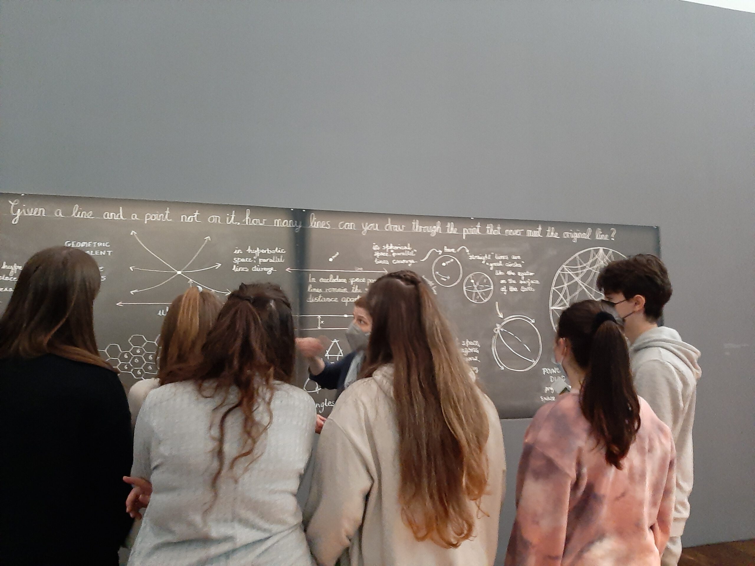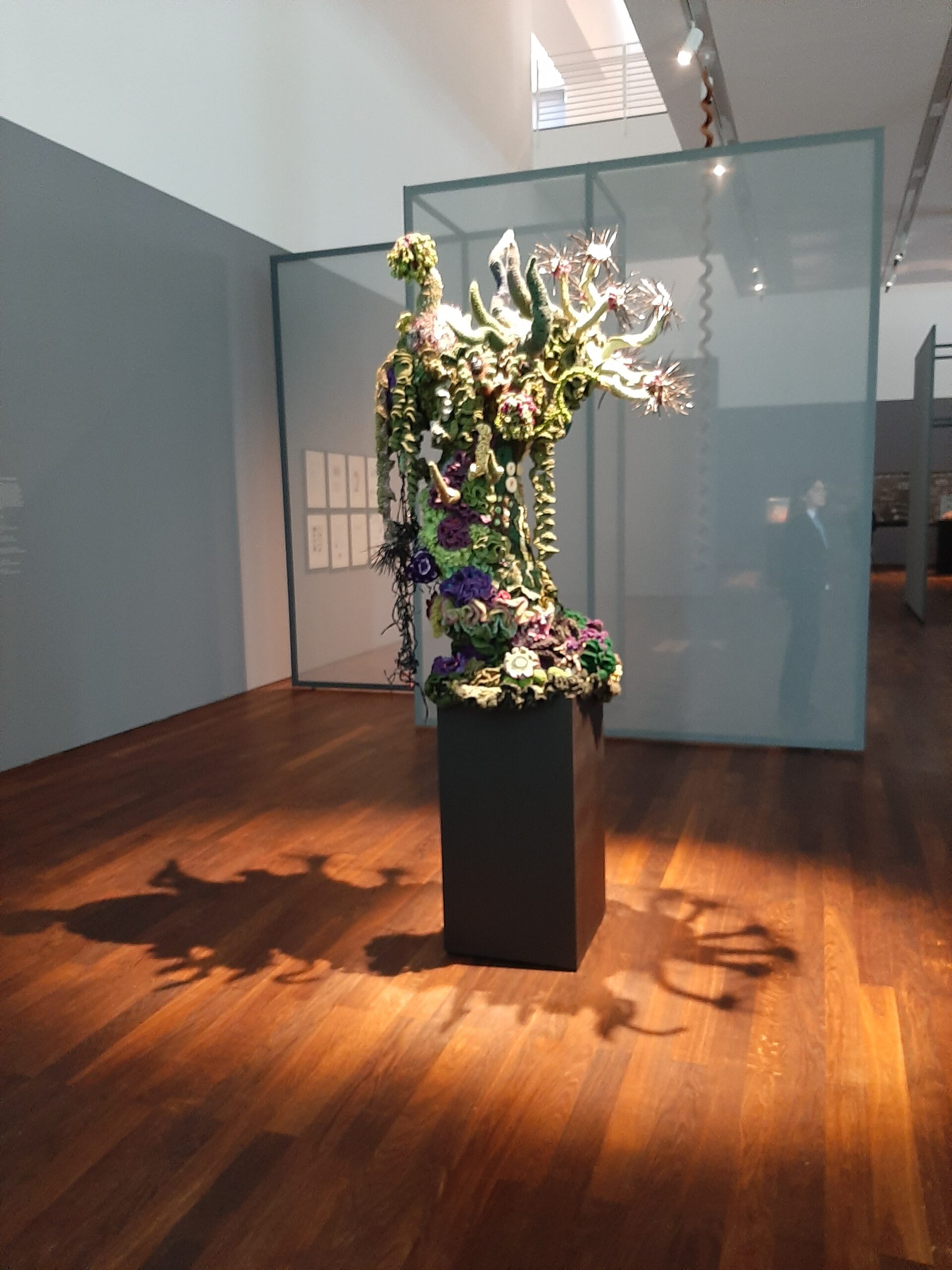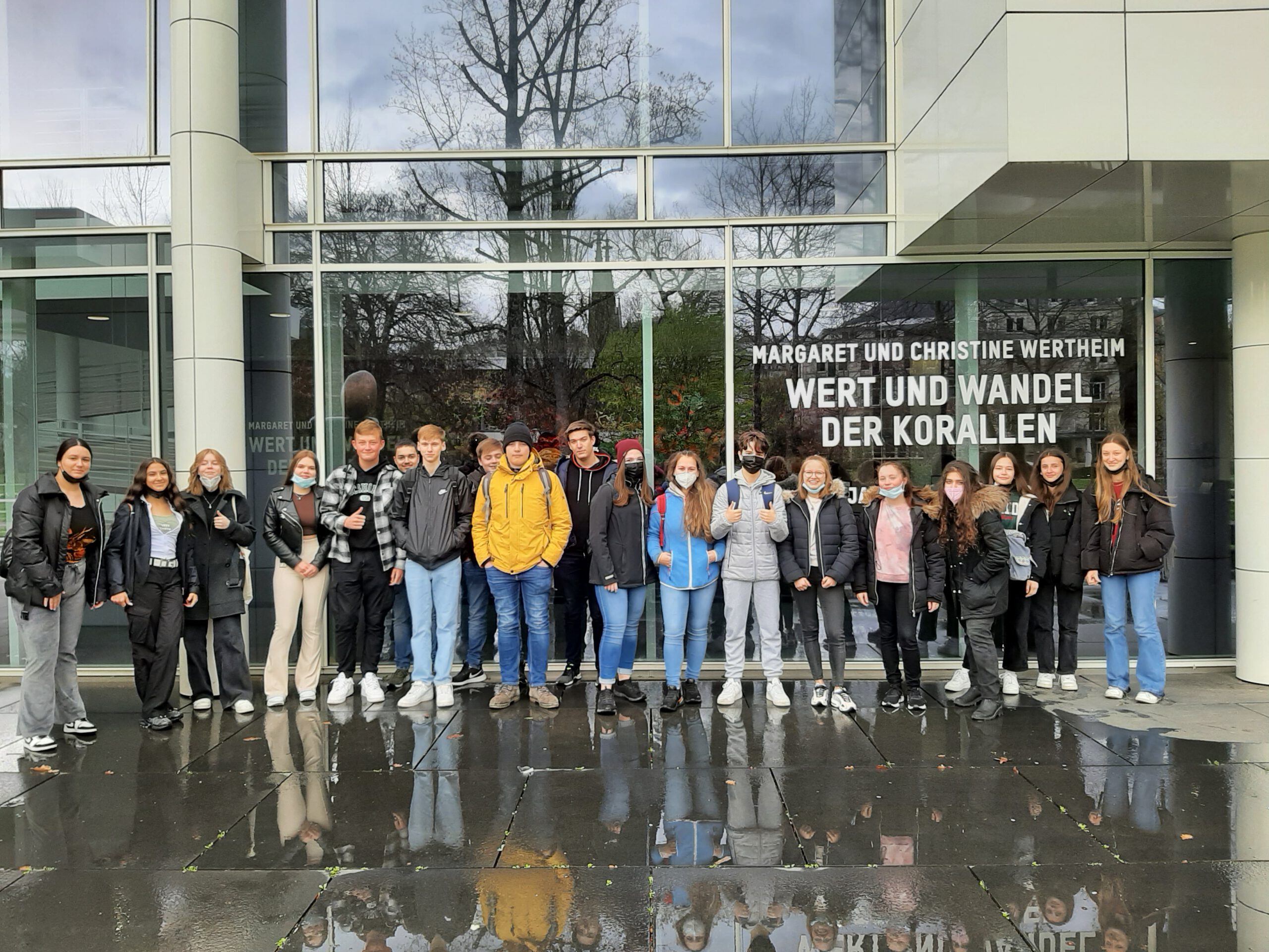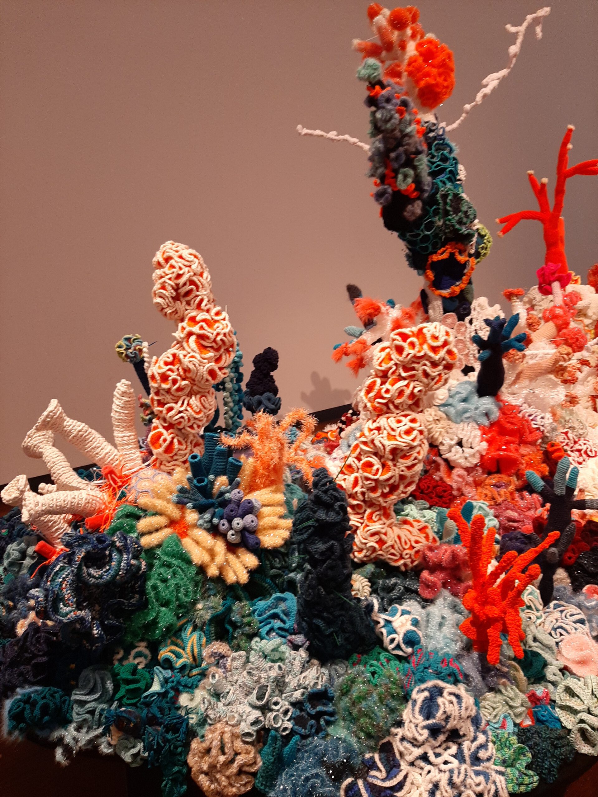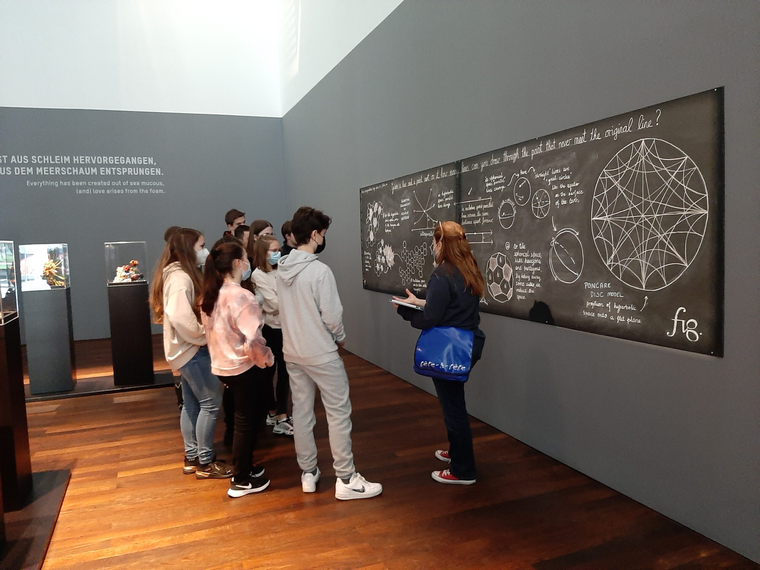 Nun kamen auch die Führerinnen, die Klasse teilte sich in zwei Gruppen auf. Frau Habich und ihre Begleitung teilten uns vor Besuch des Museums noch kurz die Sicherheitsvorschriften mit. Endlich ging es ins Museum. Zuerst durften wir unsere Rucksäcke und Jacken in der Kabine im Keller lassen. Die Führung startete an einem großen Müllsack wo die Führerinnen uns erklärten, dass dies der Konsum der Angestellten sei. Ziemlich beeindruckend das viele Plastik! Die Gruppen trennten sich, zuerst stiegen wir in den Aufzug wo wir die Korallen beobachtet haben, die nach Tiefe des Meeres farblich sortiert sind. Im Erdgeschoss angekommen, ging es weiter in eine große Ausstellung mit riesigen Korallen von den Zwillingen Christine und Margaret Wertheimer erstellten Kunstwerken.