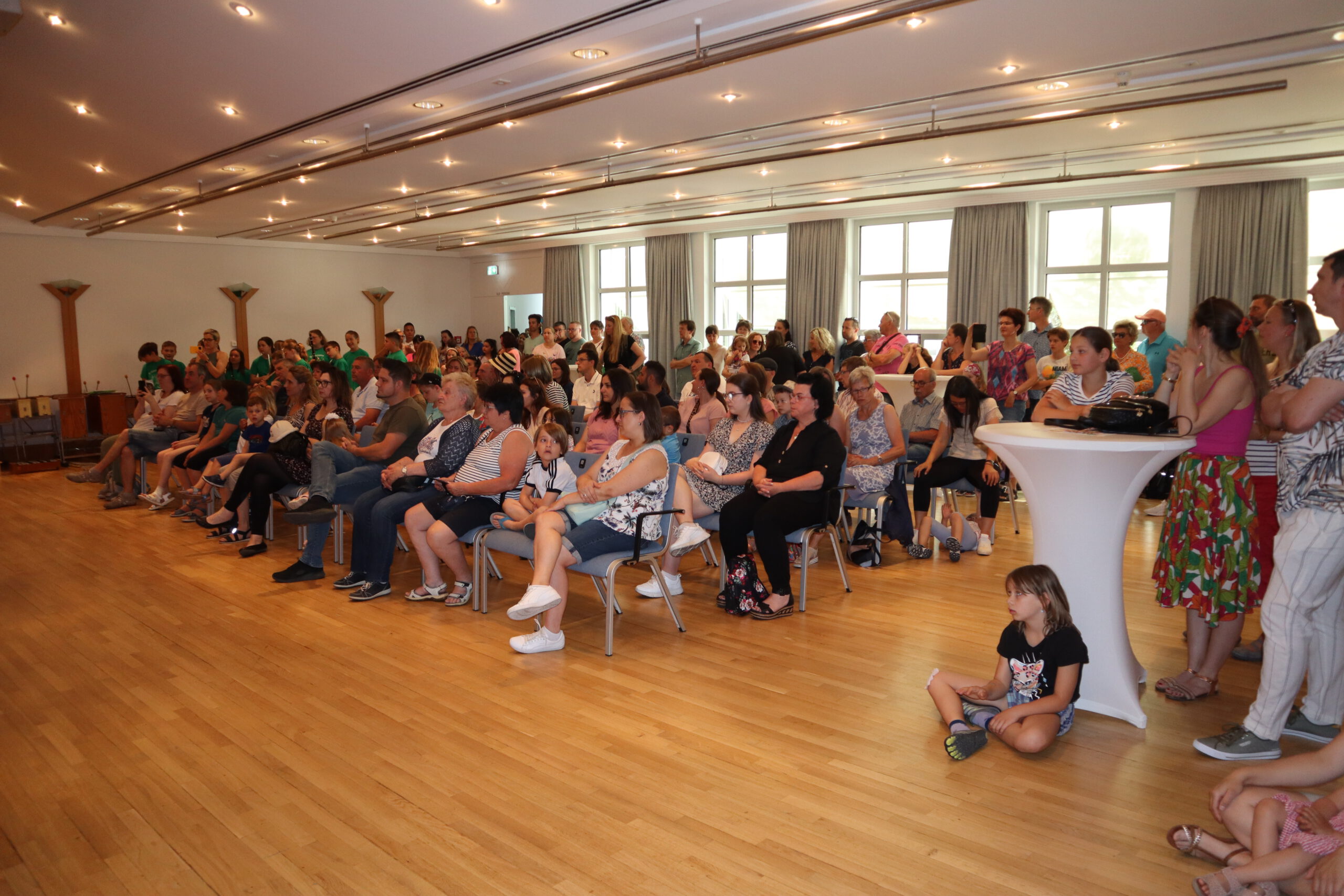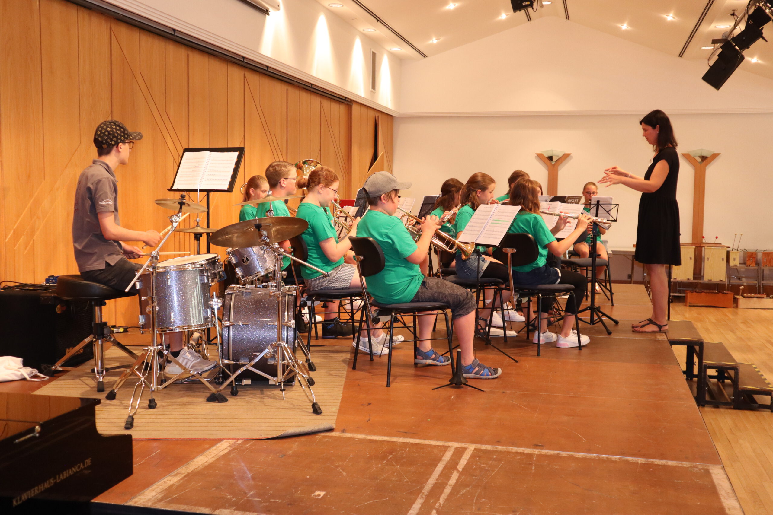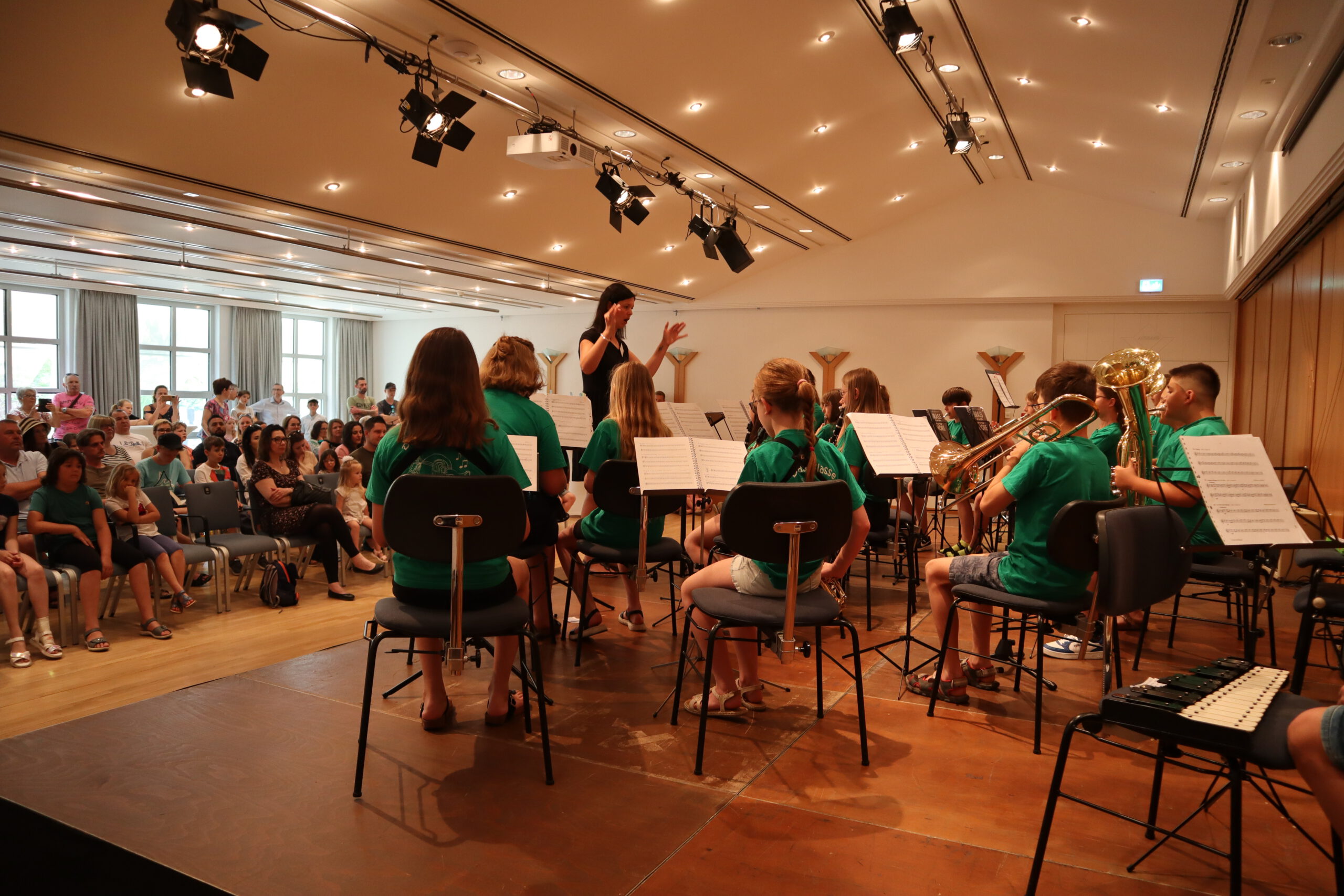 Einen halbstündigen Auftritt vor großem Publikum hatten die beiden Bläserklassen 5b und 6b am Samstag, 17. Juni 2023 beim „Tag der offenen Ohren“ der Städtischen Schule für Musik und darstellende Kunst im Bühler Bürgerhaus. Vor vollbesetzten Rängen im Nebensaal des Bürgerhauses spielten die Jungmusiker bekannte Melodien wie „I come from Alabama“, „Oh when the Saints“, die Europahymne „Freude schöner Götterfunken“ oder auch „Good night ladies“, im Volksmund besser bekannt als „Rucki-zucki“. Der Leiter der Bühler Musikschule, Bernhard Löffler, wandte sich gleichermaßen an das Publikum und die Musiker der beiden Bläserklassen und zeigte ich sehr stolz und glücklich über die Kooperation mit der Schwarzacher Realschule, die mittlerweile seit dem Schuljahr 2014 /2015 besteht und auch im kommenden Schuljahr mit einer neuen Bläserklasse in Jahrgangsstufe fünf fortgesetzt werden wird.