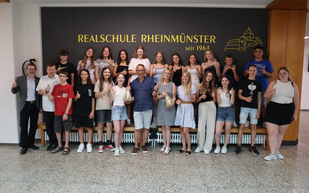 Am Montag, 30.06. 2025 gab es Grund zur Freude für die Realschule Rheinmünster und die Grundschule in Greffern: Dr. Tobias Pacher, beim Chemieverband Baden-Württemberg zuständig für den Dialog Schule-Chemie und Saskia Fröhlich, Personalreferentin und Verantwortliche für die betriebliche Ausbildung bei der UHU GmbH waren an die Realschule gekommen. Mit dabei hatten sie zwei Erlenmeyer -Kolben gefüllt mit Euromünzen aus Schokolade, um in einem symbolischen Akt Fördergelder des Fonds der chemischen Industrie (FCI) an beide Rheinmünsteraner Bildungsstätten zu übergeben.