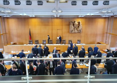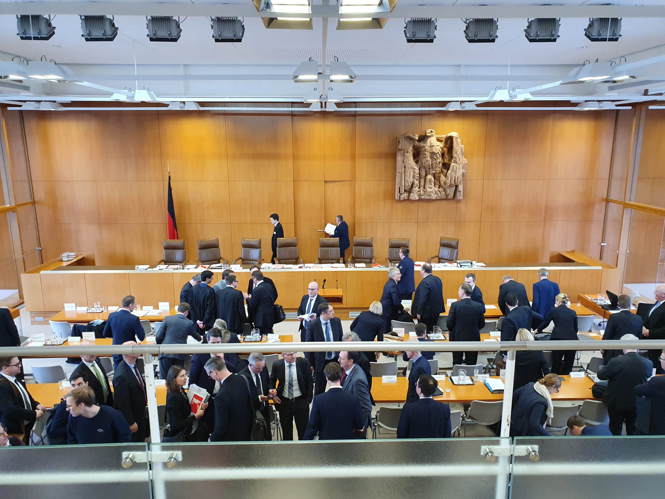 Nachdem die Klasse eine aufwendige Sicherheitsschleuse passierte, durfte sie im Sitzungssaal auf der Empore Platz nehmen. Die acht anwesenden Richter beschäftigten sich mit der Frage, ob der Bundesnachrichtendienst (BND, Auslandsgeheimdienst der Bundesrepublik) ohne konkreten Verdacht „Ausländer“ im Ausland abhören und diese Daten speichern darf.