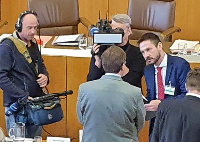 Die Vertreter der Bundesregierung und des Bundeskanzleramtes argumentierten damit, die Bevölkerung vor Terrorismus schützen zu wollen. Spannend war für die Schülerinnen und Schüler zu beobachten, dass Dolmetscher den Bericht eines englischen Sachverständigen live und simultan übersetzten. Ebenso faszinierte die Klasse das Vorbringen von Argumenten, Stellungnahmen, Nachfragen und Beiträgen, das ruhig und sehr sachlich verlief. Dass bei einer Vereidigung eines Zeugen, alle Anwesenden im Saal ebenfalls aufstehen müssen, wirkte im Reflexionsgespräch mit der Klasse ebenfalls nach.