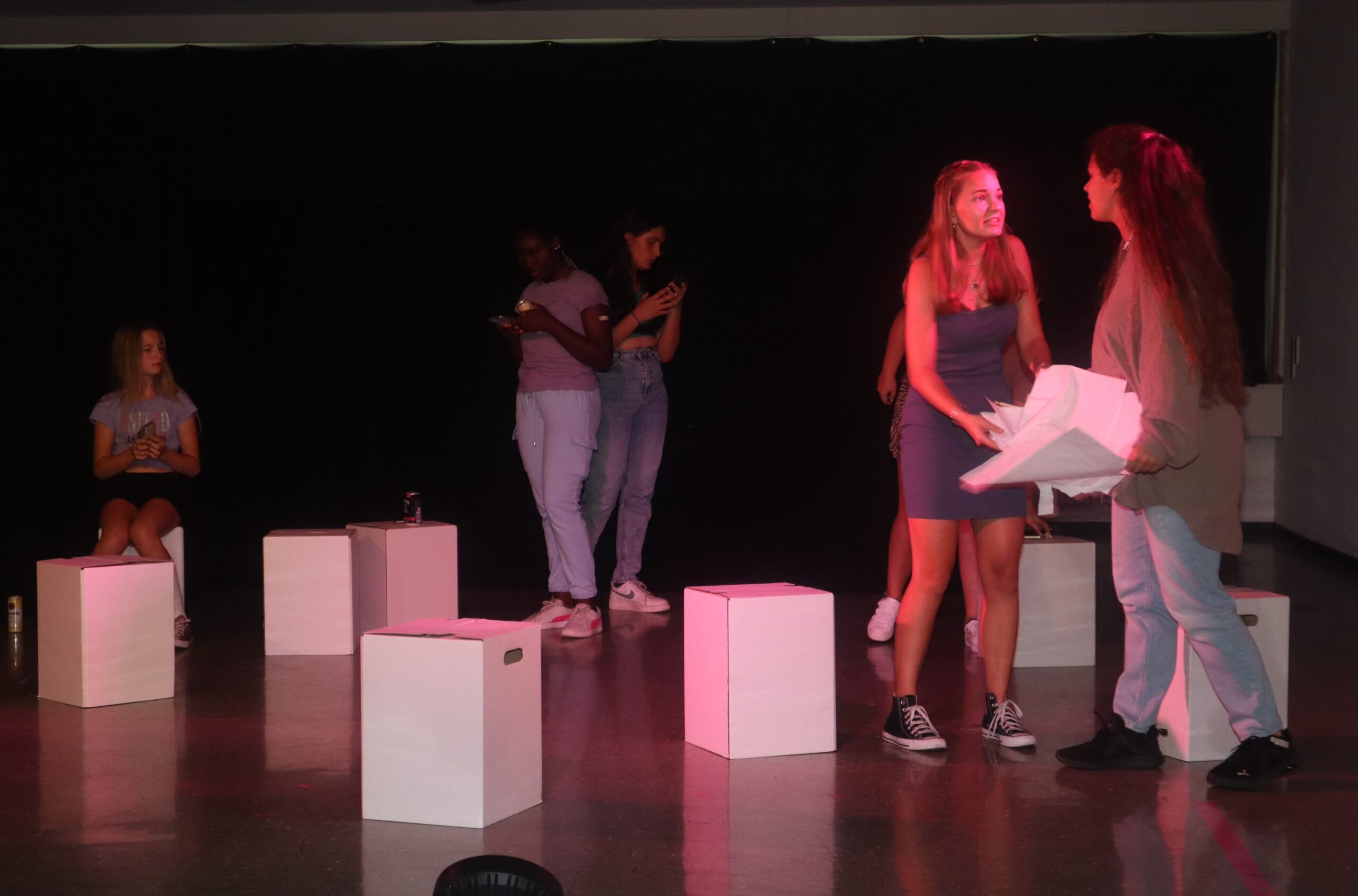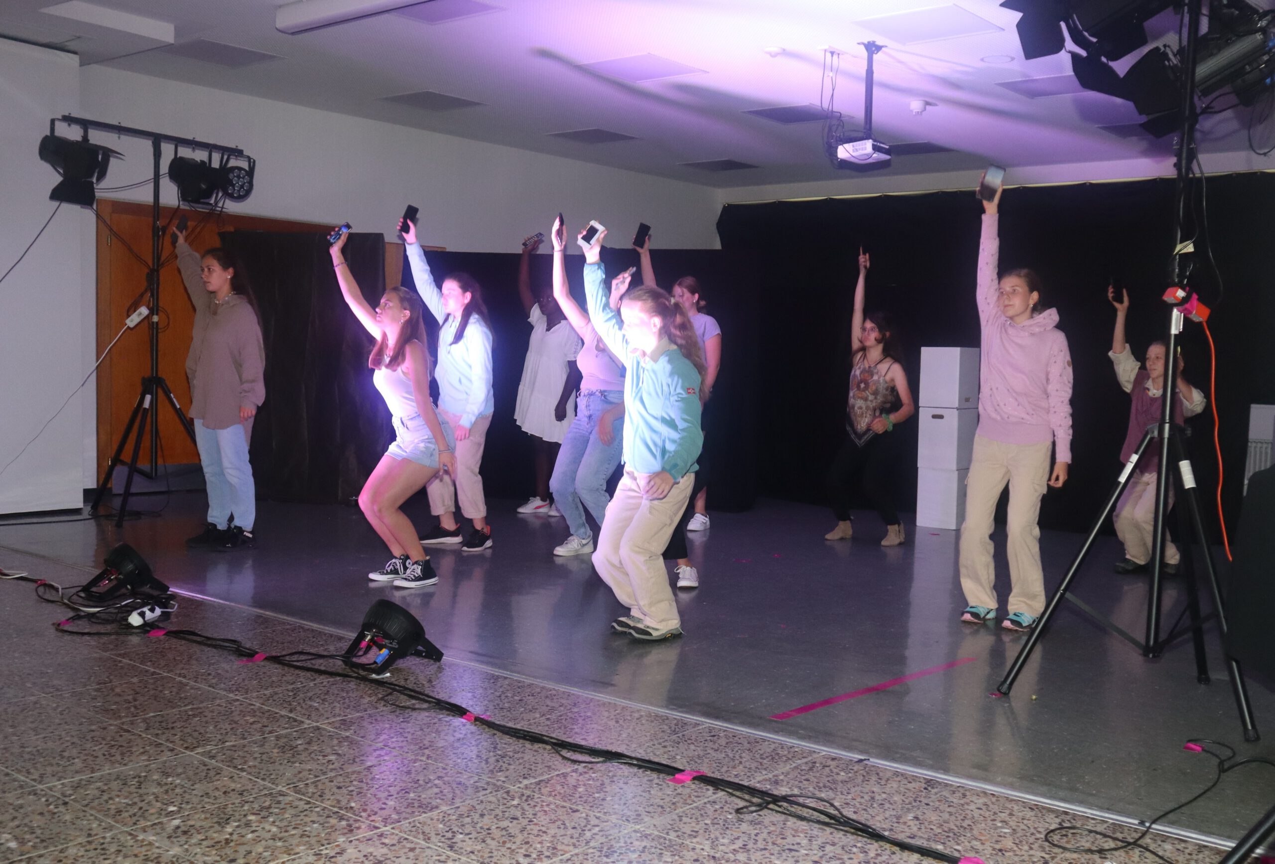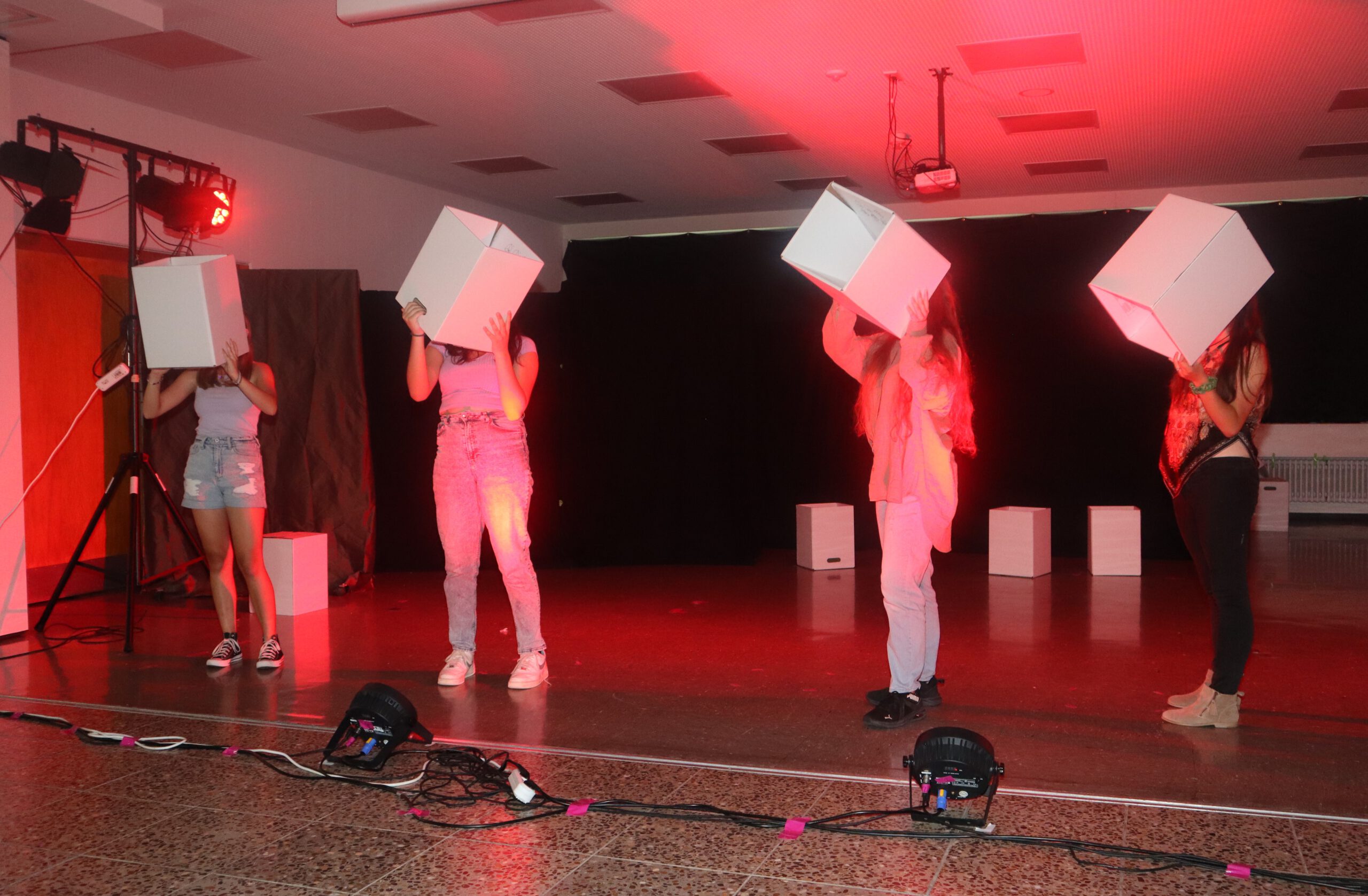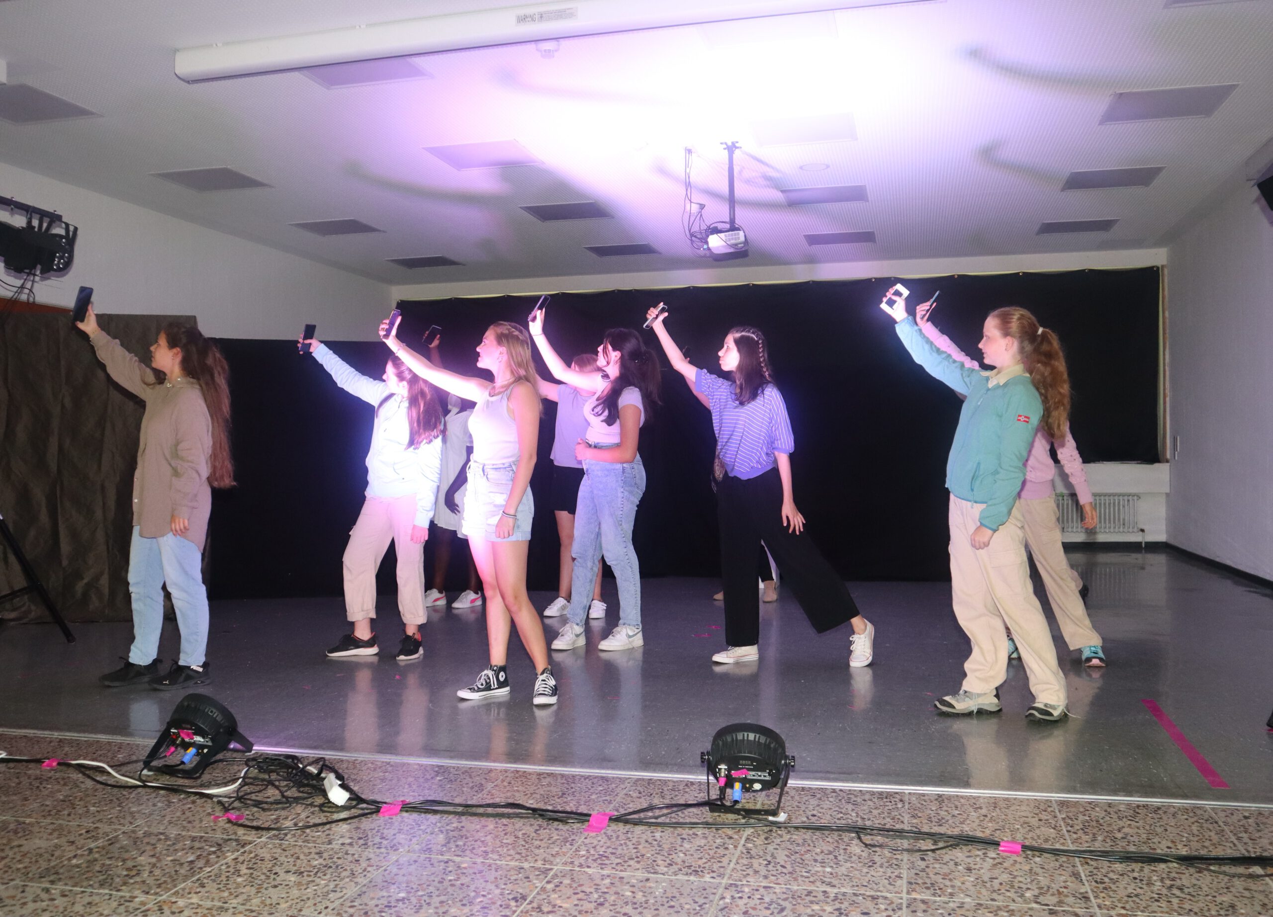 Gänzlich neue Wege ging die Theater-AG mit der diesjährigen Aufführung des Stückes „Real Fake“: Pandemiebedingt musste die kreative Arbeit nach dem Bühnendebut im Juli 2019 für vier Jahre ruhen, sodass die Theatergruppenleiterin Lisa Ade nun vor der Herausforderung gestanden hatte, innerhalb eines knappen Schuljahres aus einem Dutzend hochmotivierter, aber unerfahrener und gänzlich neu zusammengestellter Schülerinnen ein tolles Ensemble zu formen. „Seit Beginn dieses Schuljahres hat die Truppe sich auf den heutigen Abend vorbereitet“, führte Rektor Rolf Schemel in seinen Begrüßungsworten aus und kündigte an, dass das Stück gleich zwei Premieren mit sich bringen würde: Erstmals fand die Aufführung in der renovierten und technisch neu ausgestatteten Aula statt und erstmals hatte sich die Theater-AG mit dem Stück „Real Fake“ daran gewagt, selbst in die Stückentwicklung zu gehen – mit einer von den Laien-Schauspielerinnen komplett selbst entwickelten Handlung und auf den Leib geschnittenen Rollen mit selbst formulierten Dialogen. So beleuchteten die zwölf jungen Schauspielerinnen Fake, Filter und Fiktion in sozialen Medien, erforschten, was Social Media mit uns machen kann und welche Rolle wir in dieser neuen Welt einnehmen.
