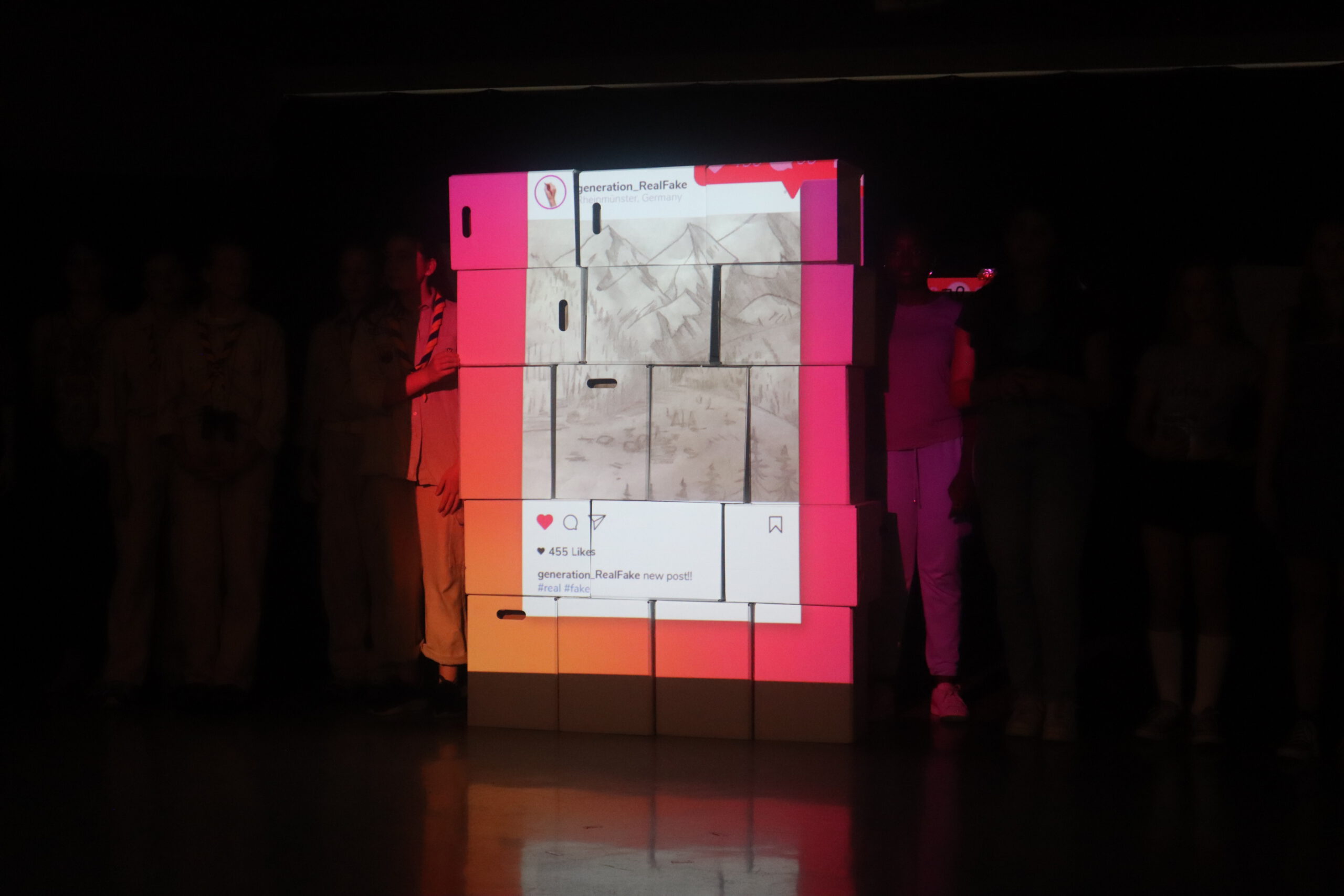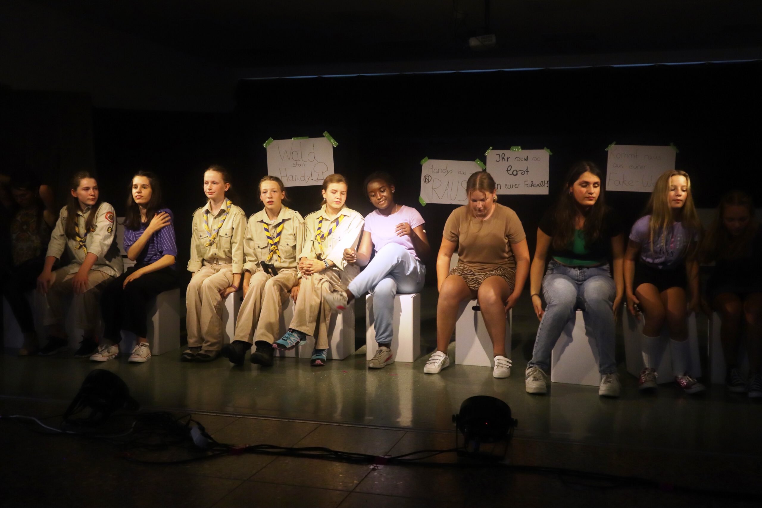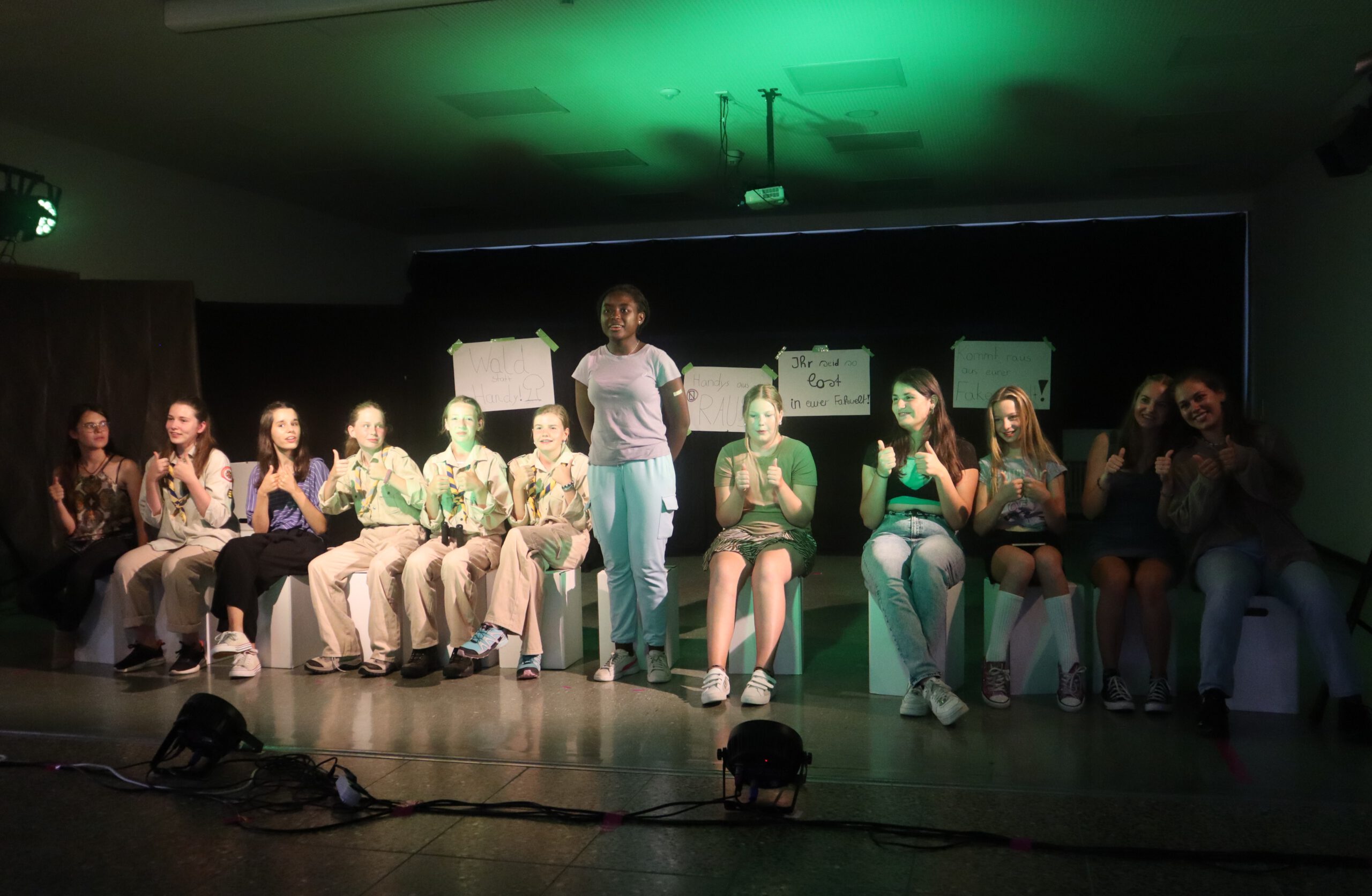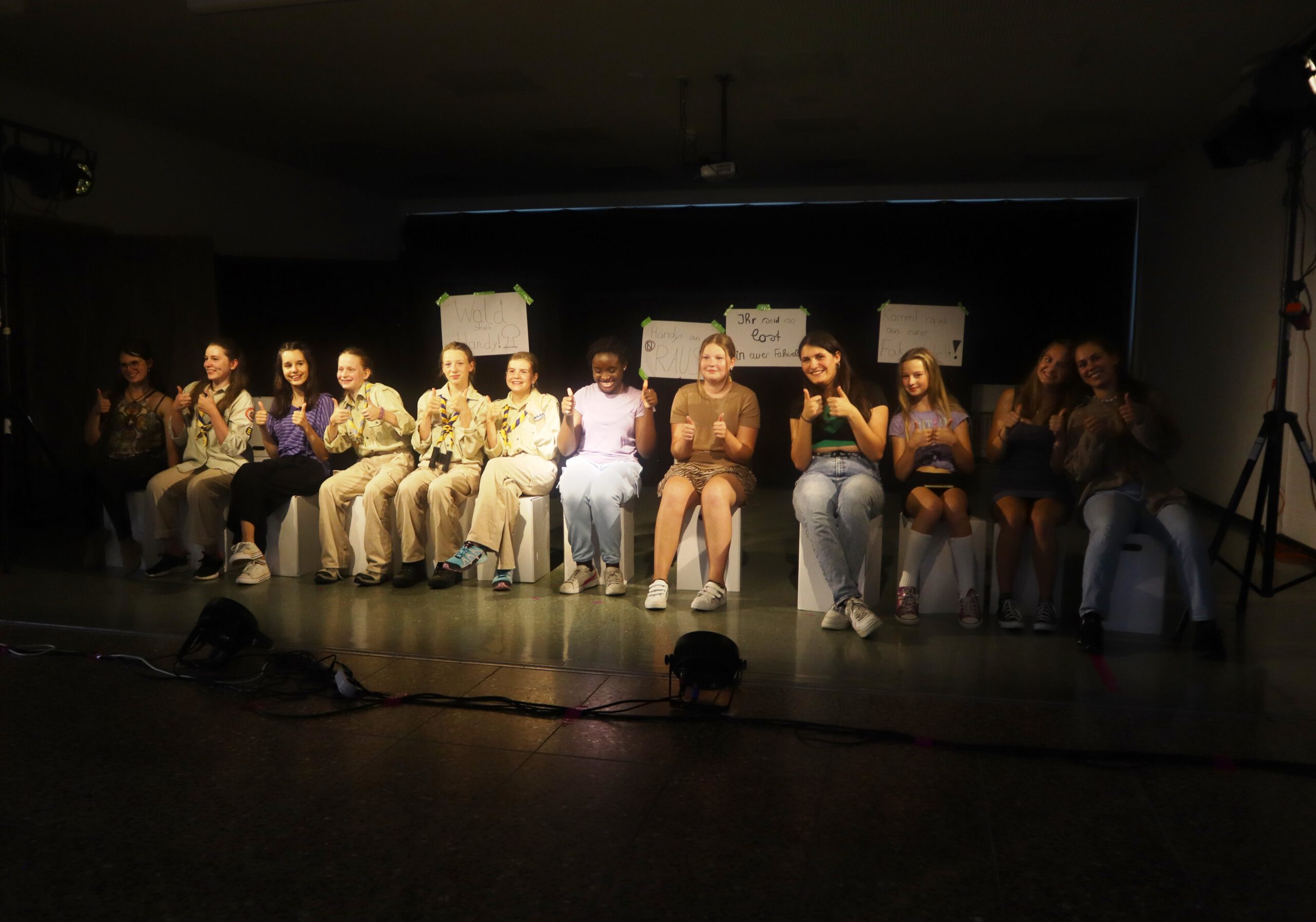 In dem knapp einstündigen Stück muss Melina, die mit ihren 15 Jahren bereits 50.000 Follower hat und der Star der Schule ist, schmerzlich erfahren, wie sie sich durch die dauernde Selbstinszenierung auf allen Kanälen immer mehr von sich selbst entfernt. Charaktere wie Andrea und Maxi stehen für Jugendliche, die sich dem Sog der sozialen Medien nicht entziehen können, die vom dort dargestellten Fame und Happy Life etwas abhaben wollen und dafür manchmal die Augen vor der Realität verschließen. Dem gegenüber stehen die mit Bleistift zeichnende, zurückhaltende Lani und eine Gruppe Pfadfinderinnen, die das Problem einer ganzen Generation im Sog dieser Fake-Welt, „die immer besser ist, als man selbst“, erkennen und beschließen, Melina und ihre Handy-süchtige Gefolgschaft an der Schule wachzurütteln. In der letzten Szene sprechen die Darstellerinnen das Publikum ganz nach Brecht’scher Manier des epischen Theaters direkt an und fragen: „Wie viel Fake vertragt ihr? Wie oft hat es euch in der letzten Stunde gejuckt, auf euer Handy zu schauen?“ Geflasht – um es neudeutsch auszudrücken – saß das Publikum da, manch einer dürfte sich ertappt gefühlt haben, ein jeder war sichtlich beeindruckt von der herausragenden Leistung der jungen Schauspielerinnen, von der Modernität und Aktualität der Inszenierung, vom fesselnden, selbst entwickelten Plot und von der gekonnt eingesetzten Licht- und Tontechnik sowie von der stets passenden musikalischen Untermalung der Szenen.