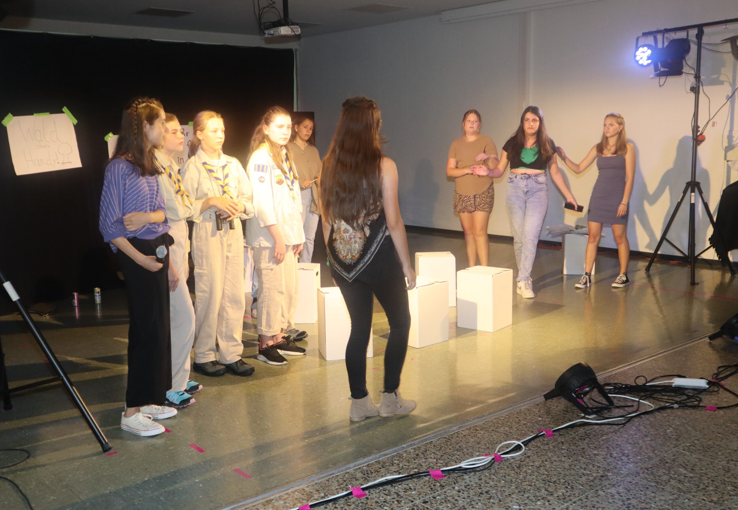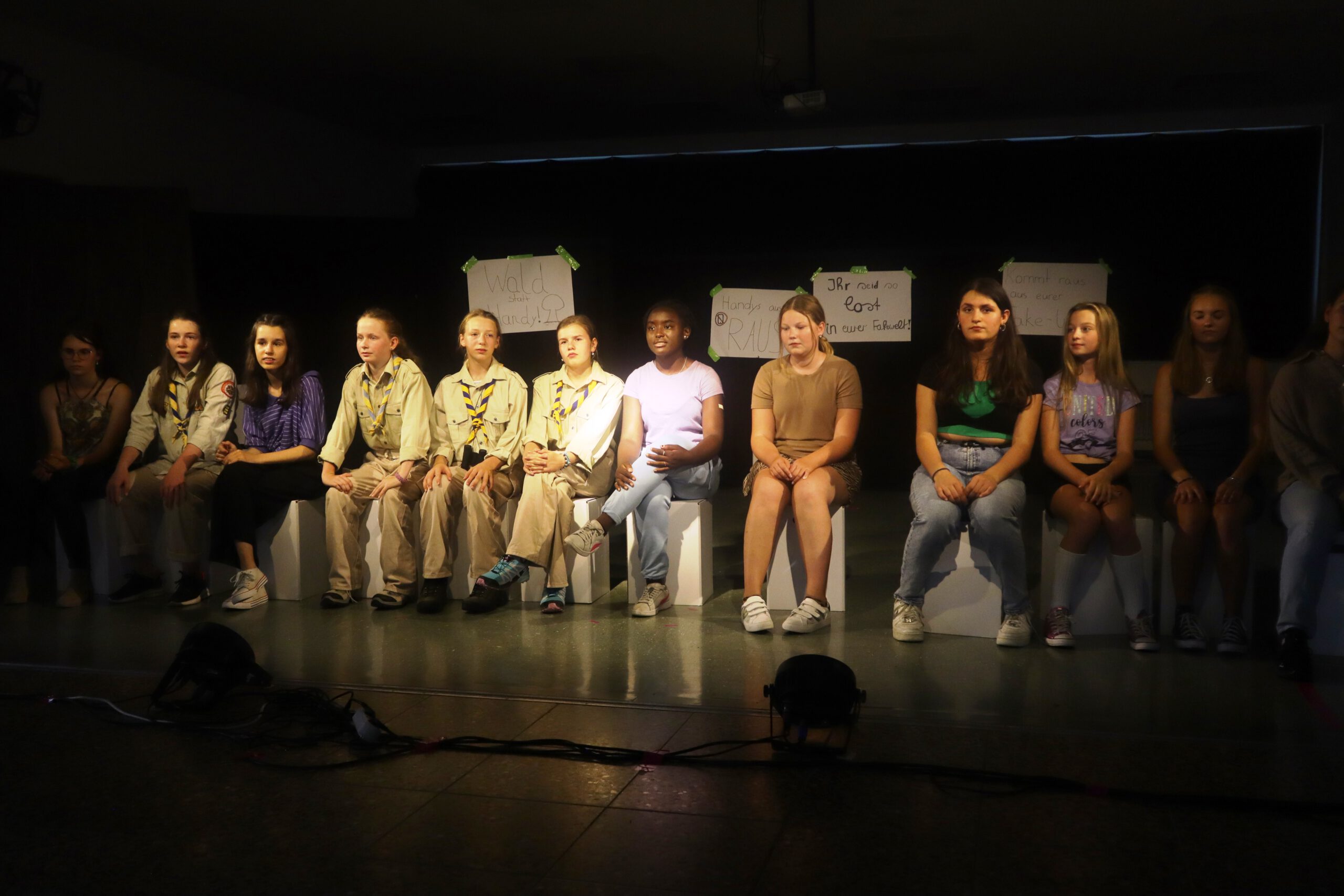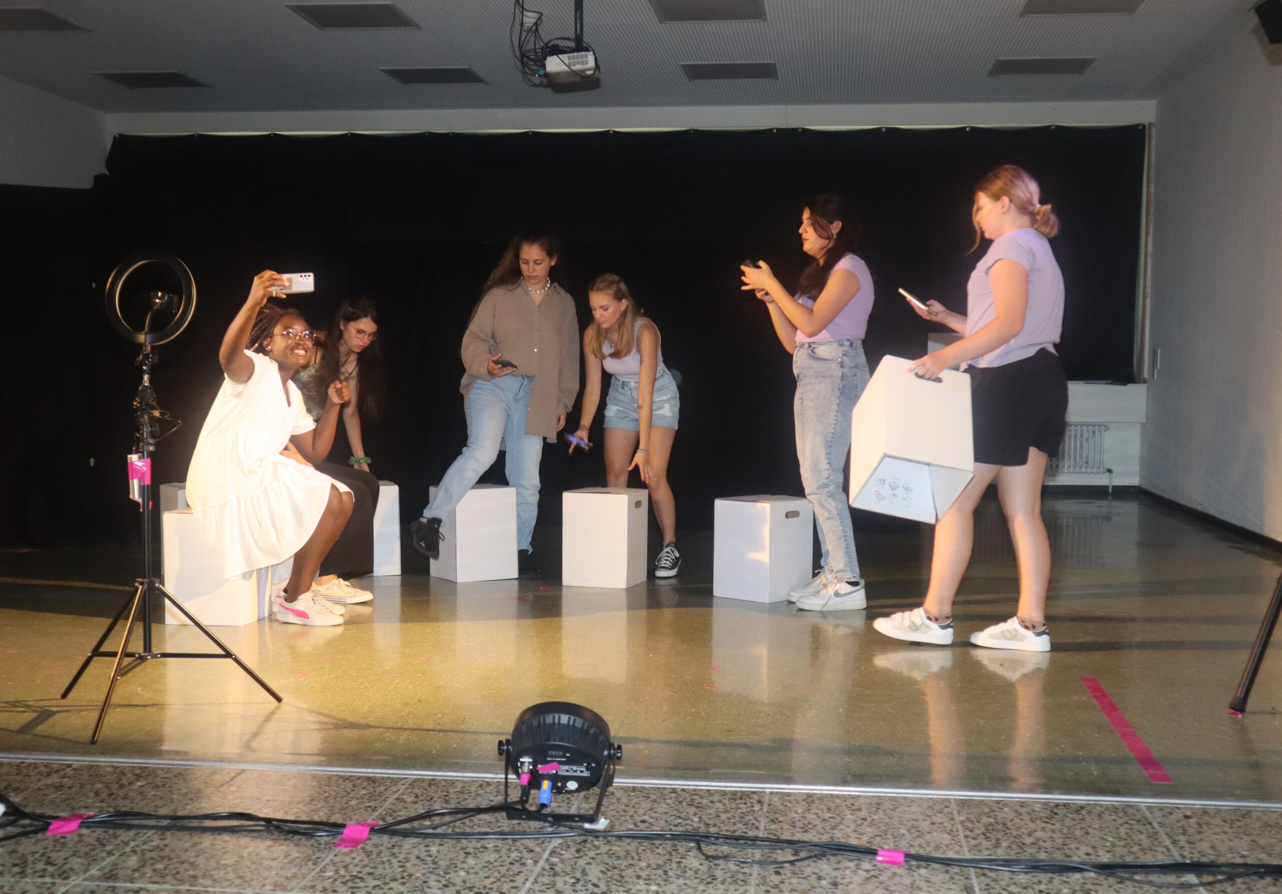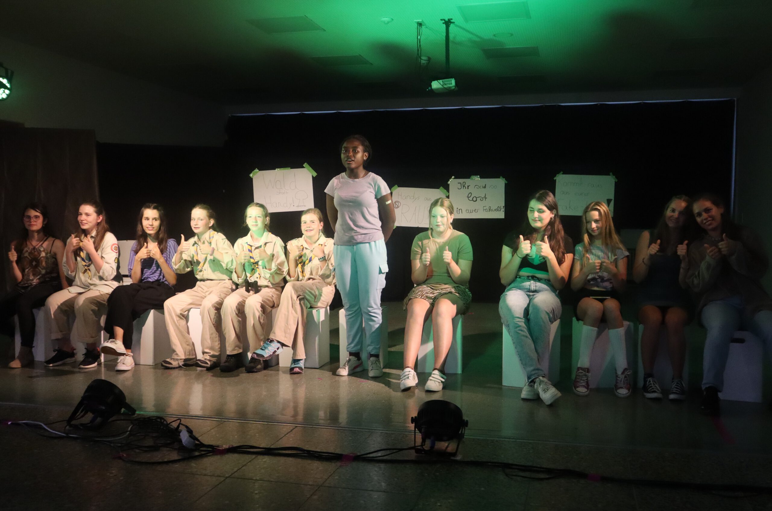 In dem knapp einstündigen Stück muss Melina, die mit ihren 15 Jahren bereits 50.000 Follower hat und der Star der Schule ist, schmerzlich erfahren, wie sie sich durch die dauernde Selbstinszenierung auf allen Kanälen immer mehr von sich selbst entfernt. Charaktere wie Andrea und Maxi stehen für Jugendliche, die sich dem Sog der sozialen Medien nicht entziehen können, die vom dort dargestellten Fame und Happy Life etwas abhaben wollen und dafür manchmal die Augen vor der Realität verschließen. Dem gegenüber stehen die mit Bleistift zeichnende, zurückhaltende Lani und eine Gruppe Pfadfinderinnen, die das Problem einer ganzen Generation im Sog dieser Fake-Welt, „die immer besser ist, als man selbst“, erkennen und beschließen, Melina und ihre Handy-süchtige Gefolgschaft an der Schule wachzurütteln. In der letzten Szene sprechen die Darstellerinnen das Publikum ganz nach Brecht’scher Manier des epischen Theaters direkt an und fragen: „Wie viel Fake vertragt ihr? Wie oft hat es euch in der letzten Stunde gejuckt, auf euer Handy zu schauen?“ Geflasht – um es neudeutsch auszudrücken – saß das Publikum da, manch einer dürfte sich ertappt gefühlt haben, ein jeder war sichtlich beeindruckt von der herausragenden Leistung der jungen Schauspielerinnen, von der Modernität und Aktualität der Inszenierung, vom fesselnden, selbst entwickelten Plot und von der gekonnt eingesetzten Licht- und Tontechnik sowie von der stets passenden musikalischen Untermalung der Szenen.