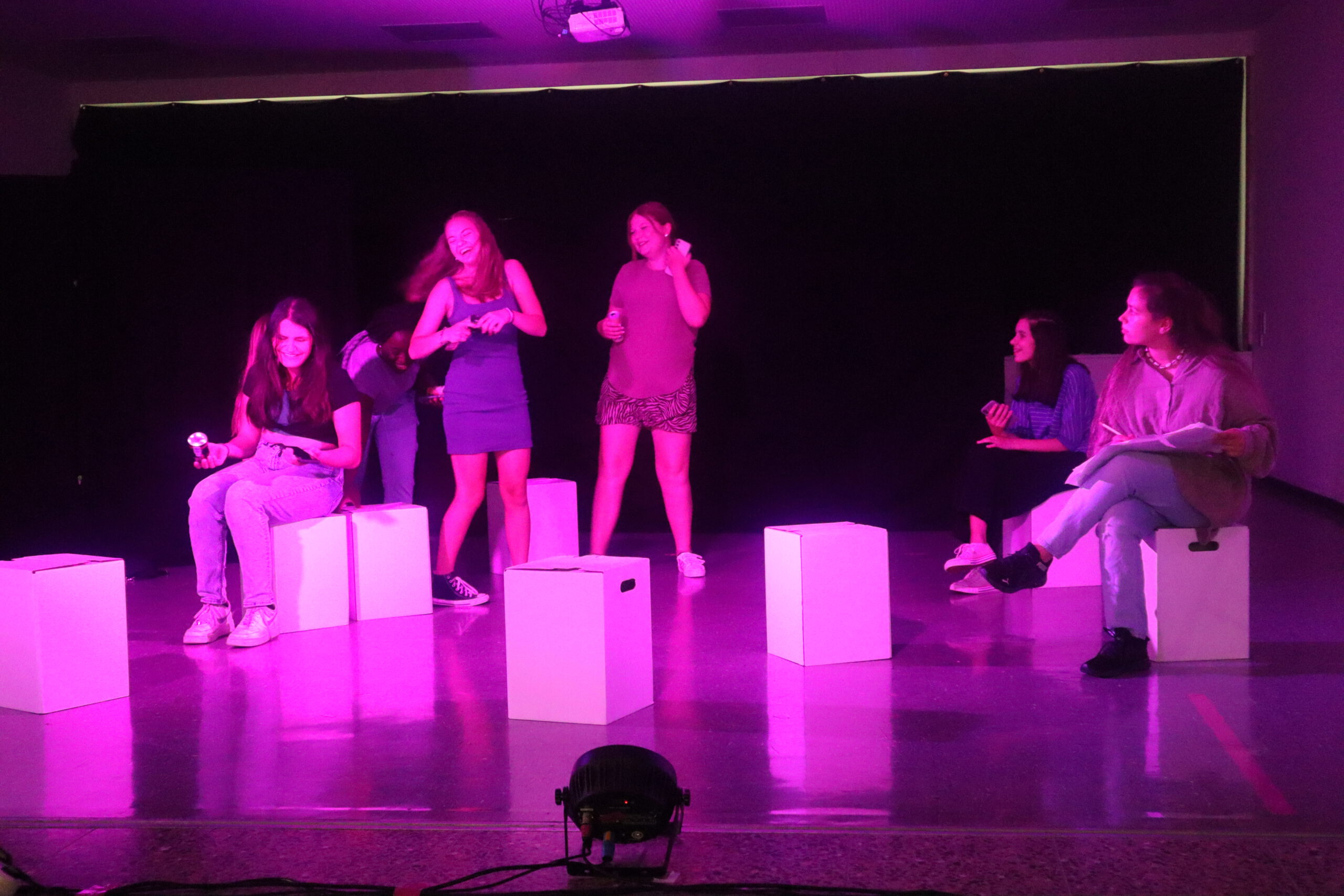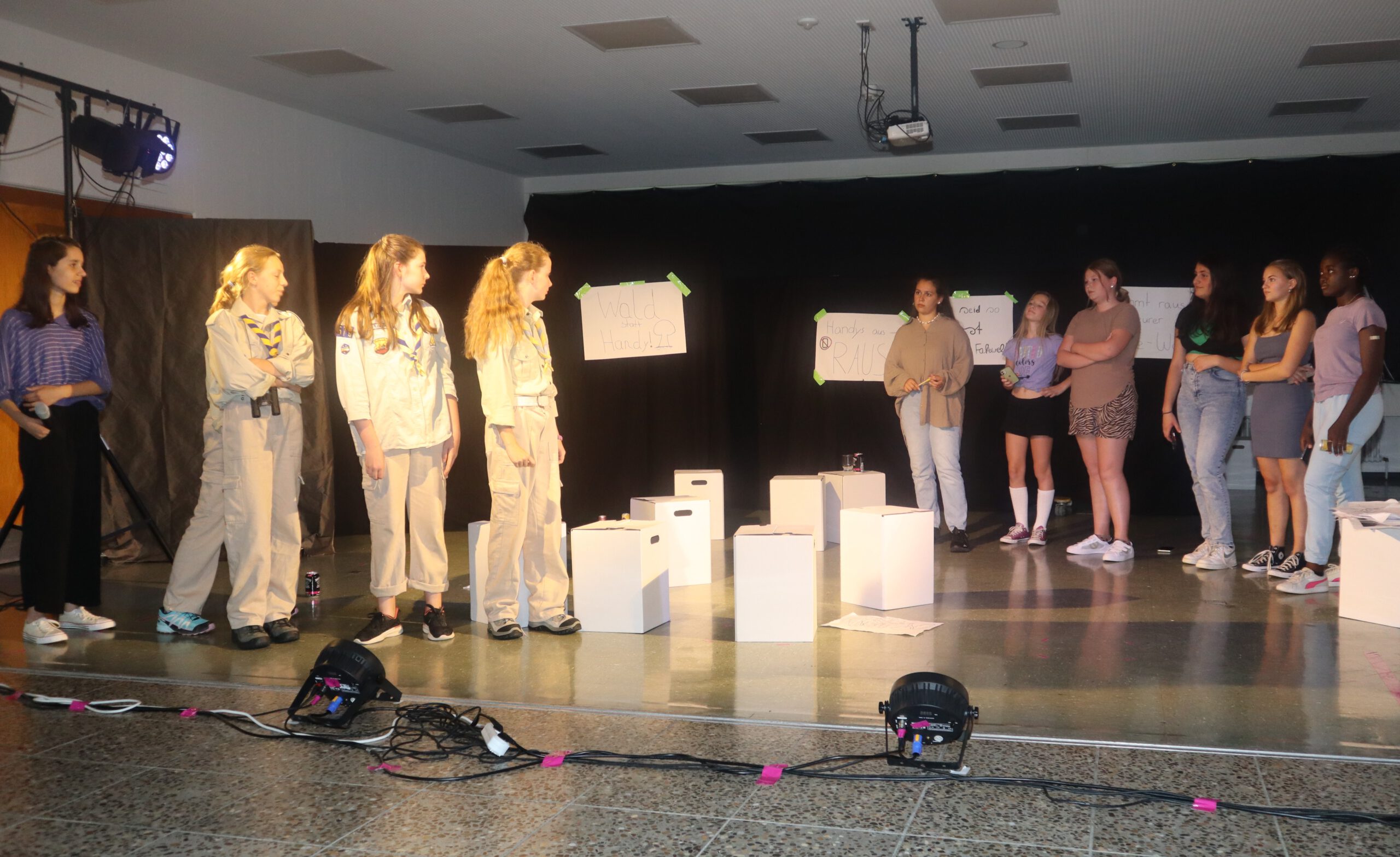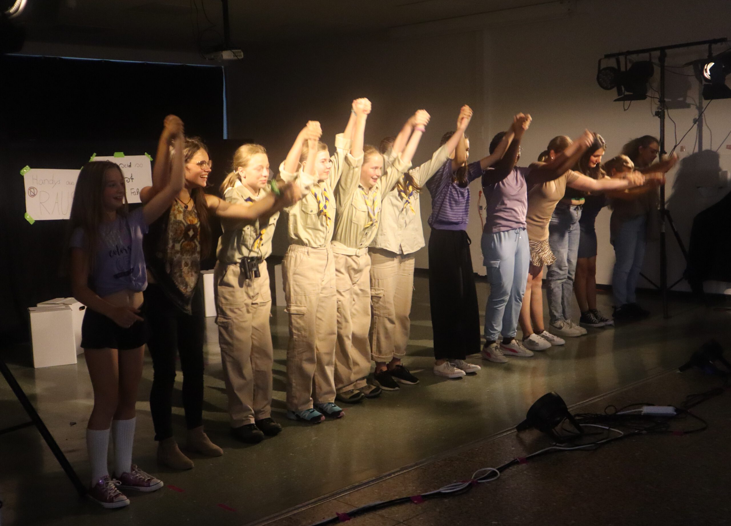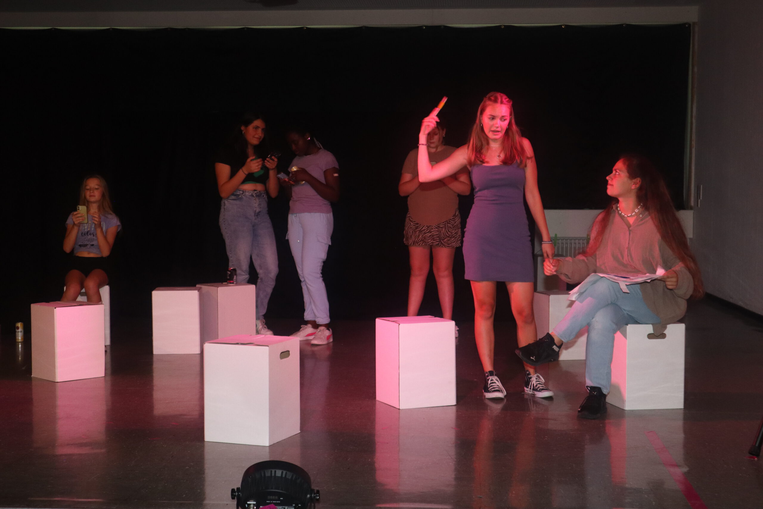 In dem knapp einstündigen Stück muss Melina, die mit ihren 15 Jahren bereits 50.000 Follower hat und der Star der Schule ist, schmerzlich erfahren, wie sie sich durch die dauernde Selbstinszenierung auf allen Kanälen immer mehr von sich selbst entfernt. Charaktere wie Andrea und Maxi stehen für Jugendliche, die sich dem Sog der sozialen Medien nicht entziehen können, die vom dort dargestellten Fame und Happy Life etwas abhaben wollen und dafür manchmal die Augen vor der Realität verschließen. Dem gegenüber stehen die mit Bleistift zeichnende, zurückhaltende Lani und eine Gruppe Pfadfinderinnen, die das Problem einer ganzen Generation im Sog dieser Fake-Welt, „die immer besser ist, als man selbst“, erkennen und beschließen, Melina und ihre Handy-süchtige Gefolgschaft an der Schule wachzurütteln. In der letzten Szene sprechen die Darstellerinnen das Publikum ganz nach Brecht’scher Manier des epischen Theaters direkt an und fragen: „Wie viel Fake vertragt ihr? Wie oft hat es euch in der letzten Stunde gejuckt, auf euer Handy zu schauen?“ Geflasht – um es neudeutsch auszudrücken – saß das Publikum da, manch einer dürfte sich ertappt gefühlt haben, ein jeder war sichtlich beeindruckt von der herausragenden Leistung der jungen Schauspielerinnen, von der Modernität und Aktualität der Inszenierung, vom fesselnden, selbst entwickelten Plot und von der gekonnt eingesetzten Licht- und Tontechnik sowie von der stets passenden musikalischen Untermalung der Szenen.