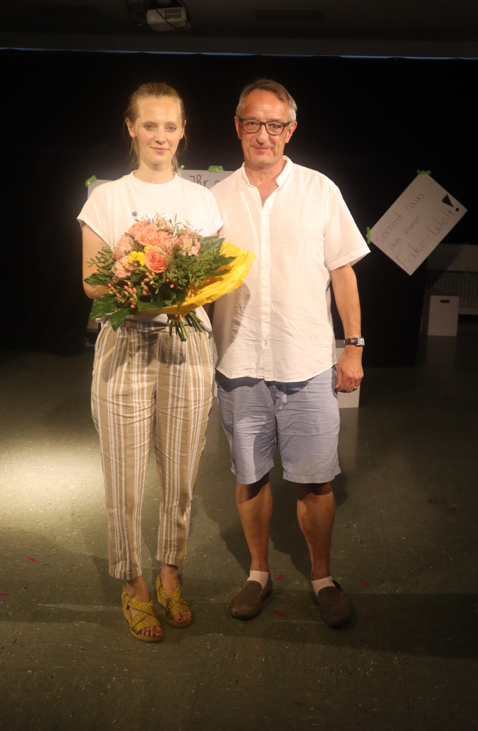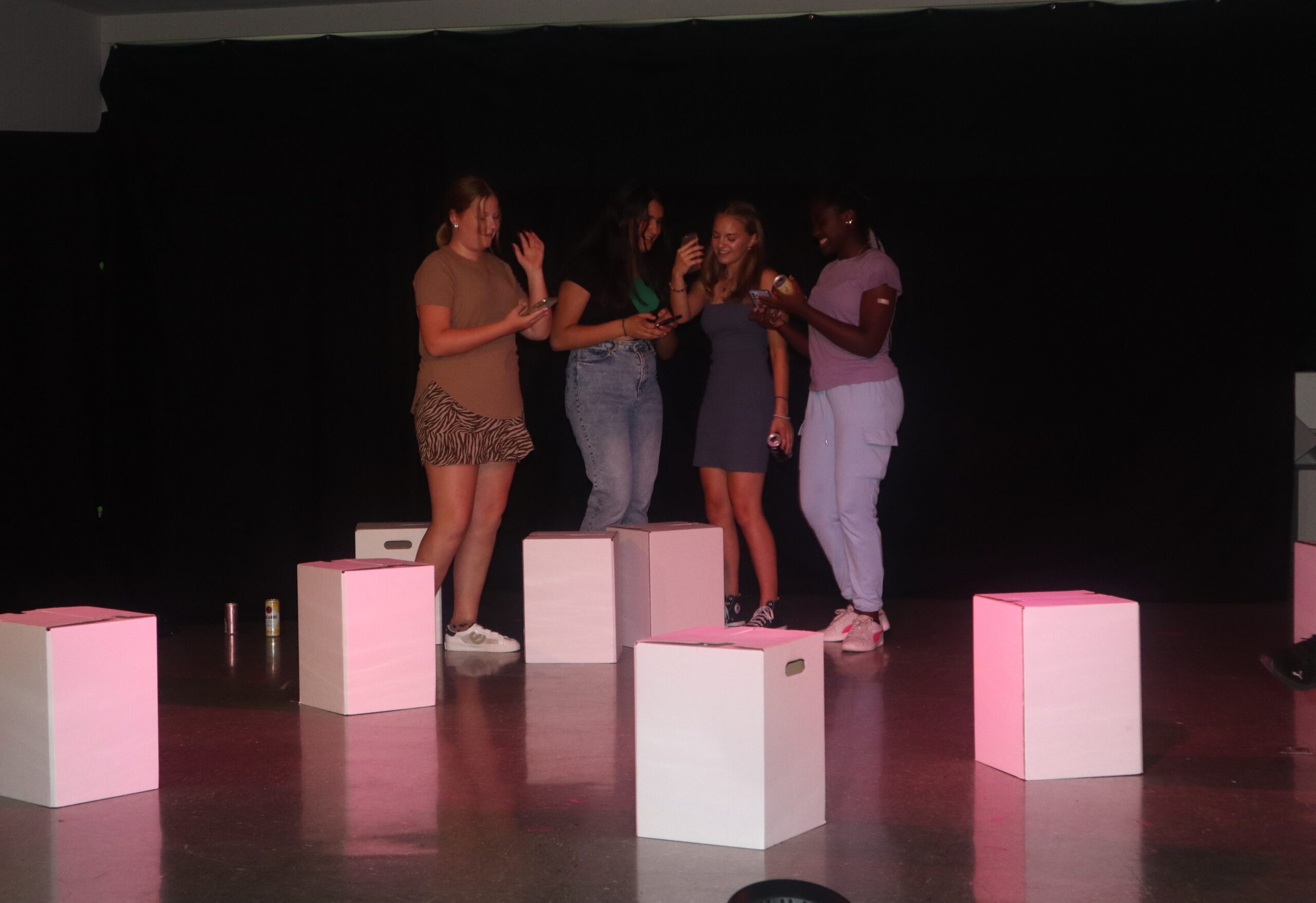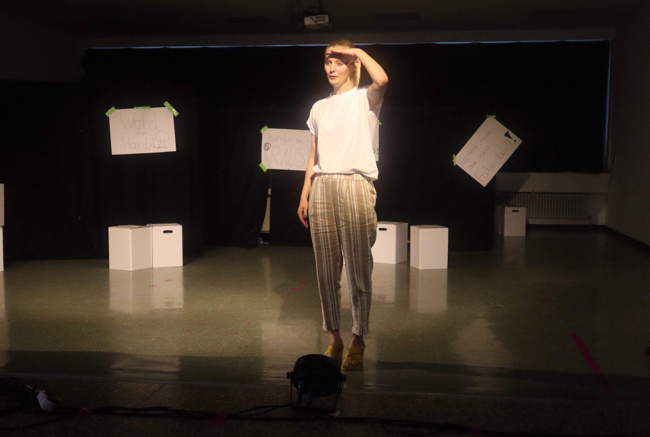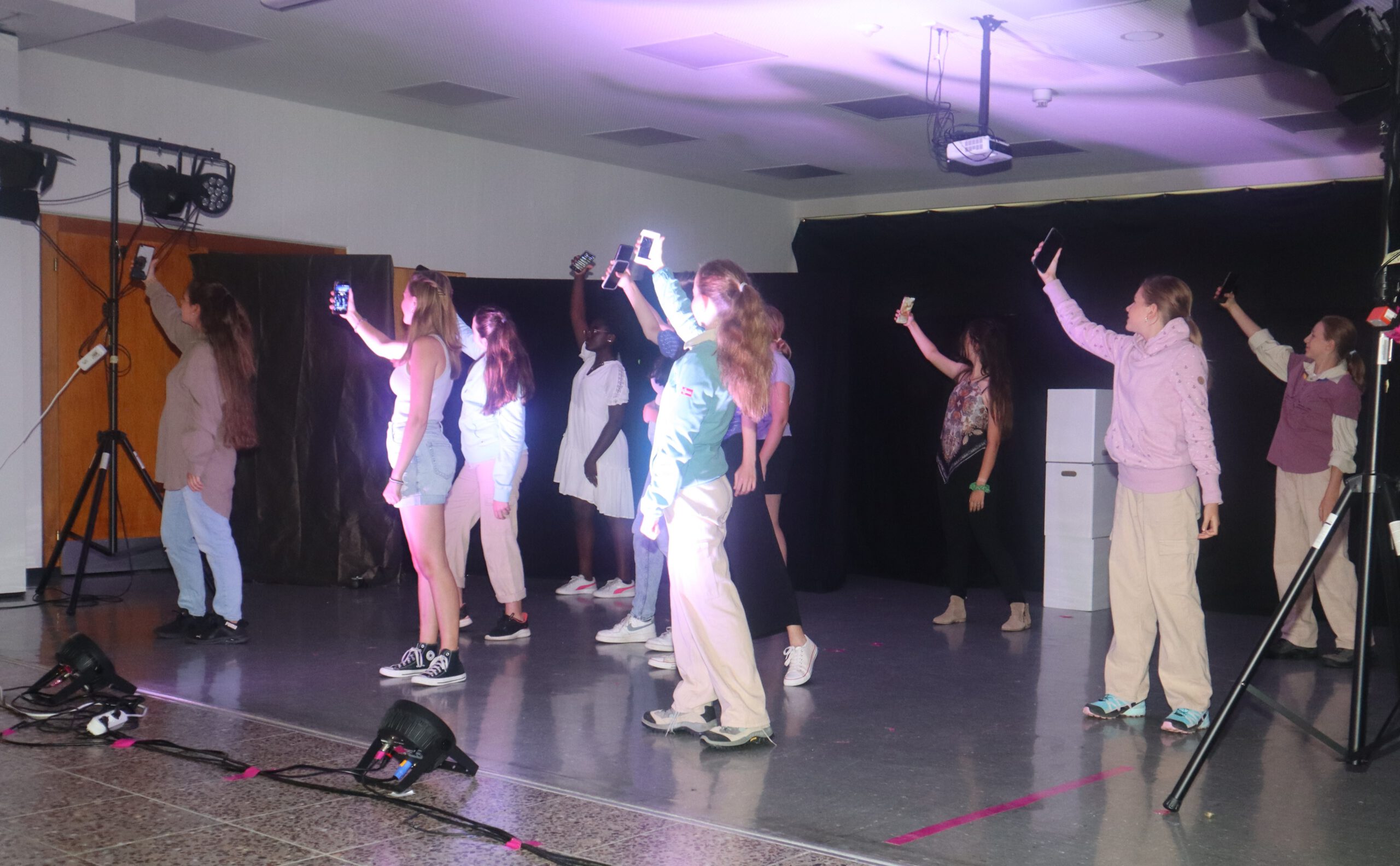 In dem knapp einstündigen Stück muss Melina, die mit ihren 15 Jahren bereits 50.000 Follower hat und der Star der Schule ist, schmerzlich erfahren, wie sie sich durch die dauernde Selbstinszenierung auf allen Kanälen immer mehr von sich selbst entfernt. Charaktere wie Andrea und Maxi stehen für Jugendliche, die sich dem Sog der sozialen Medien nicht entziehen können, die vom dort dargestellten Fame und Happy Life etwas abhaben wollen und dafür manchmal die Augen vor der Realität verschließen. Dem gegenüber stehen die mit Bleistift zeichnende, zurückhaltende Lani und eine Gruppe Pfadfinderinnen, die das Problem einer ganzen Generation im Sog dieser Fake-Welt, „die immer besser ist, als man selbst“, erkennen und beschließen, Melina und ihre Handy-süchtige Gefolgschaft an der Schule wachzurütteln. In der letzten Szene sprechen die Darstellerinnen das Publikum ganz nach Brecht’scher Manier des epischen Theaters direkt an und fragen: „Wie viel Fake vertragt ihr? Wie oft hat es euch in der letzten Stunde gejuckt, auf euer Handy zu schauen?“ Geflasht – um es neudeutsch auszudrücken – saß das Publikum da, manch einer dürfte sich ertappt gefühlt haben, ein jeder war sichtlich beeindruckt von der herausragenden Leistung der jungen Schauspielerinnen, von der Modernität und Aktualität der Inszenierung, vom fesselnden, selbst entwickelten Plot und von der gekonnt eingesetzten Licht- und Tontechnik sowie von der stets passenden musikalischen Untermalung der Szenen.