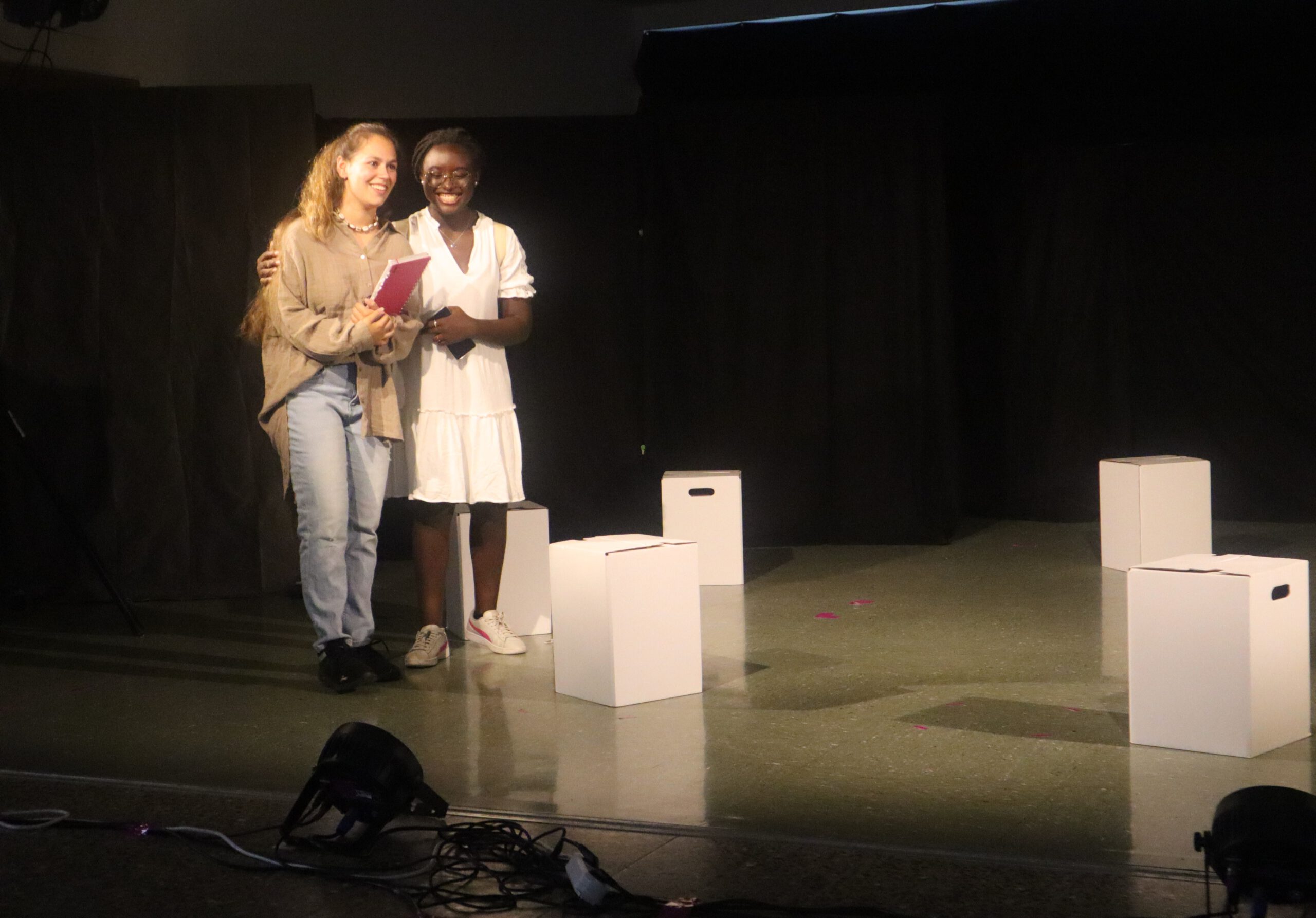 Stolz und Erleichterung standen am Ende in den Gesichtern der Mimen und der Leiterin der Theater-AG, Lisa Ade, als fulminanter Applaus auf den Rängen der eigens in der Aula aufgebauten Tribüne aufkam. Die intensive Vorbereitung in wöchentlichen Proben, bei einem dreitägigen Probenaufenthalt in der Akademie Schloss Rotenfels im April sowie zuletzt an vielen Extra-Terminen in der Freizeit haben sich gelohnt und die gelungene Aufführung macht auf jeden Fall Lust auf weitere kreative Theater-Projekte im kommenden Schuljahr.