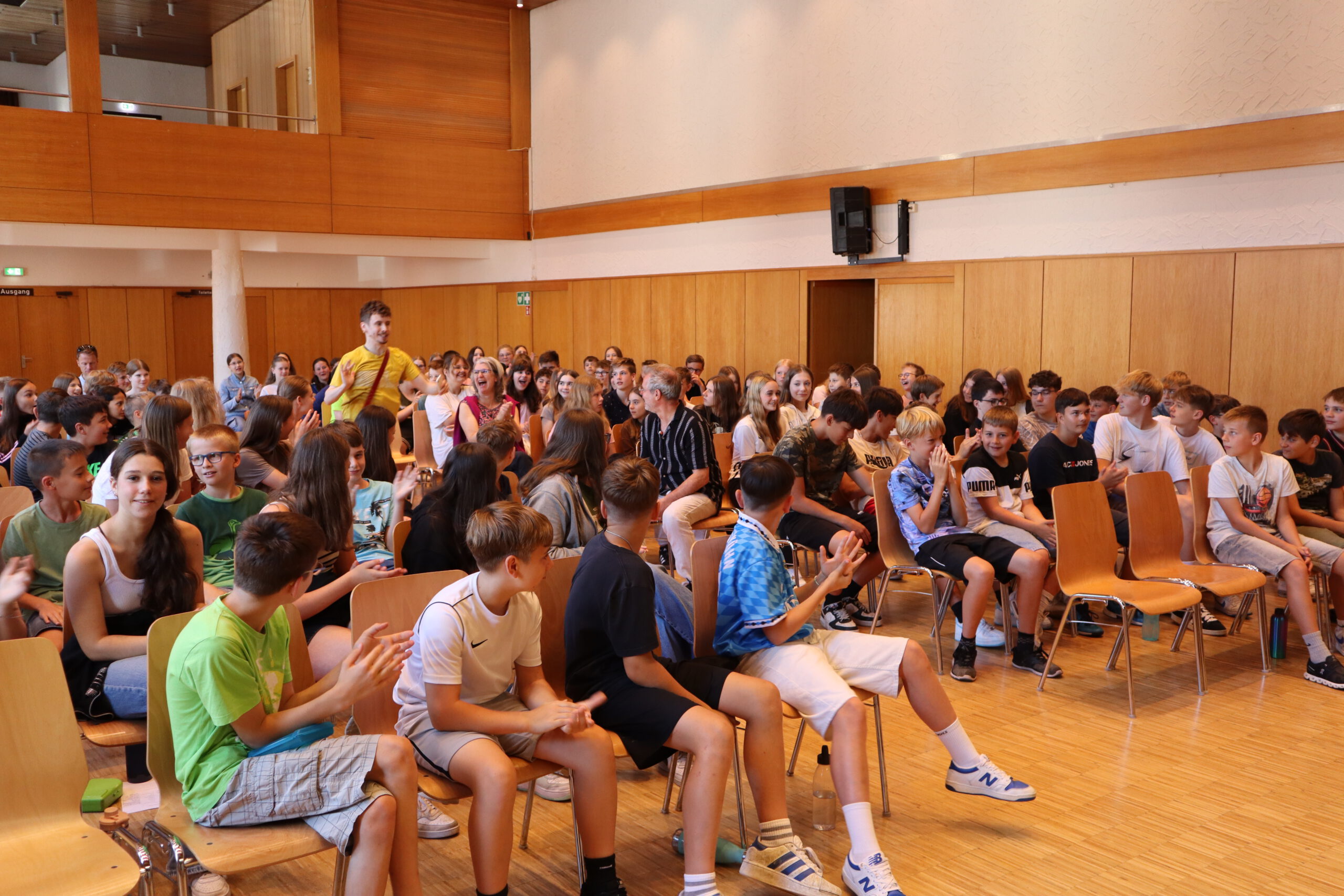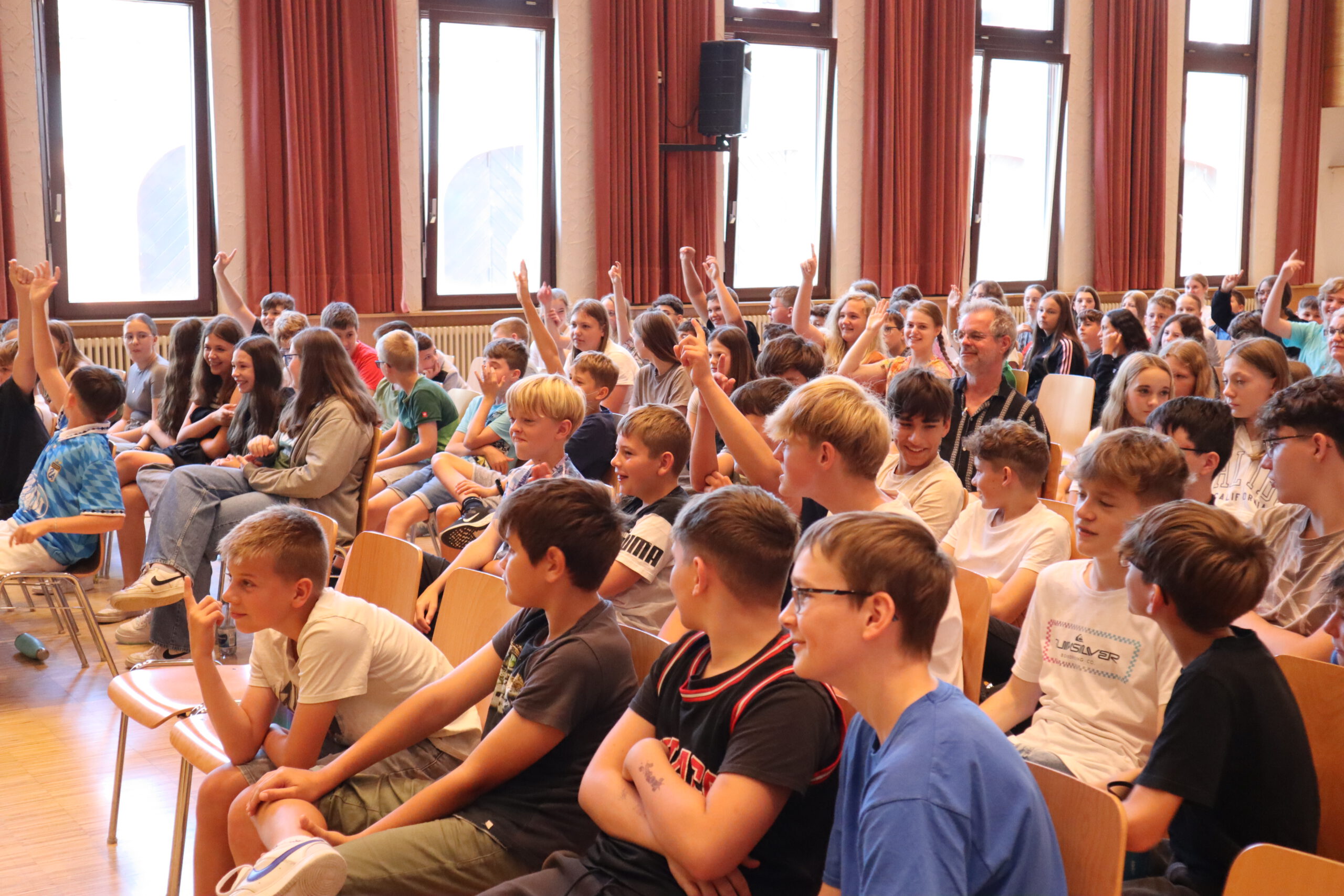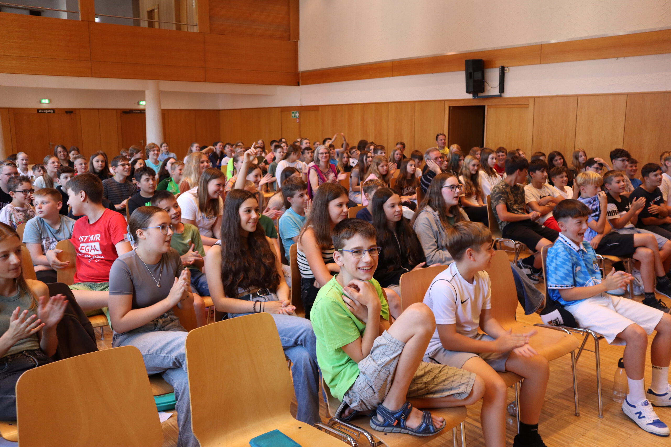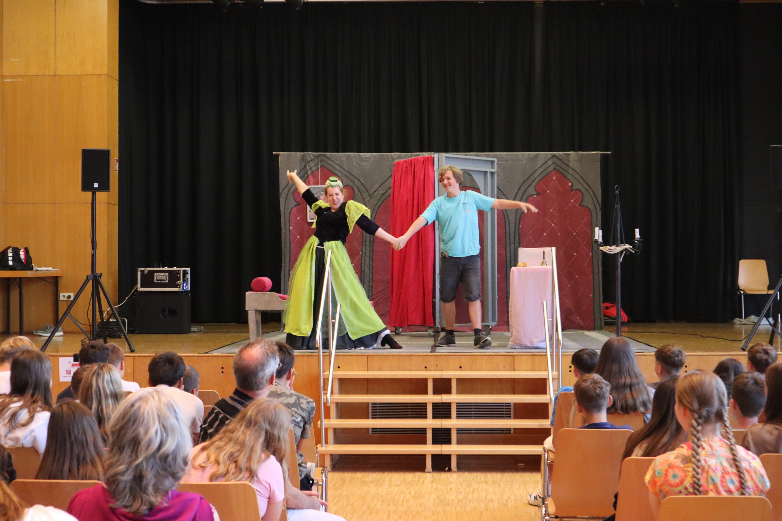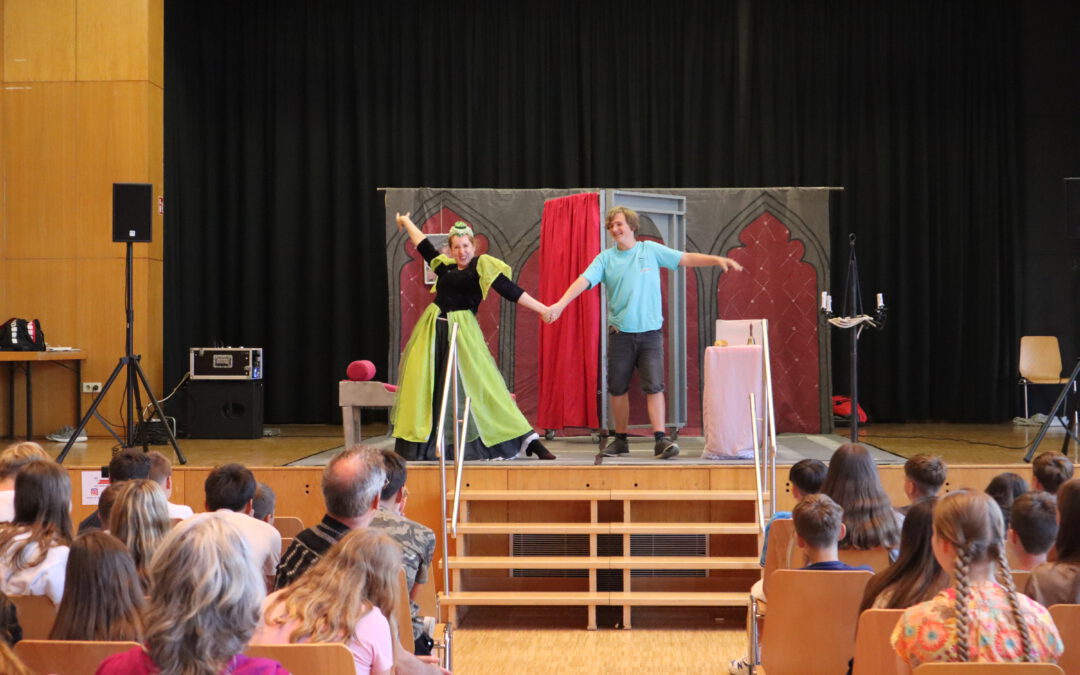 Der Besuch des fantastischen Mitmach-Musicals „Aldrick Castle“ in der Schwarzacher Festhalle wurde nicht zuletzt durch den Förderkreis der Realschule ermöglicht, der sich am Eintrittspreis beteiligt hat. Durch das Theaterstück hatten die Englischanfänger die Chance, zu erfahren, wie viel sie bereits im Englischen verstehen. Im Anschluss an die Aufführung durften die Schwarzacher Realschüler noch Fragen an die beiden „native speakers“ richten. So erfuhren sie beispielsweise, dass die beiden jungen Schauspieler schon seit elf Monaten durch Deutschland reisen und ihre Show in Schwarzach bereits ihr 138. Auftritt vor Schülern gewesen war.