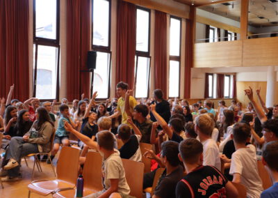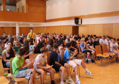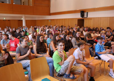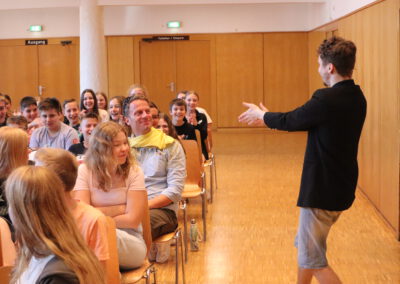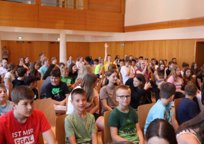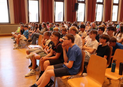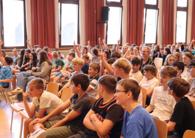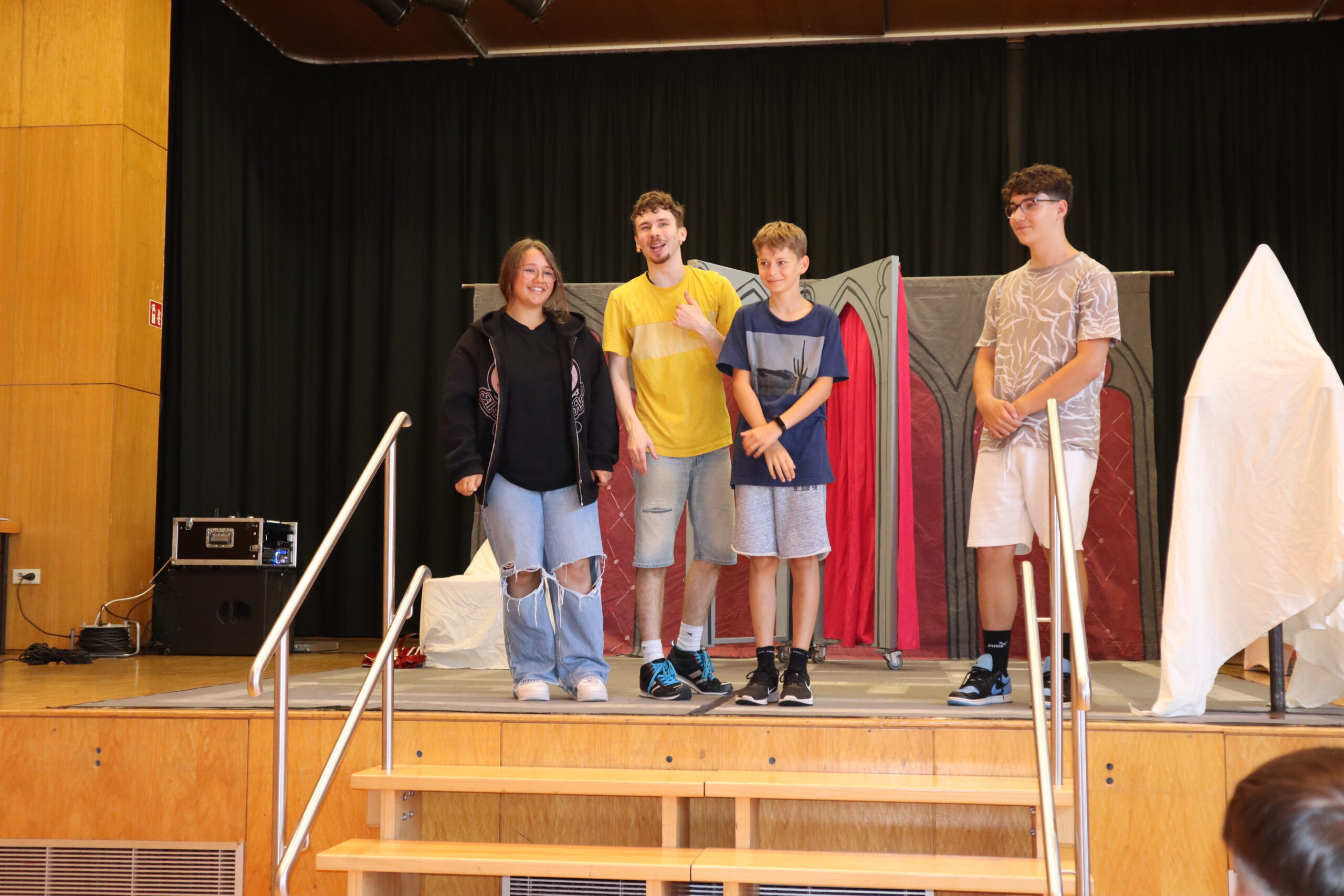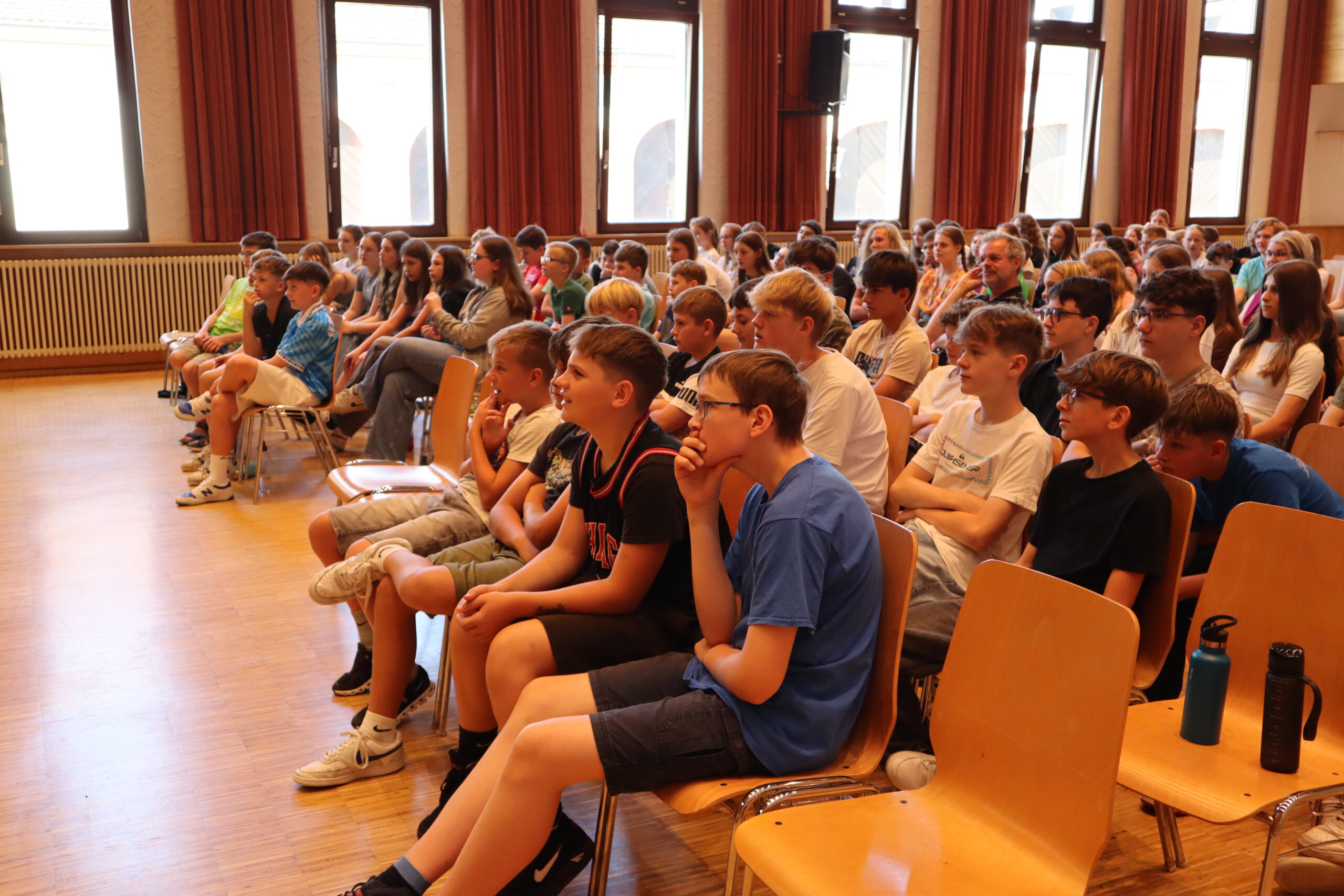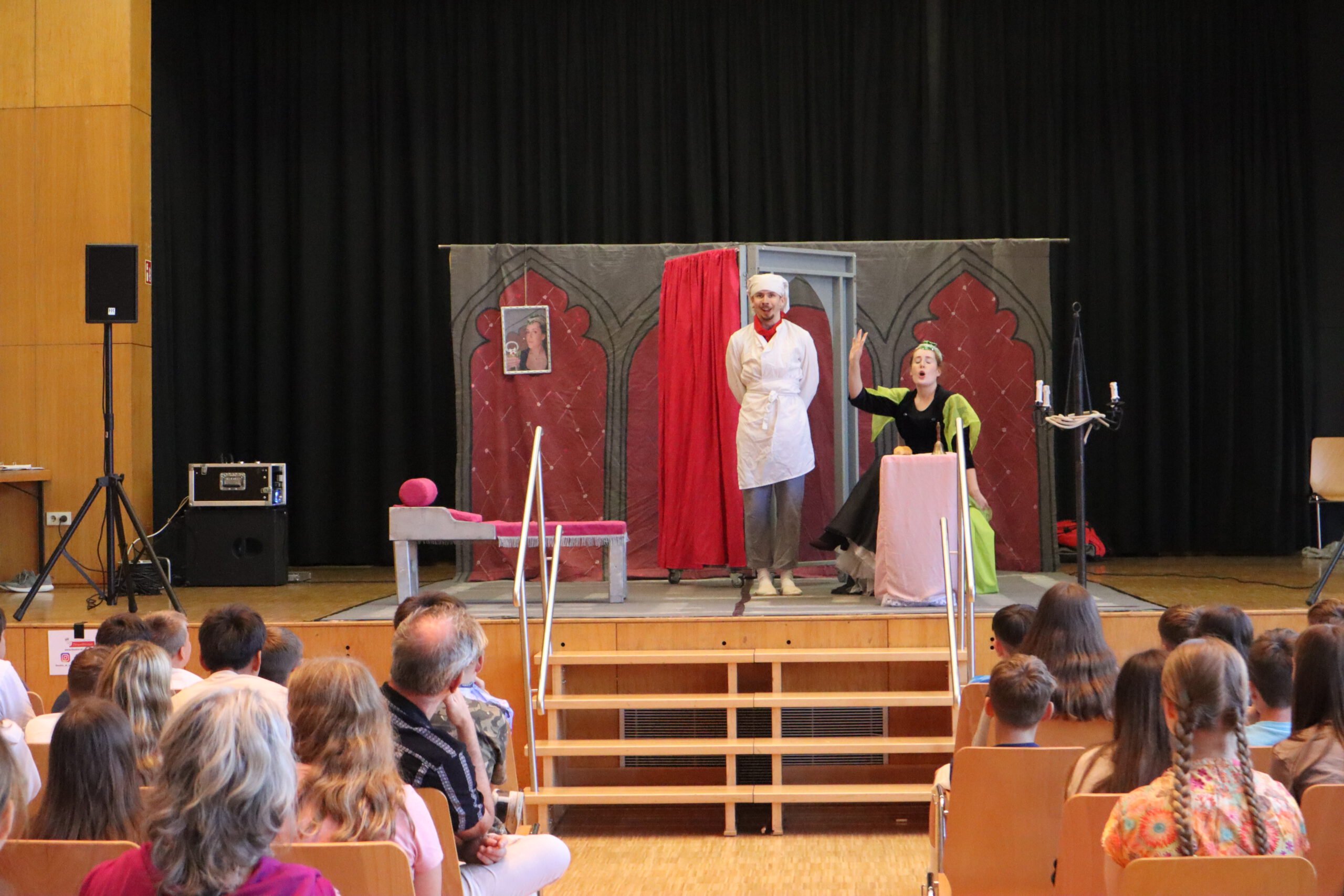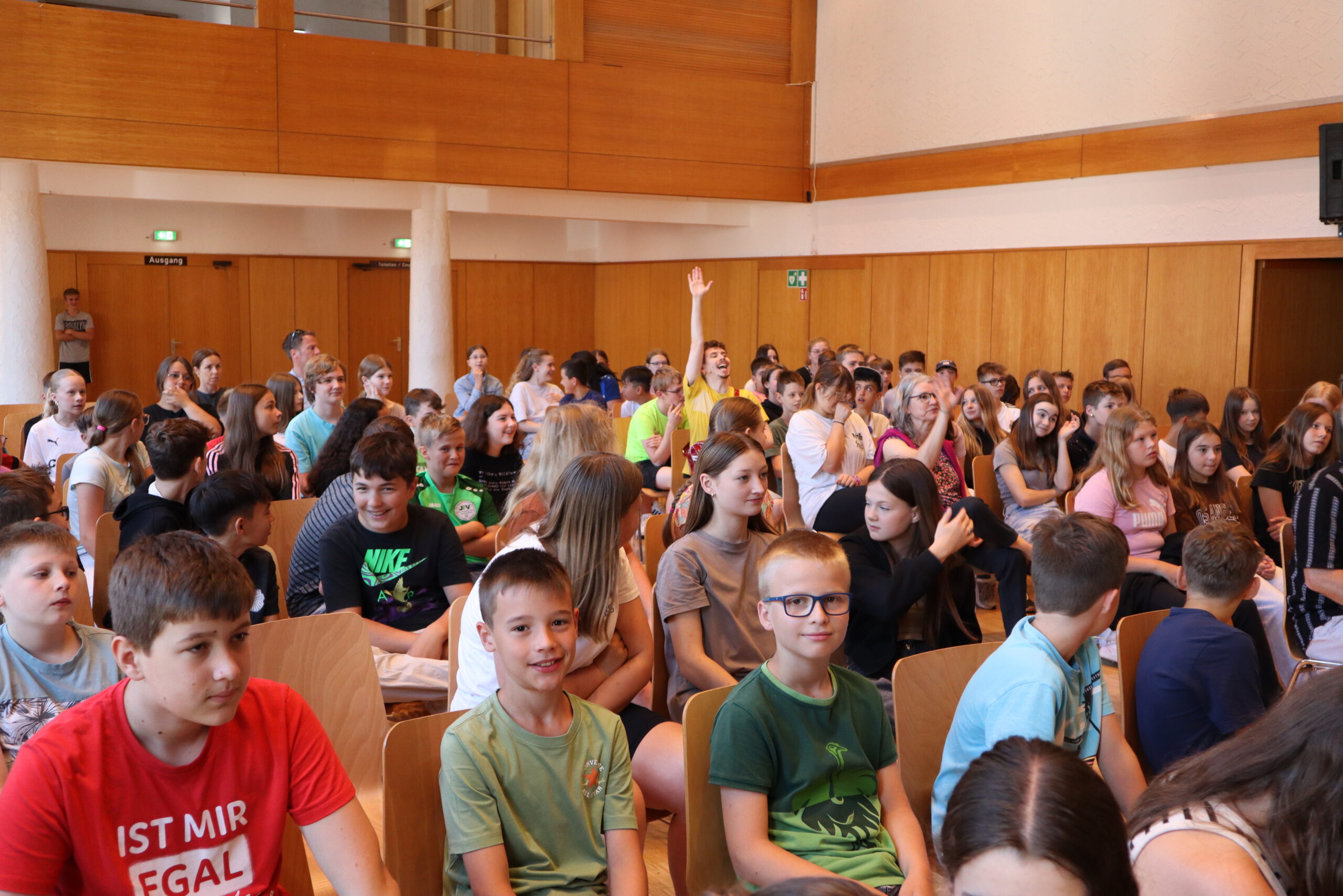 Der Besuch des fantastischen Mitmach-Musicals „Aldrick Castle“ in der Schwarzacher Festhalle wurde nicht zuletzt durch den Förderkreis der Realschule ermöglicht, der sich am Eintrittspreis beteiligt hat. Durch das Theaterstück hatten die Englischanfänger die Chance, zu erfahren, wie viel sie bereits im Englischen verstehen. Im Anschluss an die Aufführung durften die Schwarzacher Realschüler noch Fragen an die beiden „native speakers“ richten. So erfuhren sie beispielsweise, dass die beiden jungen Schauspieler schon seit elf Monaten durch Deutschland reisen und ihre Show in Schwarzach bereits ihr 138. Auftritt vor Schülern gewesen war.