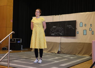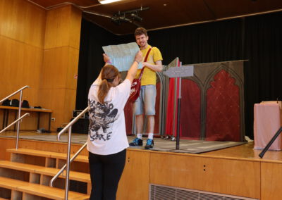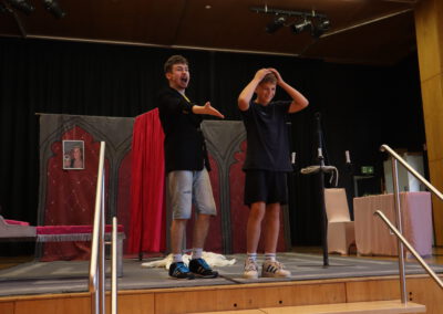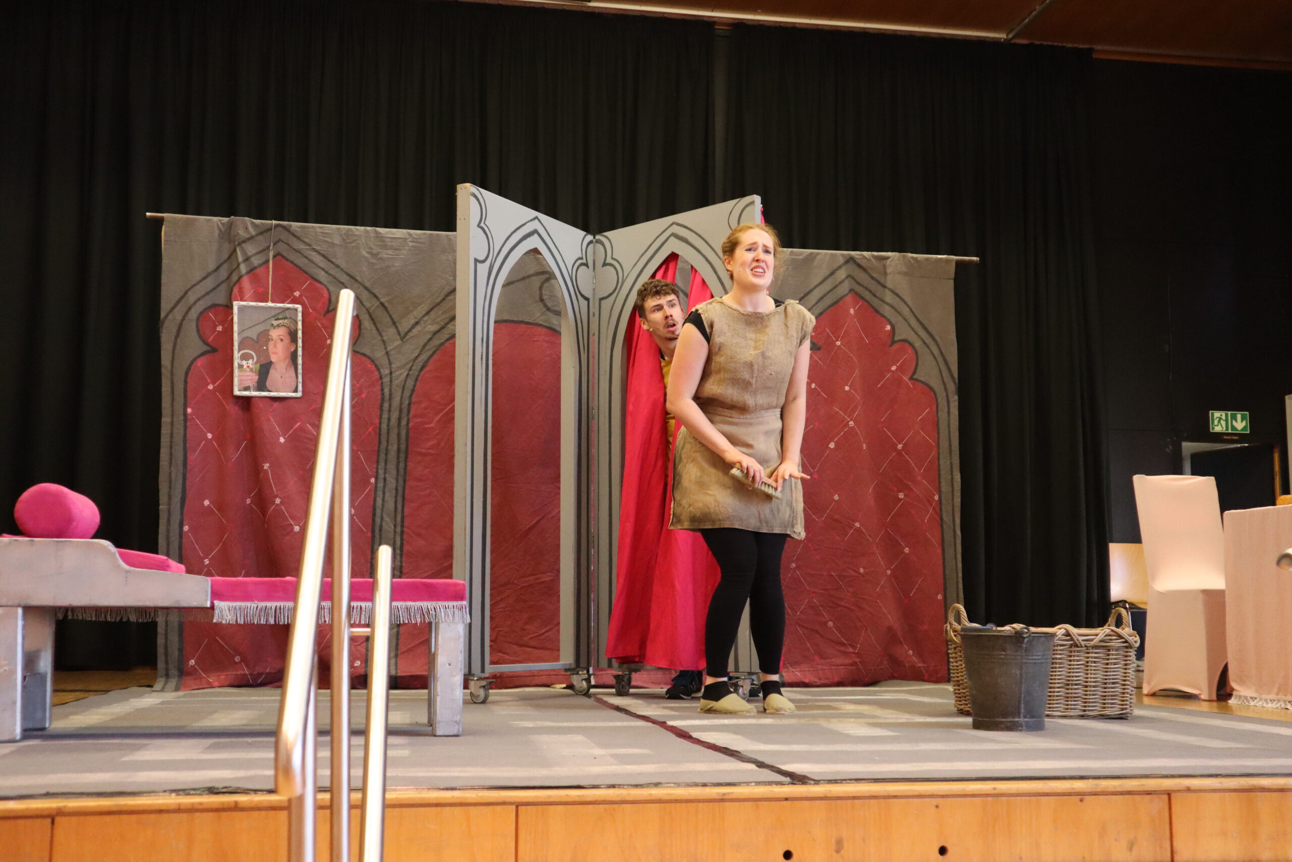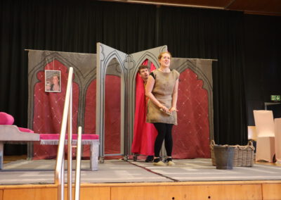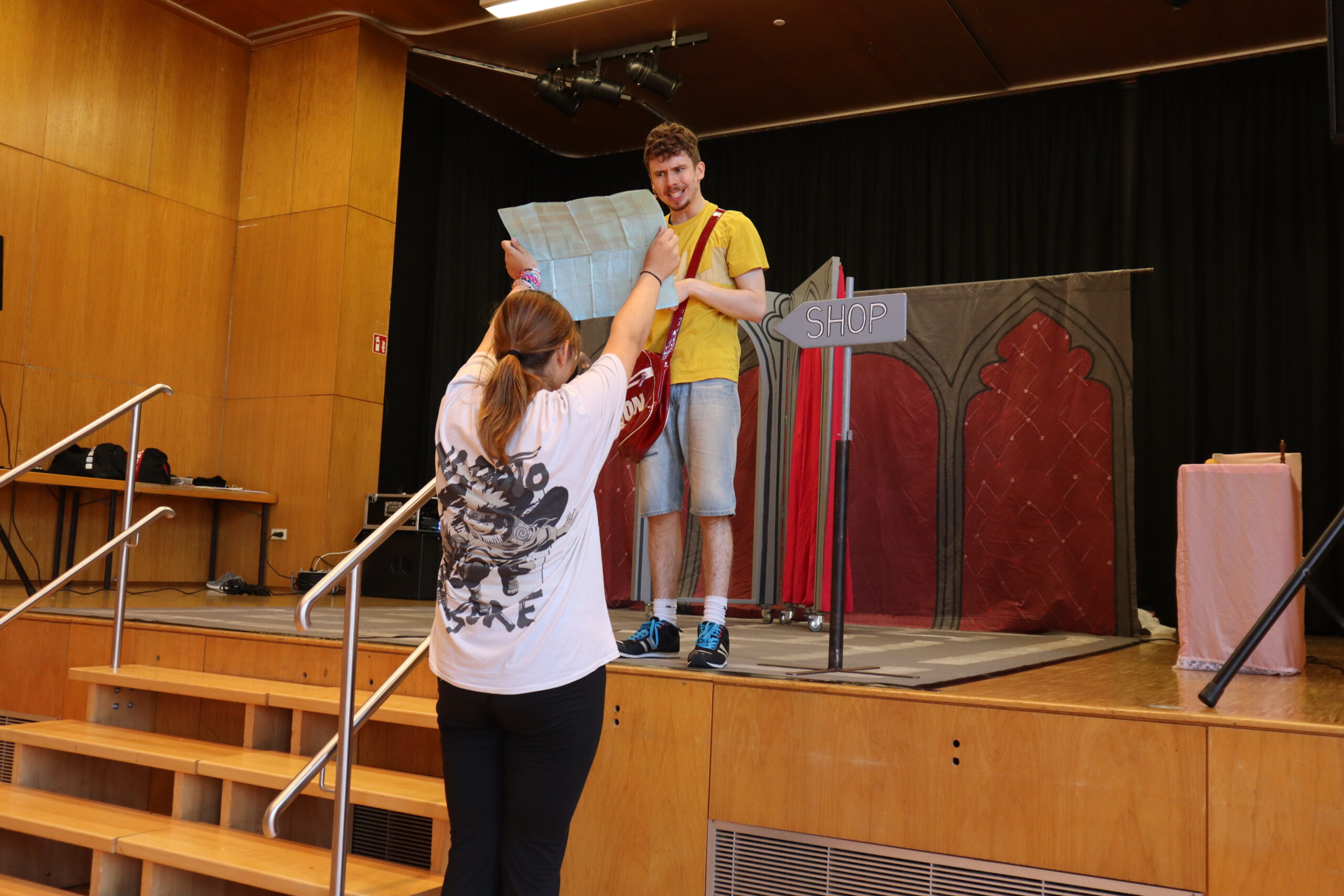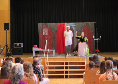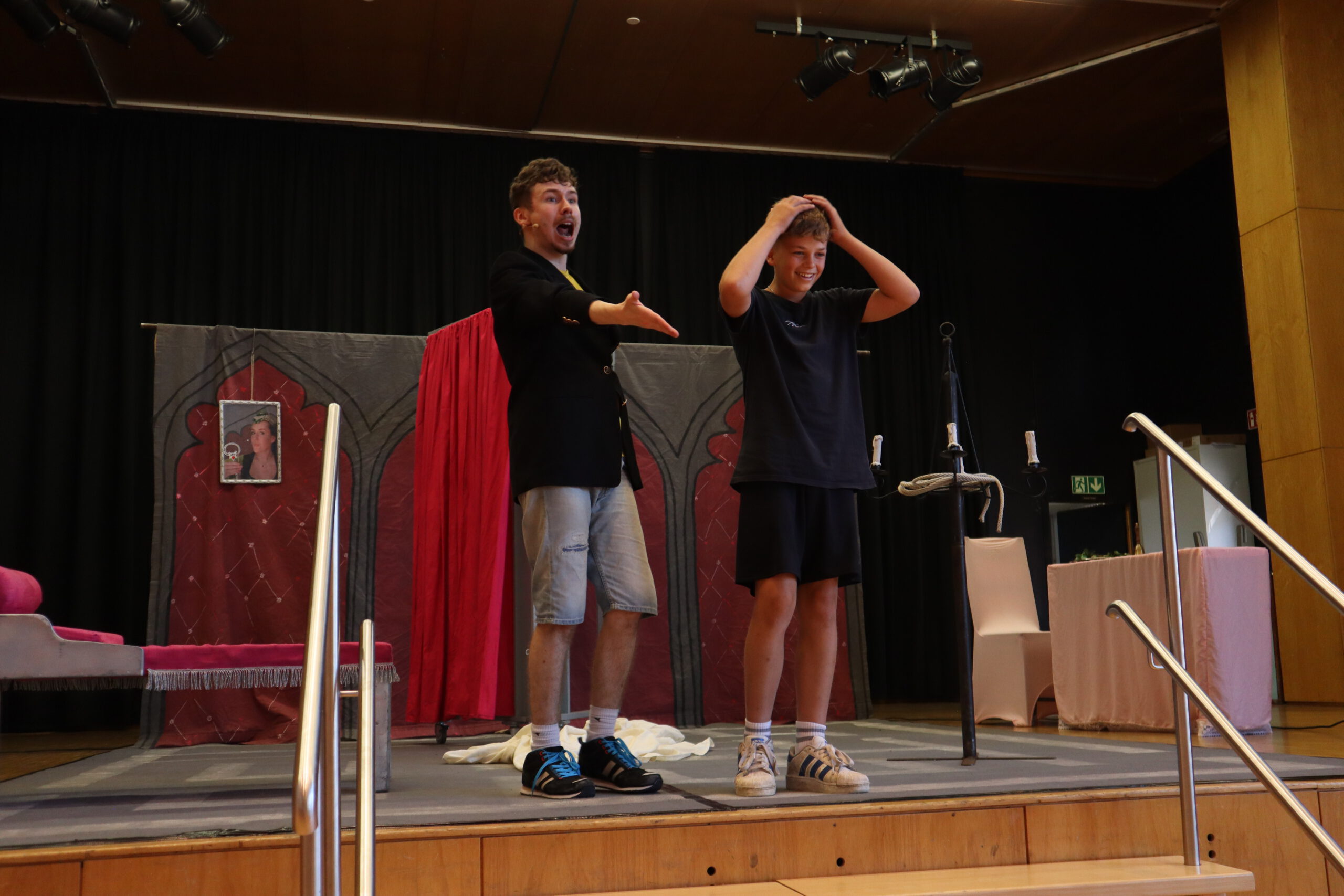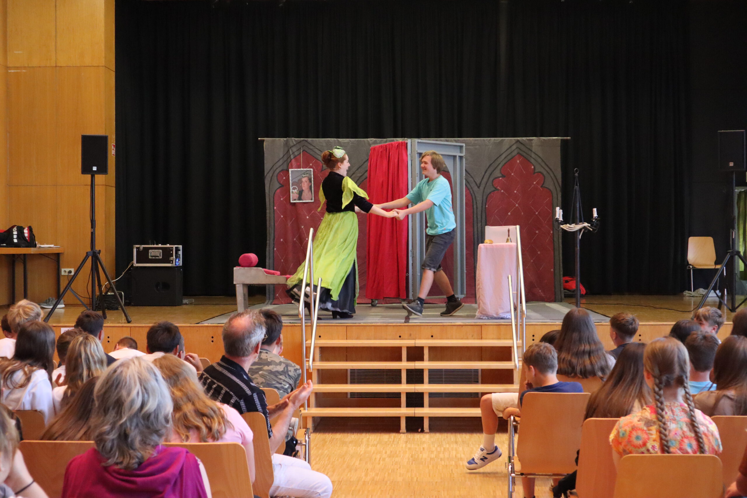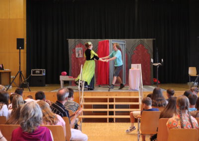 So entführten die beiden muttersprachlichen Schauspieler Rowan Miller aus Edinburgh und Jack Furlong aus Liverpool die Schwarzacher Kinder auf einen Klassenausflug ins 17. Jahrhundert, zum englischen Schloss „Aldrick Castle“. Ein besonders pfiffiger und origineller Schüler namens Tom macht sich während des Klassenausflugs sodann allein auf den Weg, um mit einer geheimnisvollen Karte den labyrinthisch angelegten Kerker des Schlosses zu finden. Eine Zeitreise bringt ihn zurück ins 17. Jahrhundert, als eine launische Gräfin im Schloss lebte. Tom erzählt der Magd Sally von Smartphones, Playstation-Konsolen und Sandwiches, doch er möchte auch die Kerkerinsassen aus der Herrschaft der bösartigen Gräfin befreien. Die Zuschauer wurden aktiv eingebunden und halfen dem Schüler Tom dabei, den Kerker zu finden und das Abenteuer zu bestehen. Auch ein Tänzchen mit der gefürchteten Gräfin auf der Bühne ließen sich einige der jungen Zuschauer nicht entgehen. Schöne Kulissen zeigten das Schloss und das Zimmer der Schlossherrin. Das Stück wurde immer wieder von coolen Songs begleitet, die von den zwei Schauspielern live gesungen wurden. Beide haben mit sehr viel Freude und vollem Einsatz gespielt, was das Publikum mitgerissen hat.