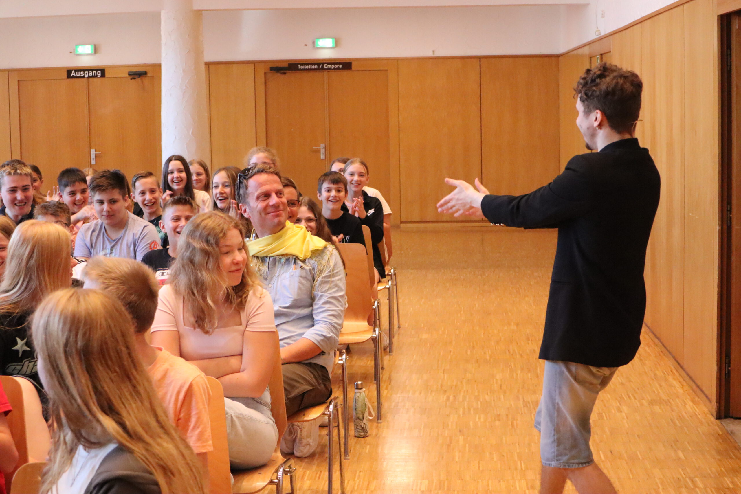 Eine ganz besondere Englisch-Stunde erlebten die Schüler der sechsten und siebten Klassen der Realschule am Montagmorgen in der Schwarzacher Festhalle: Um sie auf spielerische und witzige Art mit der Fremdsprache Englisch in Berührung zu bringen und ihr Vertrauen in die eigenen Verstehens- und Ausdrucksfähigkeit zu stärken, hatte die Fachschaft Englisch erneut die Schauspiel-Truppe von „Theatre-at-School“ aus Willich im Kreis Viersen engagiert, die Theater speziell für Schüler anbietet.