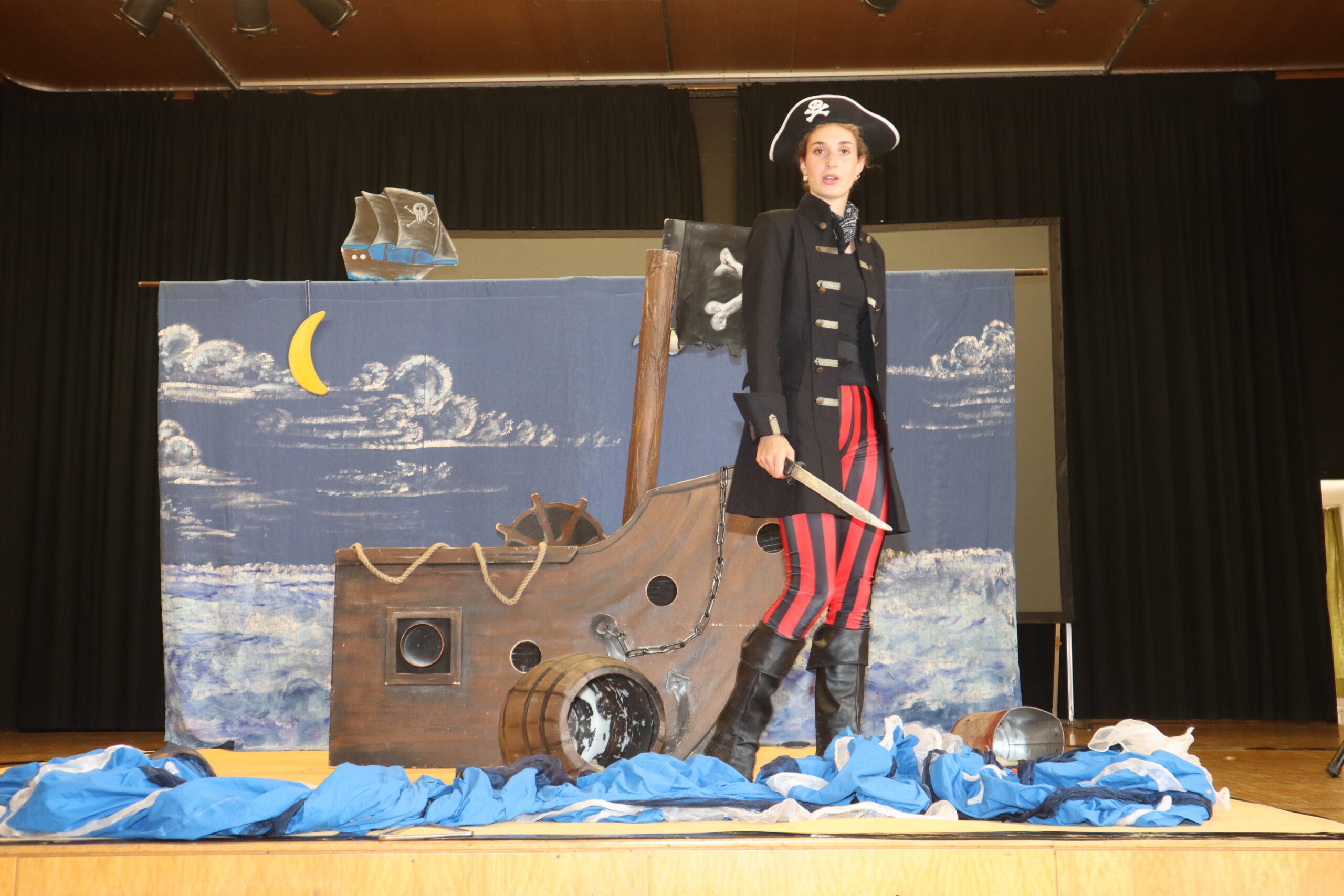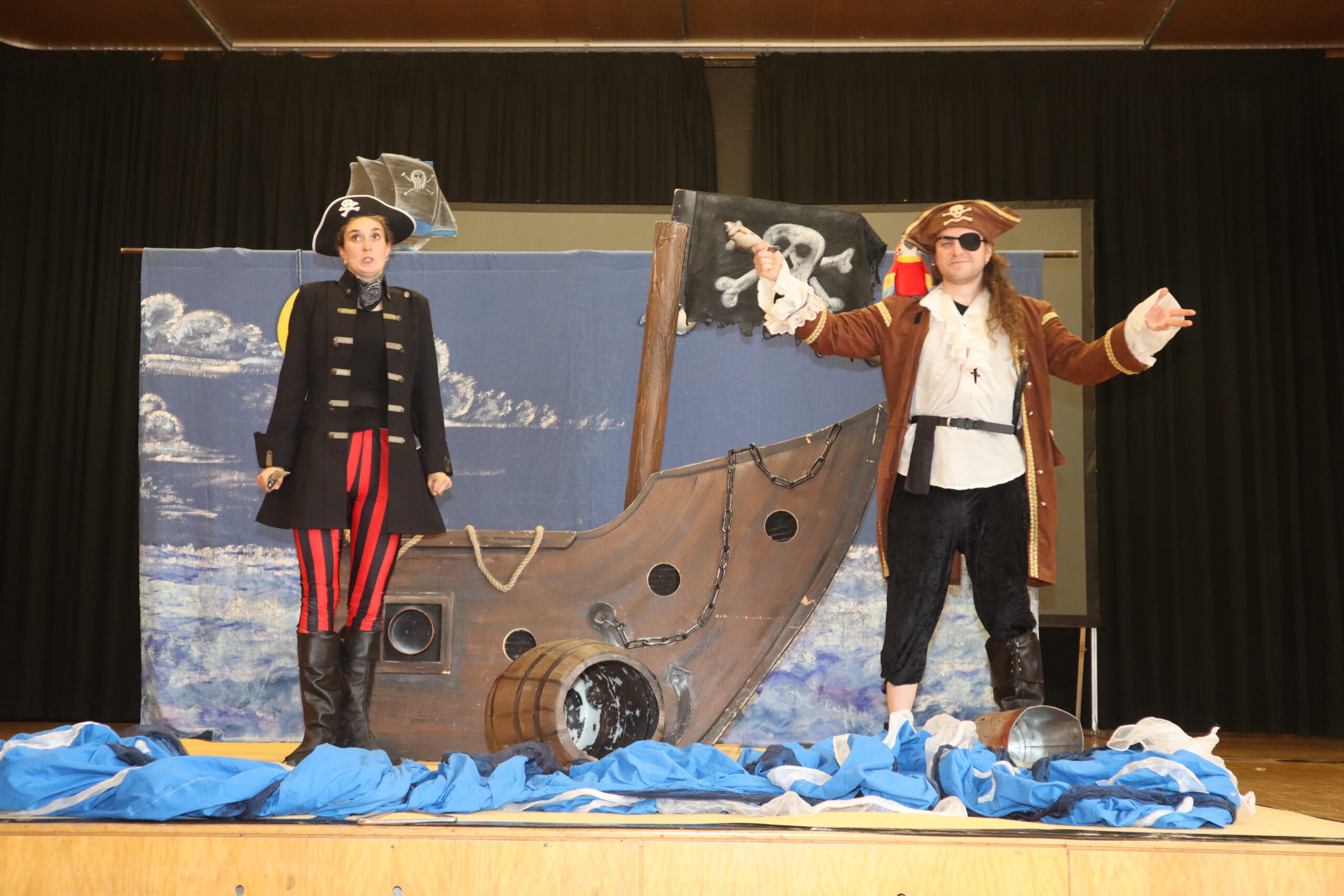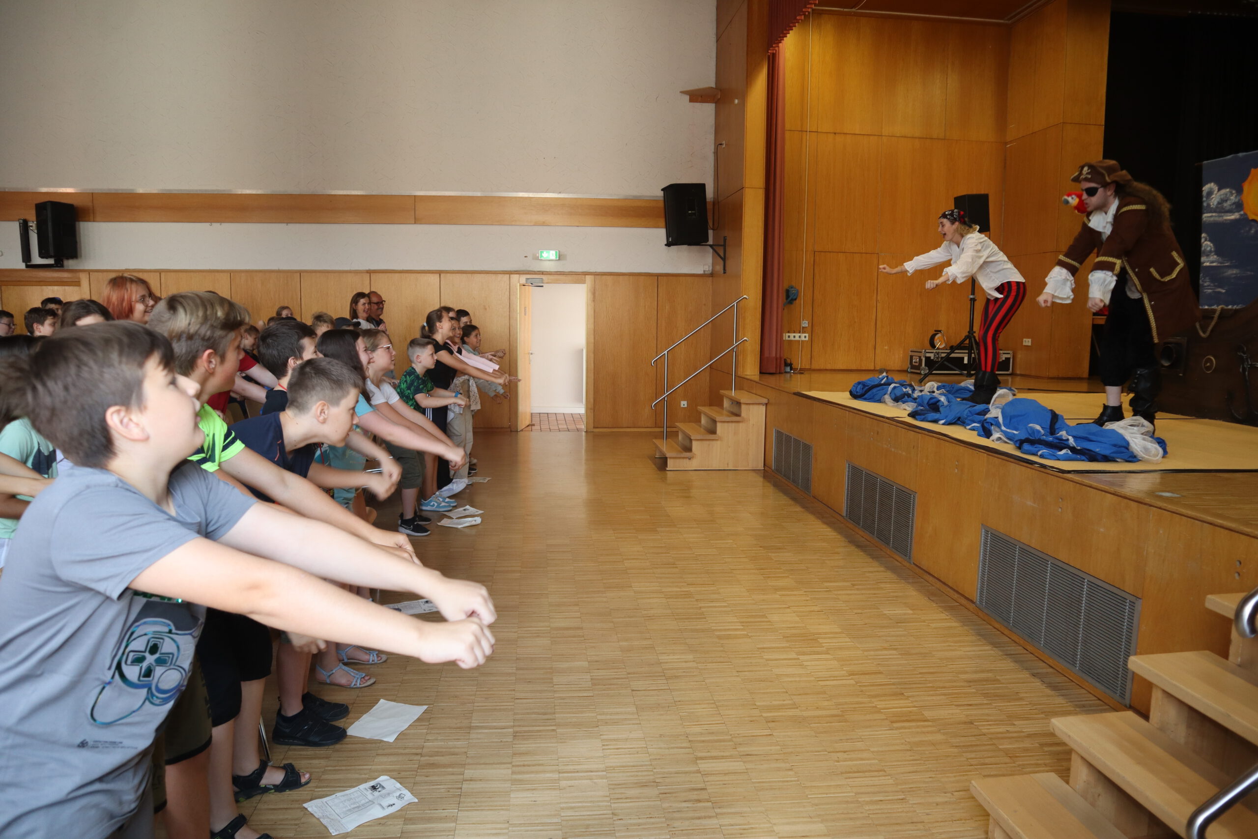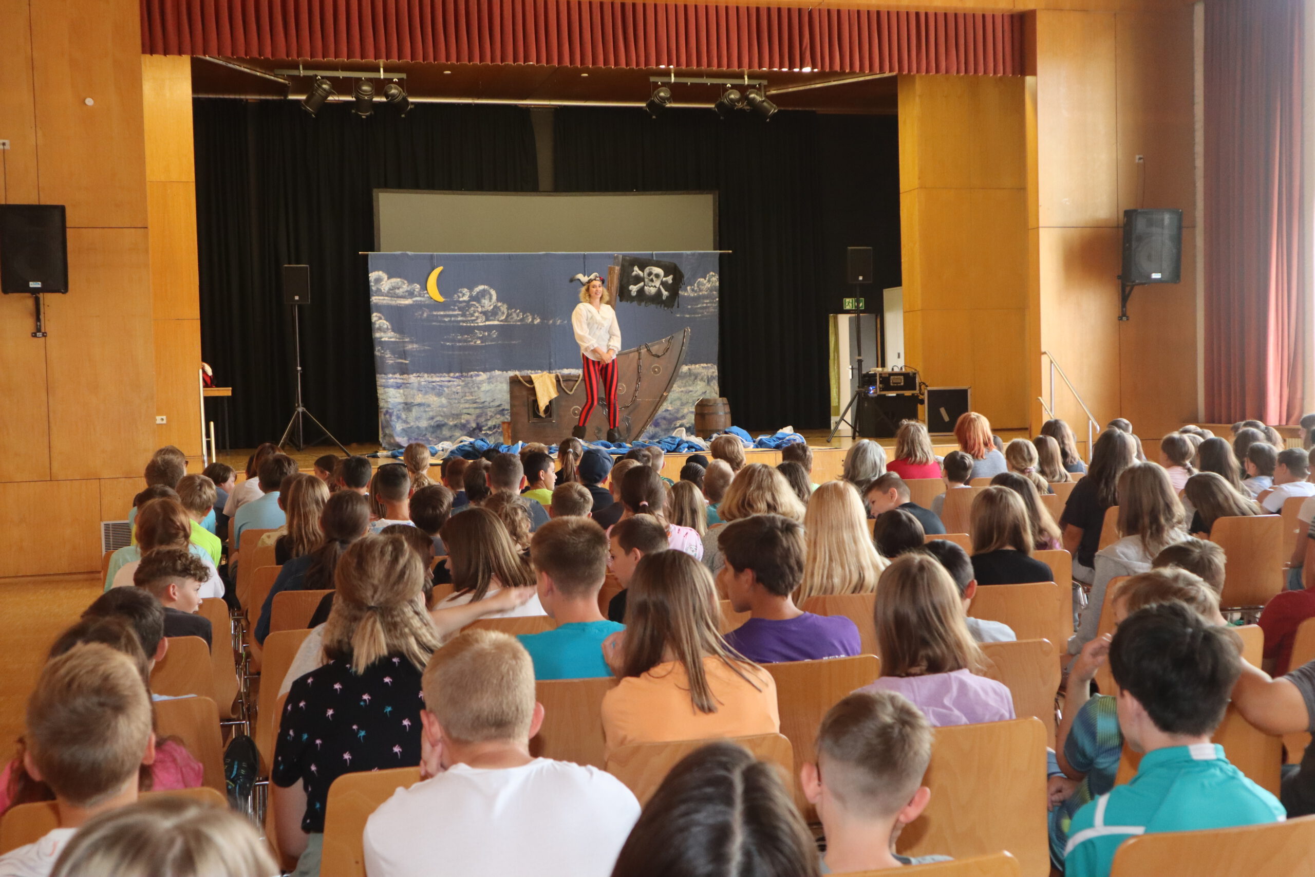 „Ahoy there!“ und „Leinen los!“ hieß es am Freitagmorgen für die Klassenstufen fünf und sechs in der Schwarzacher Festhalle. Das englische Tourneetheater „Theatre@School“ mit den beiden in London ausgebildeten Schauspielern Chiara Schmolz und Joseph Mark entführte mit einem kurzweiligen englischsprachigen Piraten-Musical die Schülerinnen und Schüler in die Weiten der Weltmeere.