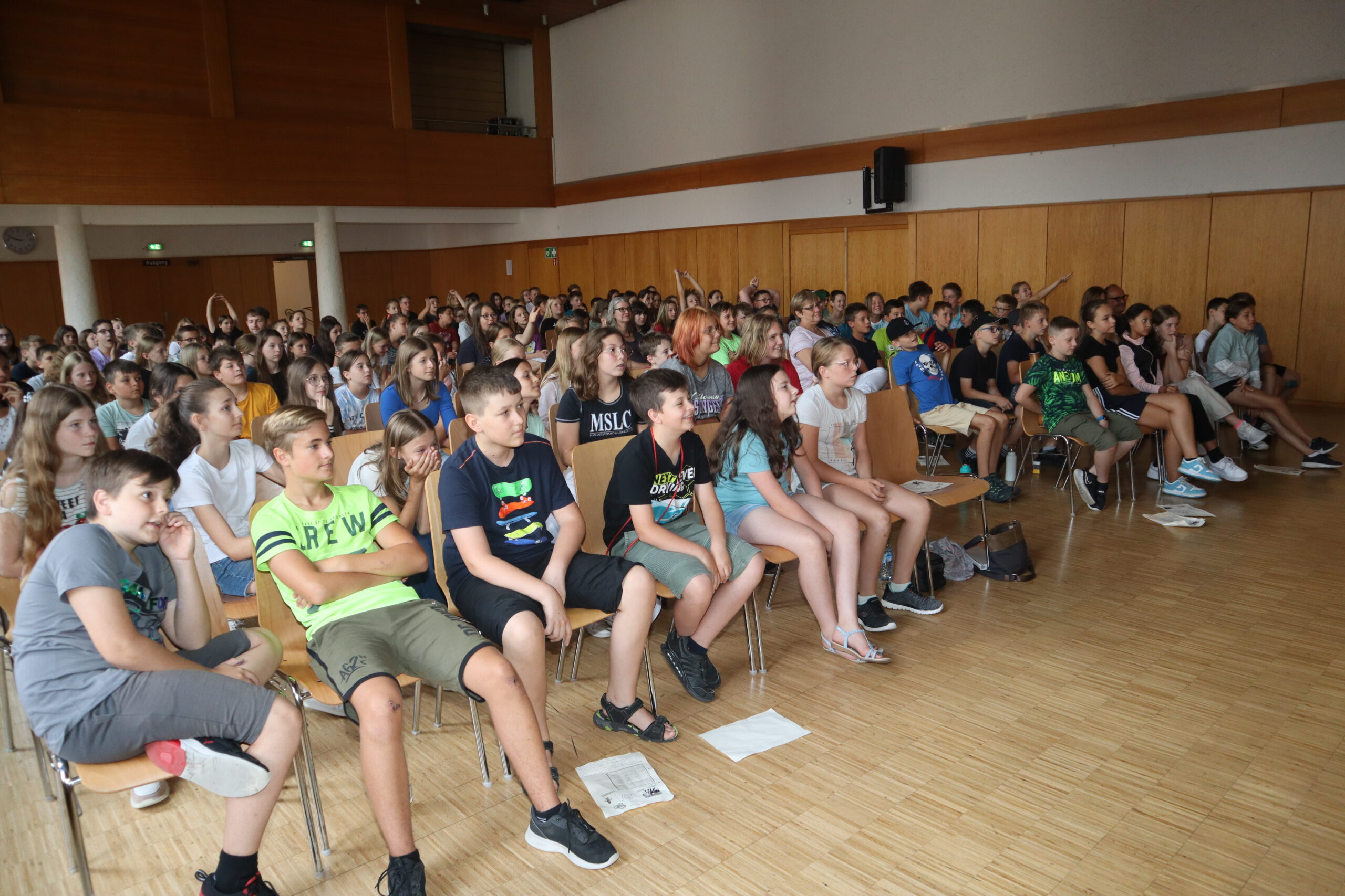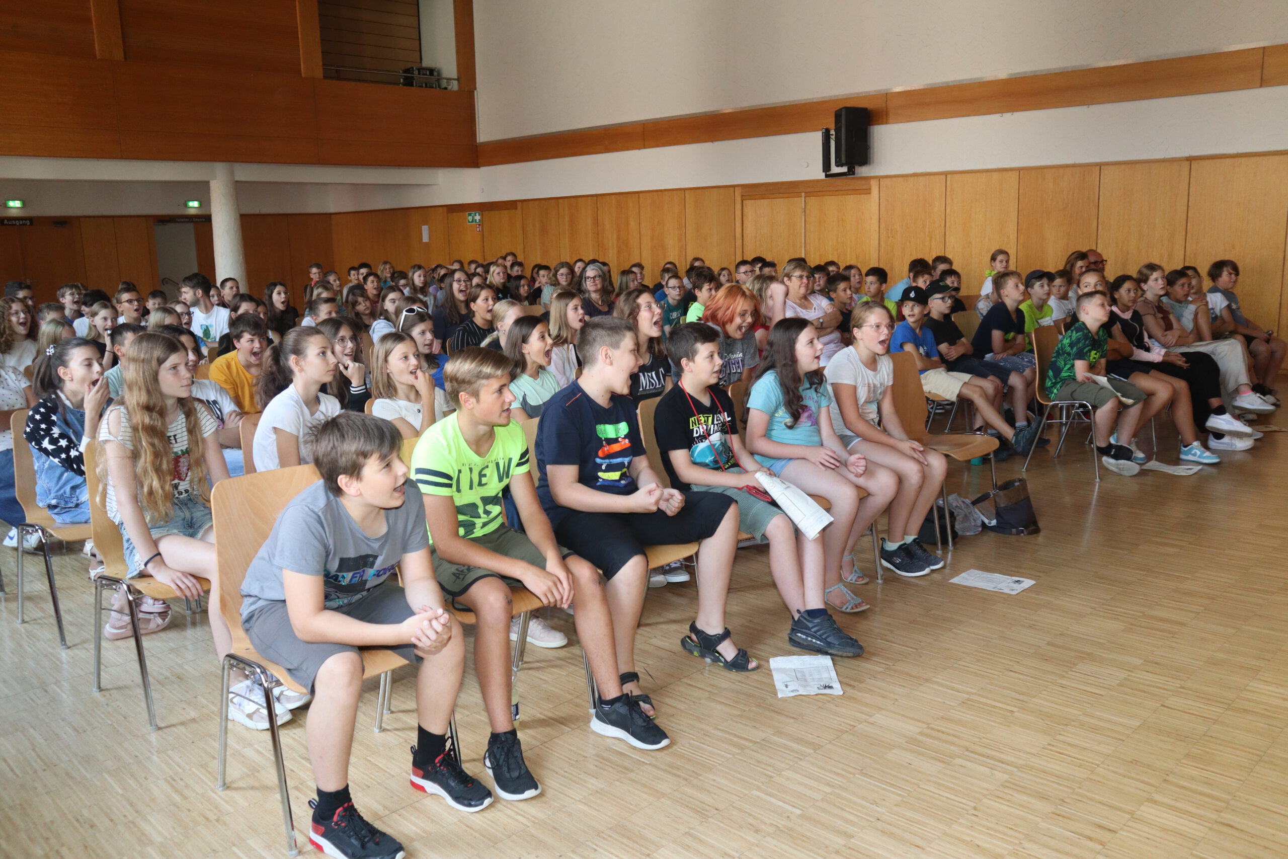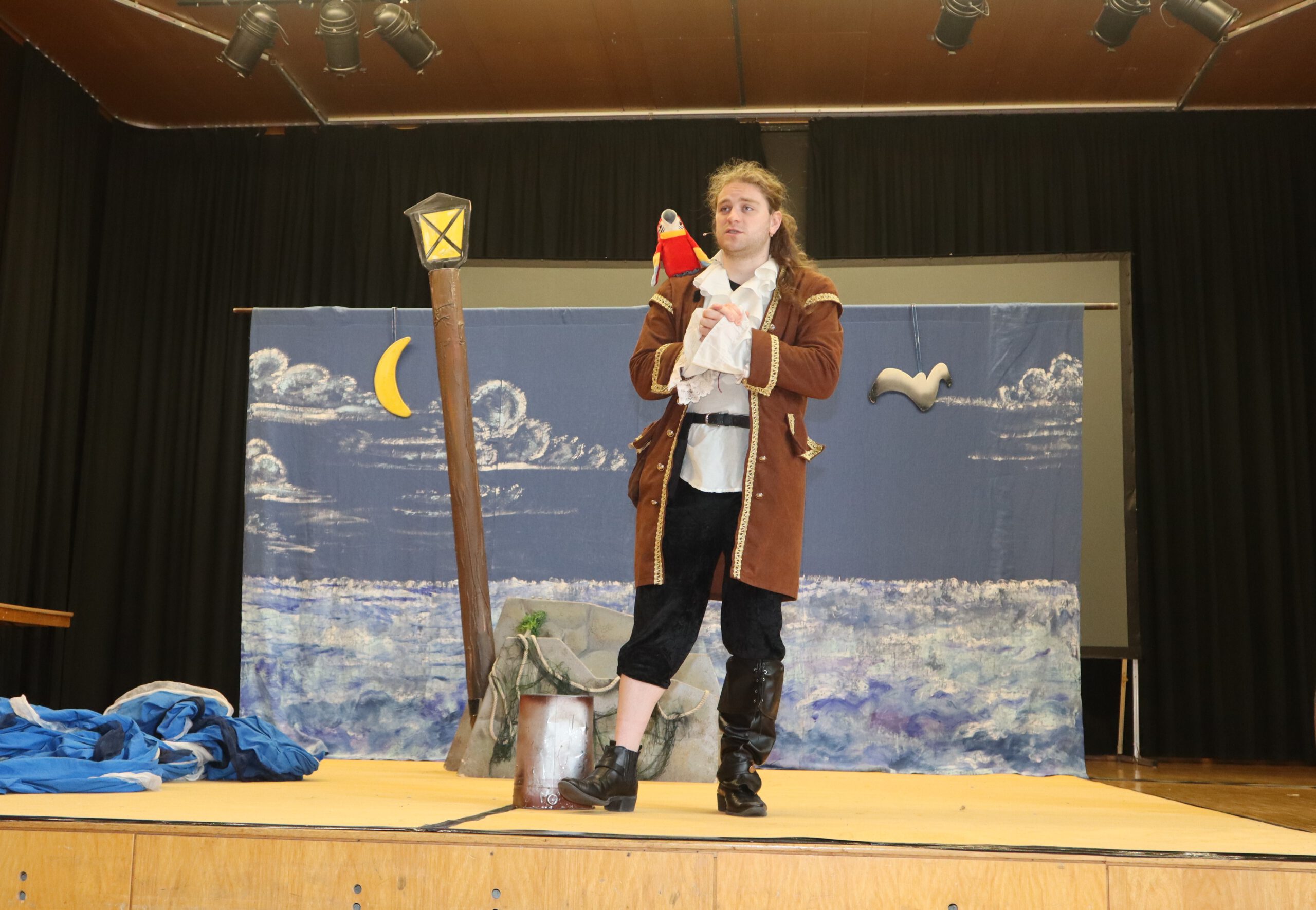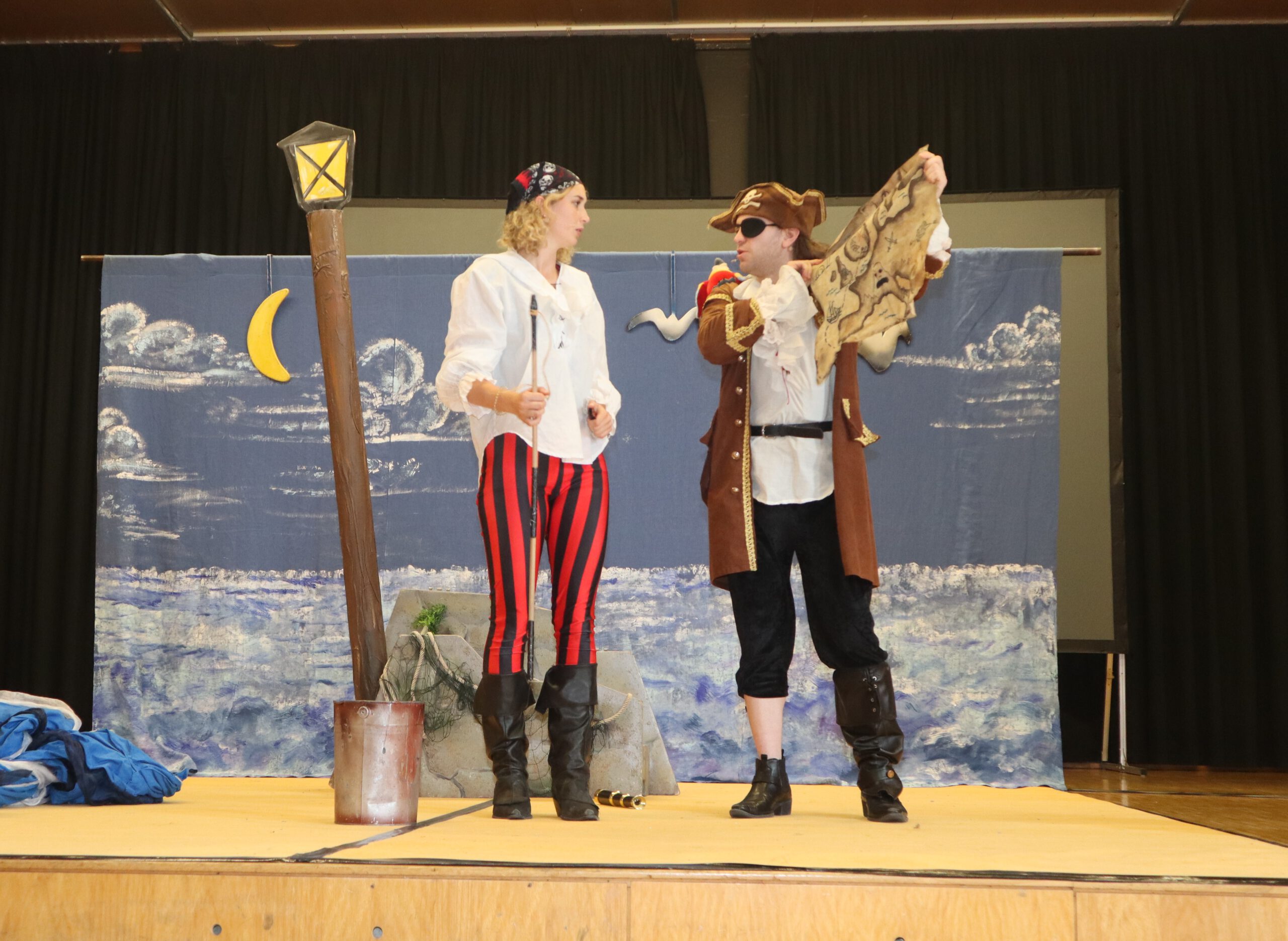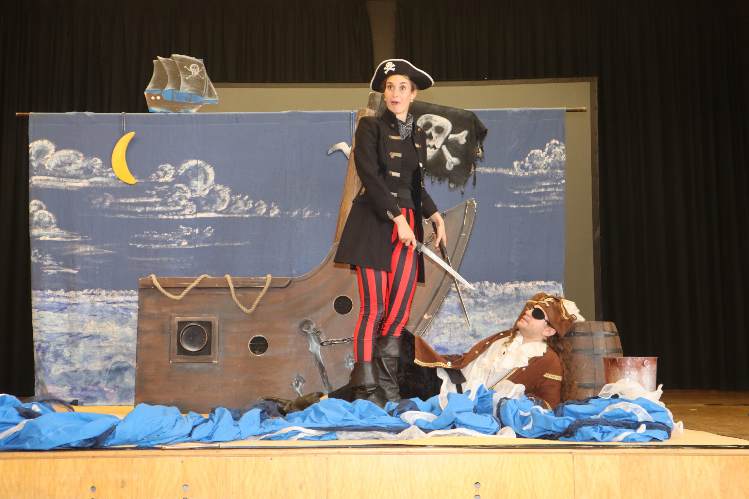 „Ahoy there!“ und „Leinen los!“ hieß es am Freitagmorgen für die Klassenstufen fünf und sechs in der Schwarzacher Festhalle. Das englische Tourneetheater „Theatre@School“ mit den beiden in London ausgebildeten Schauspielern Chiara Schmolz und Joseph Mark entführte mit einem kurzweiligen englischsprachigen Piraten-Musical die Schülerinnen und Schüler in die Weiten der Weltmeere.