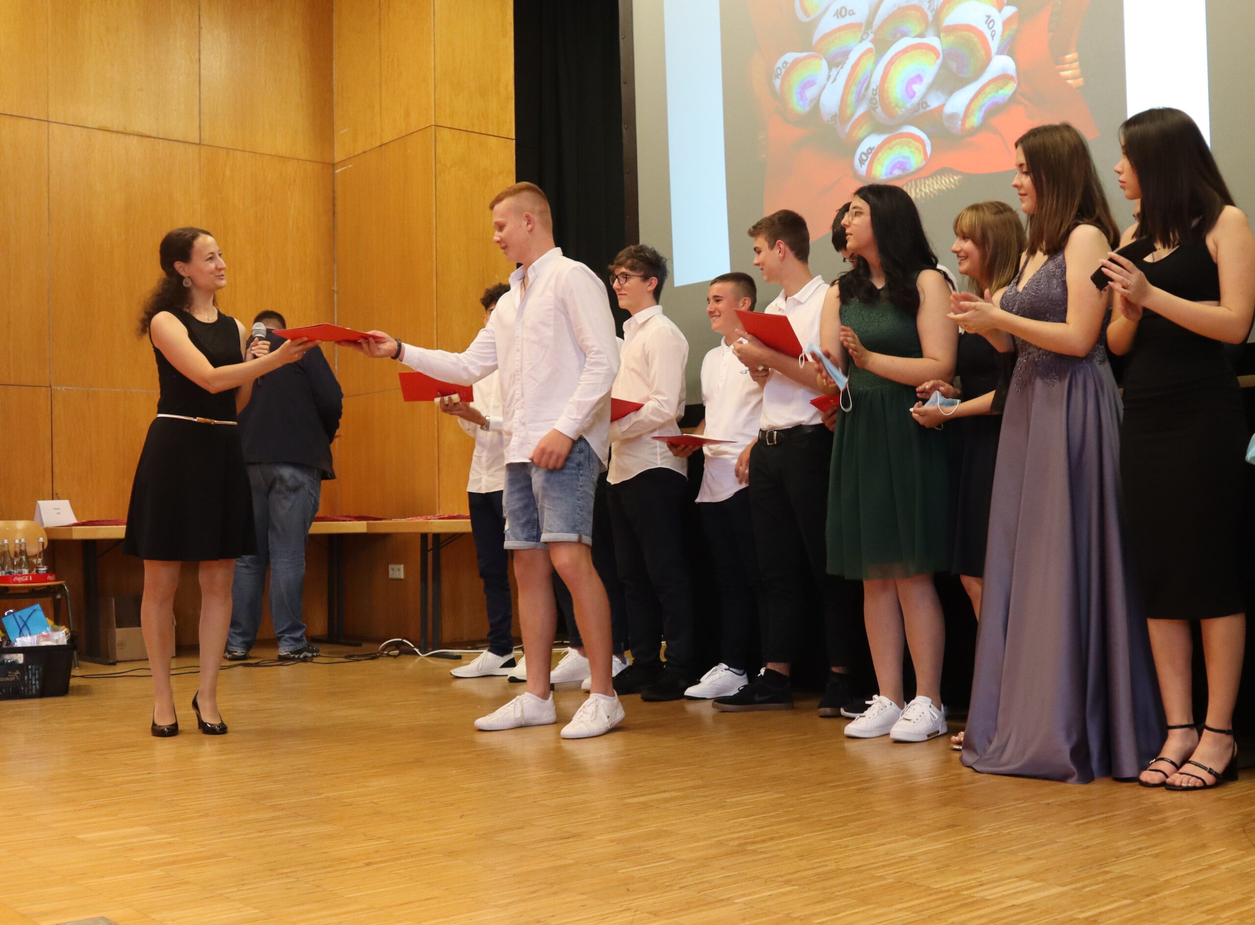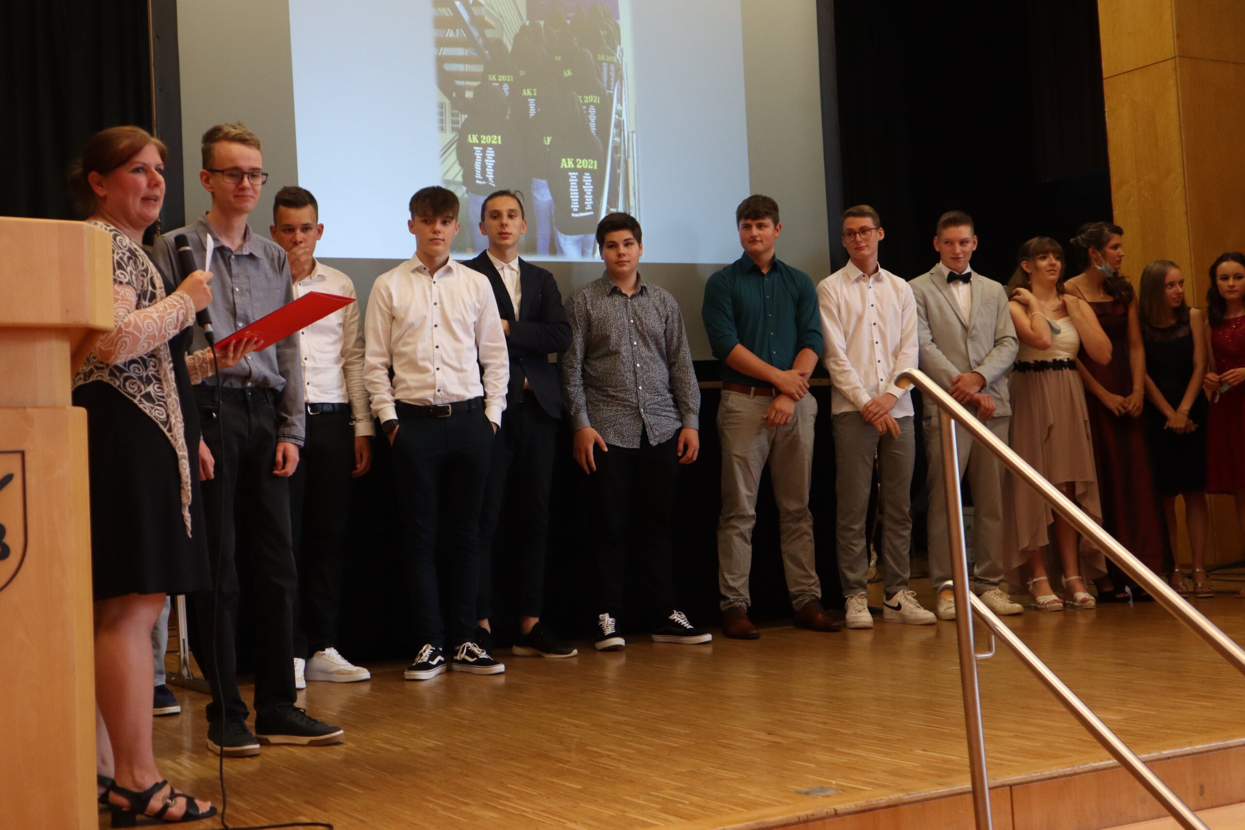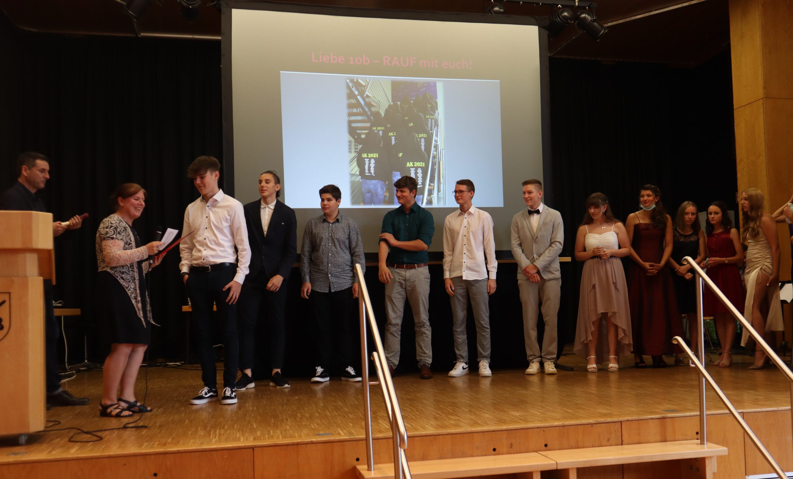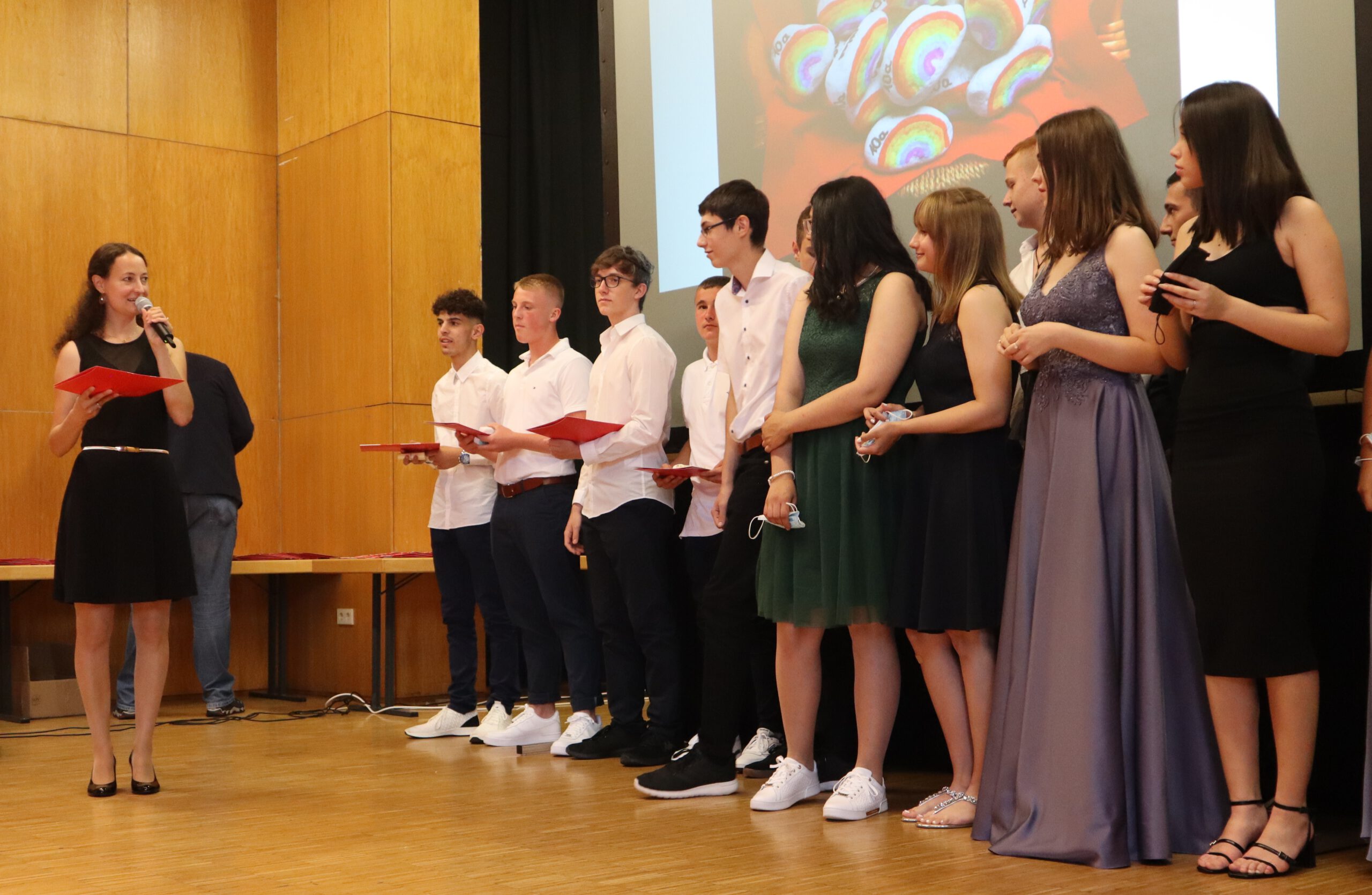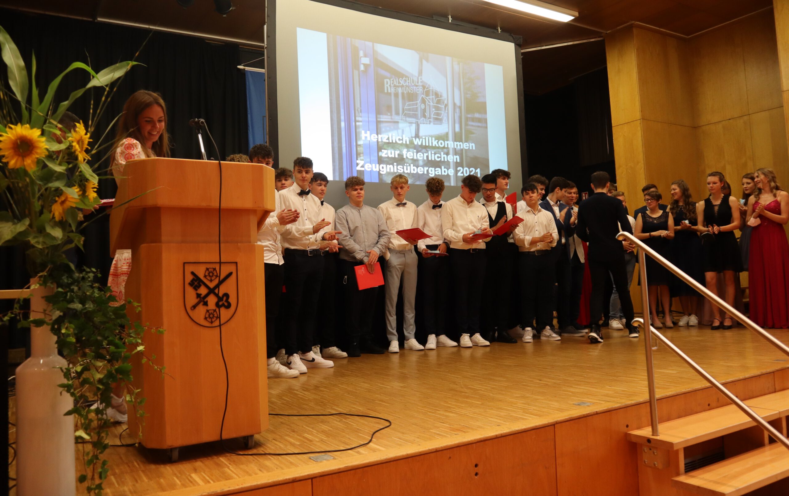 Am Freitag war der große Tag für die 78 erfolgreich reifegeprüften Zehntklässler der Realschule Rheinmünster endlich gekommen: Nach einem turbulenten Schuljahr, das mit Phasen des reinen Online-Lernens, des Wechsel- und zum Schluss wieder des Präsenzunterrichts einer wahren Achterbahnfahrt durch alle nur erdenklichen Unterrichtsszenarien glich, konnten die Absolventen nun feierlich und würdig verabschiedet werden. Die Feierstunde für die drei Abschlussklassen fand am Freitagabend in drei aufeinander folgenden Blöcken in der Schwarzacher Festhalle statt, somit konnten trotz der geltenden Abstands- und Hygieneregeln die Eltern die Ehrung ihrer Kinder live miterleben.