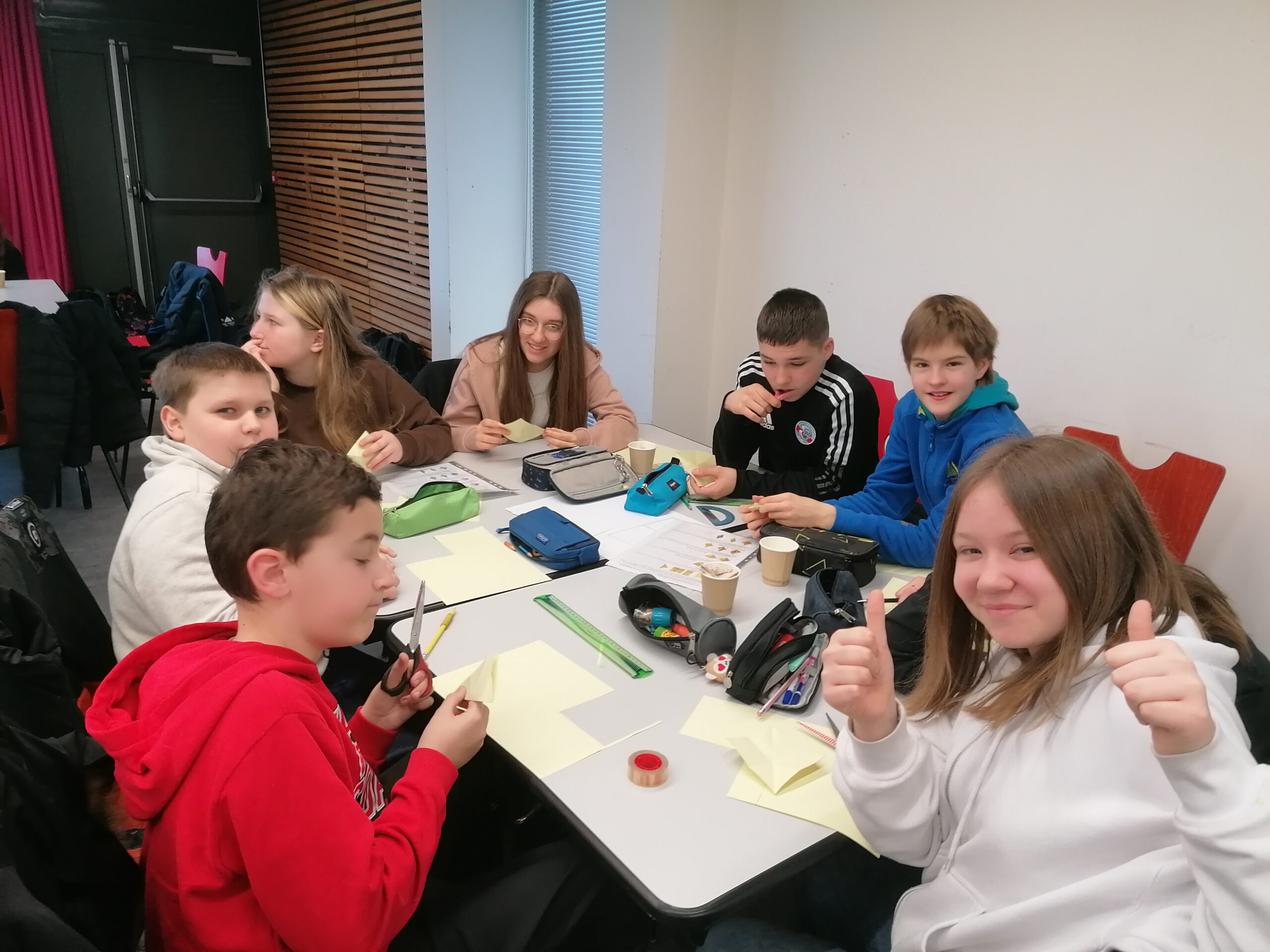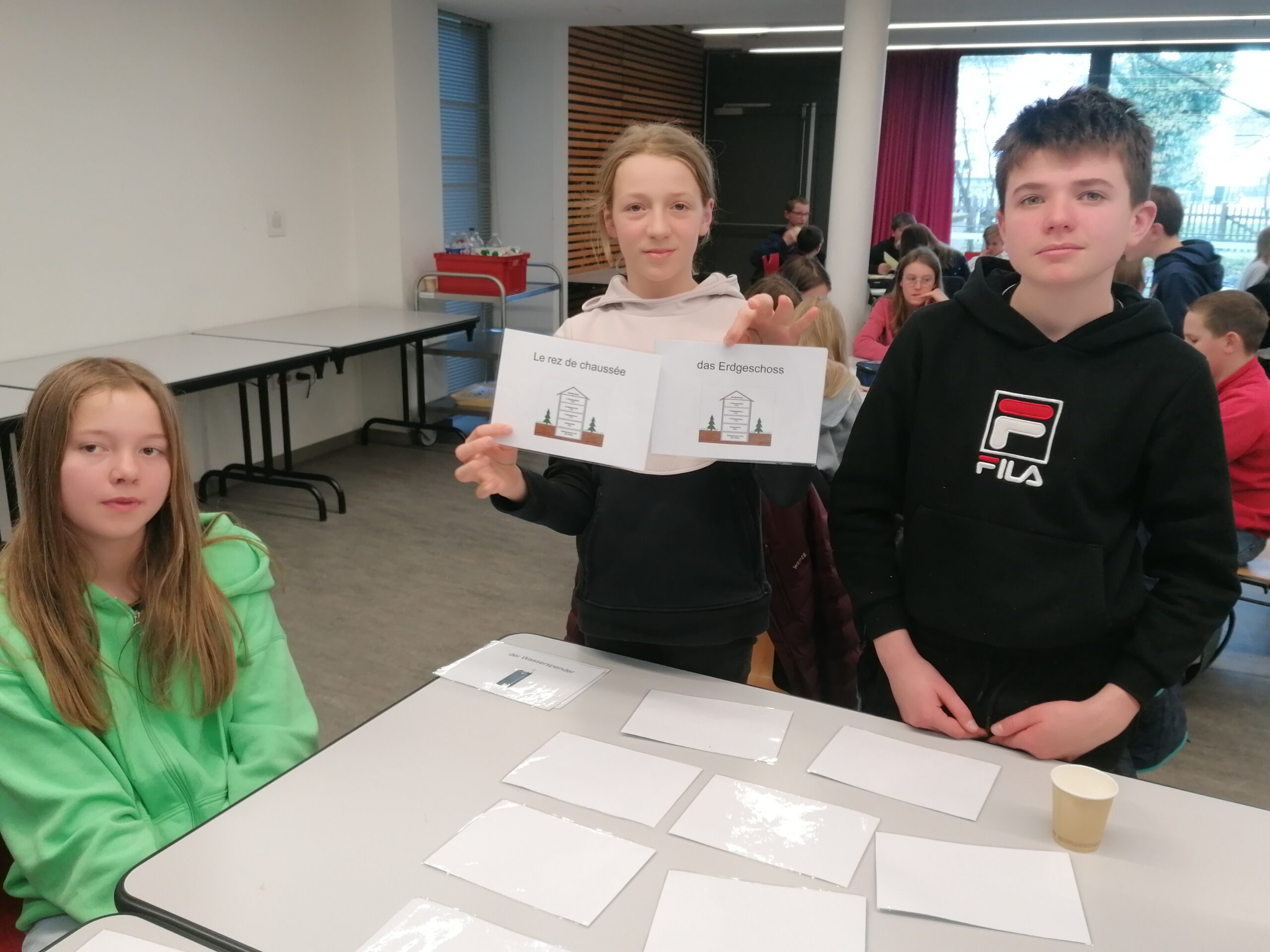 Zurück im Raum mit den Gruppentischen galt es den restlichen Vormittag, verschiedene Aufgaben zu erfüllen, welche im halbstündigen Rhythmus gewechselt wurden. Als sehr knifflig stellte sich dabei das Zusammensetzen eines Tangram- Ostereies heraus, ebenso das Falten eines Origami- Vogels. Ohne die Sprachbarriere wären diese Aufgaben zweifelsohne schneller gelöst worden, aber trotzdem gab man sich Tipps und kommunizierte irgendwie. Besonders gut kam das zweisprachige Memoryspiel an. Hätten die Schüler gewusst, dass es am Nachmittag ein Quiz zu den dabei verwendeten Vokabeln zum Wortfeld „Schule“ gab, hätten sie sich die Bild- und Wortzuordnungen wohl noch besser eingeprägt. Aber zwischendurch gab es ja die große Pause, in welcher alle mit leckerem Kuchen verpflegt wurden, dann die Mittagspause, in der die meisten Deutschen das französische Kantinenessen probieren konnten. Der Fisch schmeckte fast allen ausgezeichnet und manche aßen zum ersten Mal in ihrem Leben Couscous, eine nordafrikanische Spezialität. Nur wenige Schüler gingen zum Mittagessen mit ihren „corres“ nach Hause in die Familie.