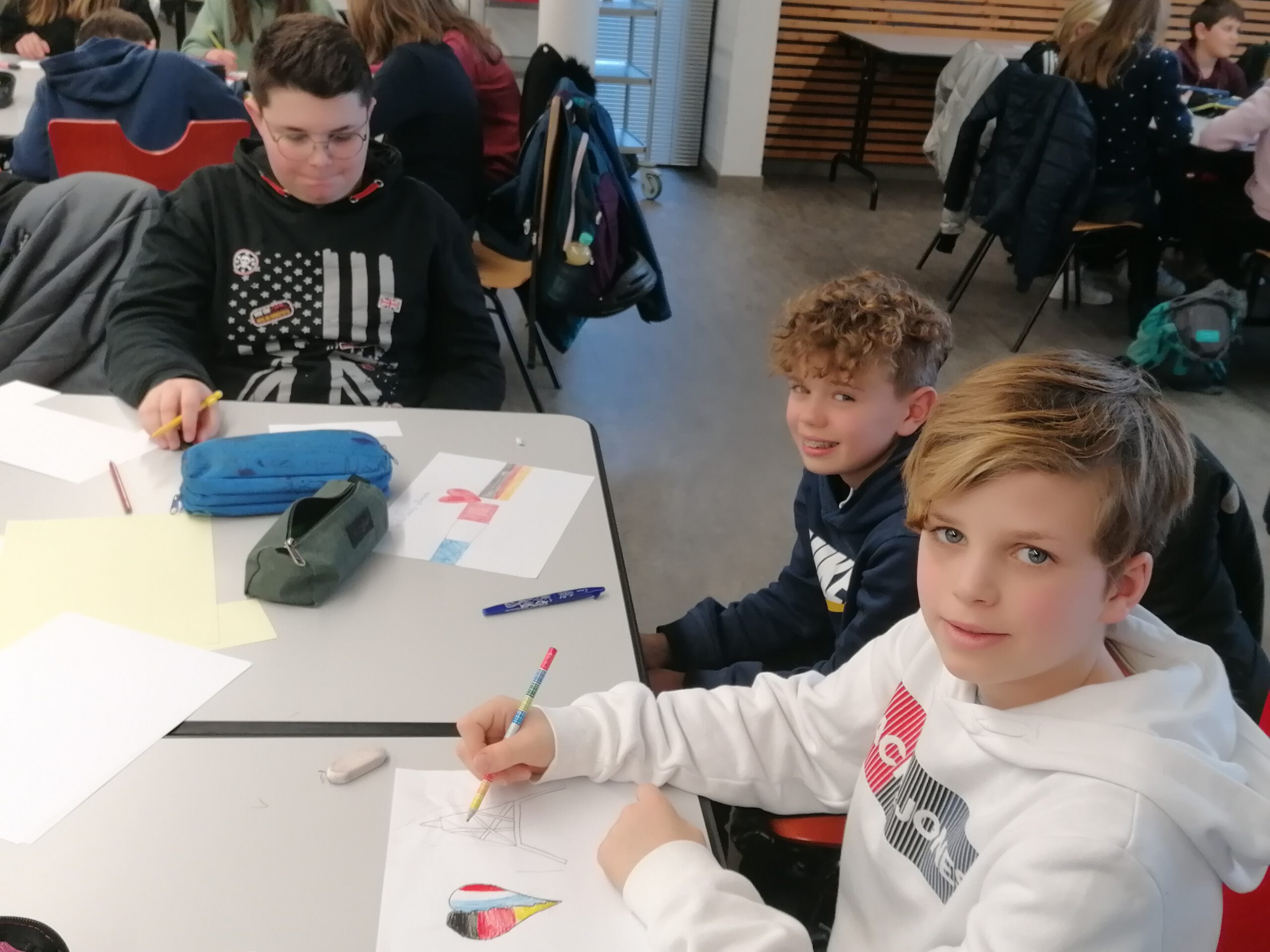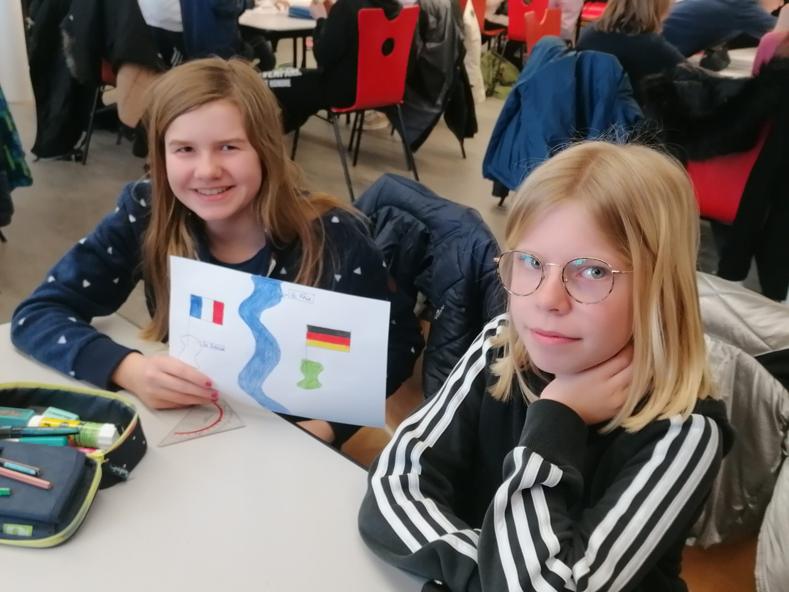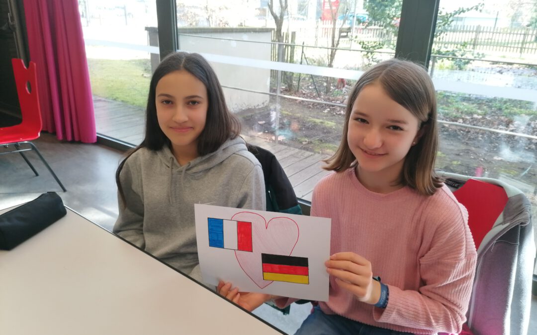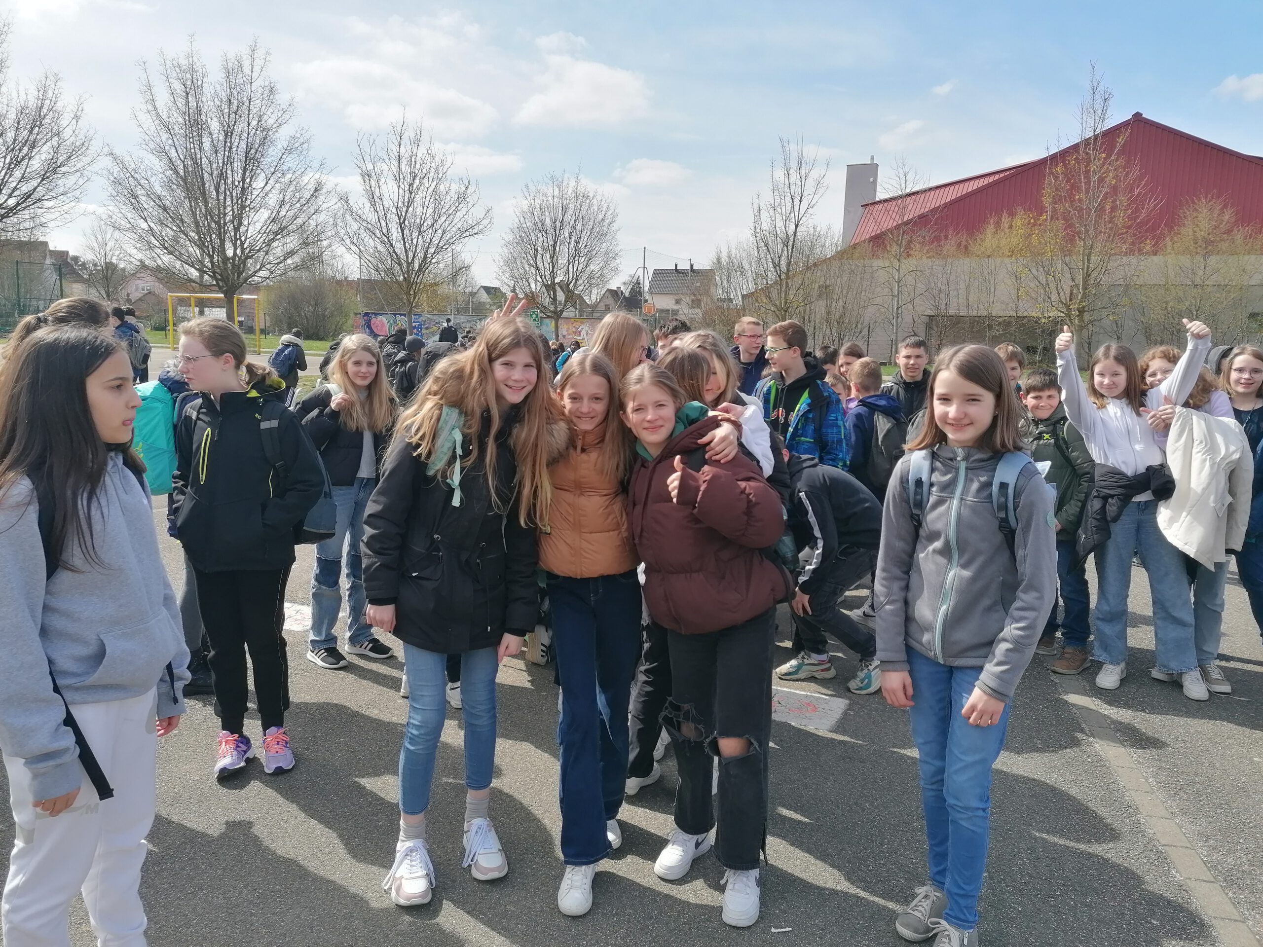 Am 28. März war es endlich so weit: 27 aufgeregte Sechst- und Siebtklässler stiegen pünktlich um 8.30 Uhr in den Bus, um ihre französischen Austauschpartner*innen in Drusenheim zu besuchen. Nachdem der Sicherheitsscheck beim Einlass der Schule vollzogen war, ging alles sehr schnell: In Gruppen eingeteilt warteten die Franzosen bereits auf ihre deutschen Freunde und da man sich ja vom Februarbesuch her kannte, konnten sich die Deutschen schnell und unkompliziert zu ihren jeweiligen Partnern gesellen und 8 gemischte Gruppen bilden. Eine von französischen Schülern geleitete Führung durch das Schulhaus war sehr interessant: So erfuhren die Deutschen zum Beispiel, was das CDI ist (eine Art Aufenthaltsraum zur Stillarbeit, ausgerüstet mit Computern und einer Bibliothek), dass die französischen Schüler zwar Klassenlehrer, aber kein eigenes Klassenzimmer haben und lernten die vielseitigen Aufgaben der „surveillants“ (Aufseher) kennen.