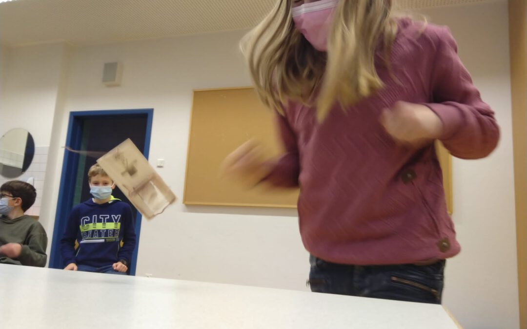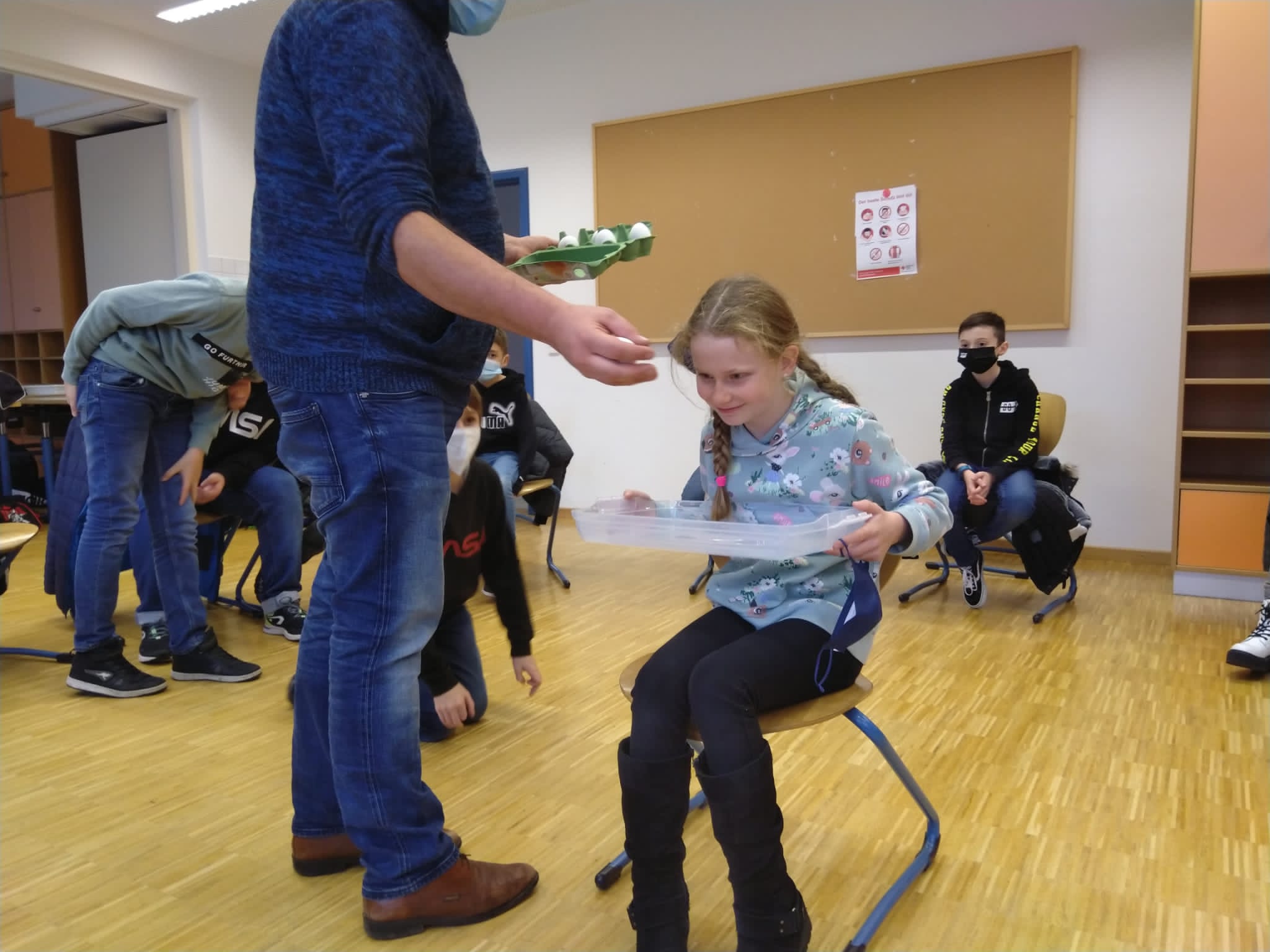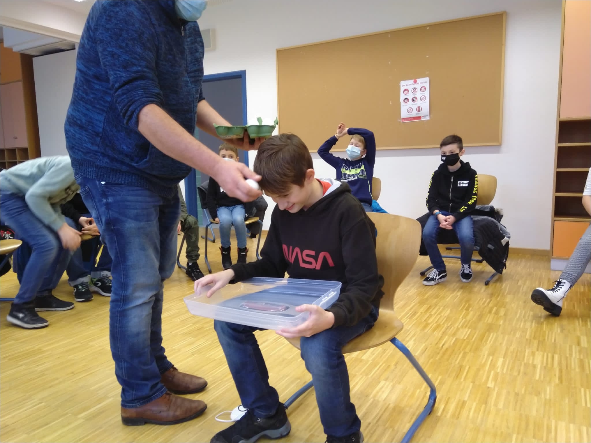 Die Schülerinnen und Schüler wagten sich an den Eier-Test. Hier wurde die große Frage: „Roh oder gekocht?“ durch das Aufschlagen an der Stirn herausgefunden. Nachdem die vier rohen Eier identifiziert waren, mussten wir in verschiedenen Kartons den Inhalt erfühlen. Die ersten Schülerinnen und Schüler (und auch Frau Buhlinger) stiegen bei Mutprobe Nummer drei, dem Verspeisen von zwei getrockneten Mehlwürmern, aus. Die Mutigsten der Klasse holten sich hierbei sogar Nachschub aus der Naschdose. Den Abschluss der Mutproben bildeten mehrere aufgestellte Mausefallen, die es blind und in Socken nicht auszulösen galt. Die Schülerinnen und Schüler, welche alle Mutproben bestanden hatten, durften sich auf Ü-Eier freuen, welche Herr Fritz bei einem nicht geplanten Großeinkauf besorgte.