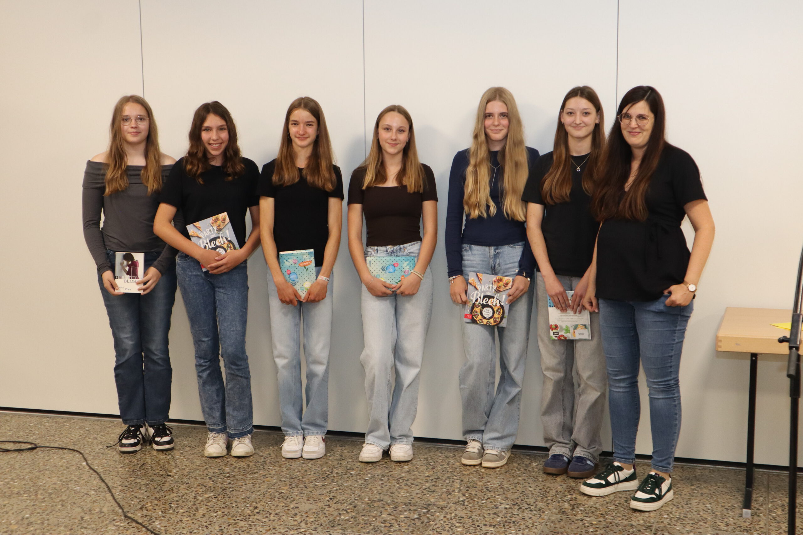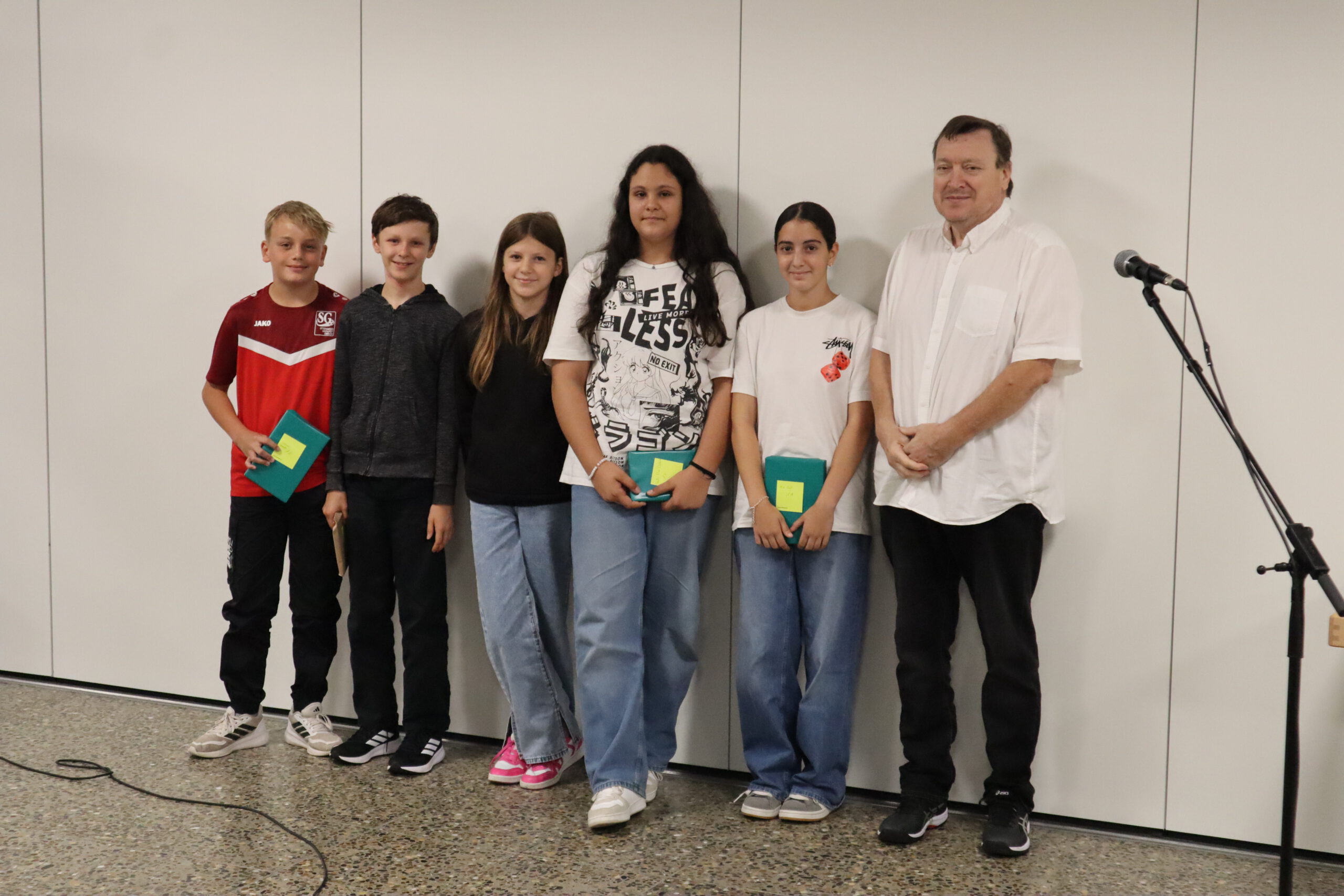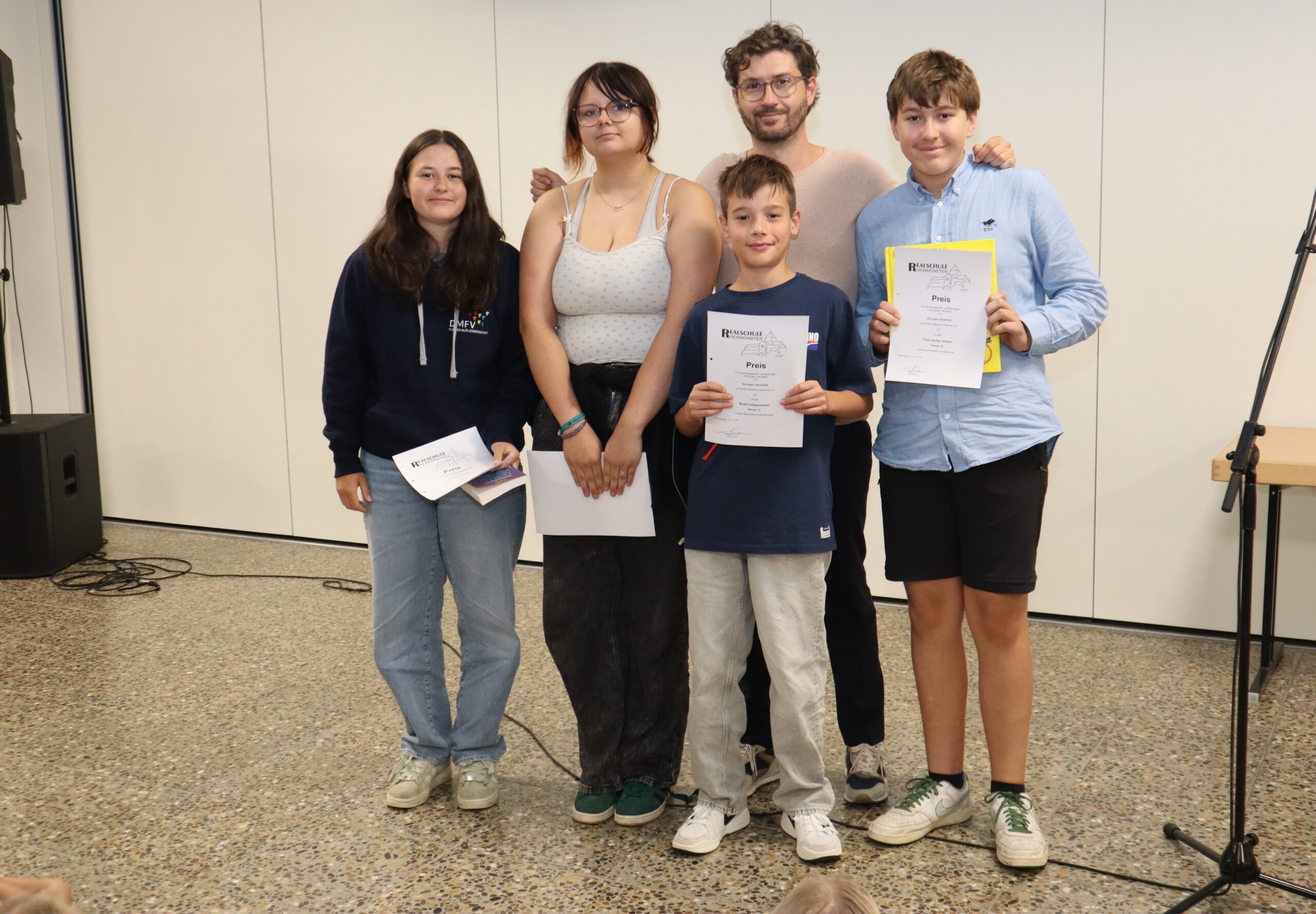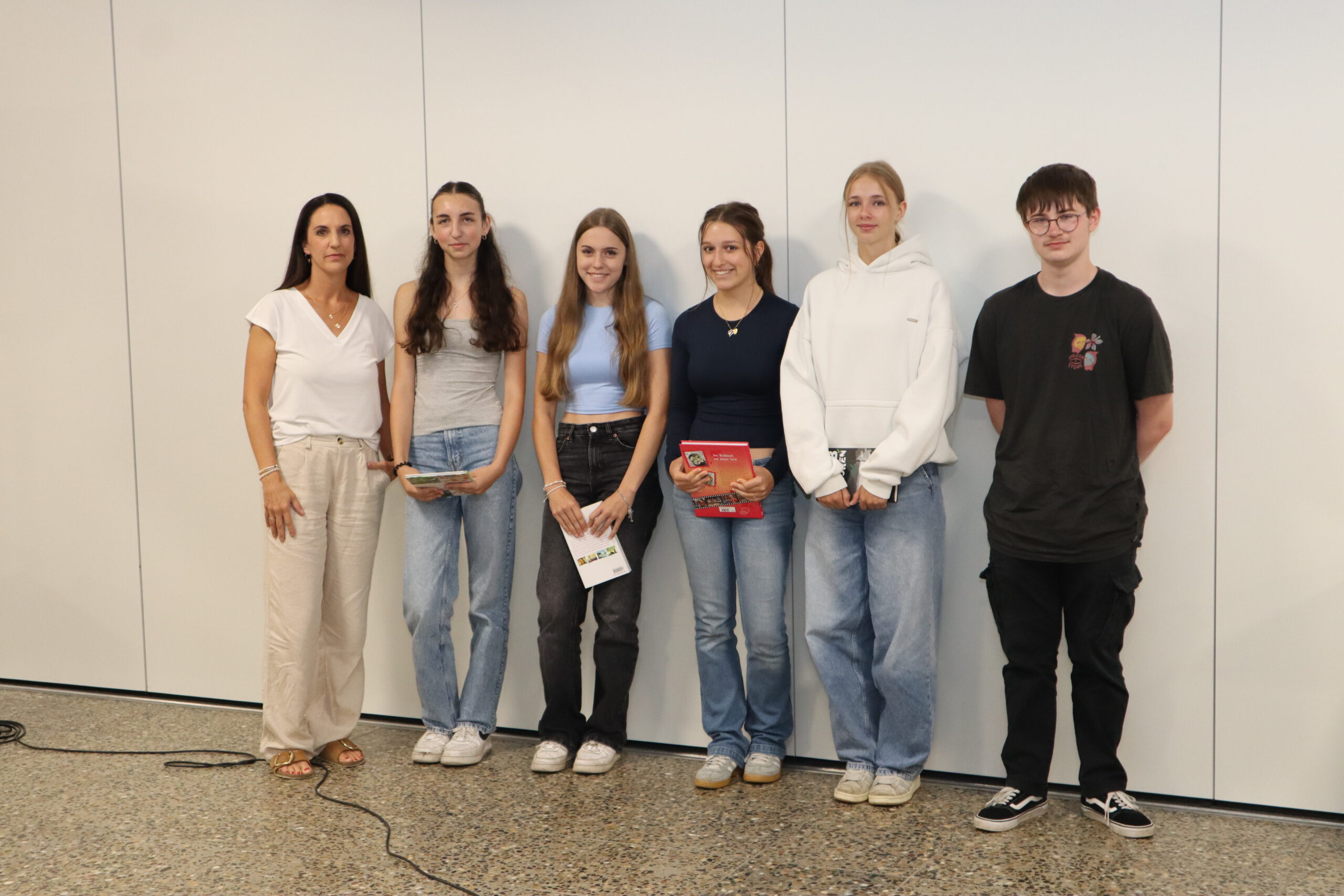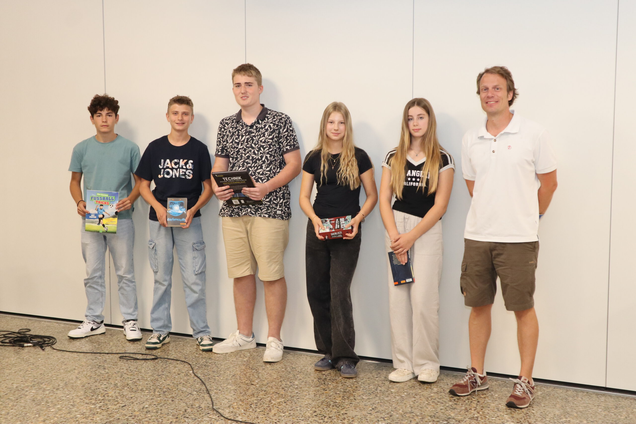 Die Sportlehrer Marco Kist und David Knobelspies ehrten die erfolgreichsten Athleten bei den Bundesjugendspielen, bevor Englischlehrer Thomas Herrmann den Absolventen der englischen Sprachprüfung PET (= Preliminary English Test der University of Cambridge) ihre Urkunden übergab. Diese Schüler, deren Prüfungsgebühr übrigens vom Förderkreis übernommen wurde, hatten im Mai samstags an einer mehrstündigen Fremdsprachenprüfung teilgenommen. Bestanden haben Lenny Bartsch, Bianca Satir, Lina Schneble, Mina Oeffinger, Kai Rath, Paul Munteanu und Tim Schumacher. Über das Erreichen des höchstmöglichen Sprach-Niveaus in dieser Prüfung dürfen sich Felicia Lindner, Kira Lusch, Maya Decker, Leon Wann sowie Joséphine Tsikras freuen. Letztere schloss die PET-Prüfung sogar als Beste aller 96 Prüfungsteilnehmer im Landkreis Rastatt ab. Wir sind stolz auf dich, Joséphine!