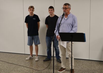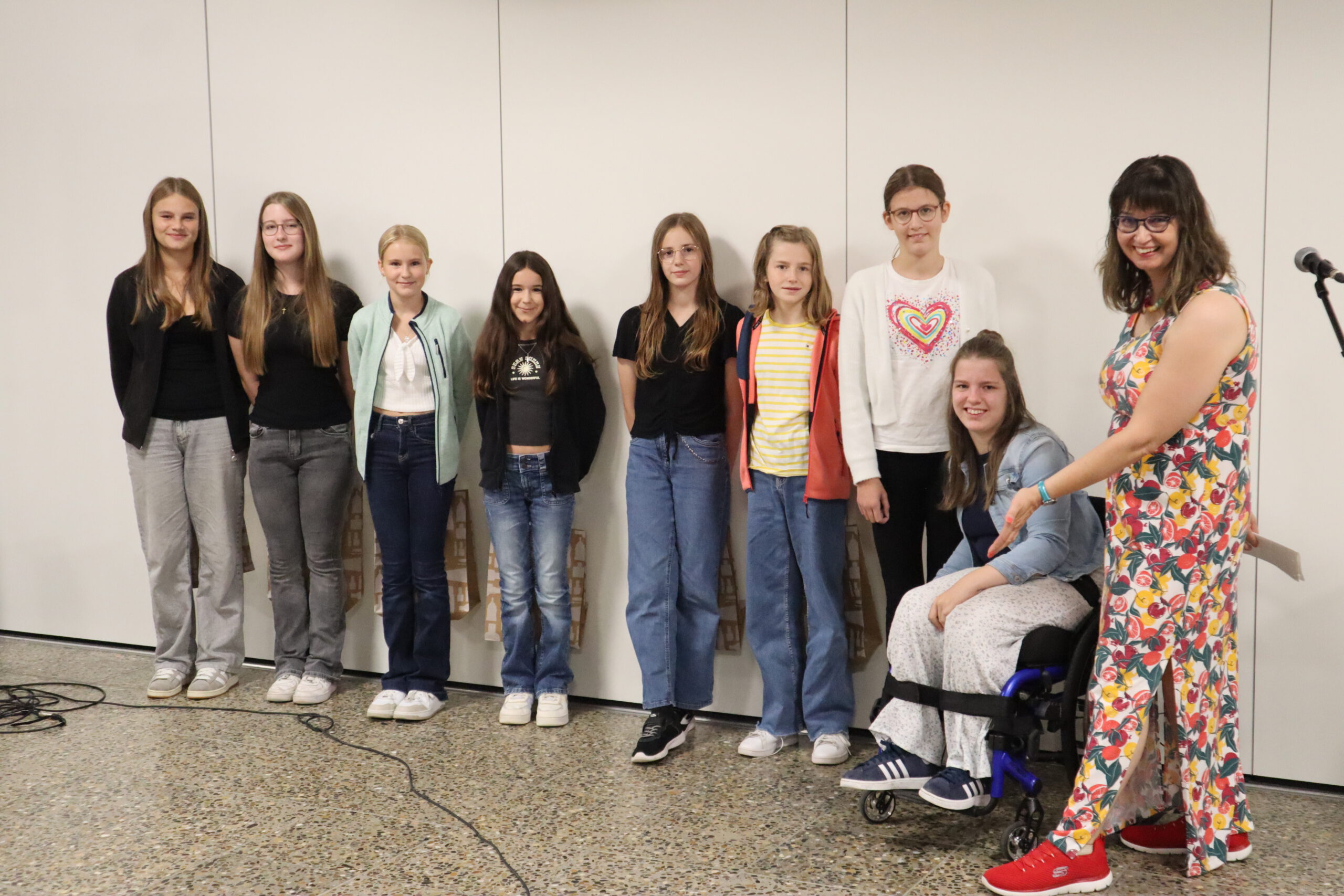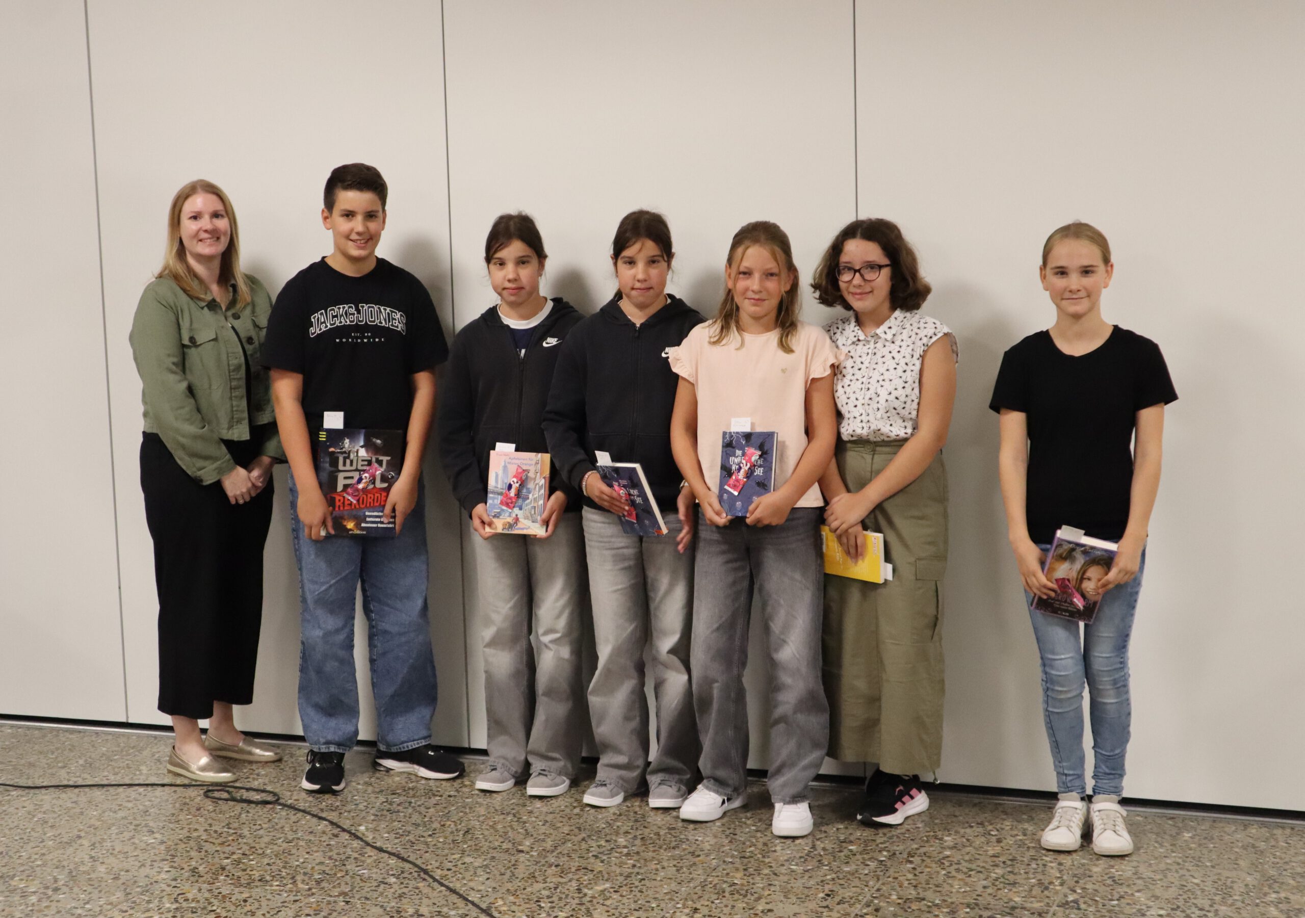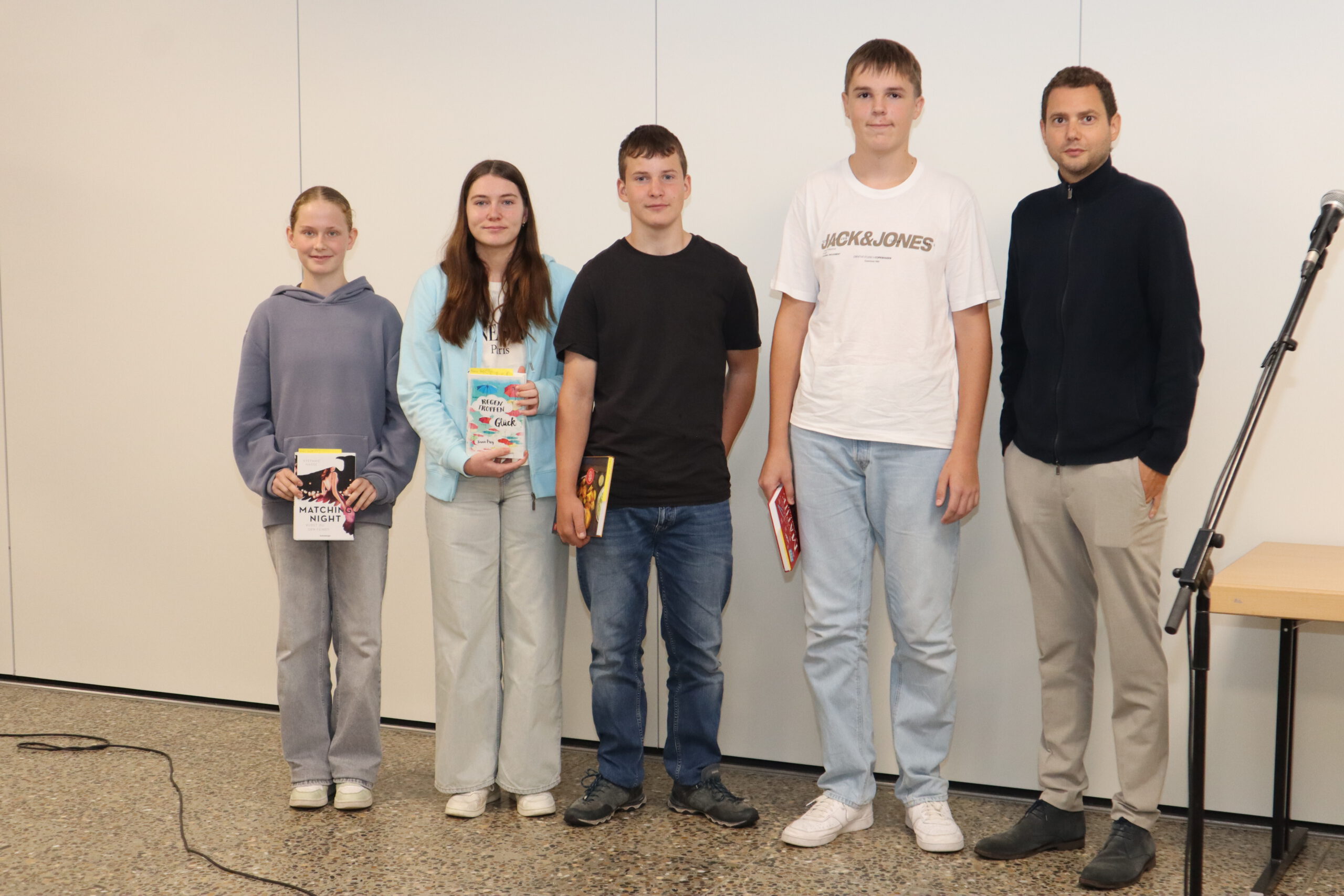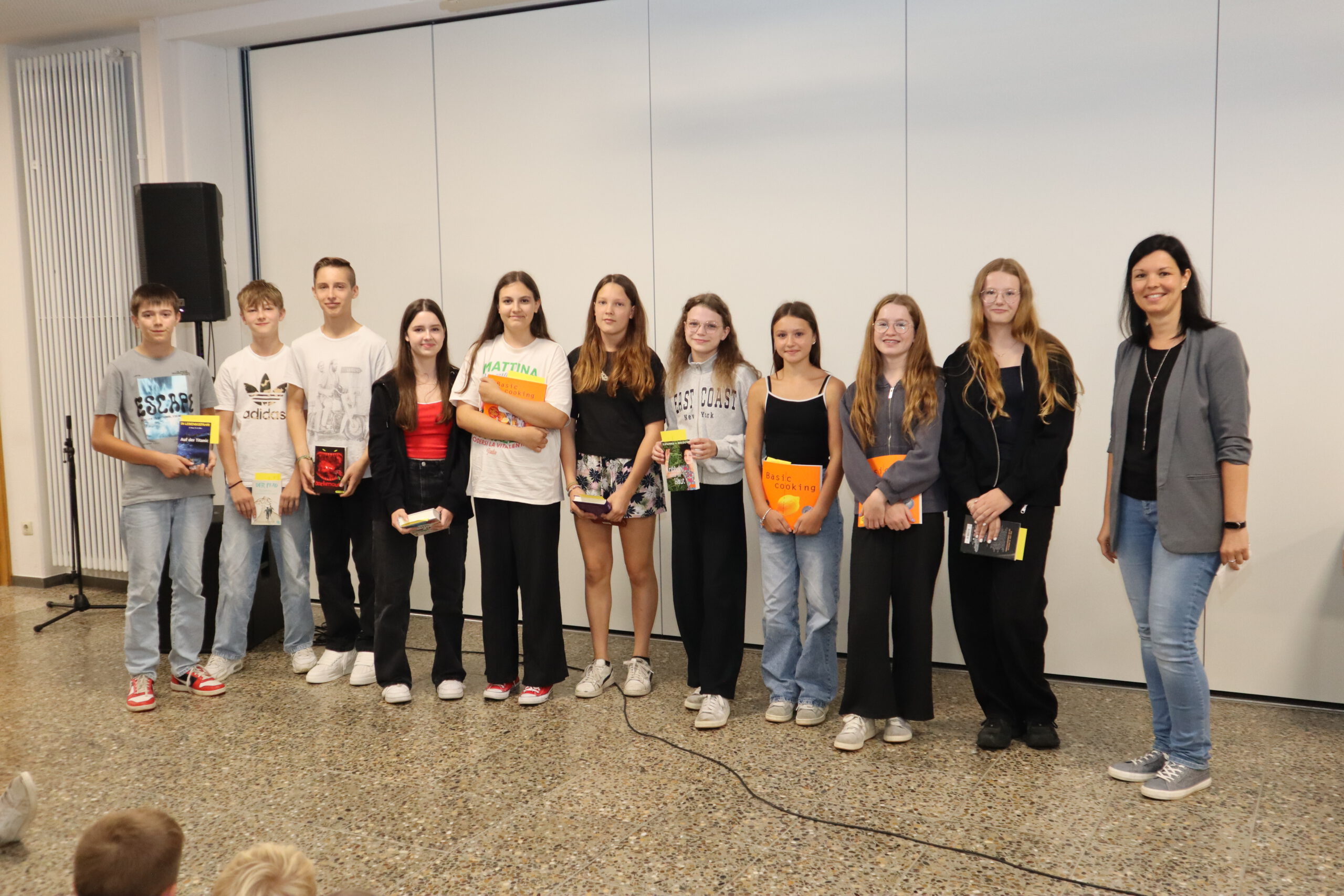 Die Sportlehrer Marco Kist und David Knobelspies ehrten die erfolgreichsten Athleten bei den Bundesjugendspielen, bevor Englischlehrer Thomas Herrmann den Absolventen der englischen Sprachprüfung PET (= Preliminary English Test der University of Cambridge) ihre Urkunden übergab. Diese Schüler, deren Prüfungsgebühr übrigens vom Förderkreis übernommen wurde, hatten im Mai samstags an einer mehrstündigen Fremdsprachenprüfung teilgenommen. Bestanden haben Lenny Bartsch, Bianca Satir, Lina Schneble, Mina Oeffinger, Kai Rath, Paul Munteanu und Tim Schumacher. Über das Erreichen des höchstmöglichen Sprach-Niveaus in dieser Prüfung dürfen sich Felicia Lindner, Kira Lusch, Maya Decker, Leon Wann sowie Joséphine Tsikras freuen. Letztere schloss die PET-Prüfung sogar als Beste aller 96 Prüfungsteilnehmer im Landkreis Rastatt ab. Wir sind stolz auf dich, Joséphine!