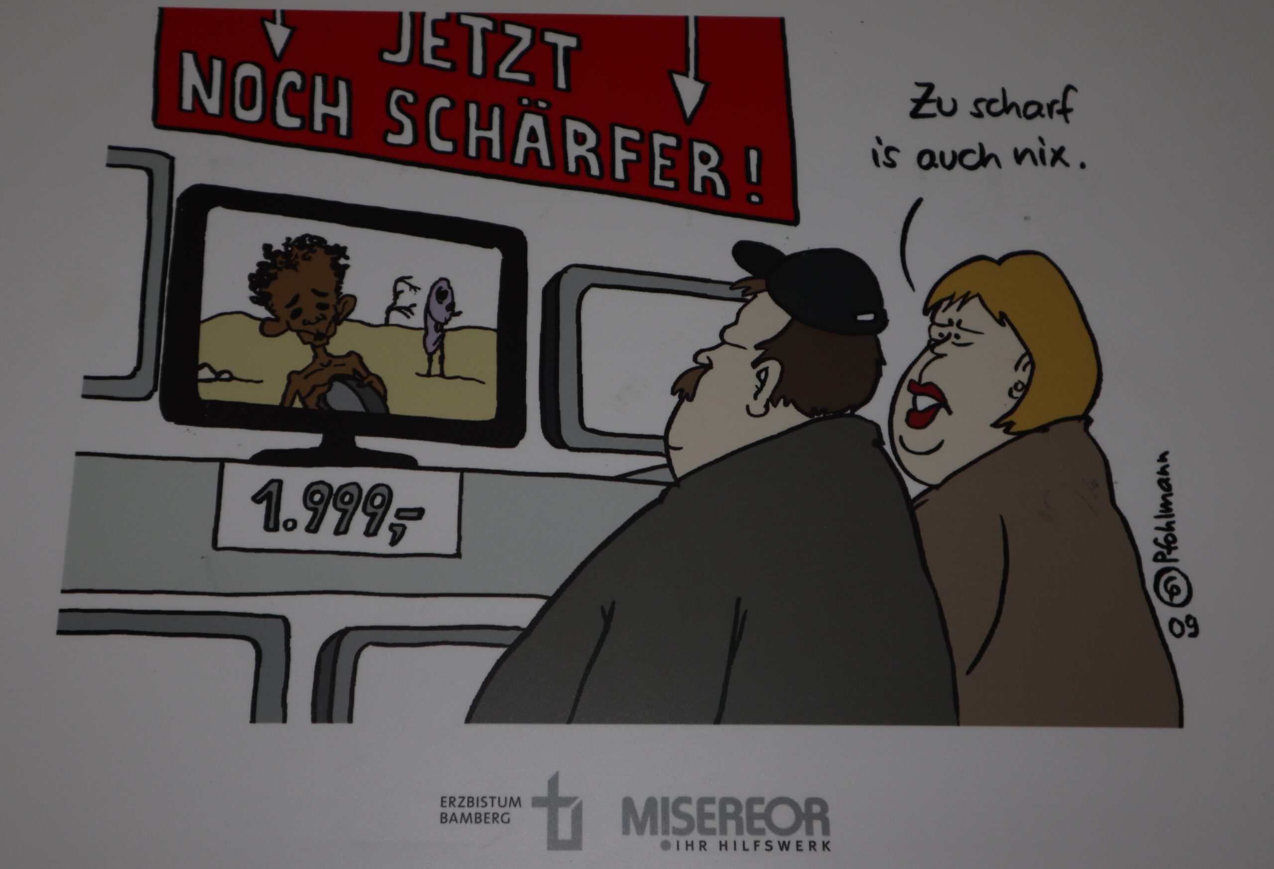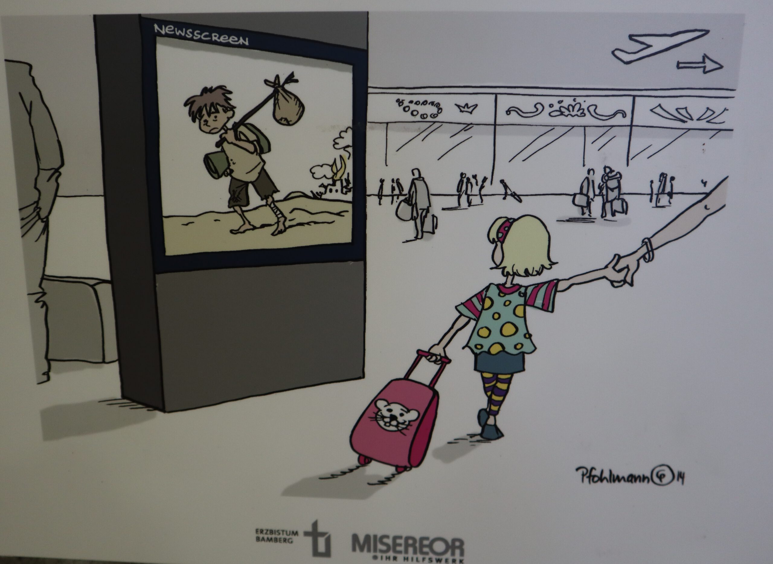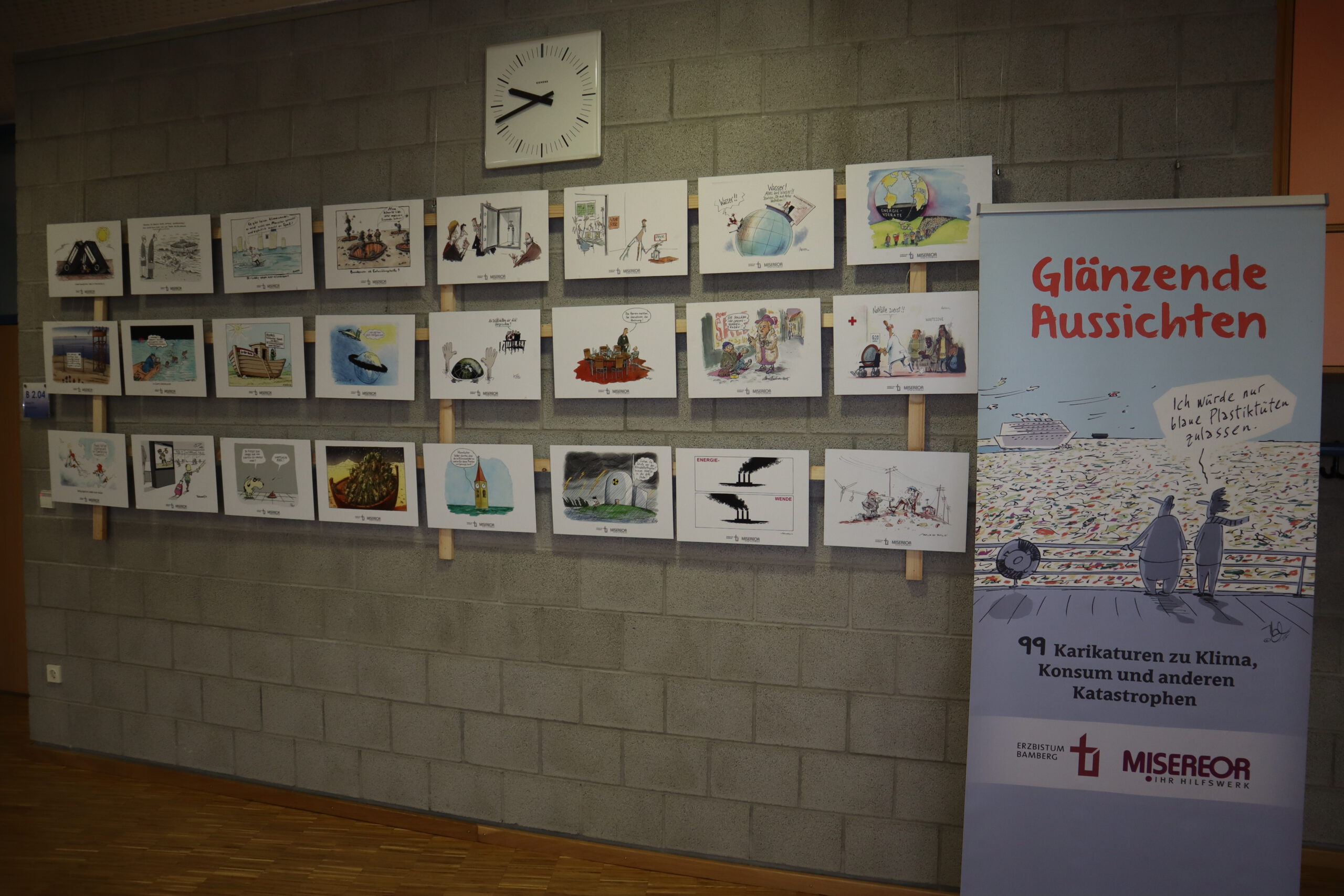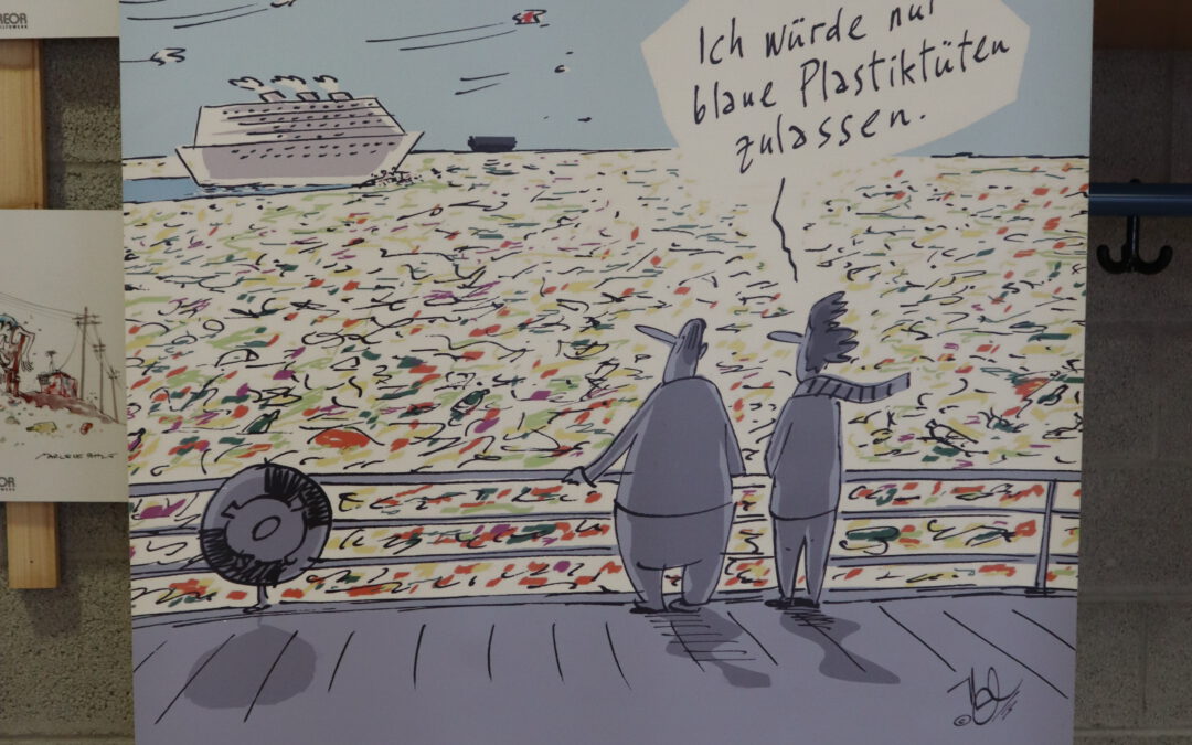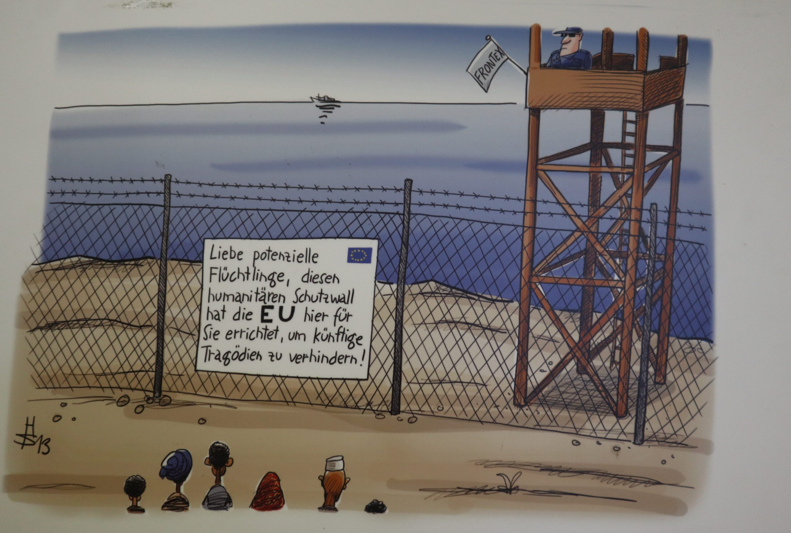 An den Wänden im B-Bau beleuchten die Karikaturen die dunklen Seiten des westlichen Lebensstils und konfrontieren den Betrachter mit den Zusammenhängen zwischen Weltpolitik und dem individuellen Verhalten von uns allen. Auf witzige, verblüffende, teils aber auch erschreckende Weise zeigen die Zeichnungen Abgründe und Widersprüchlichkeiten menschlichen Verhaltens, beispielsweise mit Blick auf die Flüchtlingskrise: Einerseits fordert die EU im Ausland Menschenrechte ein, andererseits schottet sich Europa zunehmend gegen Flüchtlinge ab. Auf einer der Karikaturen sitzt ein europäischer Grenzschutzpolizist auf seinem Boot im Mittelmeer und tippt in seinen Laptop. „Wohnort? Beruf? Alter?“, fragt er die in Richtung seines Bootes schwimmenden Flüchtlinge noch kurz vor dem Ertrinken. Auf einer anderen Zeichnung fragt eine Großmutter ihren Enkel vor dem Schaufenster des Spielwarengeschäfts: „Warum weinst du, mein Kleiner?“ Die Antwort des Kindes kommt prompt: „Ich hab das alles schon!“