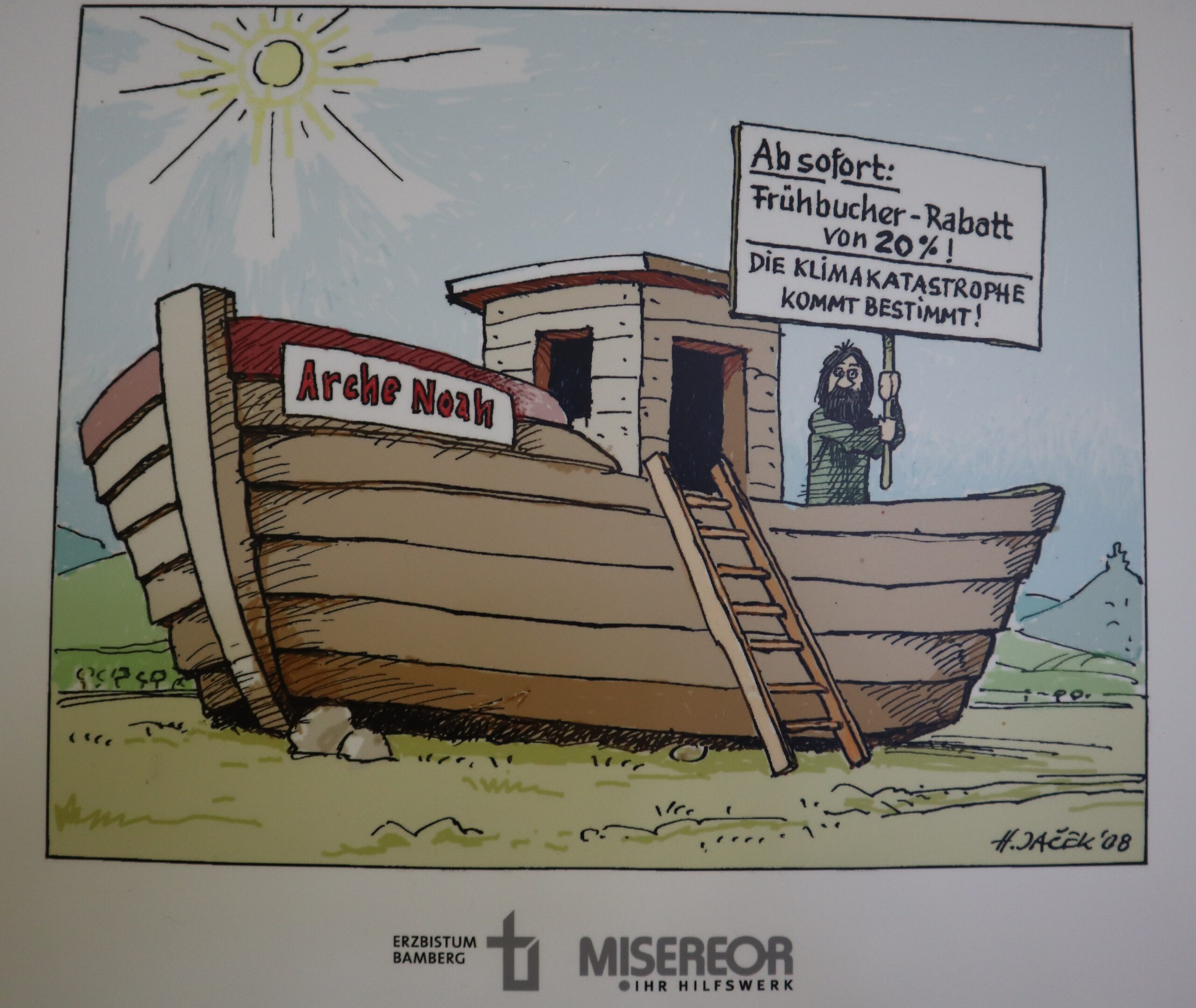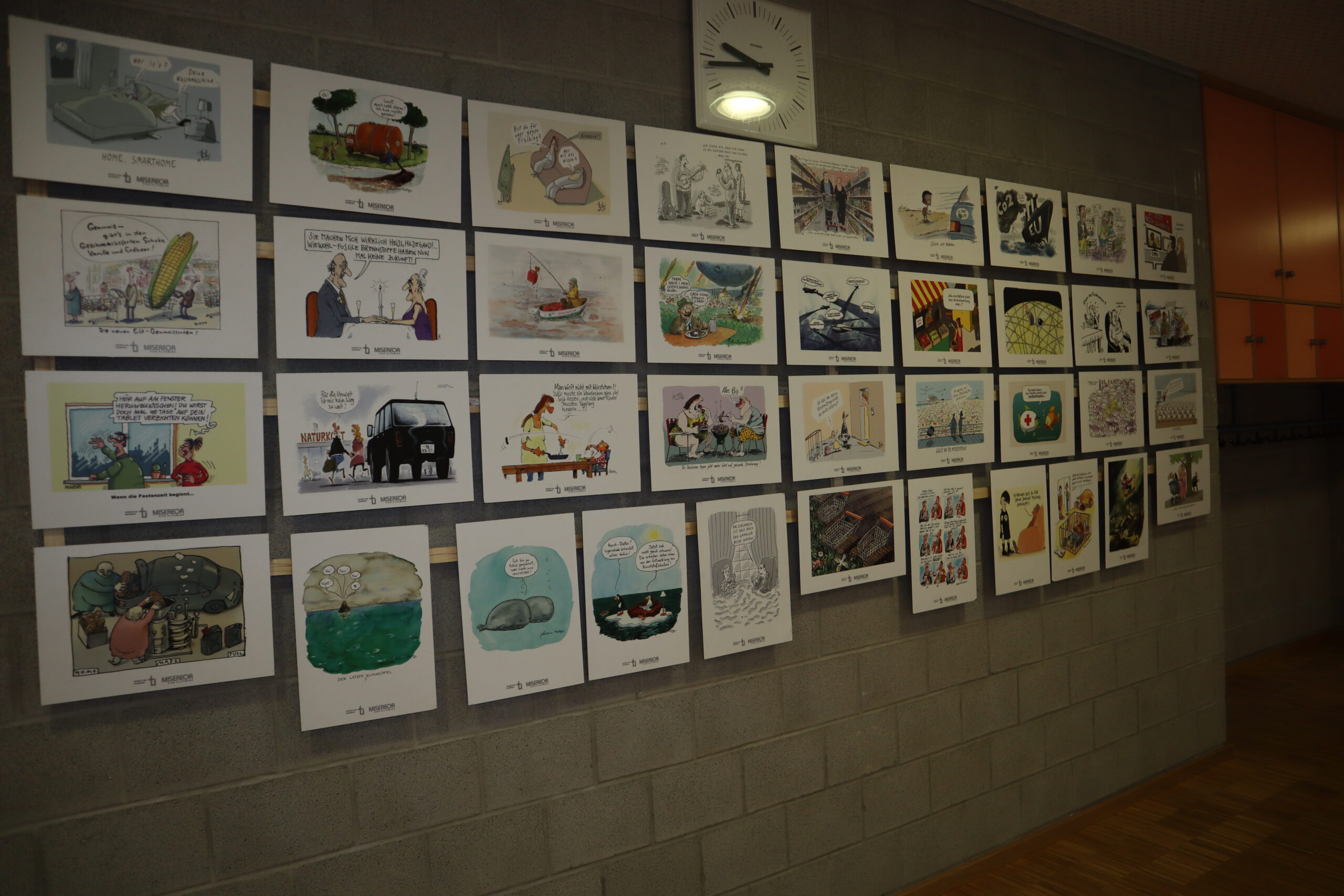 Es sind Perspektiven wie diese, die einen zum schmunzelnden Kopfschütteln, aber schließlich auch zur Selbstreflexion veranlassen. „Manchmal versteht man die Botschaft sofort und muss lachen“, sagt einer der Schwarzacher Schüler. Längst nicht alle Karikaturen werden von den Jugendlichen sofort verstanden, aber dazu gibt es noch Gelegenheit: Die Ausstellung wird in den Klassenstufen 8-10 in den Unterricht integriert und altersgemäß aufbereitet. Mithilfe so genannter „Factsheets“ können sich die Schüler in Gruppen mit den dargestellten Themen wie Flucht, Fleischkonsum, Hunger, Klimawandel und Konsumverhalten informieren und sich anschließend kreativ und die eigenen Einflussmöglichkeiten erhellend damit auseinandersetzen. „Unser Ziel ist es, mehr Bewusstsein für das eigene Verhalten, den Konsum, die Lebensweise und deren Auswirkungen auf die Welt zu schaffen“, führt Schulleiter Rolf Schemel aus. „Schulen haben hier eine Art Schlüsselposition, um künftigen Generationen die notwendige Urteils- und Handlungskompetenz mitzugeben.“ Zur Verfügung gestellt wird die Karikaturenausstellung von MISEREOR, dem Entwicklungshilfswerk der katholischen Kirche.