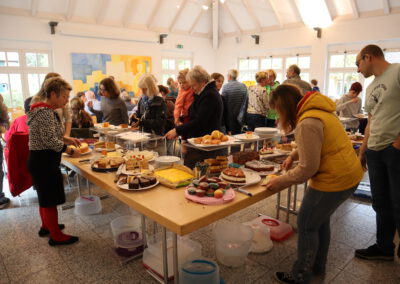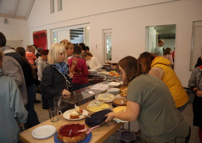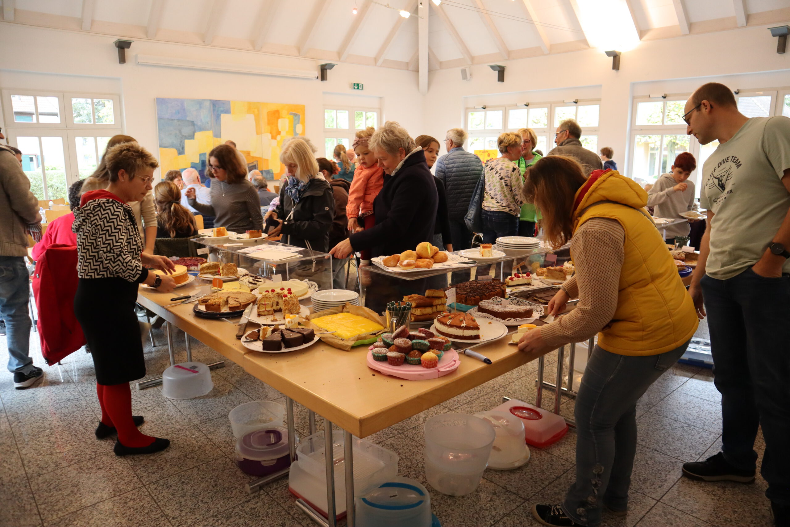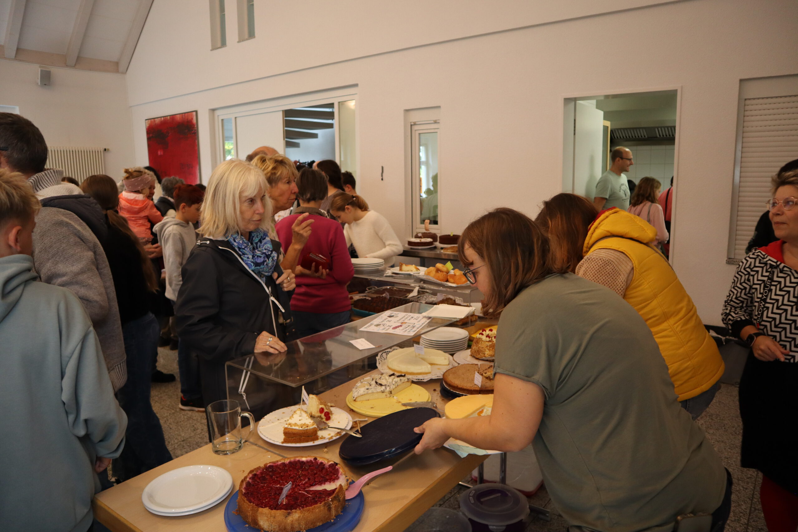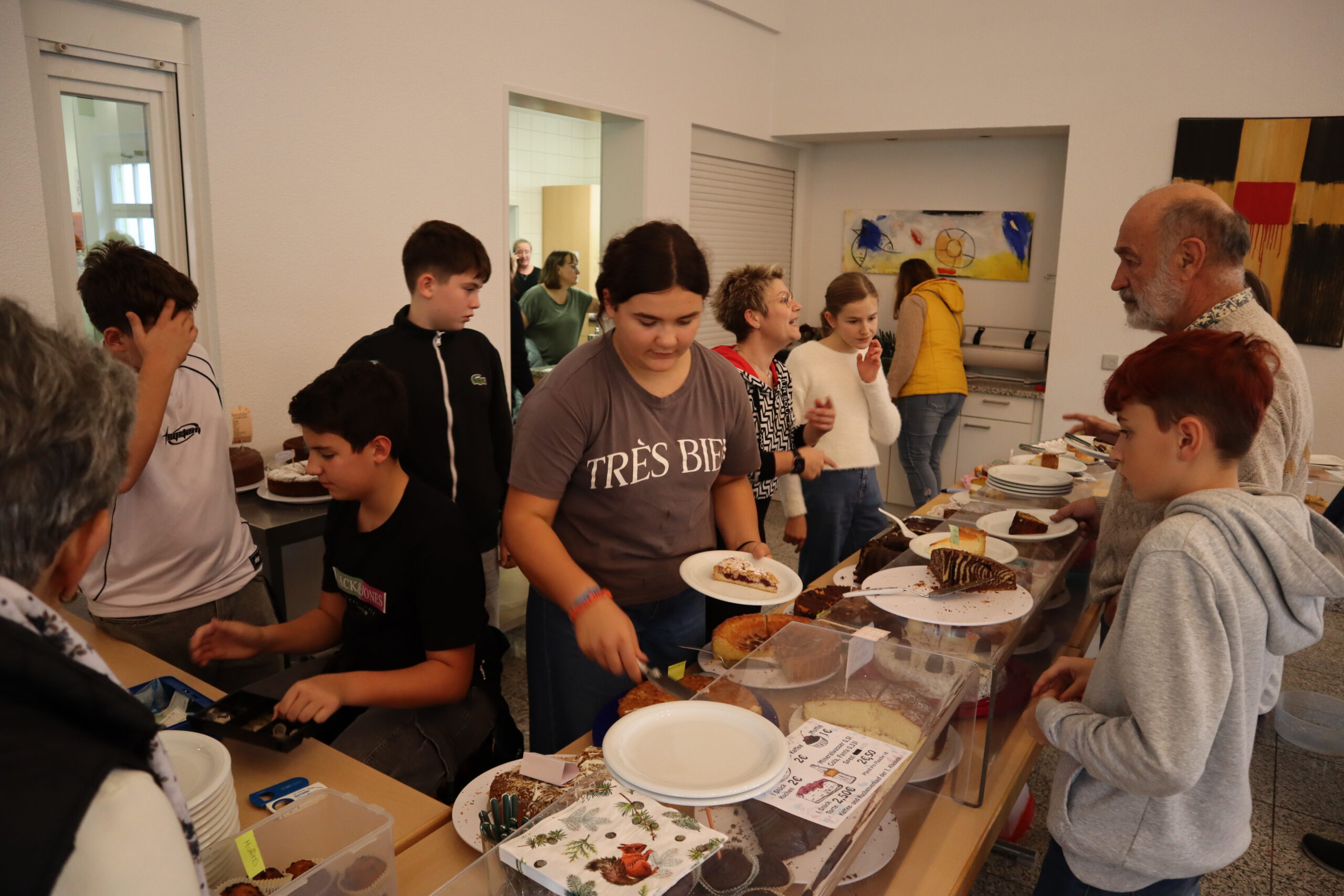 Zahlreiche Besucherinnen und Besucher nutzten das Angebot, um bei einer Tasse Kaffee und einem Stück Kuchen gemütlich beisammenzusitzen. Viele Gäste ließen sich außerdem Kuchenstücke für zuhause verpacken und mitgeben. Der Erlös kommt den Klassenkassen der drei 7. Klassen zugute und wird für Ausflüge und Klassenfahrten verwendet.