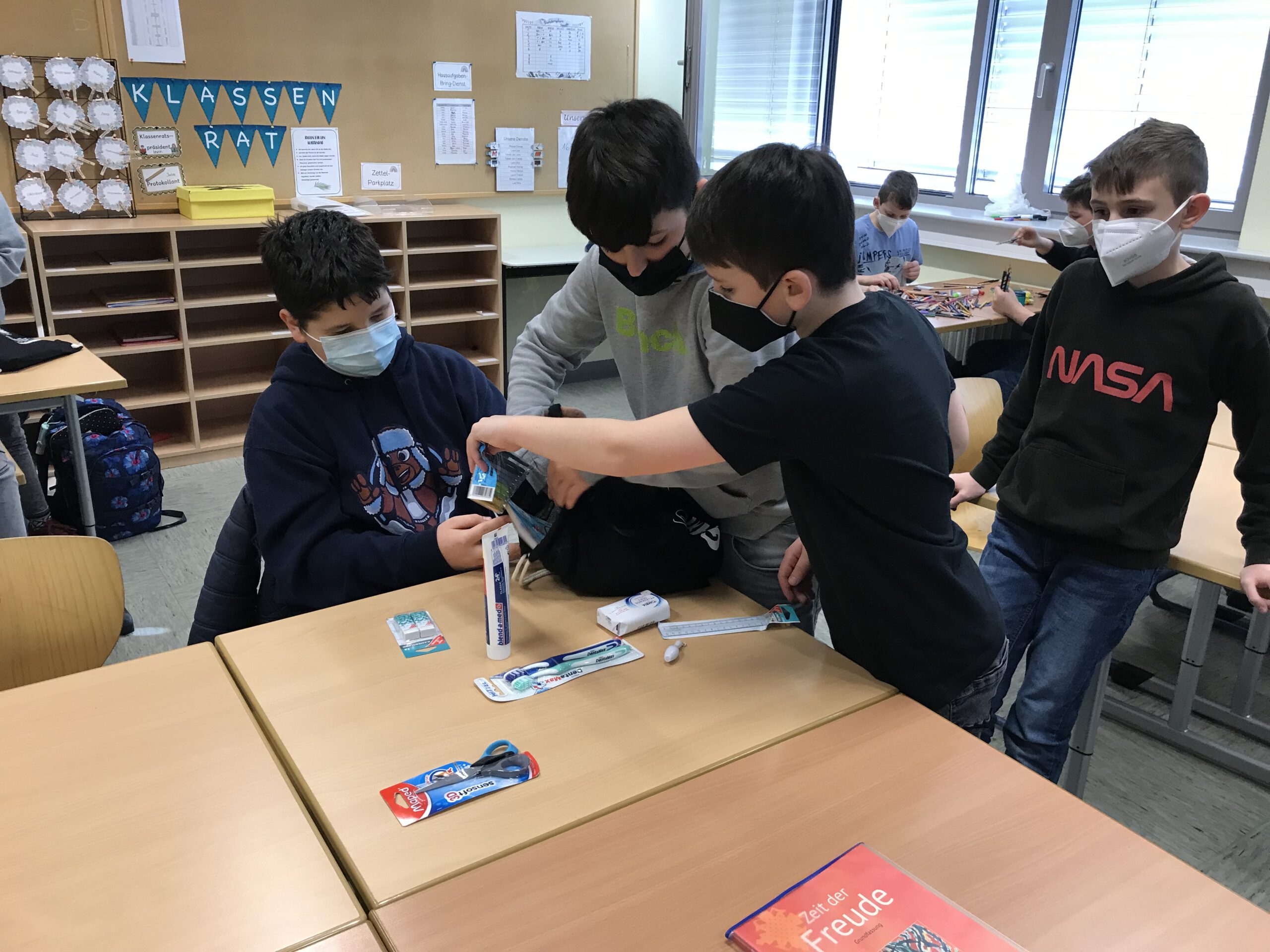 Die Packliste war schnell gefunden und so wurden Stifte, Blöcke, Spitzer, Radierer, Hefte, Seifen, Zahnbürsten, Zahnpasta,  Pullis, Kaugummis und einiges mehr über Wochen hinweg mit in den Reliunterricht gebracht und gesammelt.