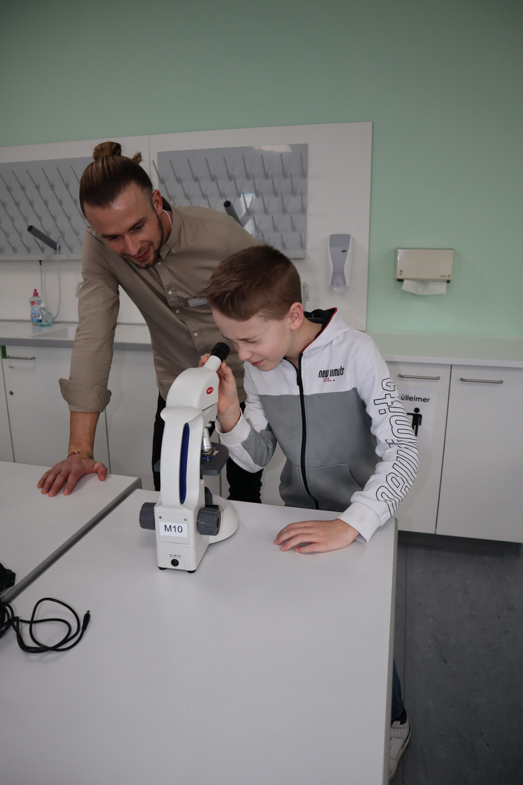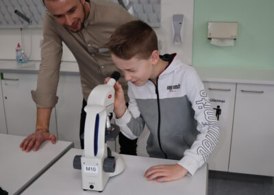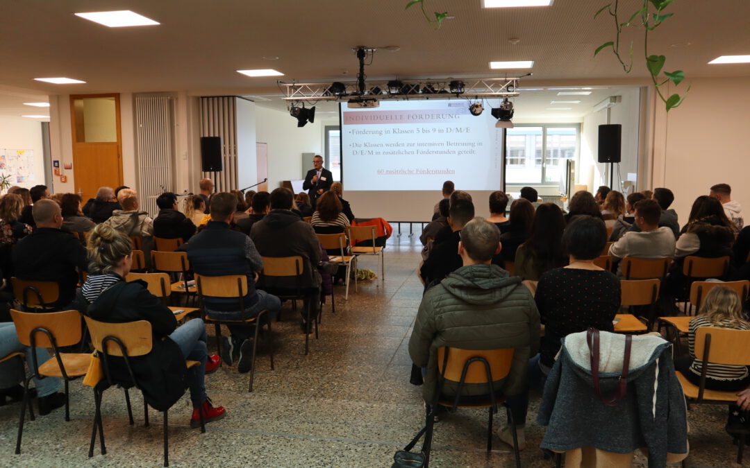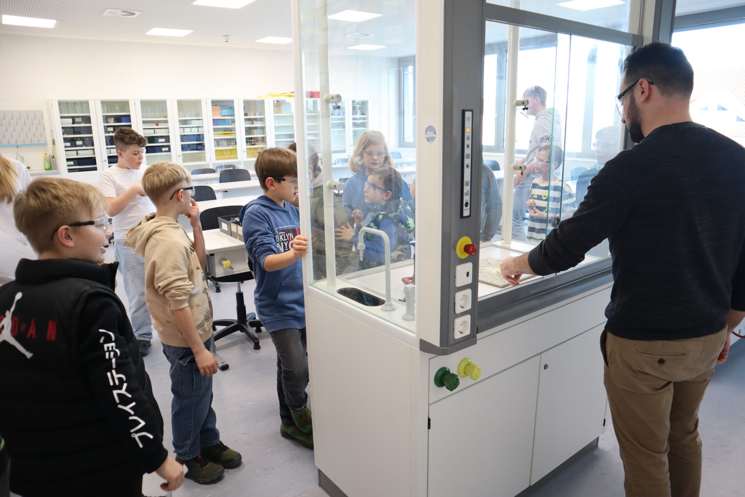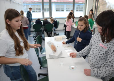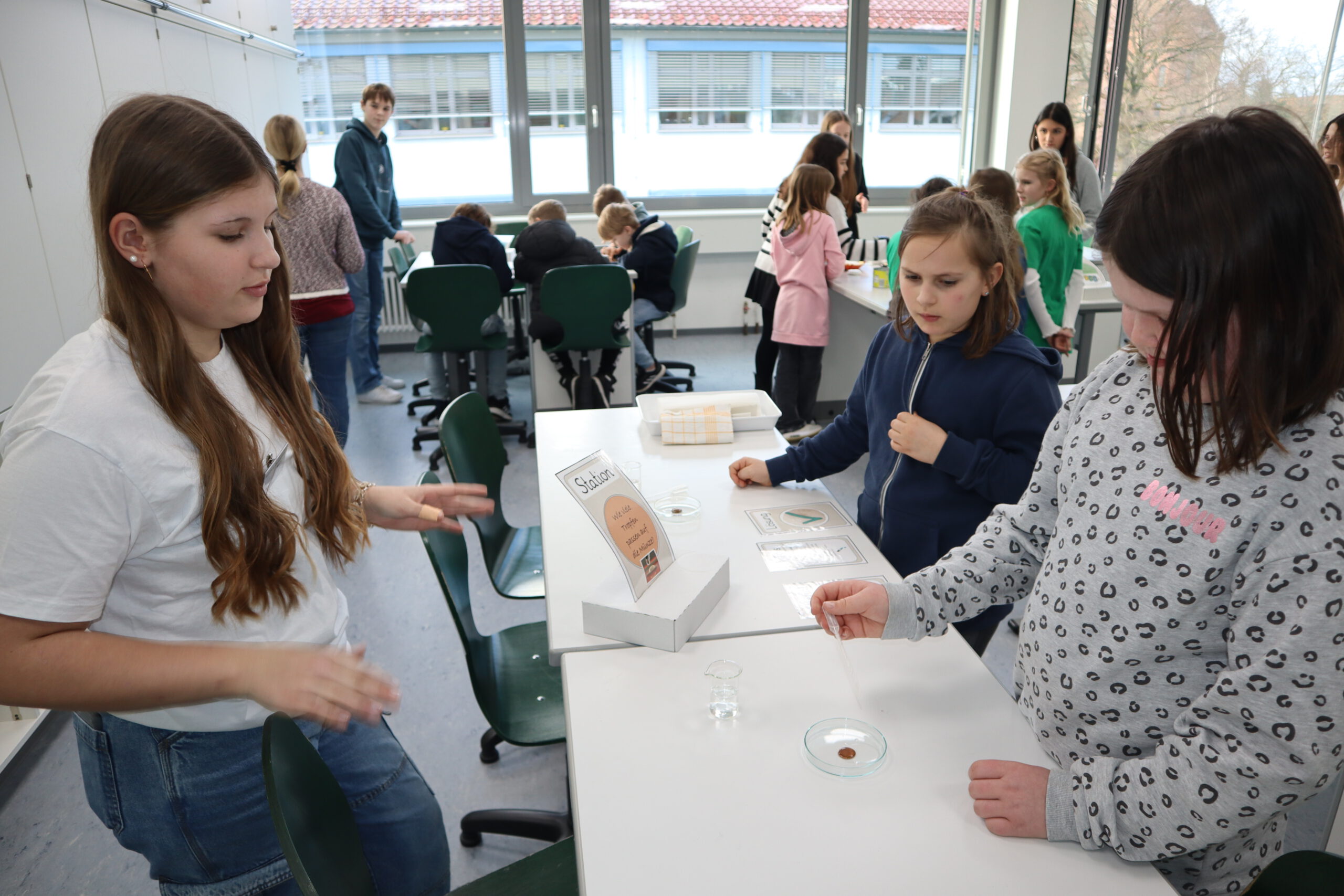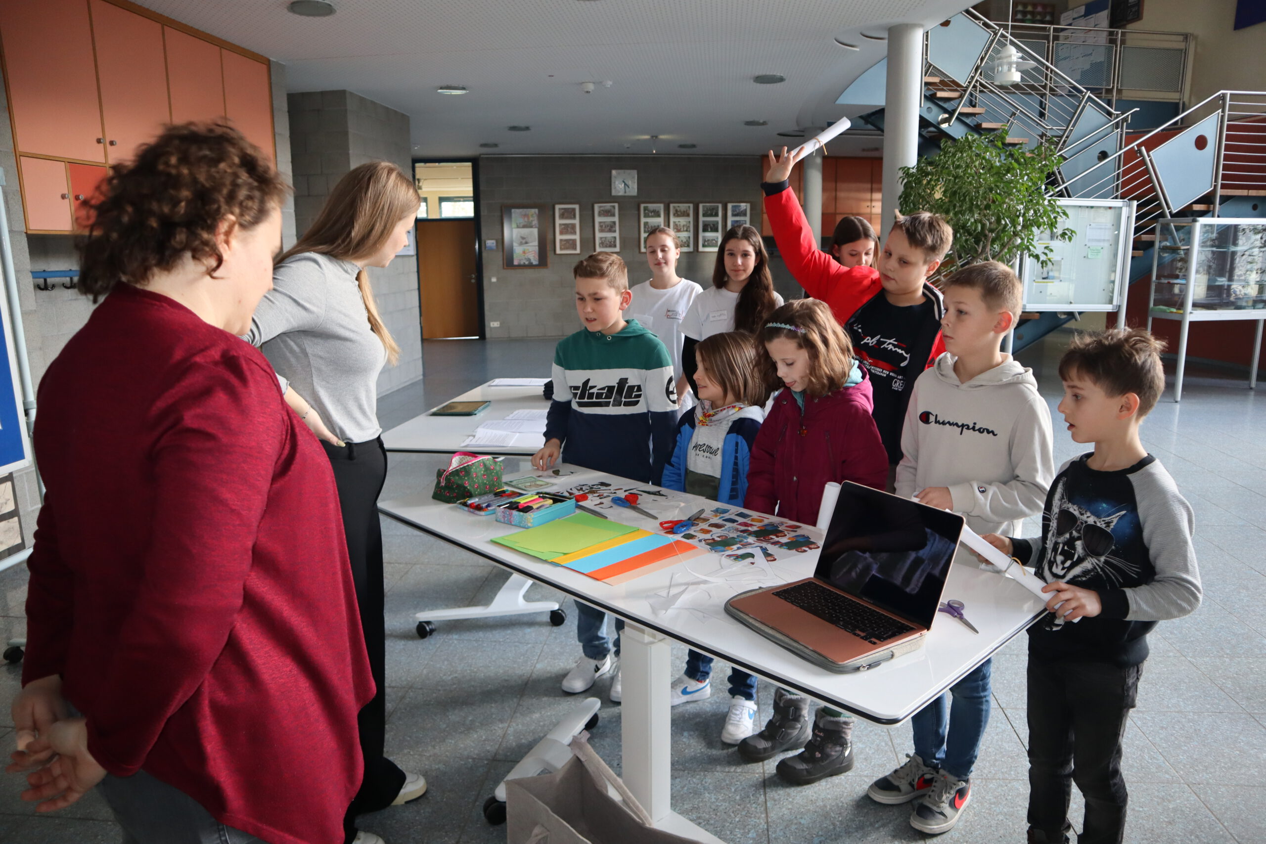 Am Freitag, 23. Februar 2024 öffnete die Realschule Rheinmünster von 16 – 18 Uhr ihre Türen für interessierte Viertklässler und deren Eltern, für die im März die Schulwahlentscheidung ansteht. Nach einer musikalischen Begrüßung durch die Bläserklasse 5b startete das eigentliche Informationsprogramm für Eltern und Kinder auf zweigeteilte Weise: Während die Eltern bei einem Vortrag der Schulleitung vieles über die Schulart Realschule allgemein und über die Besonderheiten der Realschule Rheinmünster erfuhren, wurden die Viertklässler von den Schulsanitätern in Obhut genommen und begaben sich mit diesen in Kleingruppen auf eine Schulhaus-Rallye. Dabei konnten sie die neuen Fachräume in Chemie, Biologie und Physik in Augenschein nehmen und auch selbst Experimente durchführen. Manch einer blickte zum ersten Mal durch ein Mikroskop und war verblüfft über das Aussehen einer Kreuzspinne oder einer Blattlaus unter dem Vergrößerungsgerät. Im Bio-Saal gab es außerdem Versuche zur Oberflächenspannung von Wasser und Zuordnungsübungen zu Körperorganen und Wirbeltierklassen. Im Technik-Raum gab es den 3D-Drucker in Aktion zu beobachten sowie von Schülern verschiedener Klassenstufen angefertigte Werkstücke zu bewundern. Für Staunen sorgten die Vorführungen der Roboter-AG im Obergeschoss des A-Baus und in der modernen Schulküche konnte man schätzen, wie viele Zuckerwürfel in einem Joghurtdrink oder in einem Schokoriegel enthalten sind. Auch dass Rhabarber ein Gemüse und Avocados eine Obstsorte sind, konnte man dort erfahren. Bei den Referendarinnen Frau Heering und Frau Kirchhofer konnten die jungen Besucher an i-Pads selbst kurze Erklärvideos filmen und im Französisch-Raum bei Frau Israel drehte sich alles um unser Nachbarland Frankreich und die französische Sprache.