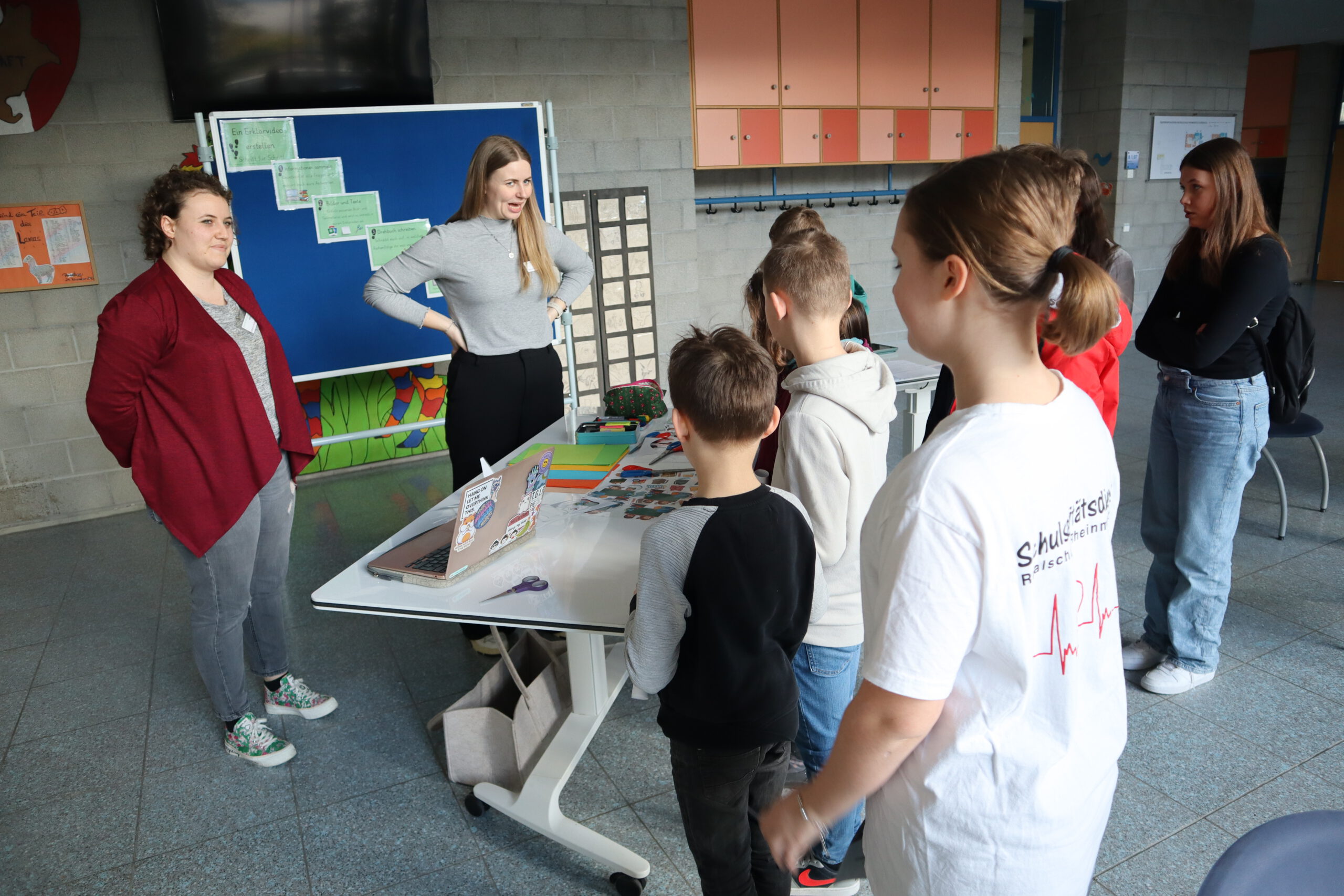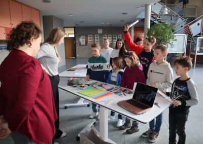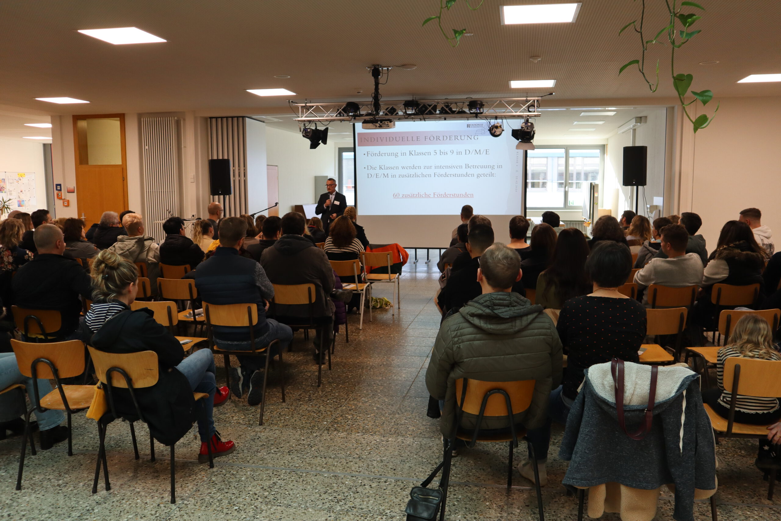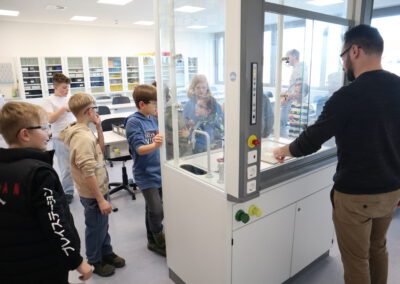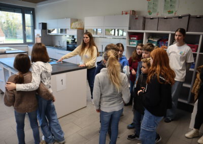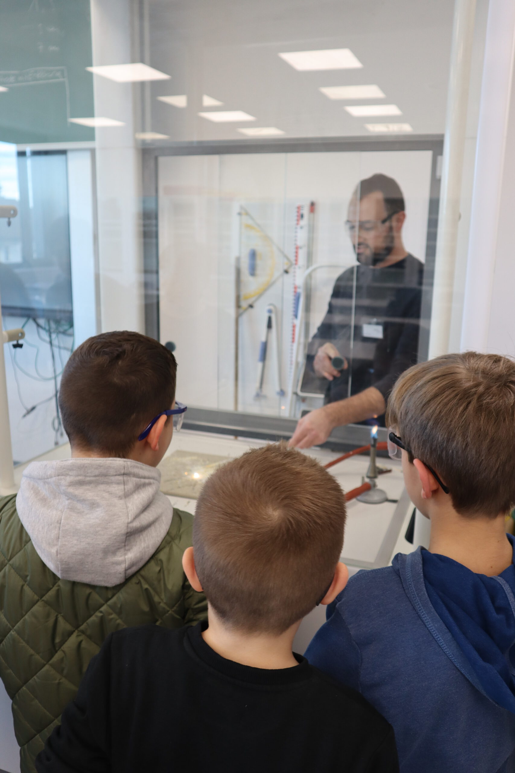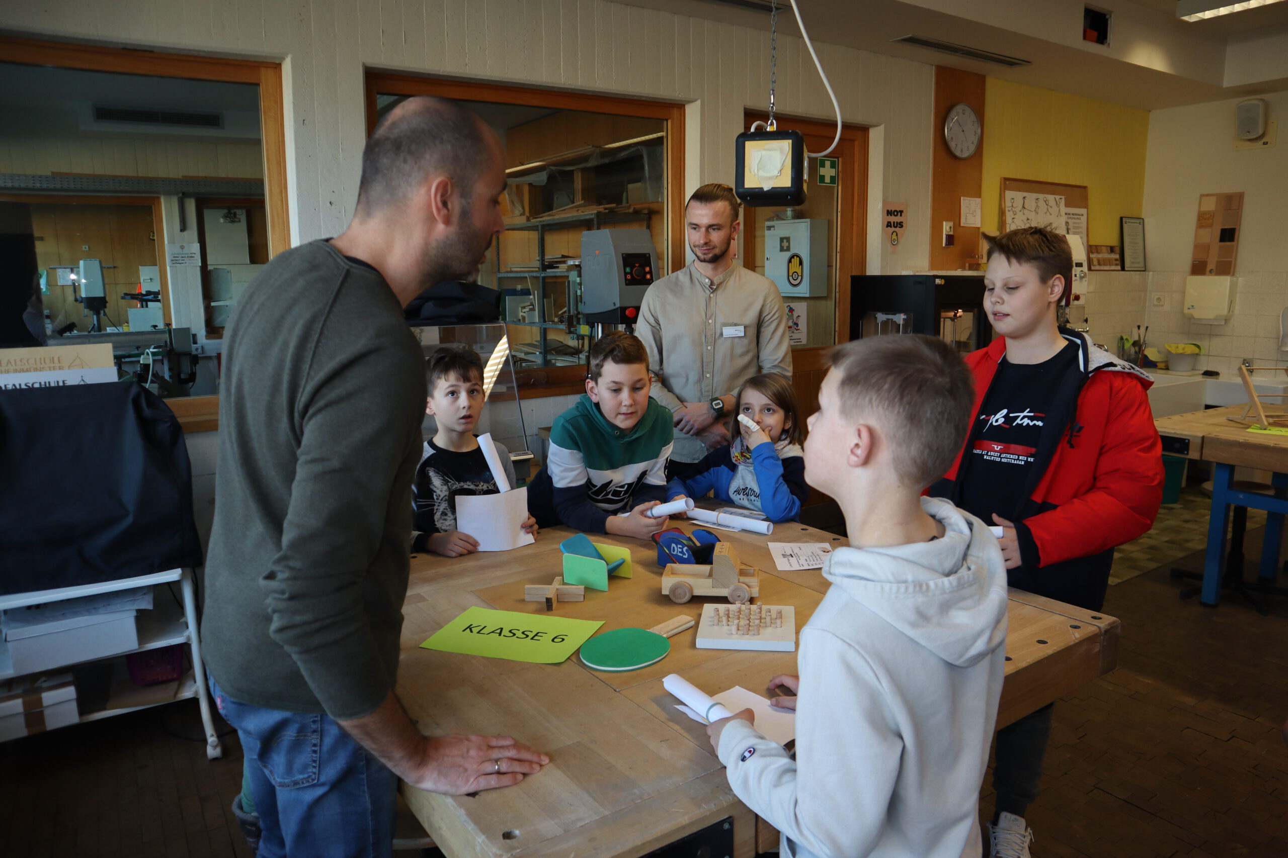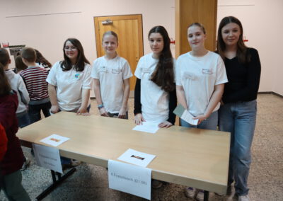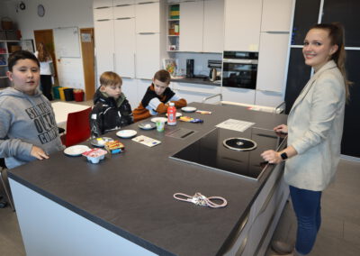 Am Freitag, 23. Februar 2024 öffnete die Realschule Rheinmünster von 16 – 18 Uhr ihre Türen für interessierte Viertklässler und deren Eltern, für die im März die Schulwahlentscheidung ansteht. Nach einer musikalischen Begrüßung durch die Bläserklasse 5b startete das eigentliche Informationsprogramm für Eltern und Kinder auf zweigeteilte Weise: Während die Eltern bei einem Vortrag der Schulleitung vieles über die Schulart Realschule allgemein und über die Besonderheiten der Realschule Rheinmünster erfuhren, wurden die Viertklässler von den Schulsanitätern in Obhut genommen und begaben sich mit diesen in Kleingruppen auf eine Schulhaus-Rallye. Dabei konnten sie die neuen Fachräume in Chemie, Biologie und Physik in Augenschein nehmen und auch selbst Experimente durchführen. Manch einer blickte zum ersten Mal durch ein Mikroskop und war verblüfft über das Aussehen einer Kreuzspinne oder einer Blattlaus unter dem Vergrößerungsgerät. Im Bio-Saal gab es außerdem Versuche zur Oberflächenspannung von Wasser und Zuordnungsübungen zu Körperorganen und Wirbeltierklassen. Im Technik-Raum gab es den 3D-Drucker in Aktion zu beobachten sowie von Schülern verschiedener Klassenstufen angefertigte Werkstücke zu bewundern. Für Staunen sorgten die Vorführungen der Roboter-AG im Obergeschoss des A-Baus und in der modernen Schulküche konnte man schätzen, wie viele Zuckerwürfel in einem Joghurtdrink oder in einem Schokoriegel enthalten sind. Auch dass Rhabarber ein Gemüse und Avocados eine Obstsorte sind, konnte man dort erfahren. Bei den Referendarinnen Frau Heering und Frau Kirchhofer konnten die jungen Besucher an i-Pads selbst kurze Erklärvideos filmen und im Französisch-Raum bei Frau Israel drehte sich alles um unser Nachbarland Frankreich und die französische Sprache.