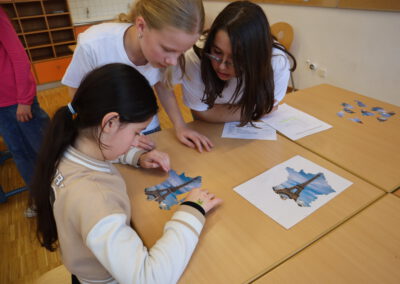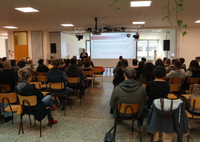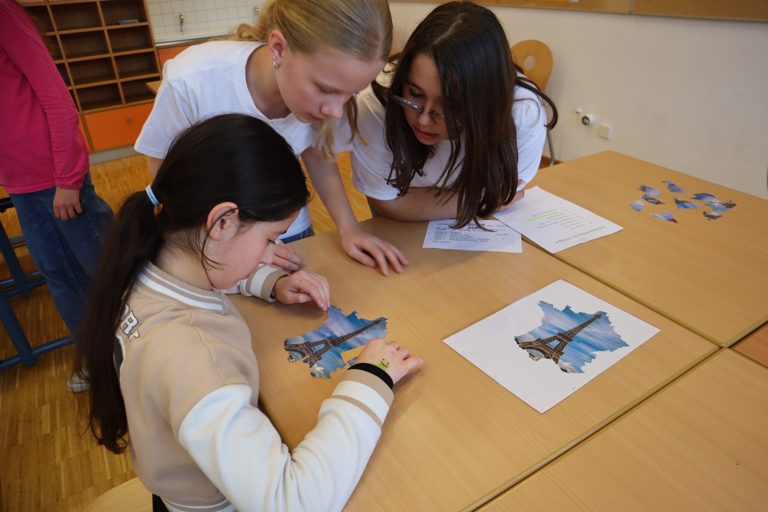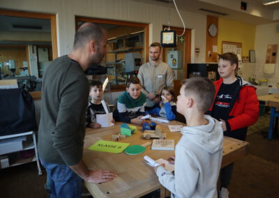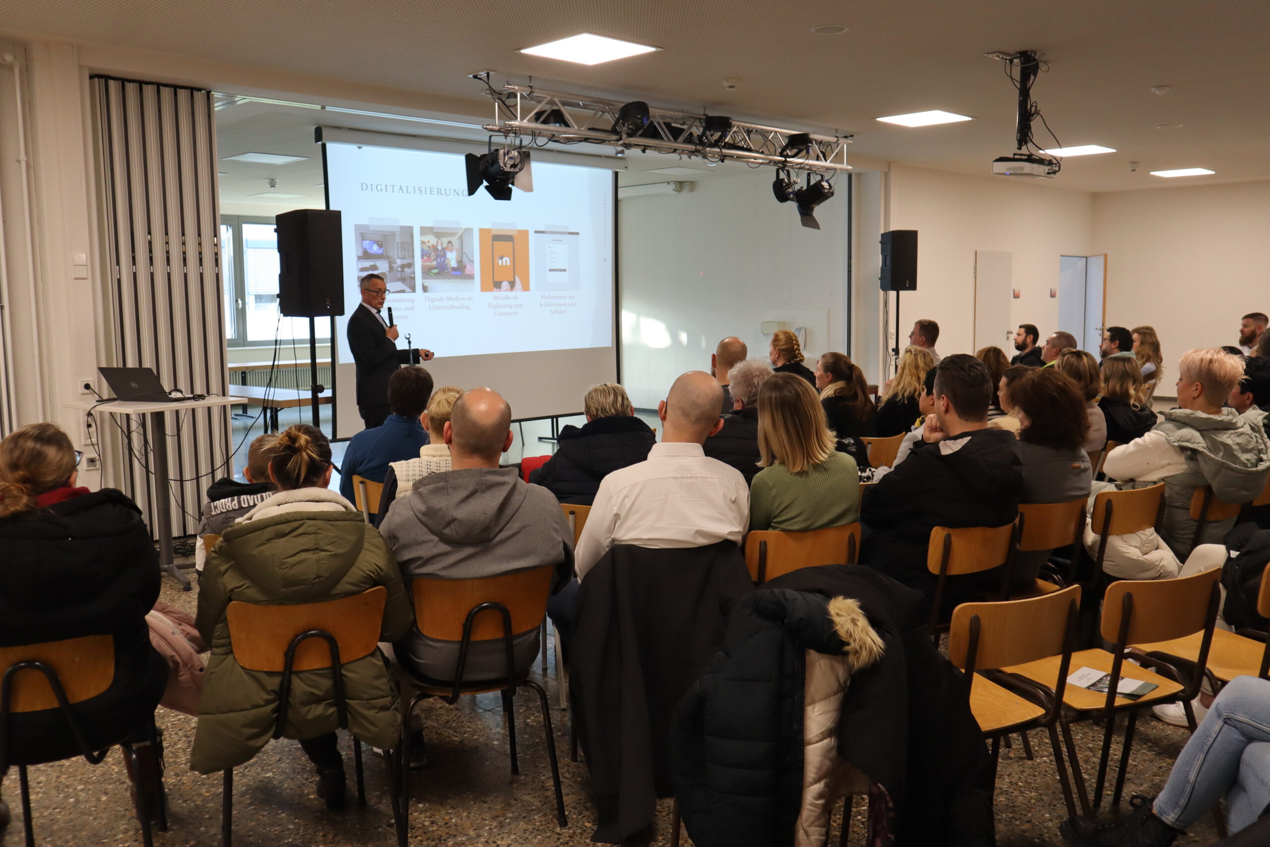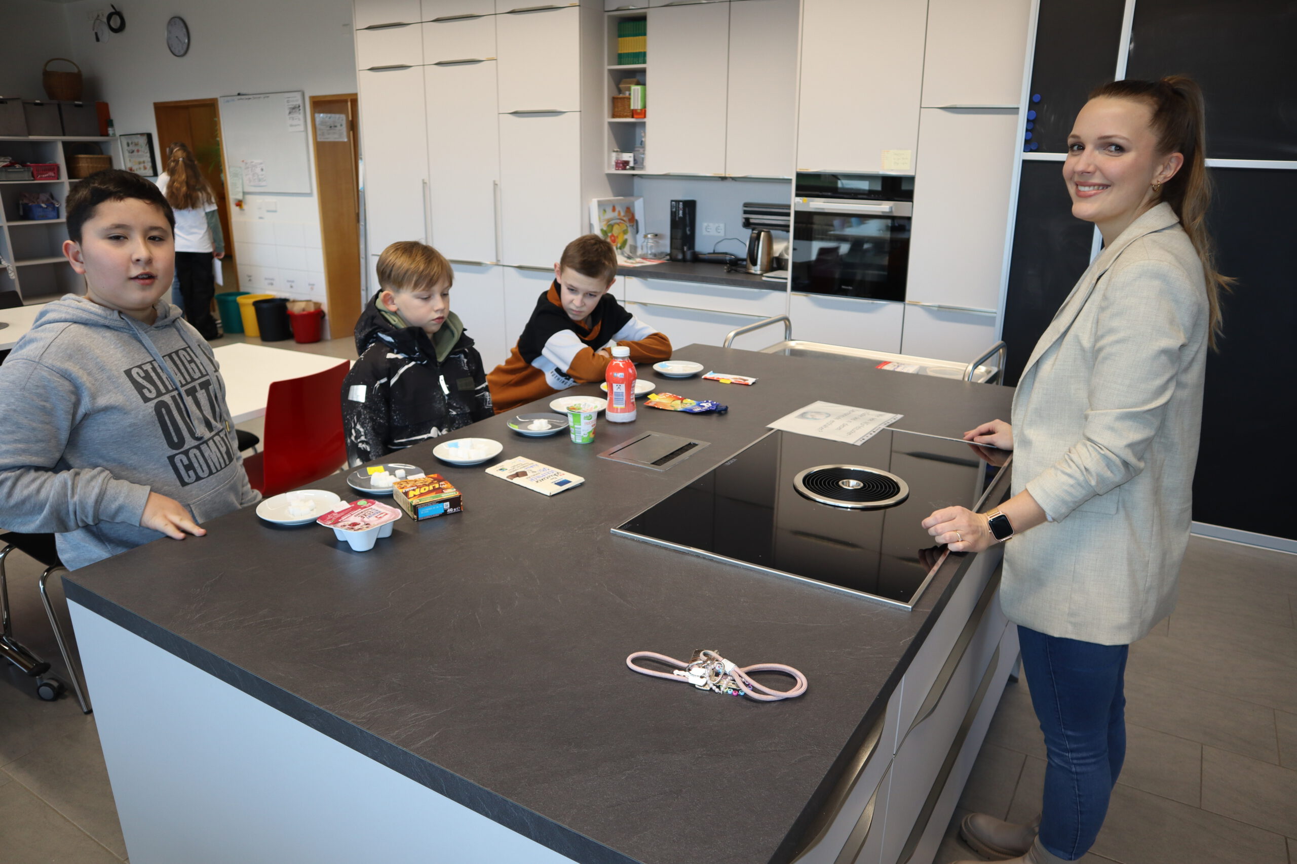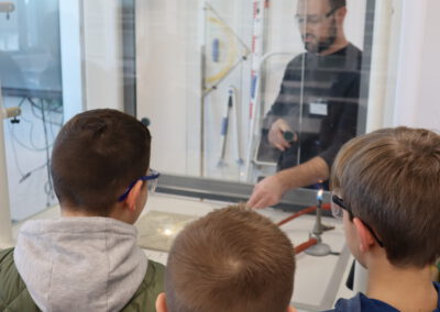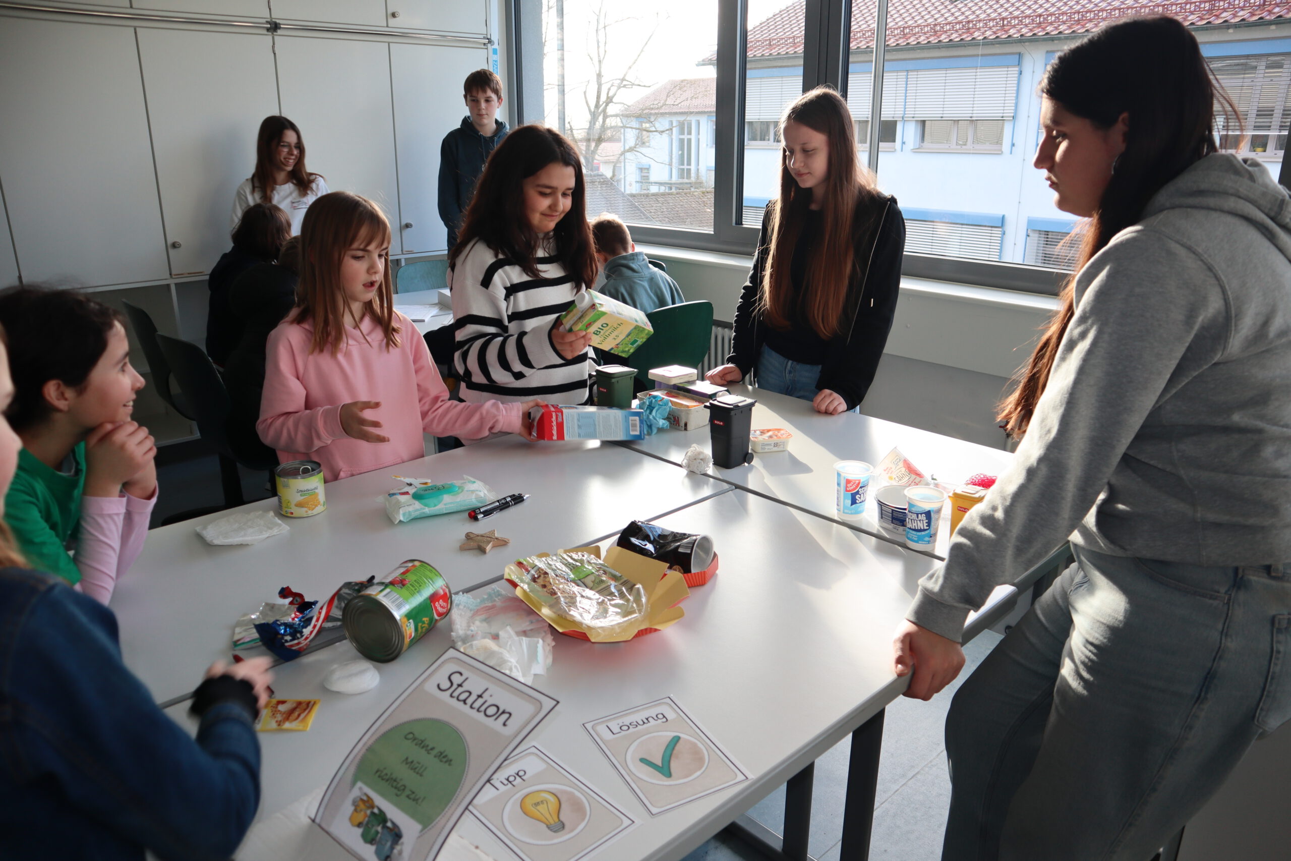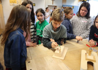 Am Freitag, 23. Februar 2024 öffnete die Realschule Rheinmünster von 16 – 18 Uhr ihre Türen für interessierte Viertklässler und deren Eltern, für die im März die Schulwahlentscheidung ansteht. Nach einer musikalischen Begrüßung durch die Bläserklasse 5b startete das eigentliche Informationsprogramm für Eltern und Kinder auf zweigeteilte Weise: Während die Eltern bei einem Vortrag der Schulleitung vieles über die Schulart Realschule allgemein und über die Besonderheiten der Realschule Rheinmünster erfuhren, wurden die Viertklässler von den Schulsanitätern in Obhut genommen und begaben sich mit diesen in Kleingruppen auf eine Schulhaus-Rallye. Dabei konnten sie die neuen Fachräume in Chemie, Biologie und Physik in Augenschein nehmen und auch selbst Experimente durchführen. Manch einer blickte zum ersten Mal durch ein Mikroskop und war verblüfft über das Aussehen einer Kreuzspinne oder einer Blattlaus unter dem Vergrößerungsgerät. Im Bio-Saal gab es außerdem Versuche zur Oberflächenspannung von Wasser und Zuordnungsübungen zu Körperorganen und Wirbeltierklassen. Im Technik-Raum gab es den 3D-Drucker in Aktion zu beobachten sowie von Schülern verschiedener Klassenstufen angefertigte Werkstücke zu bewundern. Für Staunen sorgten die Vorführungen der Roboter-AG im Obergeschoss des A-Baus und in der modernen Schulküche konnte man schätzen, wie viele Zuckerwürfel in einem Joghurtdrink oder in einem Schokoriegel enthalten sind. Auch dass Rhabarber ein Gemüse und Avocados eine Obstsorte sind, konnte man dort erfahren. Bei den Referendarinnen Frau Heering und Frau Kirchhofer konnten die jungen Besucher an i-Pads selbst kurze Erklärvideos filmen und im Französisch-Raum bei Frau Israel drehte sich alles um unser Nachbarland Frankreich und die französische Sprache.