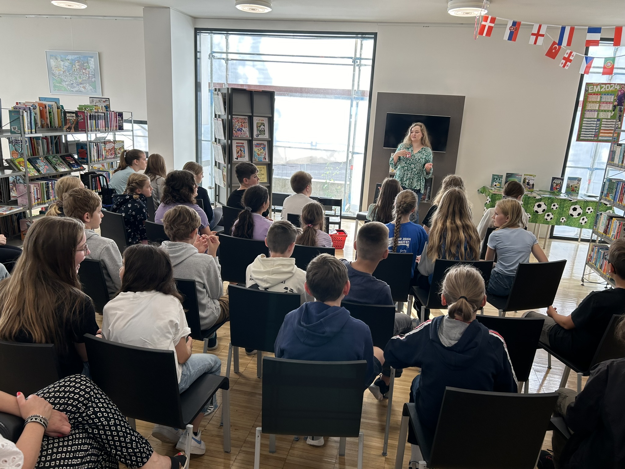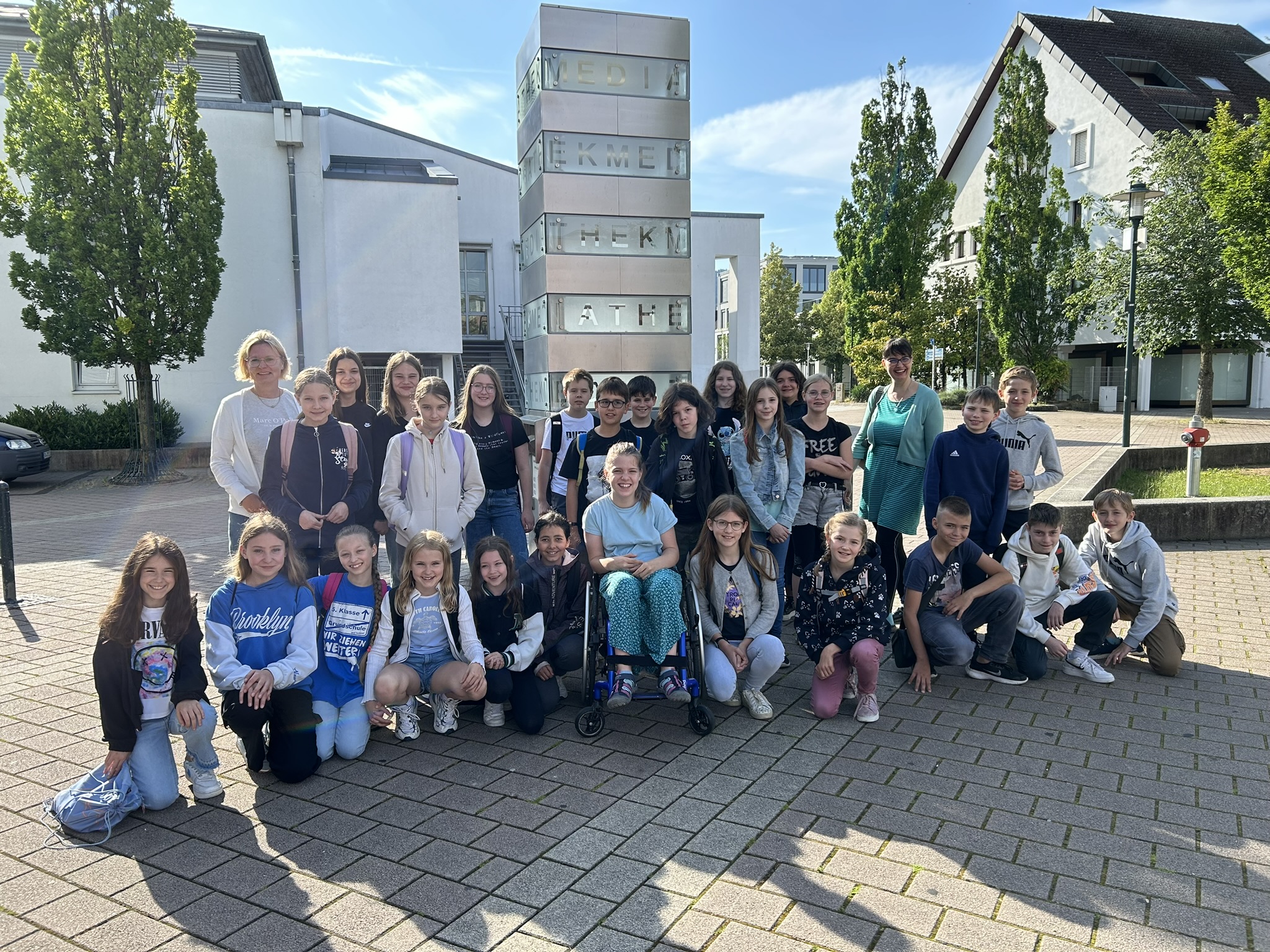 Einen Ausflug in die Welt der Bücher unternahm die Klasse 5b am Dienstag, 18. Juni 2024 zusammen mit ihrer Deutschlehrerin Katharina Ziegler und ihrer Klassenlehrerin Heike Gerspach. Nach der ersten Stunde ging es gemeinsam mit dem Bus zum Busbahnhof Bühl, von wo die Mediathek nur noch einen Steinwurf entfernt ist. Hier wurde die Klasse von der stellvertretenden Bibliotheksleiterin Monia Girstl schon erwartet. In den folgenden 90 Minuten erklärte Frau Girstl einiges über die Organisations- und Ordnungsweise in der Bibliothek, informierte über die Einteilung von Büchern in verschiedene Gruppen wie Sachbücher oder Bilderbücher, Comics oder auch Zeitungen und Zeitschriften und sprach auch die Problematik an, dass Informationen im Internet oftmals nicht vertrauenswürdig sind. Dies dürfte für die jetzigen Fünftklässler in den kommenden Schuljahren noch sehr relevant werden, wenn es gilt, eigenständige Recherche für Präsentationen und Referate zu betreiben.