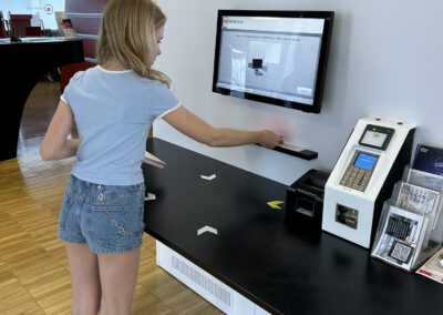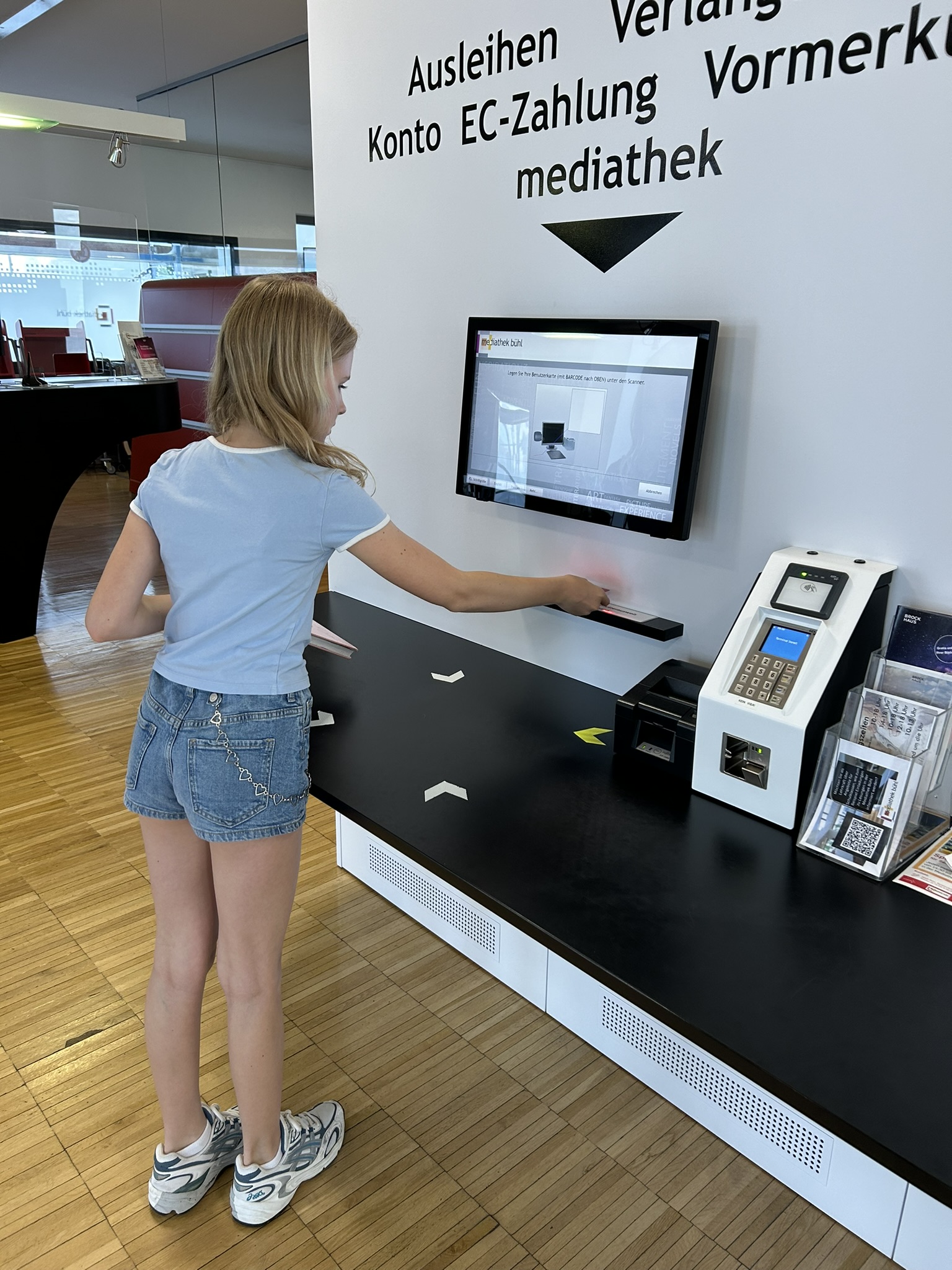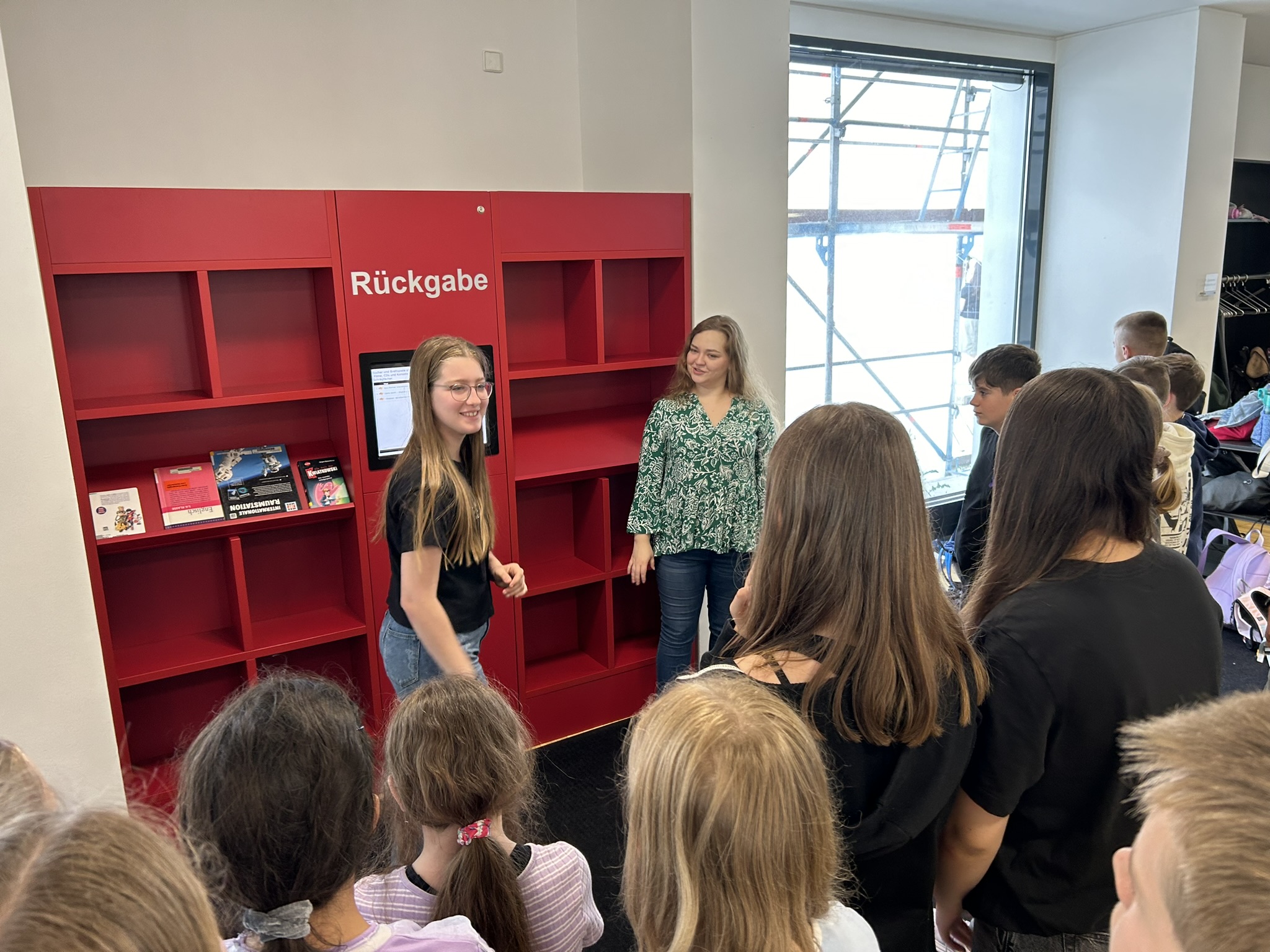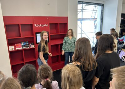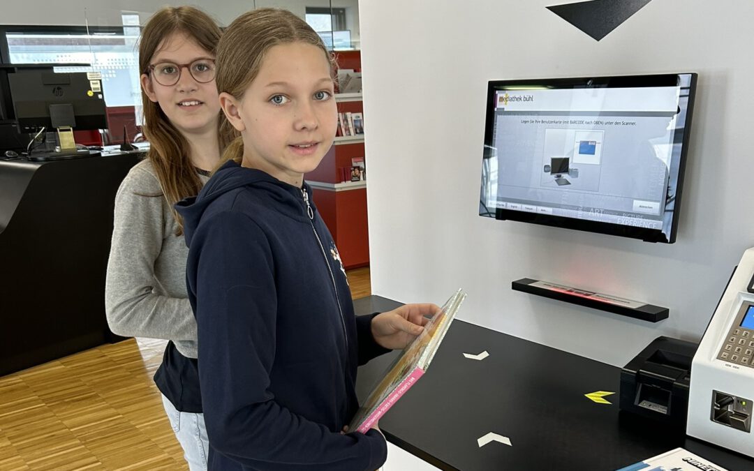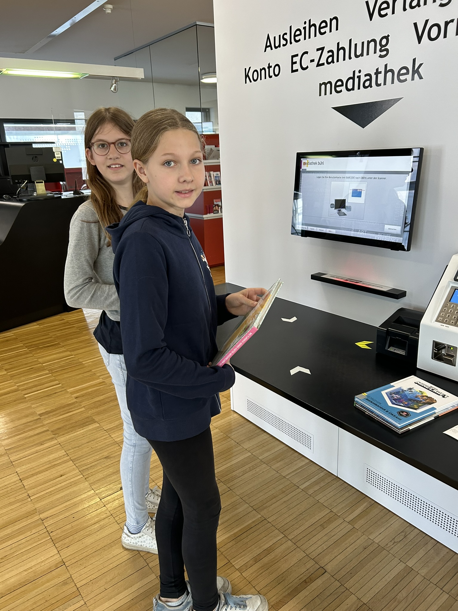 Dass eine Bibliothek keineswegs eine althergebrachte und „verstaubte“ Einrichtung ist, wurde jedem klar, als Frau Girstl – den Begriff Mediathek erklärend – vorstellte, dass es in der Bühler Mediathek auch Brett- und Kartenspiele, Konsolenspiele z. B. für die Nintendo Switch, Filme auf DVD, CDs und auch Tonies zu leihen gibt. Für Erstaunen sorgte das Rückgaberegal, in das man einfach seine ausgeliehenen Medien hineinstellen kann und die dann automatisch vom Computersystem der Mediathek erkannt und als zurückgegeben gebucht werden.