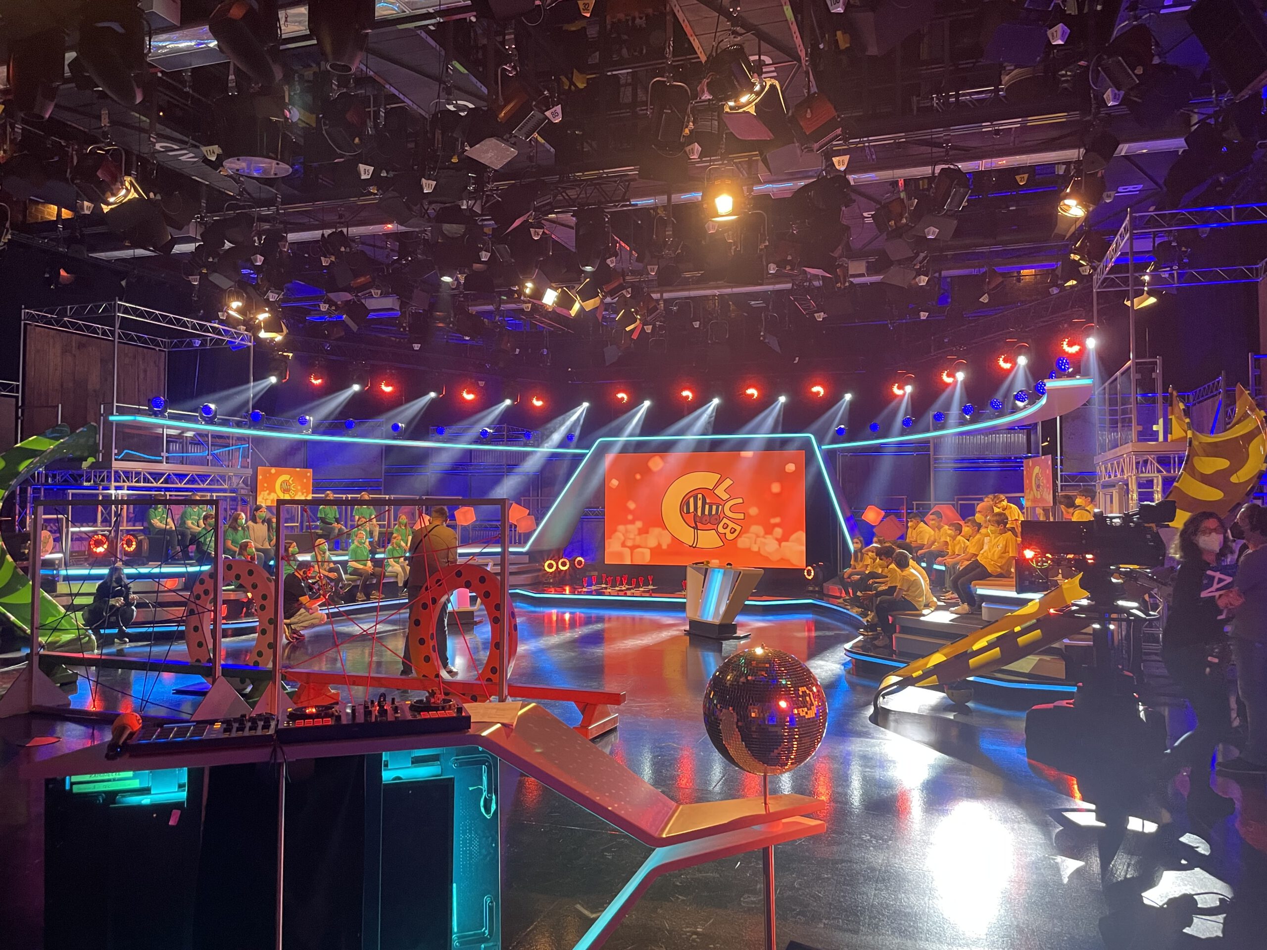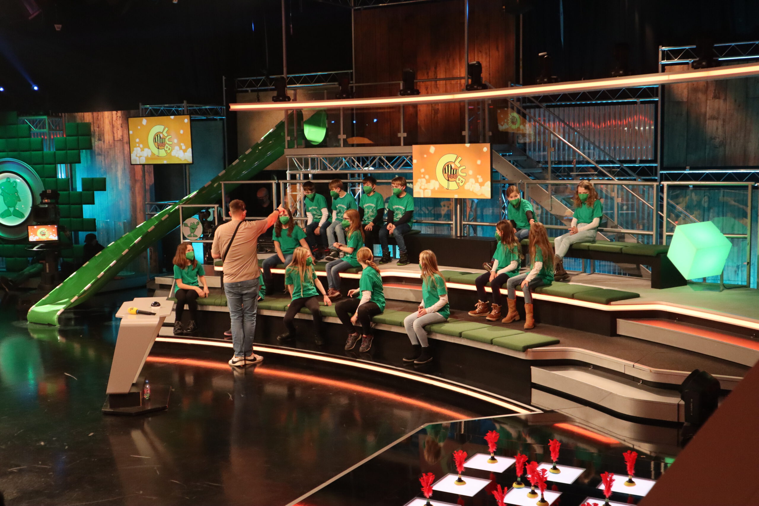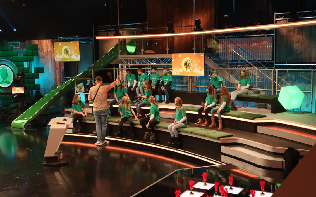 Nach der Führung übte Betreuer Steffen mit den Publikumskindern noch das Jubeln, Anfeuern und Klatschen, bevor dann alle gemeinsam zur Aufzeichnung ins Fernsehstudio gerufen wurden. Dort wurden die beiden bis in die Haarspitzen aufgeregten Schulklassen bereits von den völlig entspannten Tigerentenclub-Moderatoren Laura Knöll und Johannes Zenglein erwartet. Nach der Anmoderation rutschen die Spielekinder der jeweiligen Mannschaften über große Rutschen ins Studio und gaben von da an unter dem Jubel der Klassenkameraden im Publikum ihr Bestes, um möglichst viele „Notbremsen“ für das Tigerenten-Rodeo im Finale zu erspielen.