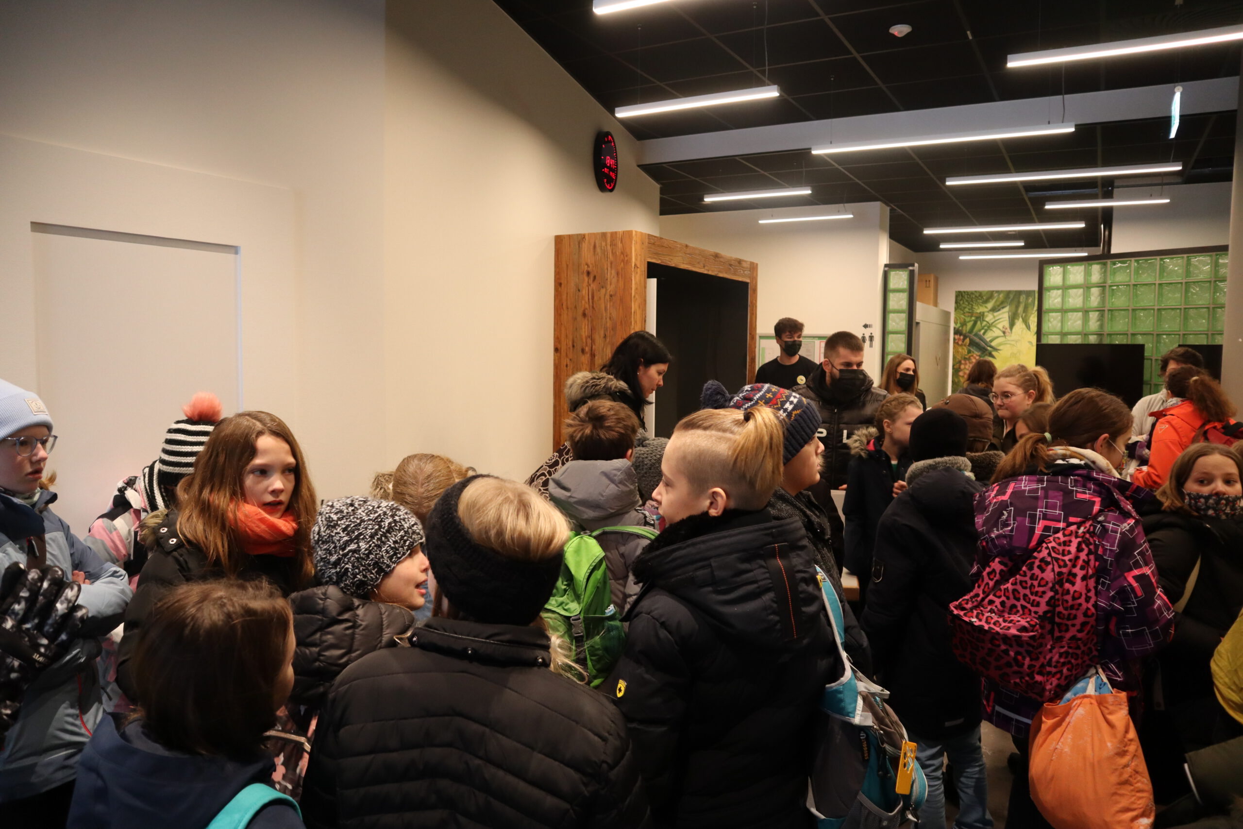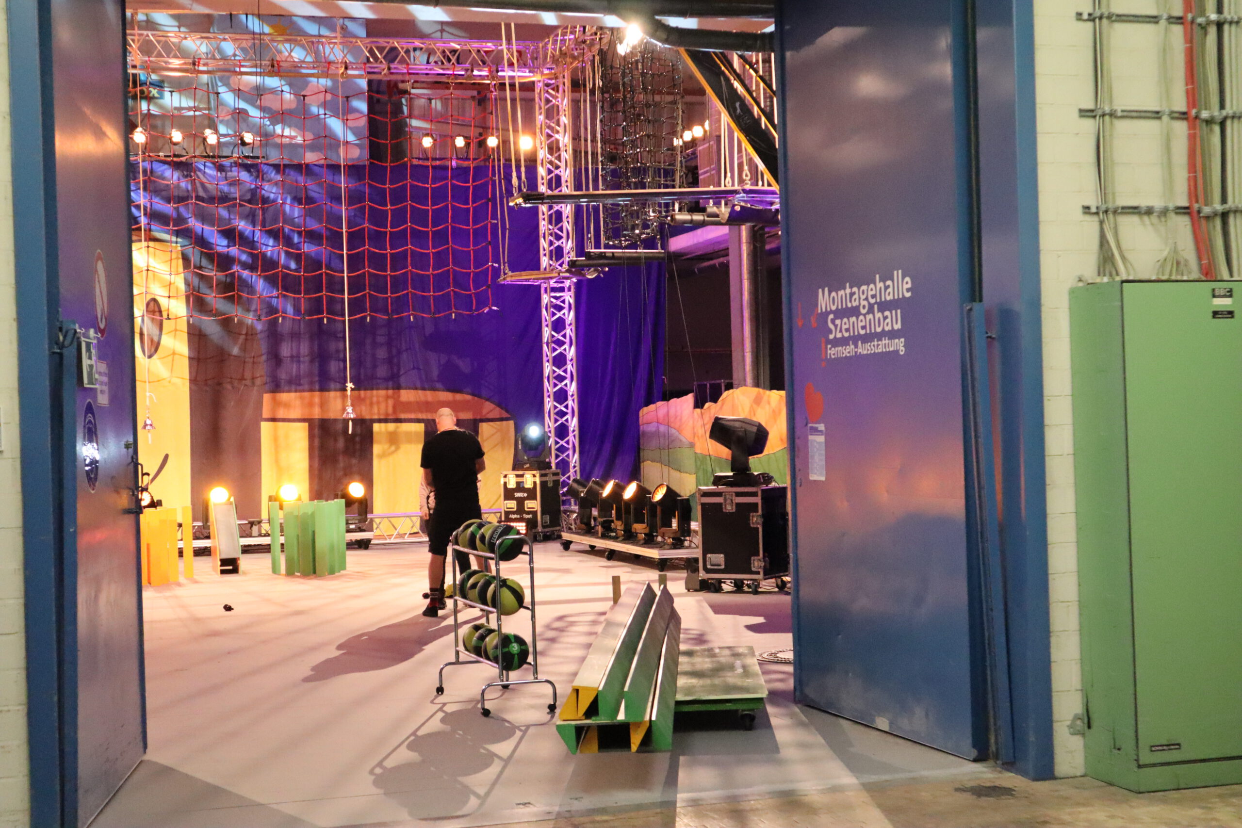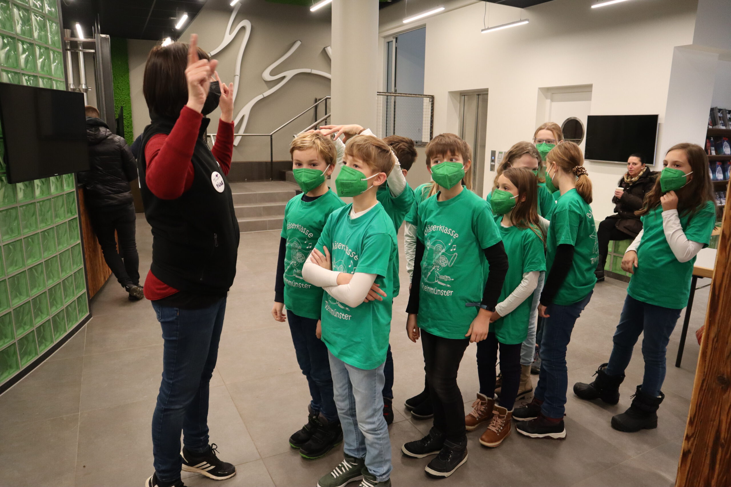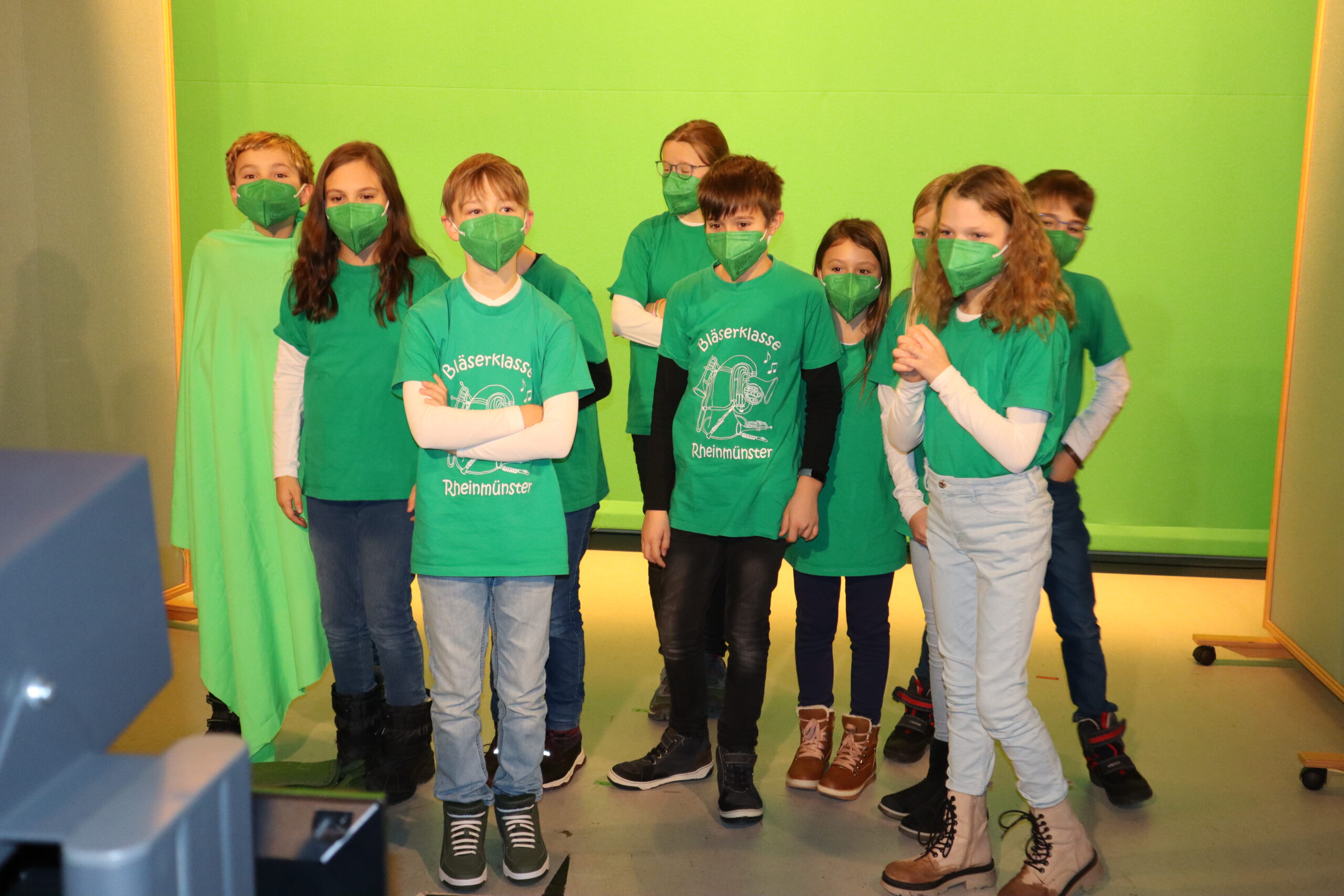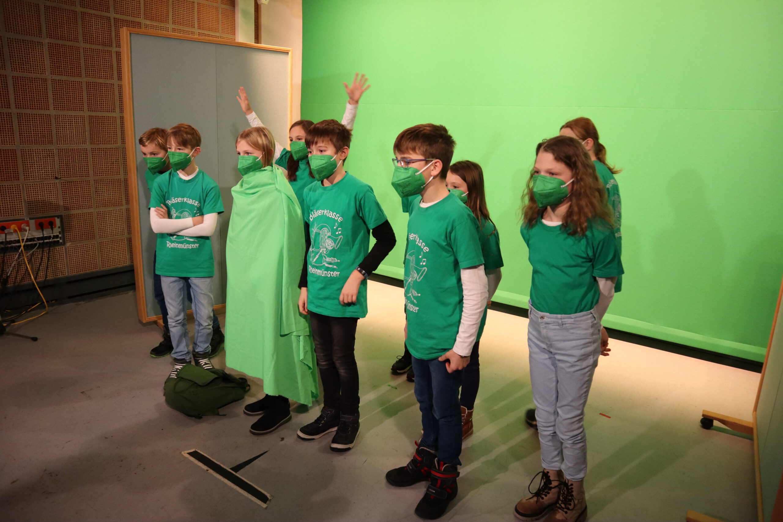 Gleich nach der Begrüßung durch Steffen, einen der Kinderbetreuer des SWR, erblickte das Schwarzacher Team, genannt „Die Frösche“, ihre Herausforderer, „das Tigerenten-Team“ der Christian-Erbach-Realschule plus im pfälzischen Gau-Algesheim. Jede der beiden antretenden Klassen hatte im Vorfeld bereits drei Spielekinder bestimmt, die sich in der Sendung in Disziplinen wie Indiaca-Werfen, Froschhüpfen oder  Turmbau mit Muttern beweisen mussten. Neben einer großen Portion Mut waren also von den drei Spielekindern Noah Braun, Raffaele Marino und Eleni Schuster auch Sportlichkeit, Kraft, Balance, Wissen und sogar Gesangs- und Tanzfähigkeiten gefragt. Während die drei Spielekinder zusammen mit Frau Huck die rund einstündige Generalprobe für die Sendung im Fernsehstudio absolvierten, ging es für die restlichen Schüler der Klasse 5b zu einer „Dschungeltour“ durch den Kostüm-Fundus und die verschiedenen Fernseh-Studios des SWR. Besonders interessant war dabei der sog. „Greenscreen-Room“, ein virtuelles Studio mit einer großen grünen Wand im Hintergrund des Moderators, auf der erst im Nachhinein Hintergründe wie z. B. eine Wetterkarte digital hinzugefügt werden.