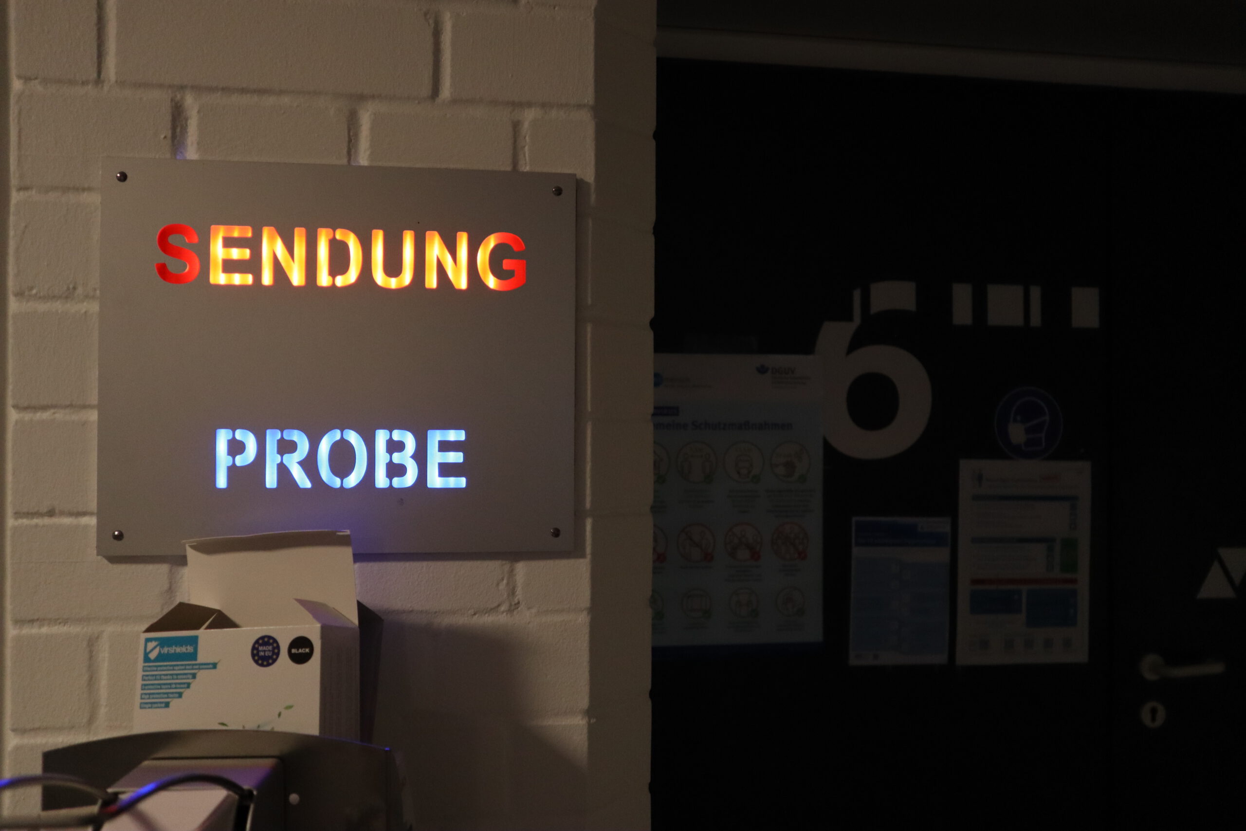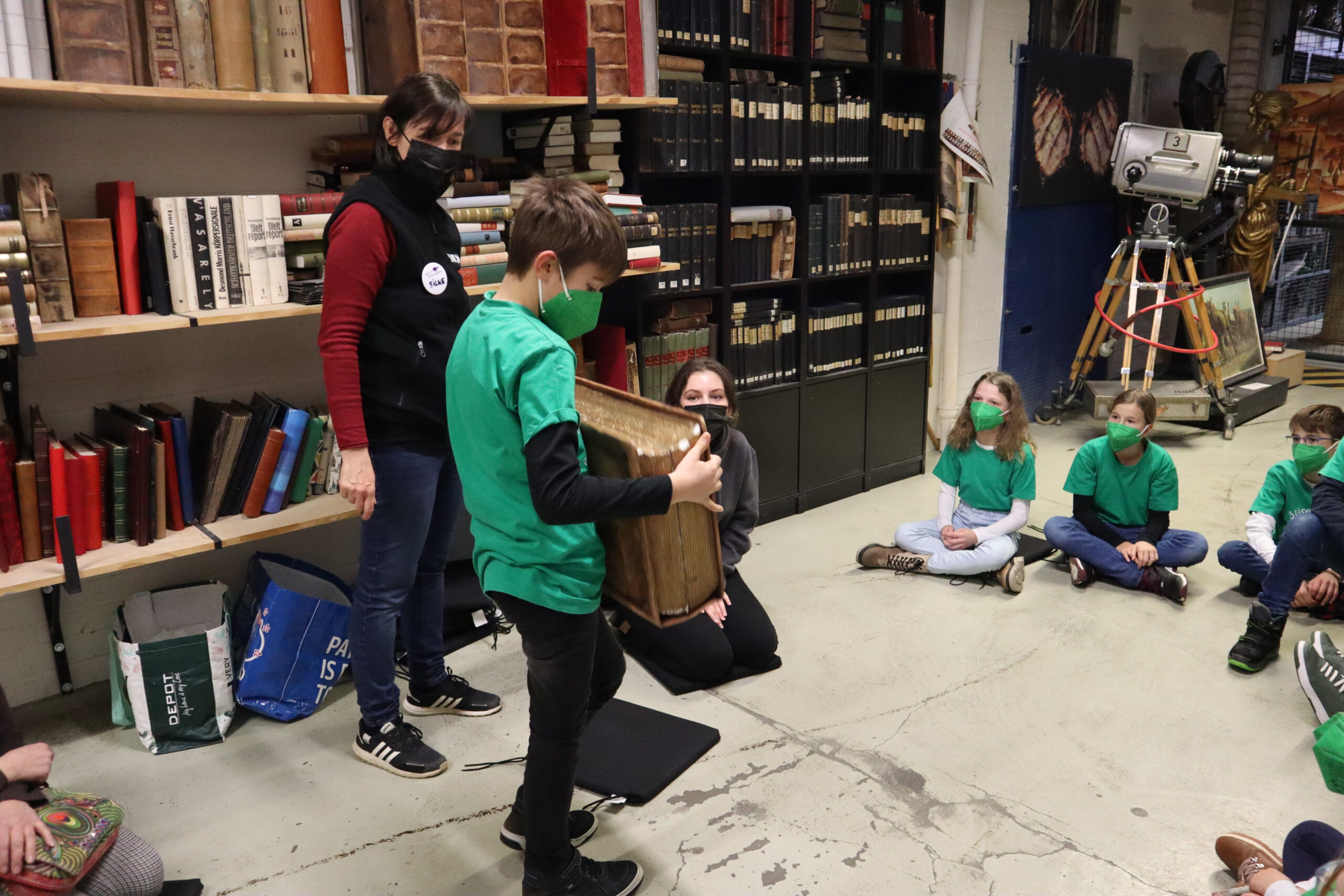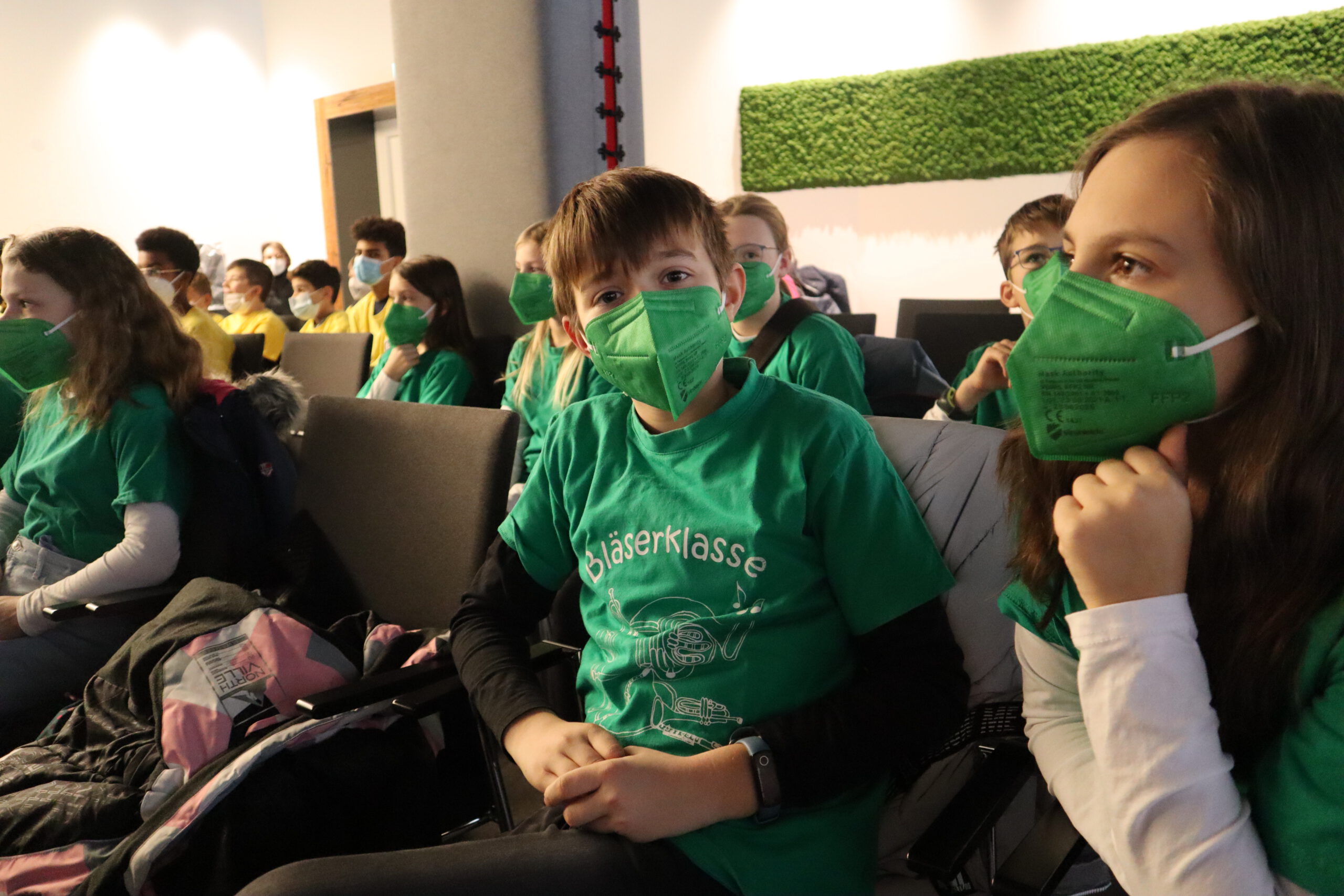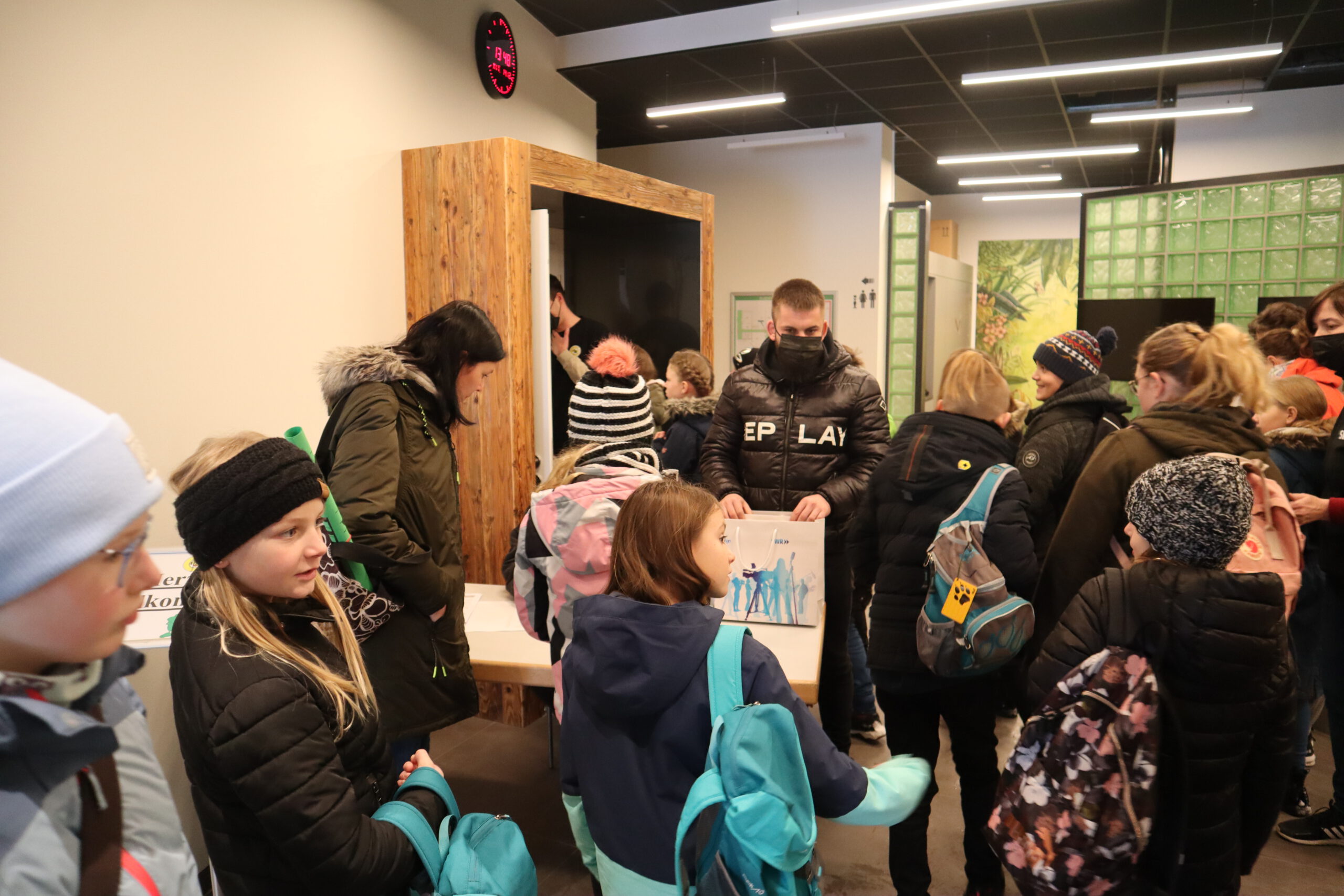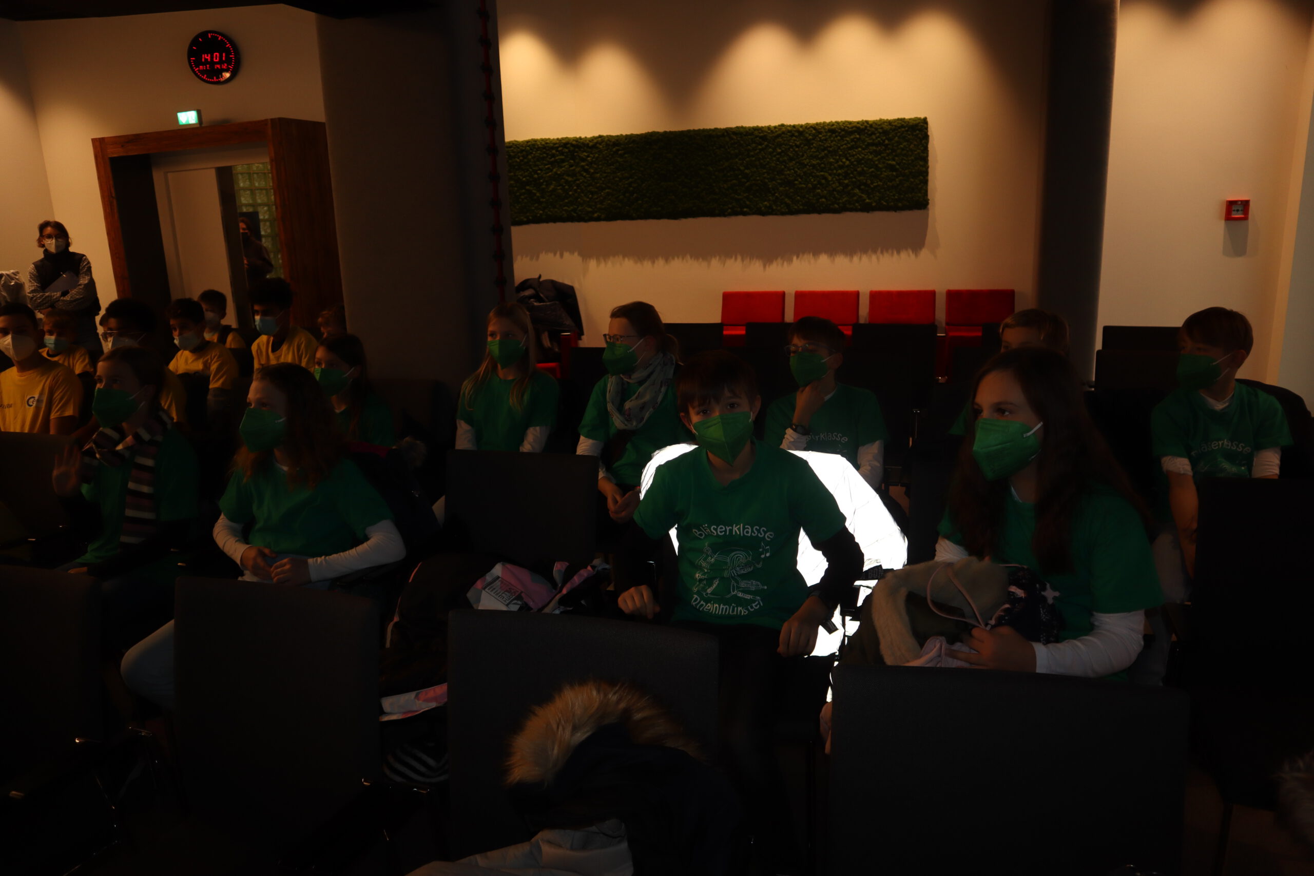 Gleich nach der Begrüßung durch Steffen, einen der Kinderbetreuer des SWR, erblickte das Schwarzacher Team, genannt „Die Frösche“, ihre Herausforderer, „das Tigerenten-Team“ der Christian-Erbach-Realschule plus im pfälzischen Gau-Algesheim. Jede der beiden antretenden Klassen hatte im Vorfeld bereits drei Spielekinder bestimmt, die sich in der Sendung in Disziplinen wie Indiaca-Werfen, Froschhüpfen oder  Turmbau mit Muttern beweisen mussten. Neben einer großen Portion Mut waren also von den drei Spielekindern Noah Braun, Raffaele Marino und Eleni Schuster auch Sportlichkeit, Kraft, Balance, Wissen und sogar Gesangs- und Tanzfähigkeiten gefragt. Während die drei Spielekinder zusammen mit Frau Huck die rund einstündige Generalprobe für die Sendung im Fernsehstudio absolvierten, ging es für die restlichen Schüler der Klasse 5b zu einer „Dschungeltour“ durch den Kostüm-Fundus und die verschiedenen Fernseh-Studios des SWR. Besonders interessant war dabei der sog. „Greenscreen-Room“, ein virtuelles Studio mit einer großen grünen Wand im Hintergrund des Moderators, auf der erst im Nachhinein Hintergründe wie z. B. eine Wetterkarte digital hinzugefügt werden.